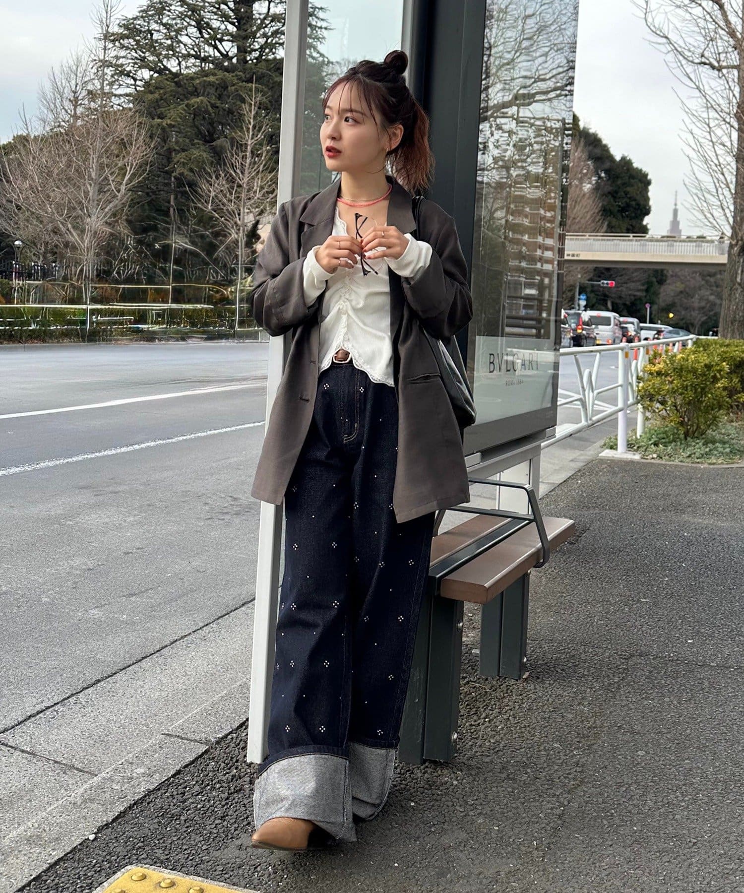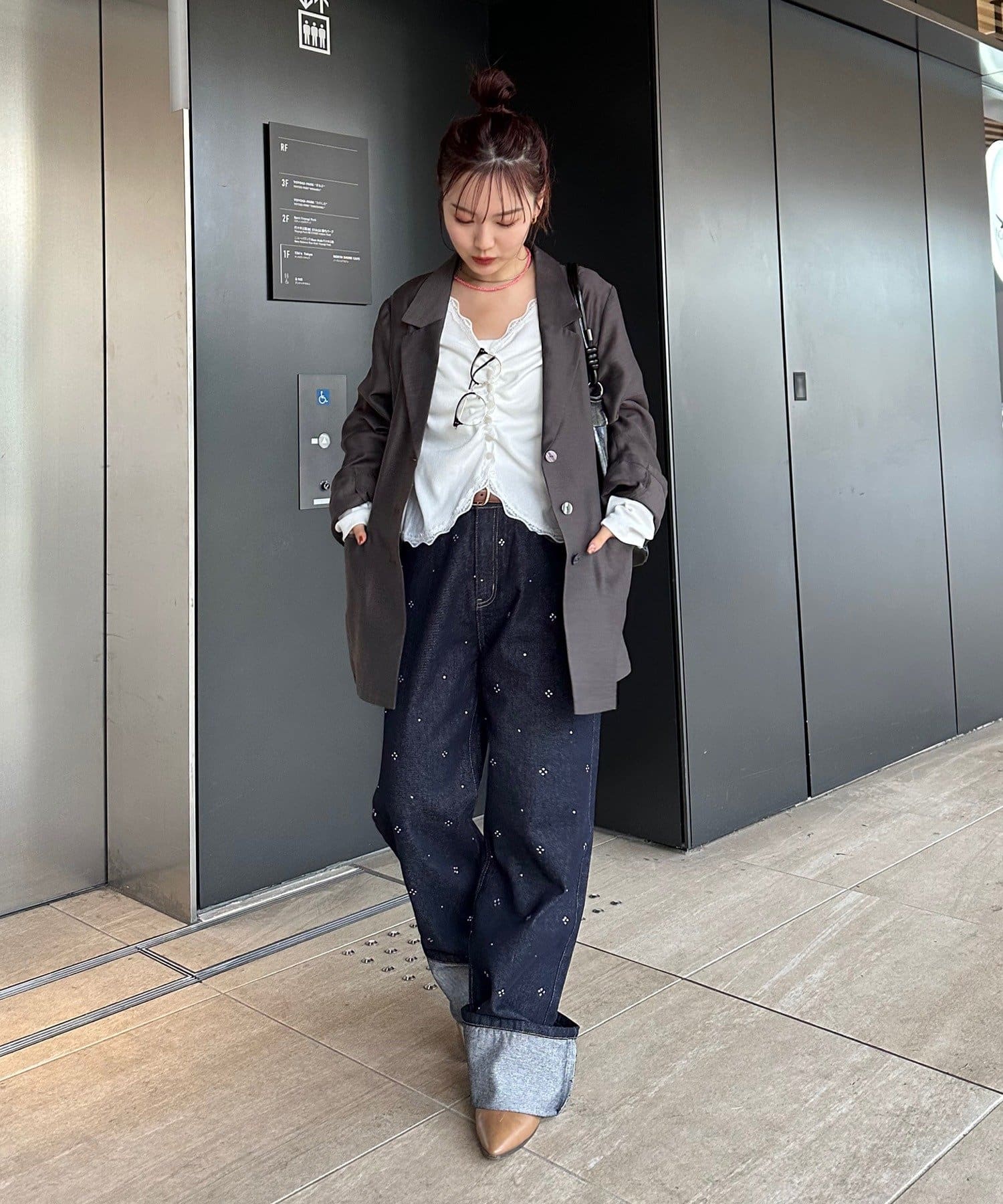 ・デニムと合わせて、甘さを抑えた大人カジュアルスタイルに。