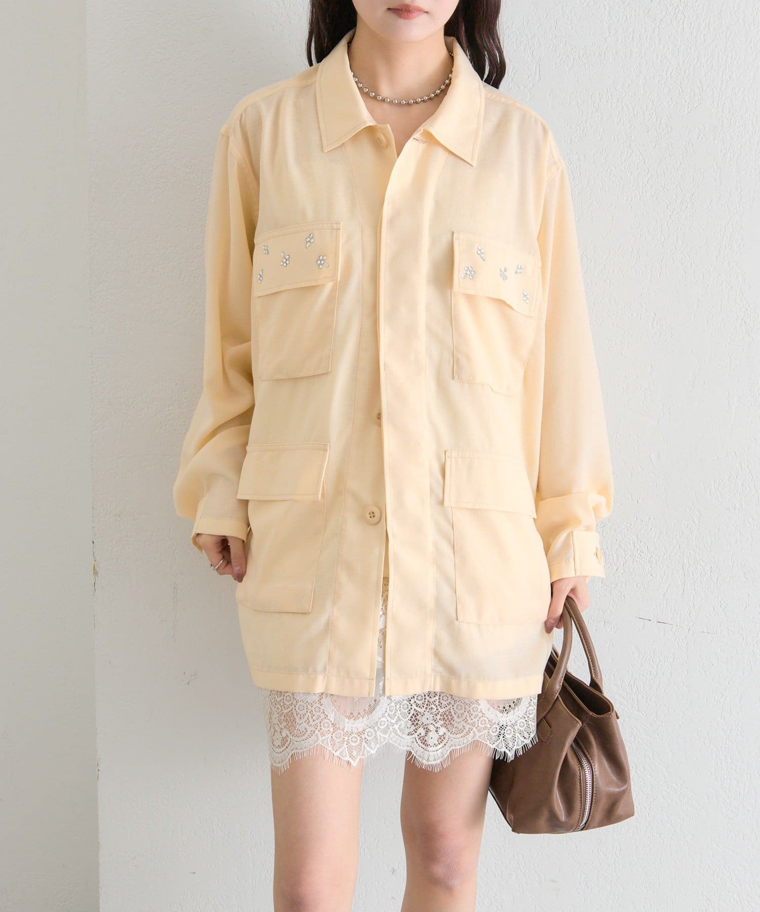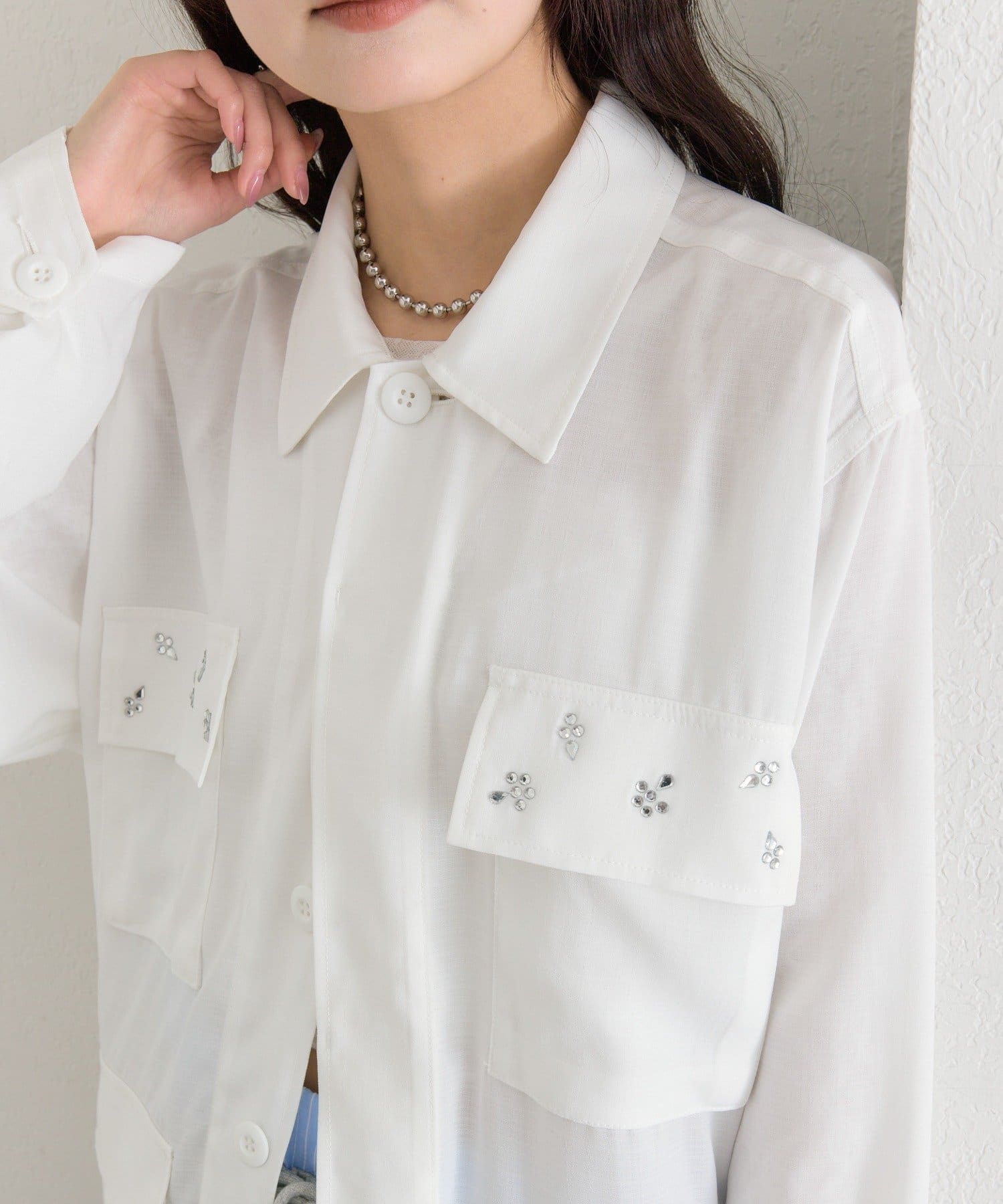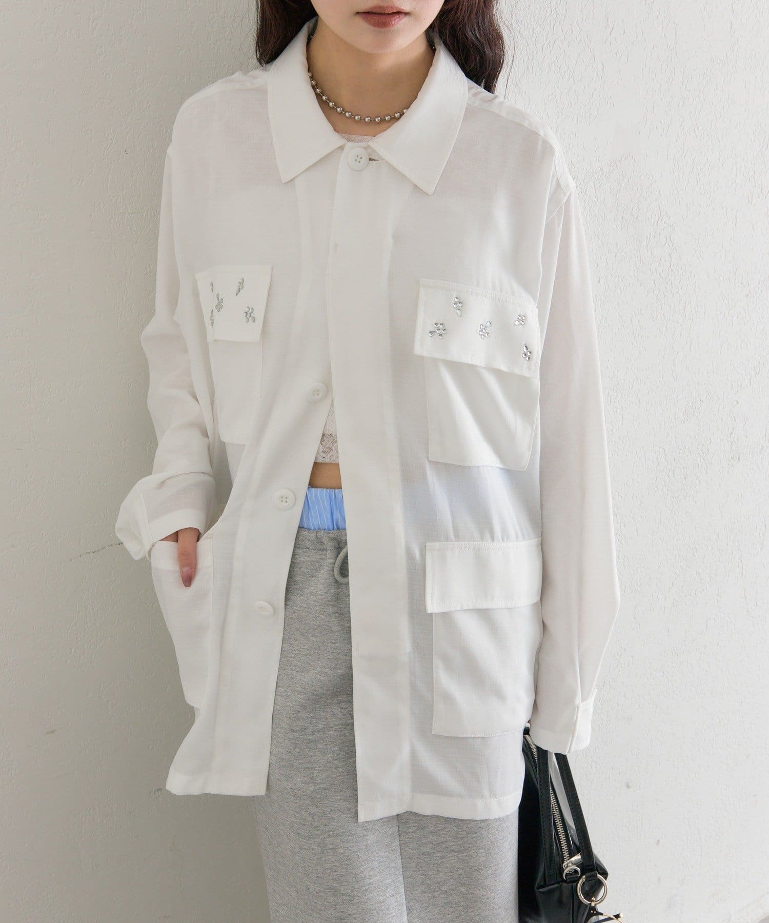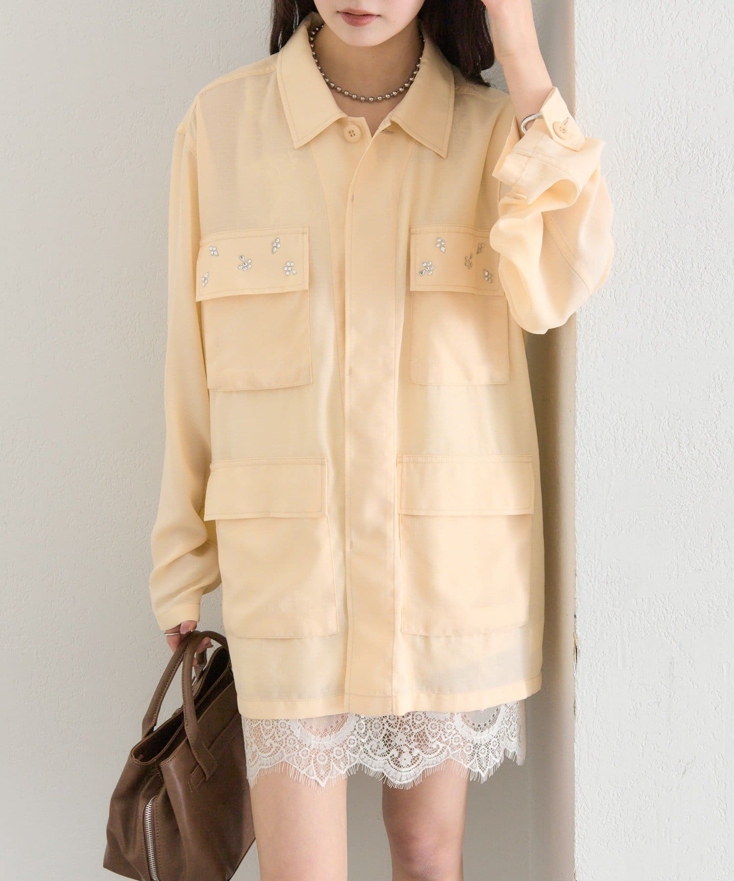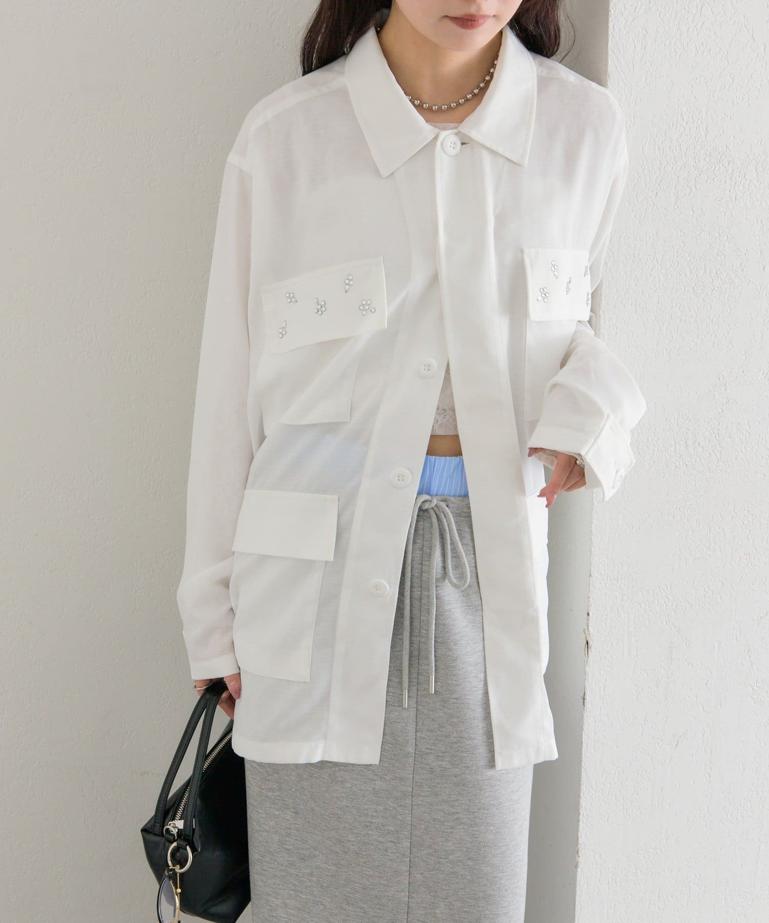 ・ポケット部分にあしらわれたビジューが目を惹くポイントに◎