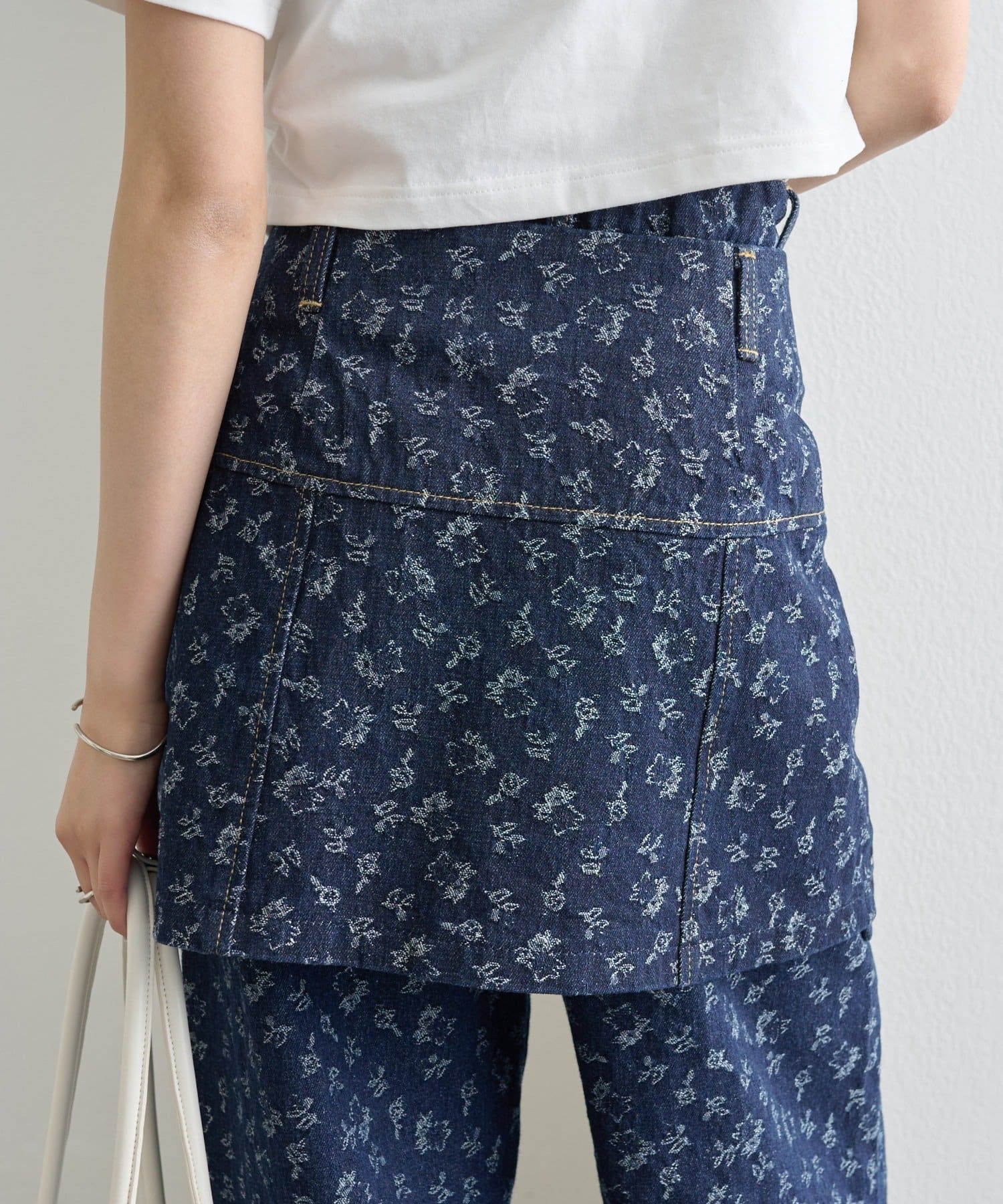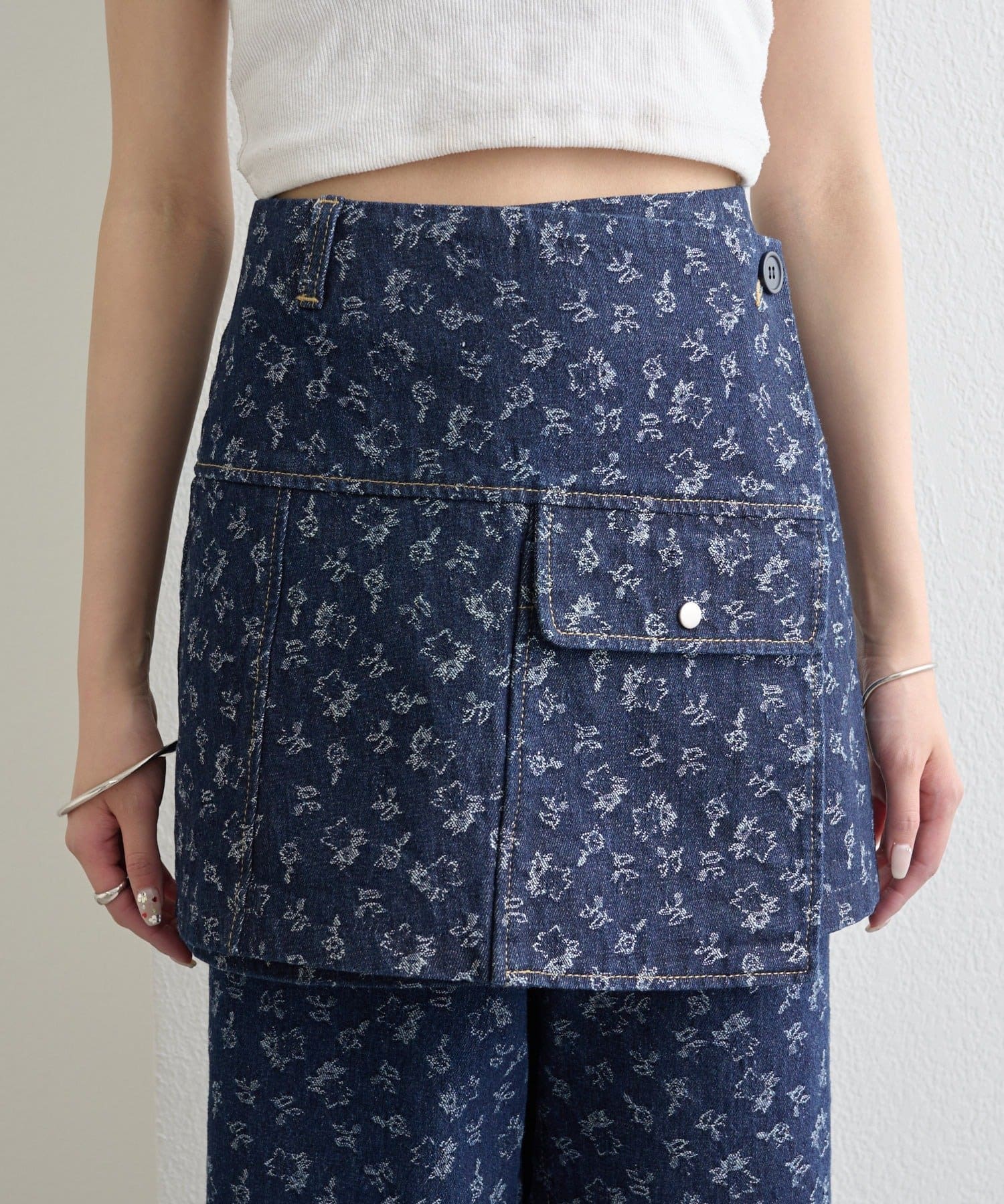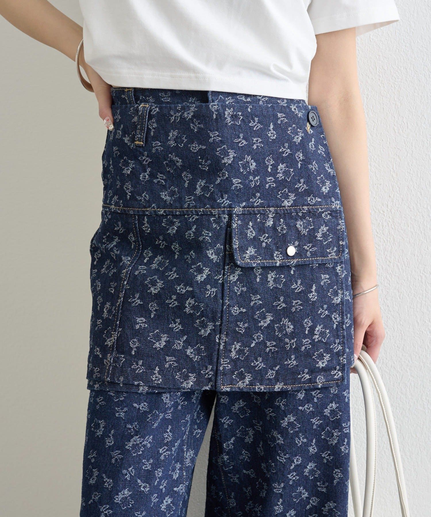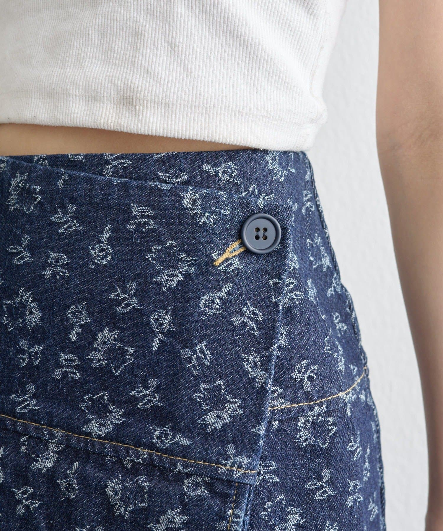 ・デニム素材にフラワー柄を落とし込んだ、周りと差はつくラップスカート。
