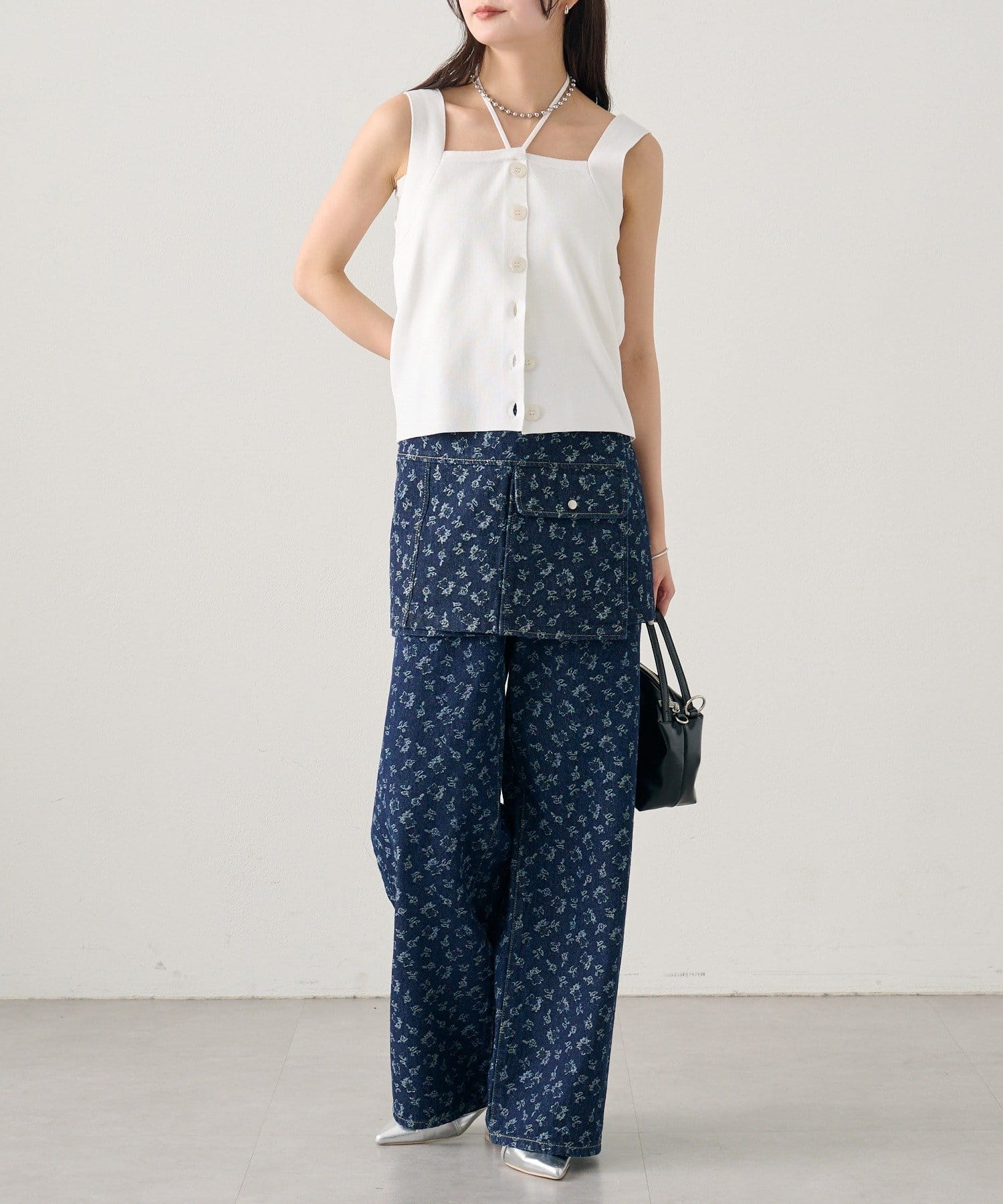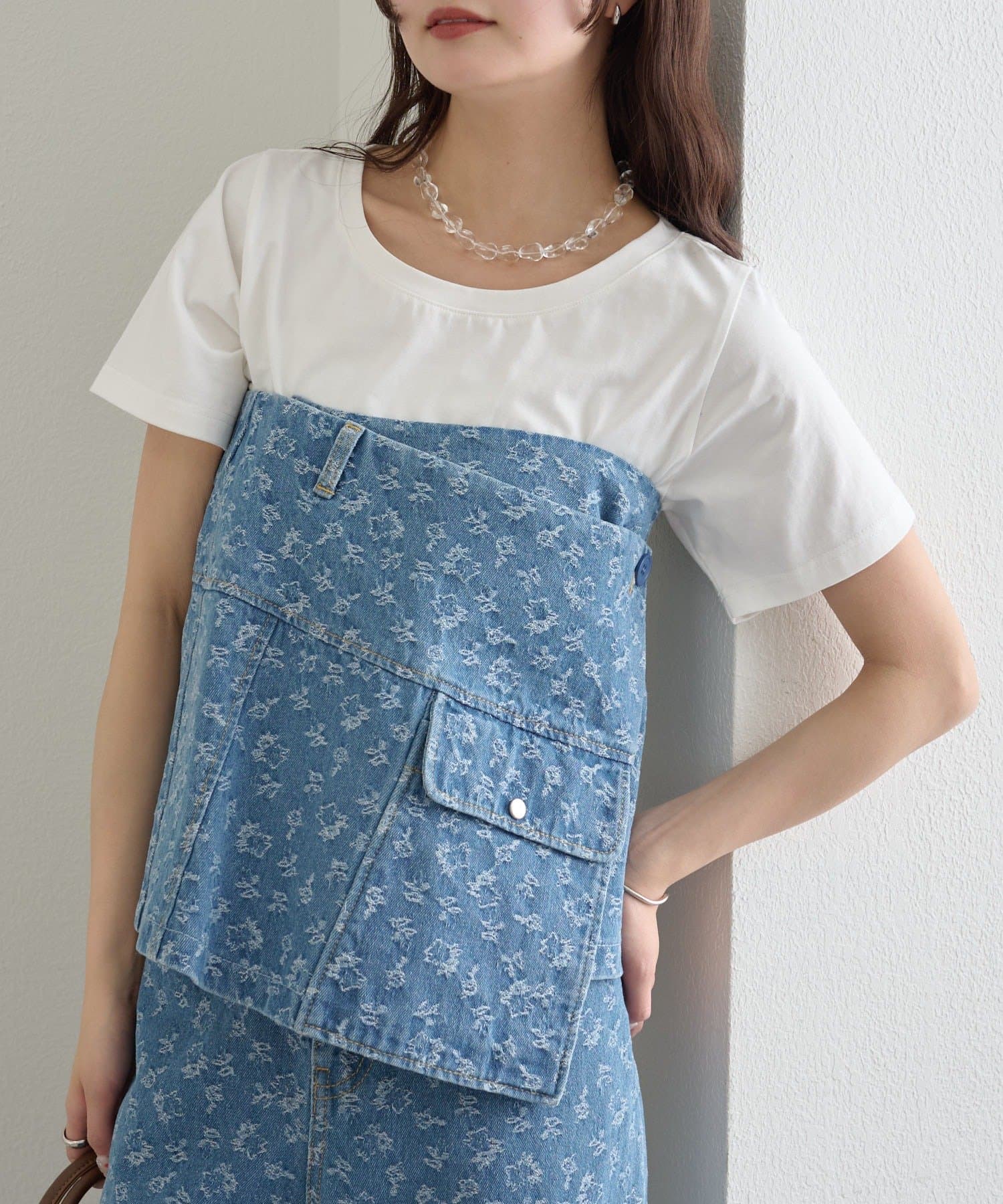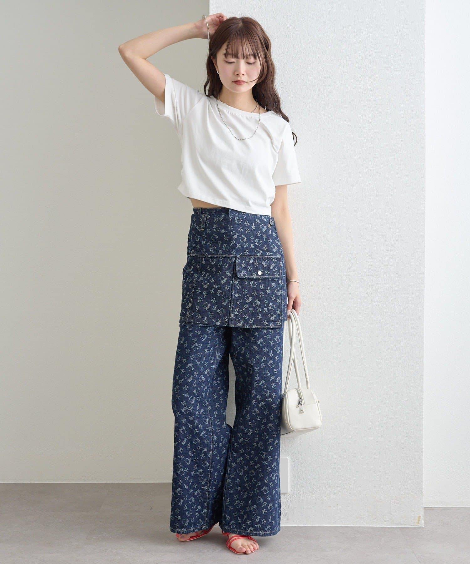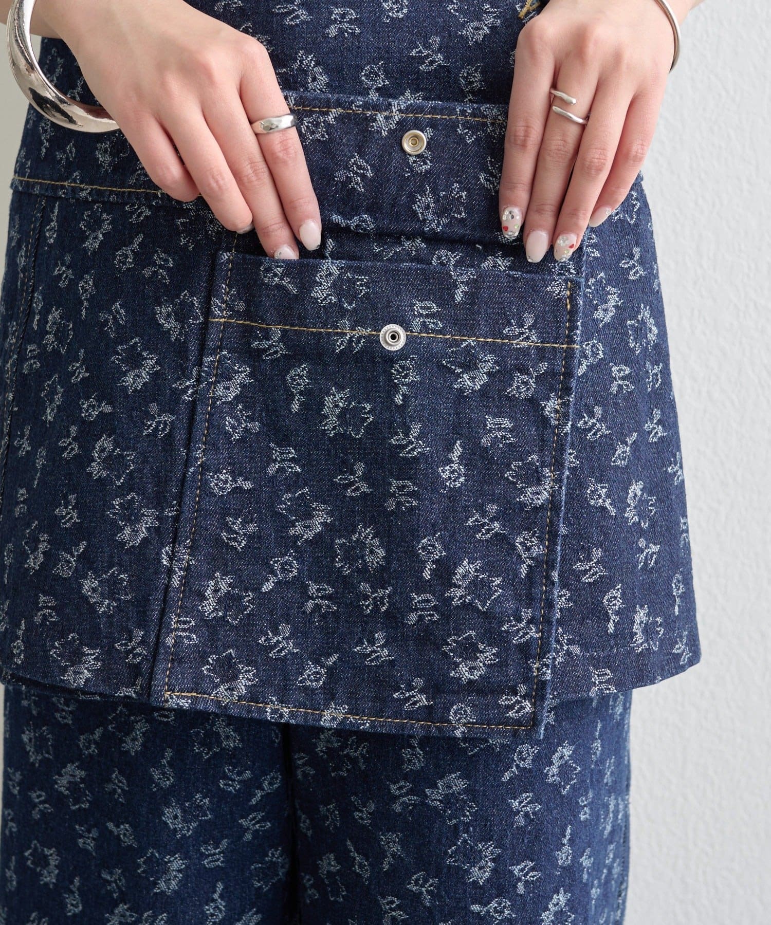 ・デニム素材にフラワー柄を落とし込んだ、周りと差はつくラップスカート。