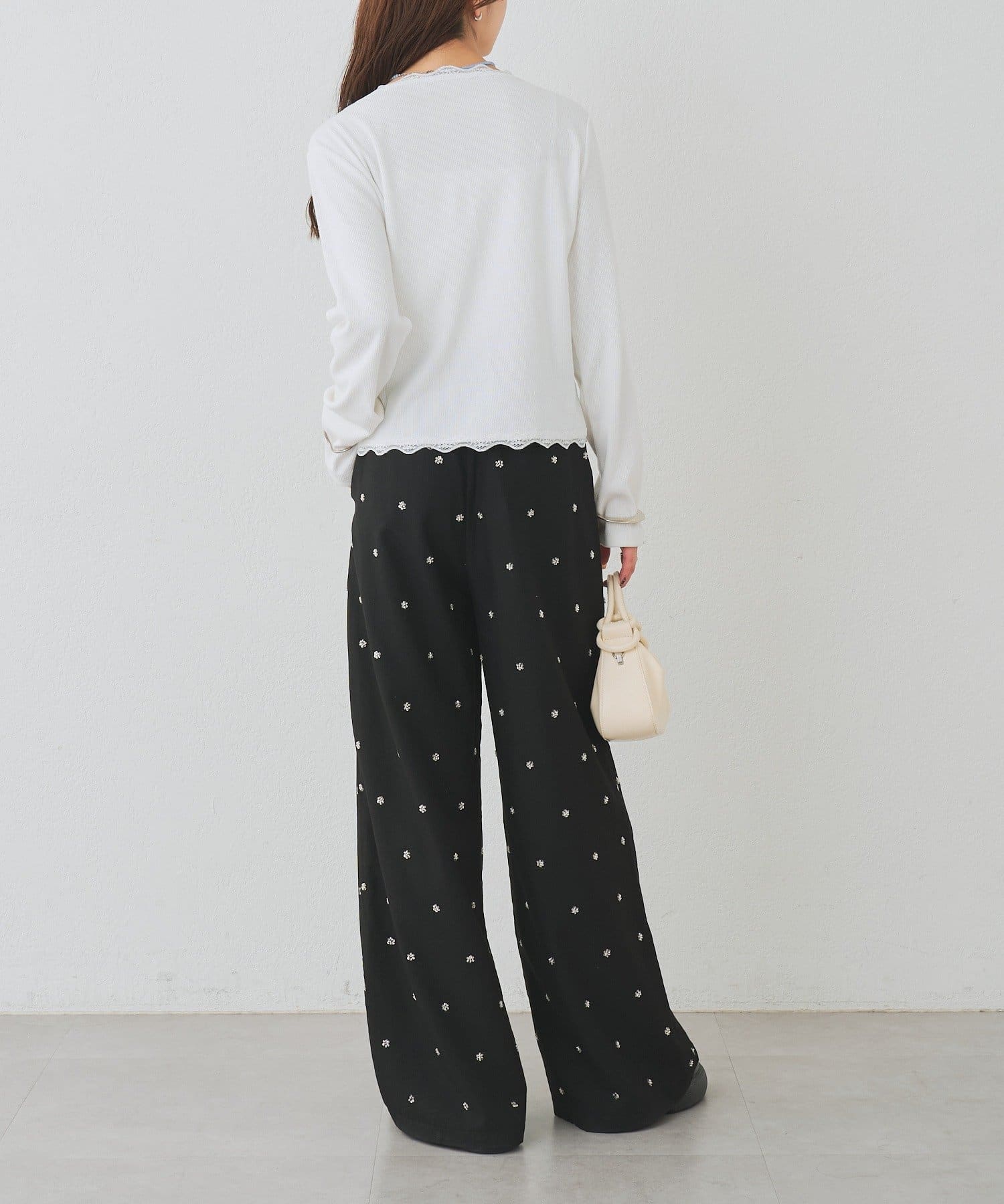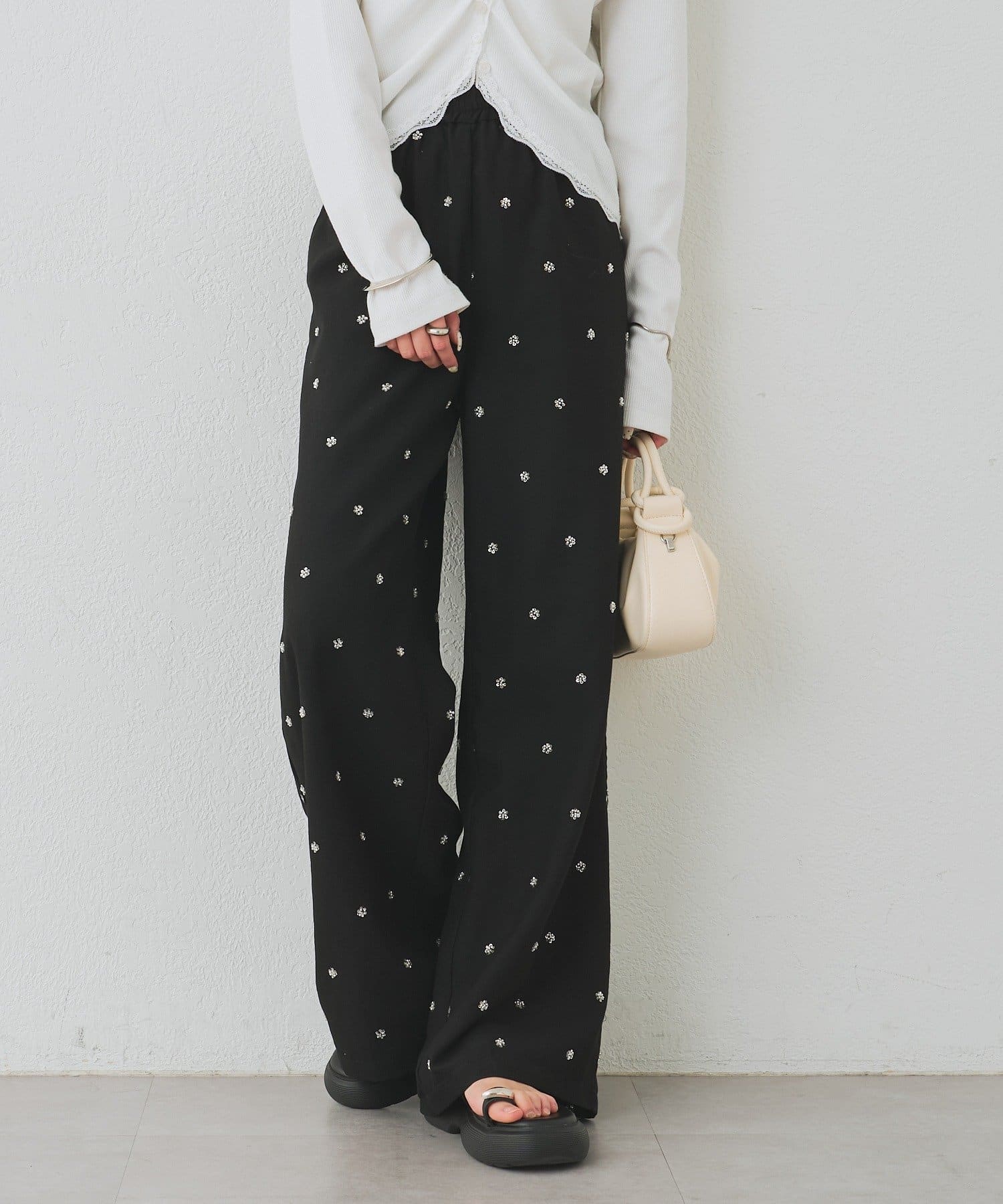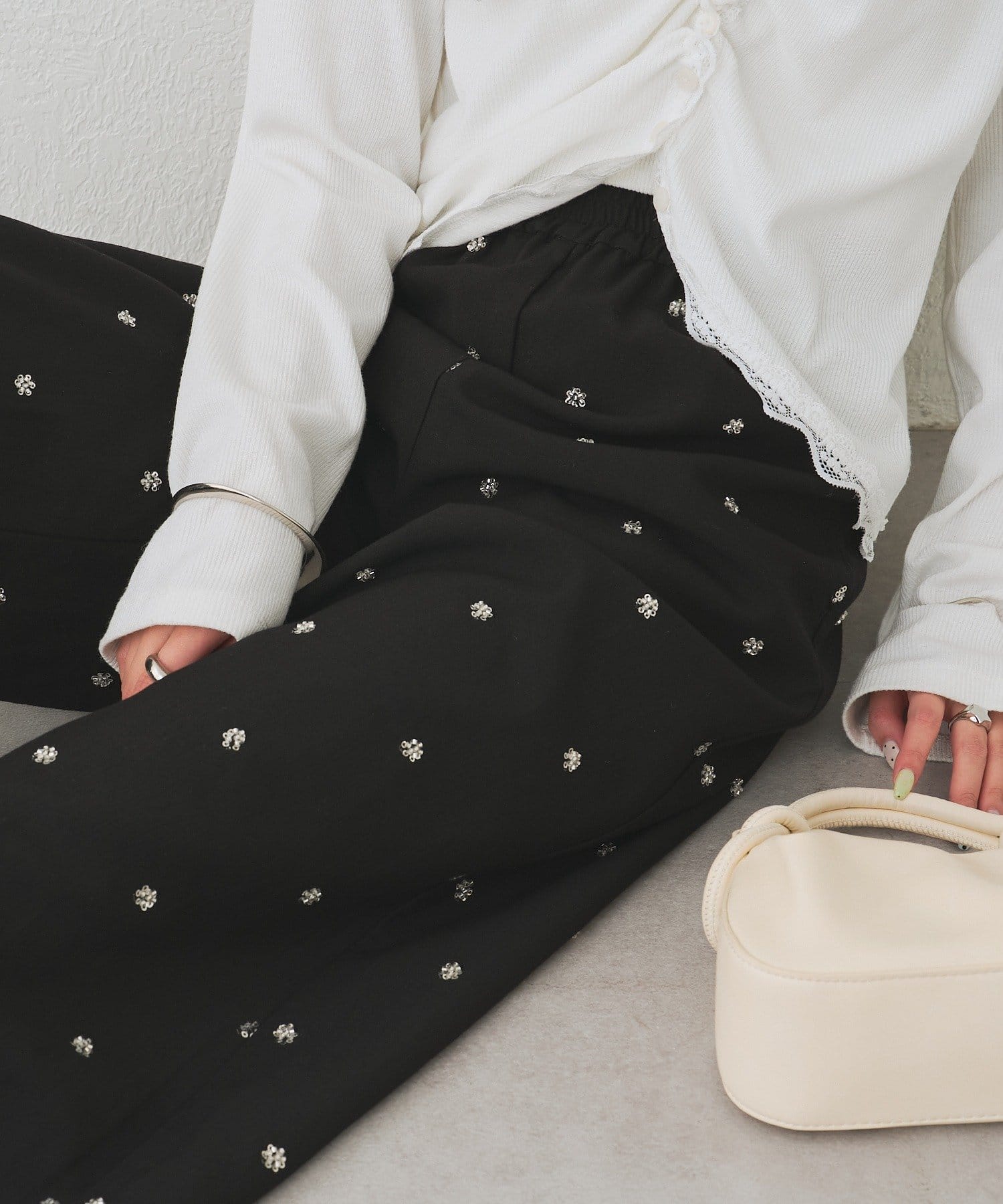 散りばめられた小花柄のビジューが目を惹く、大人可愛いスラックス