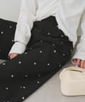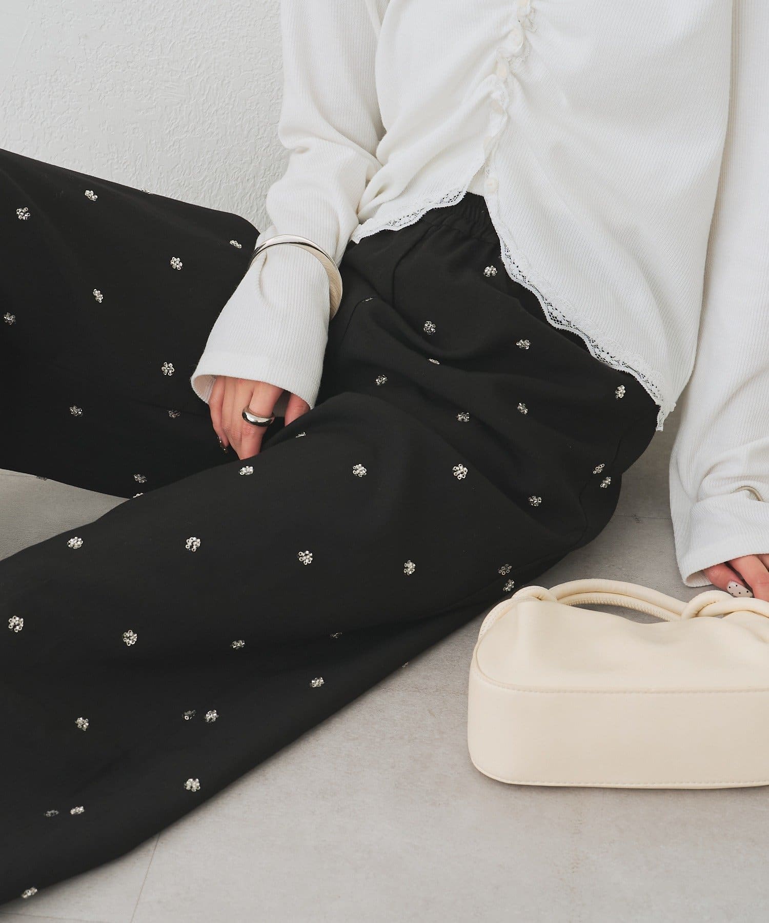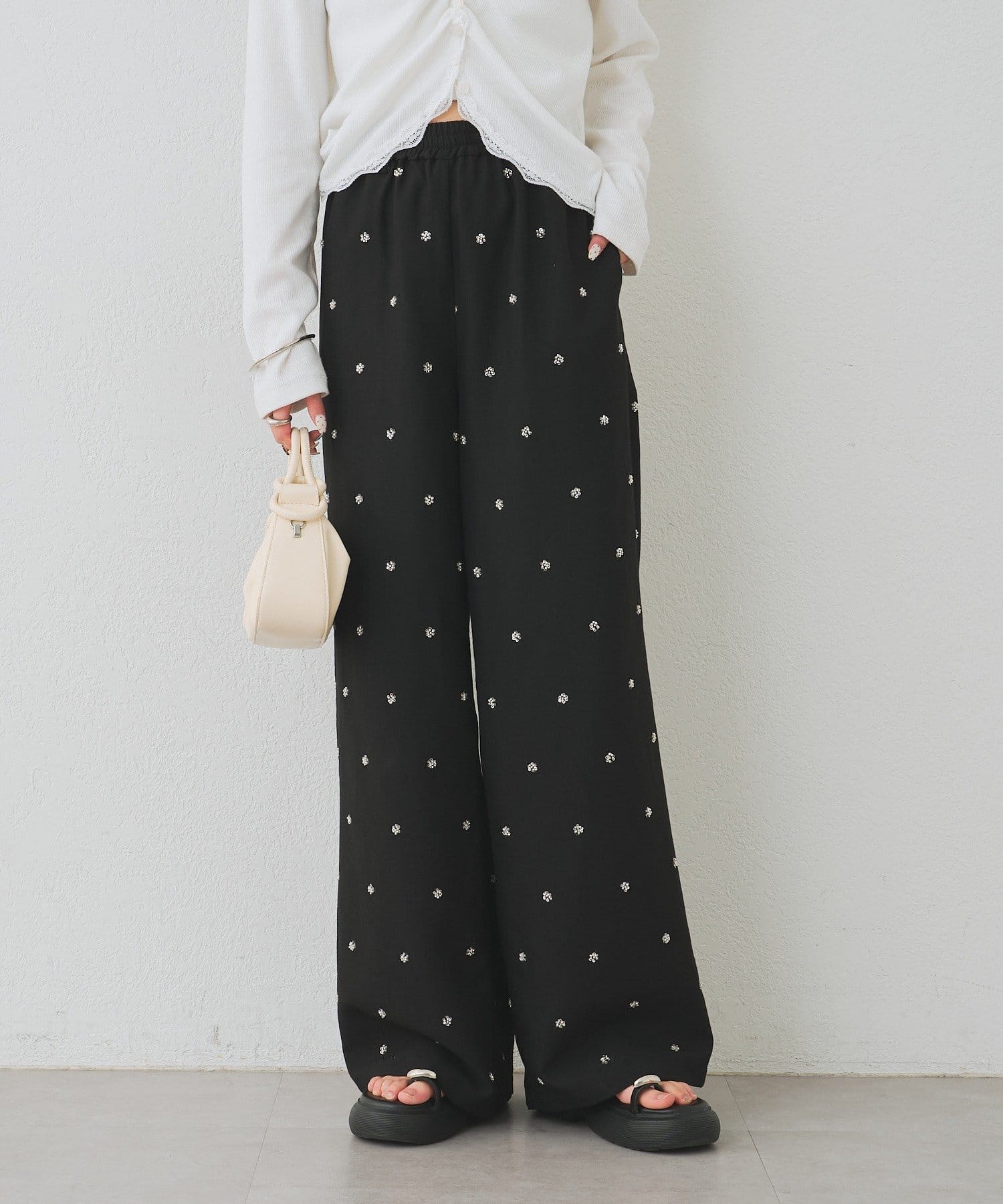 散りばめられた小花柄のビジューが目を惹く、大人可愛いスラックス