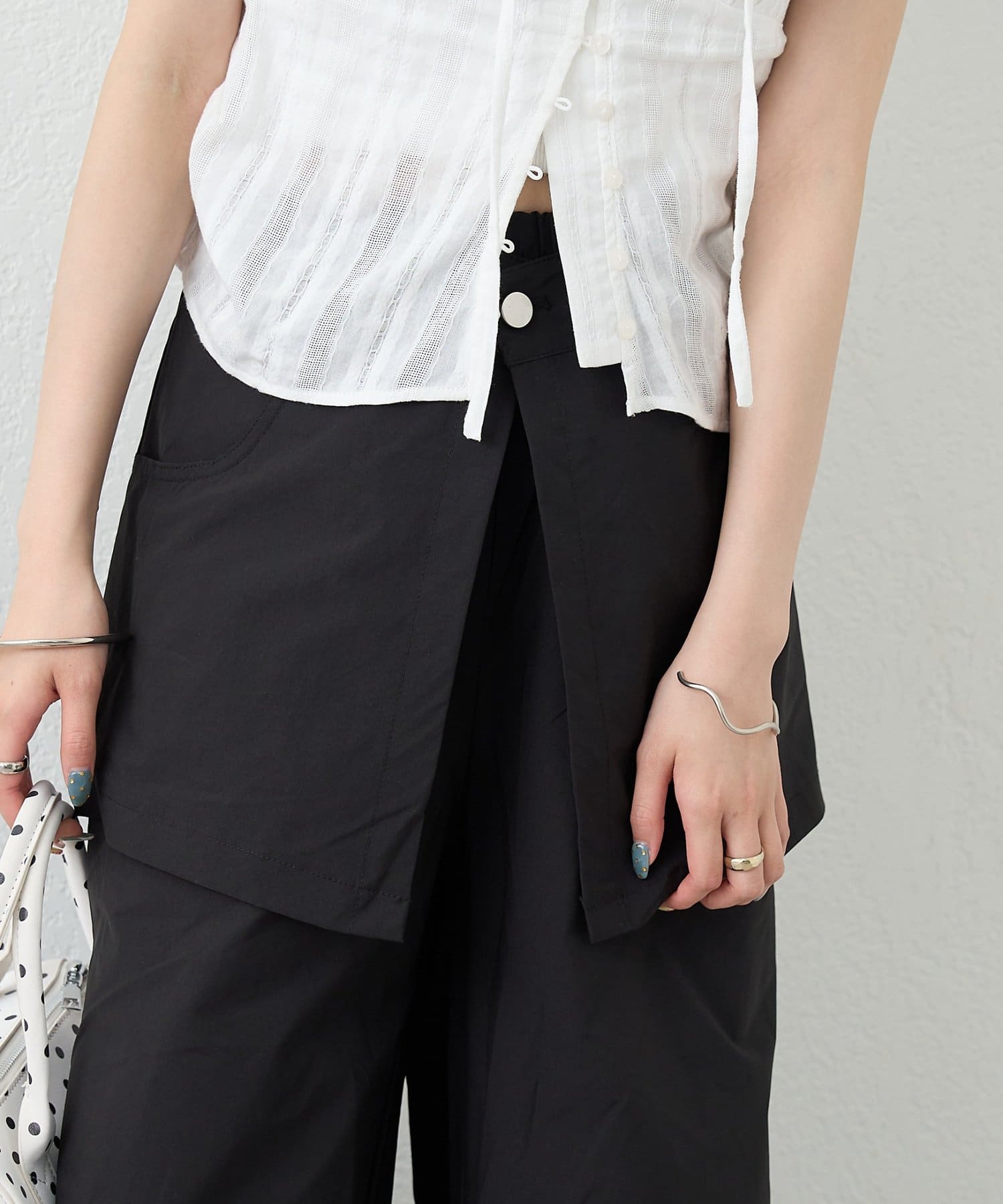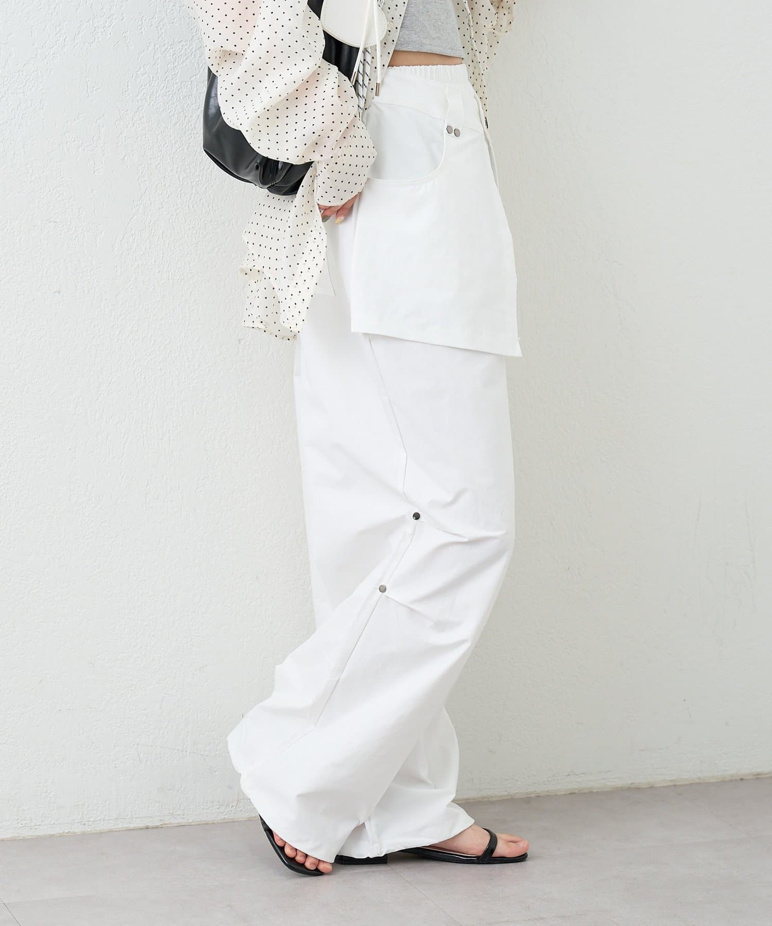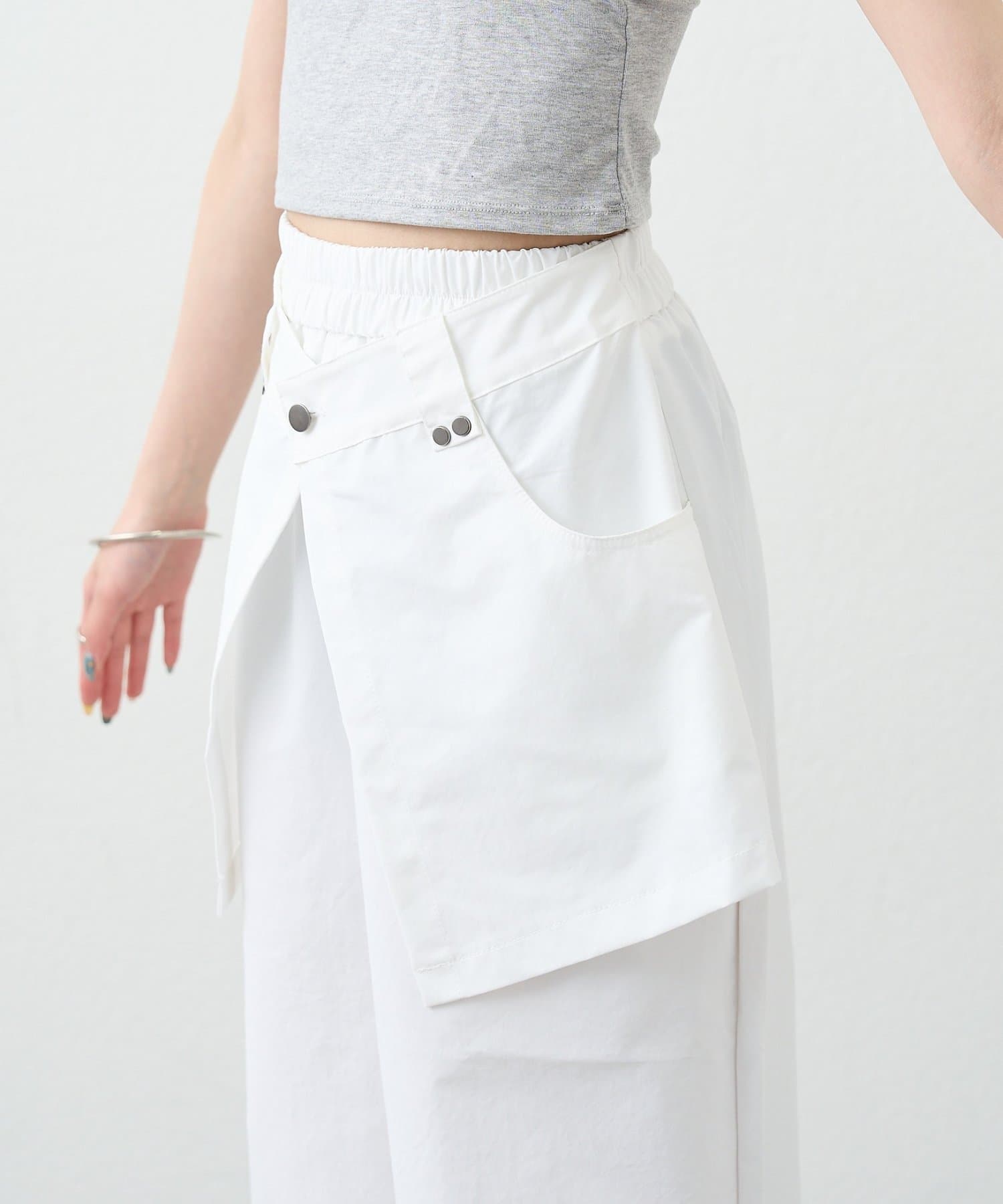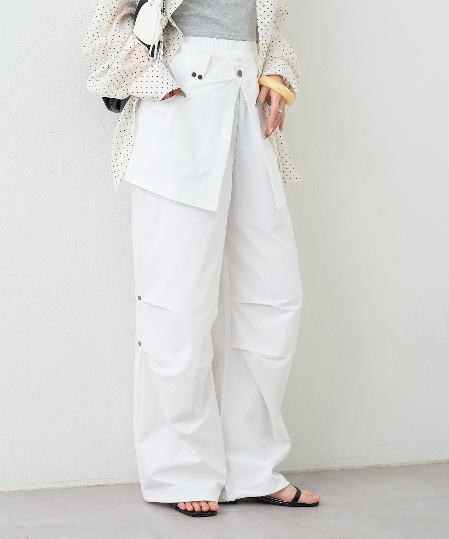 ・ワイドなシルエットでリラックス感があり、ラップデザインが気になる腰回りをカバーしてくれます。