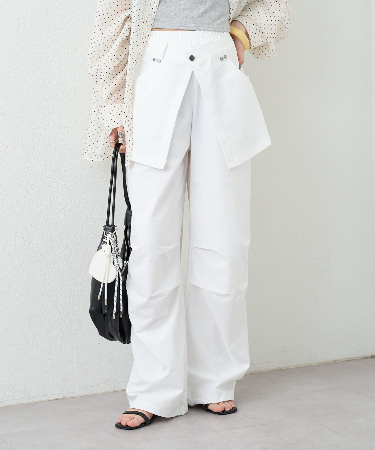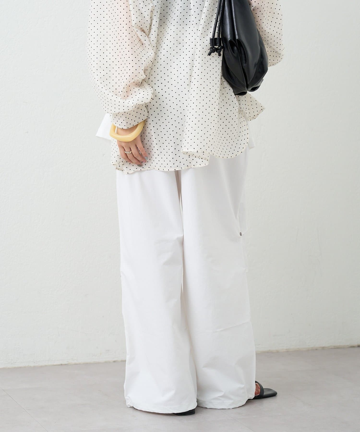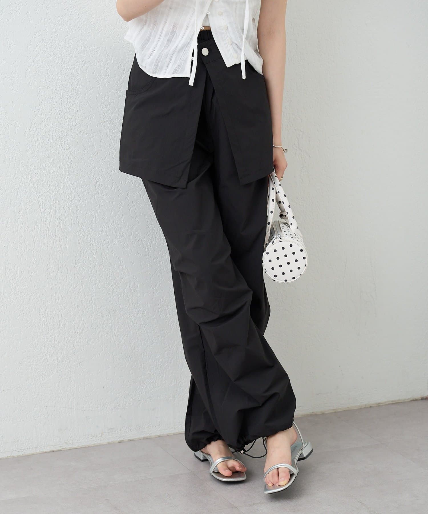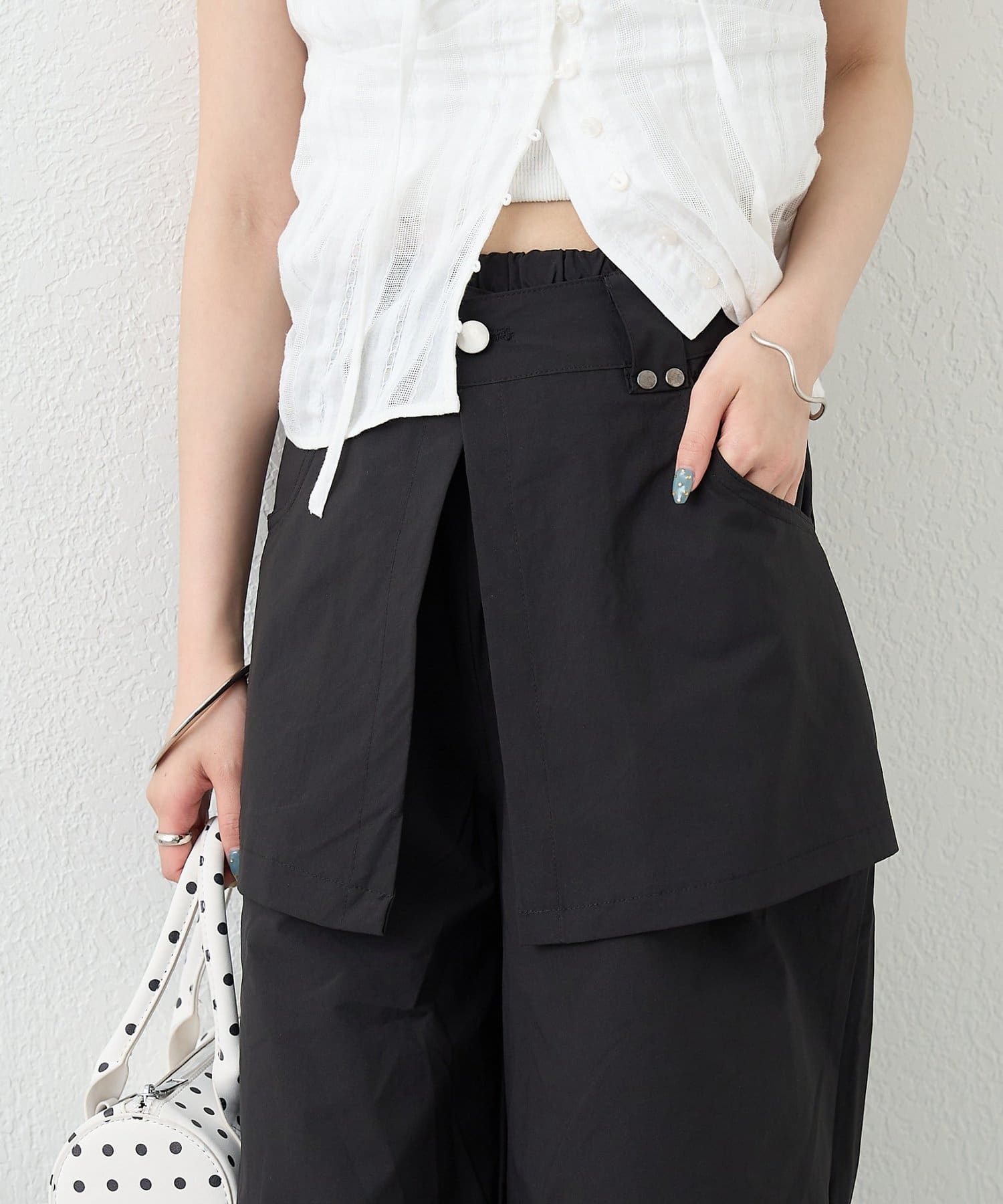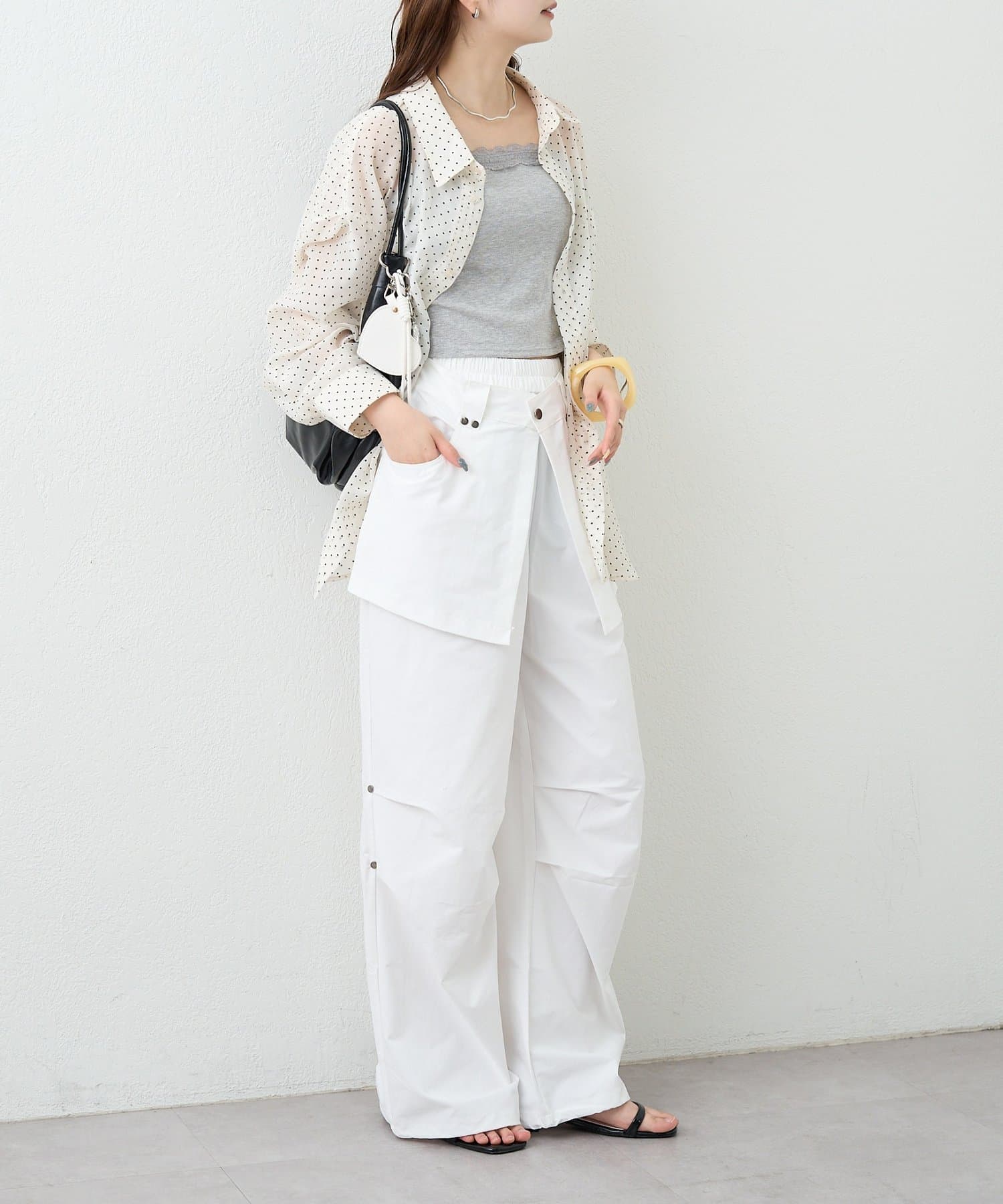 ・ワイドなシルエットでリラックス感があり、ラップデザインが気になる腰回りをカバーしてくれます。