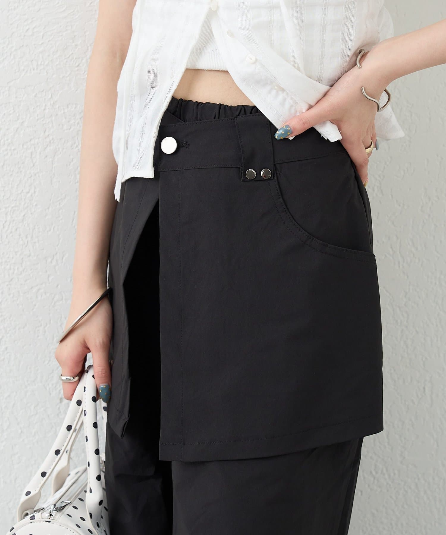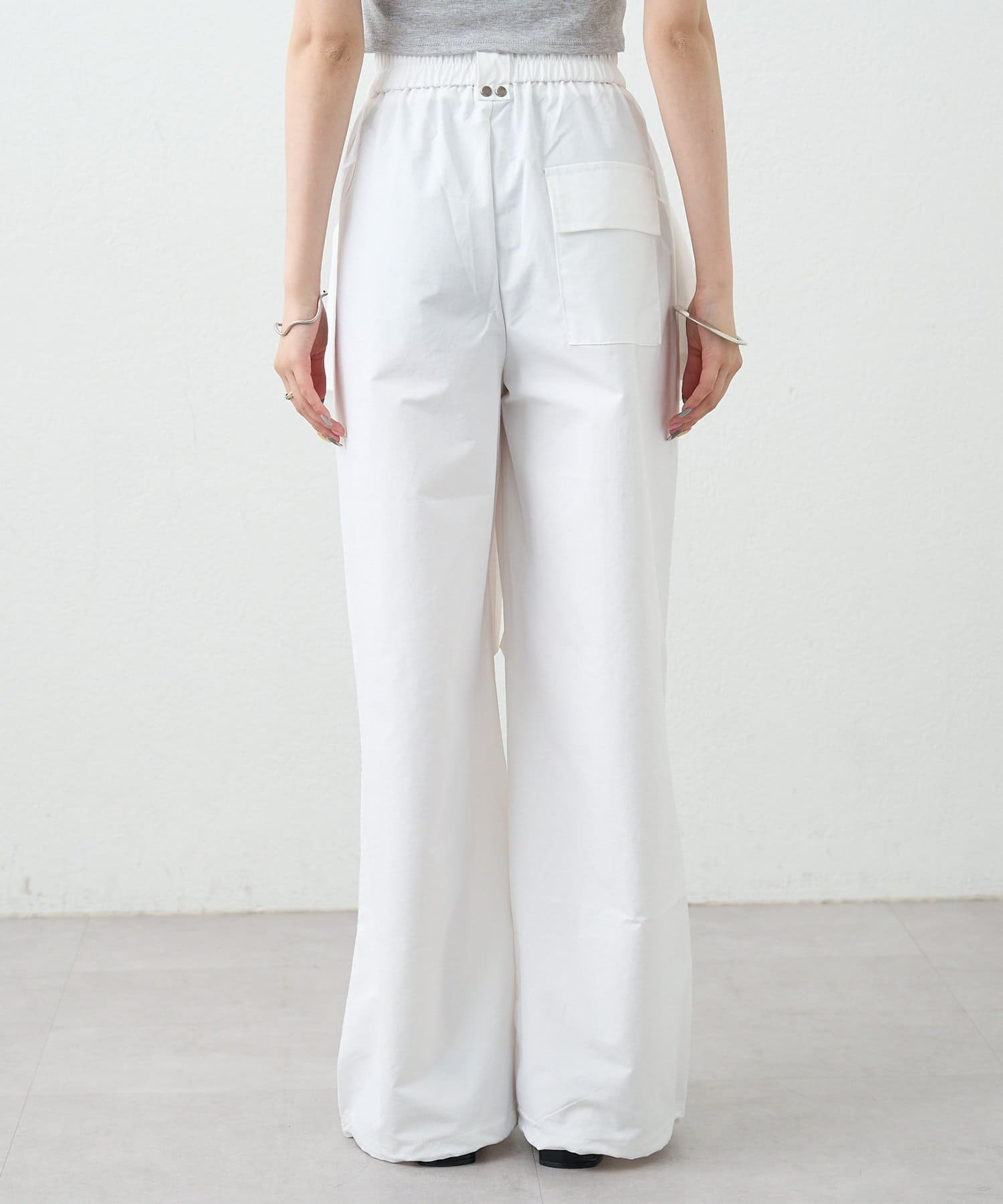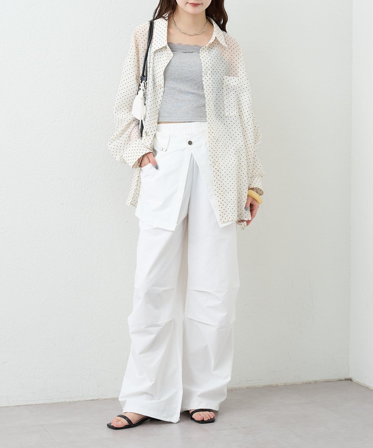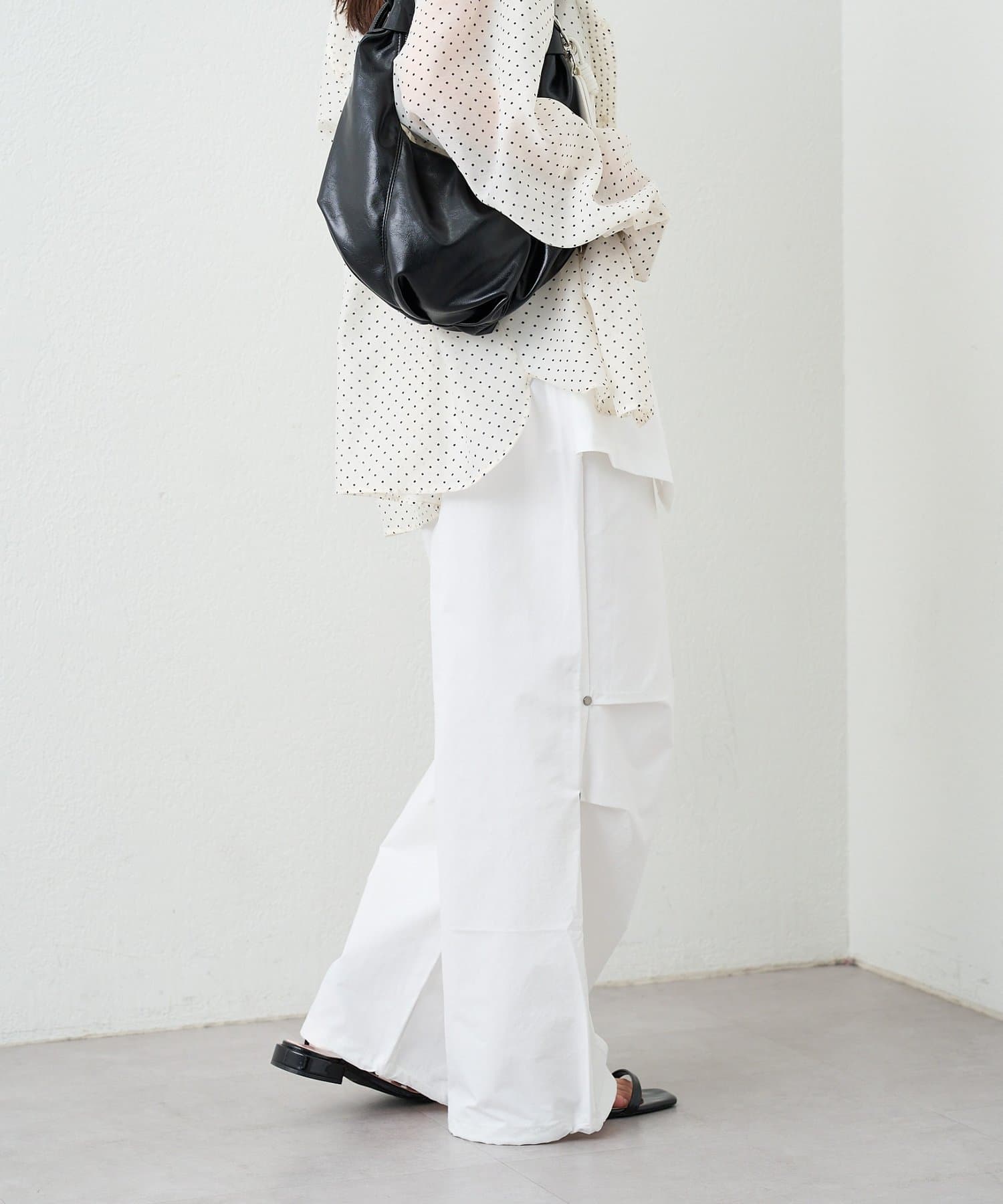 ・ワイドなシルエットでリラックス感があり、ラップデザインが気になる腰回りをカバーしてくれます。