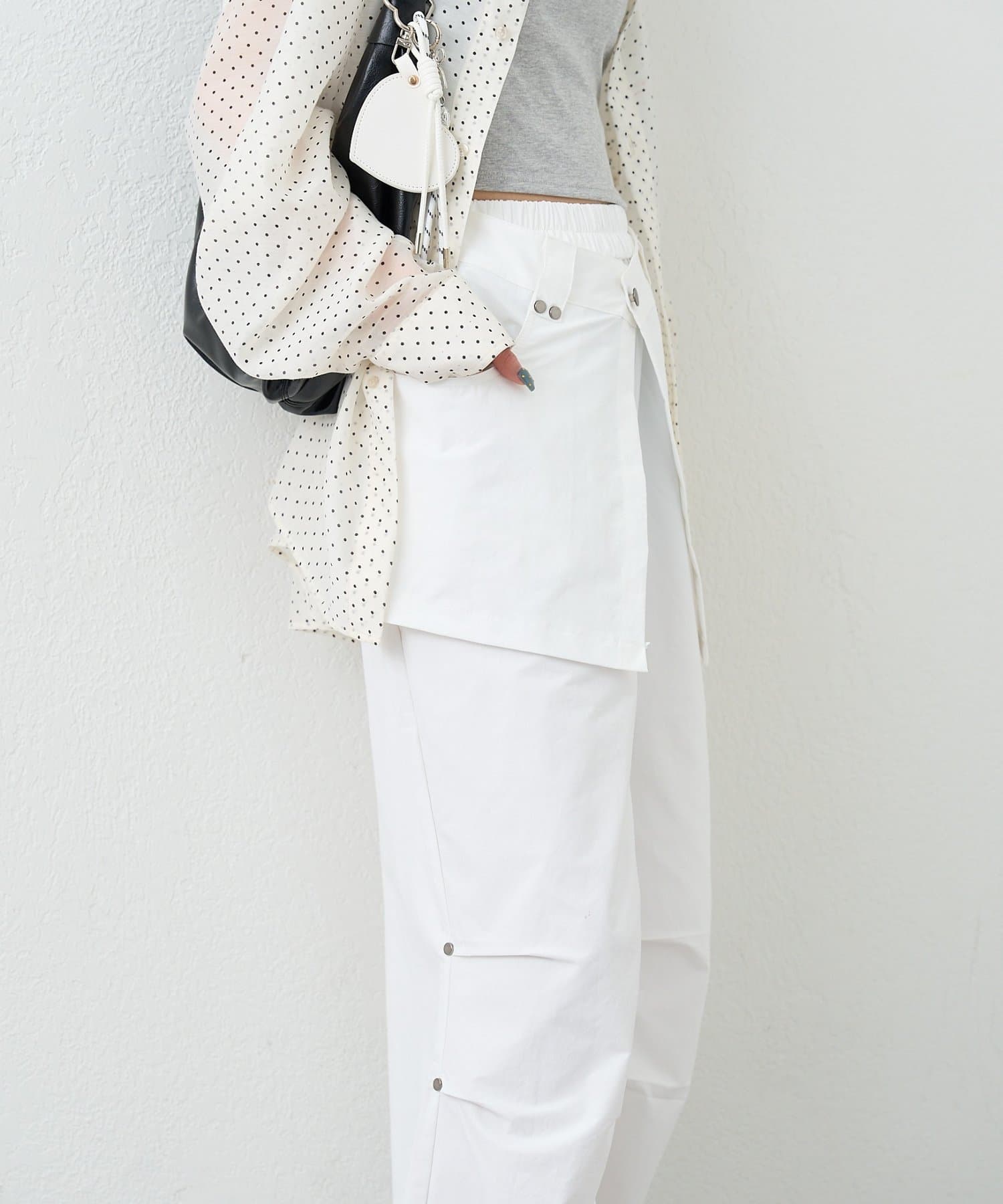 ・ラップデザインを重ねたようなレイヤード仕様が特徴のカーゴパンツ。