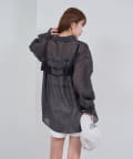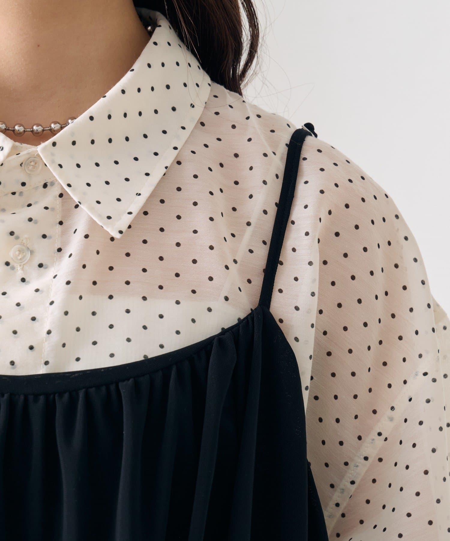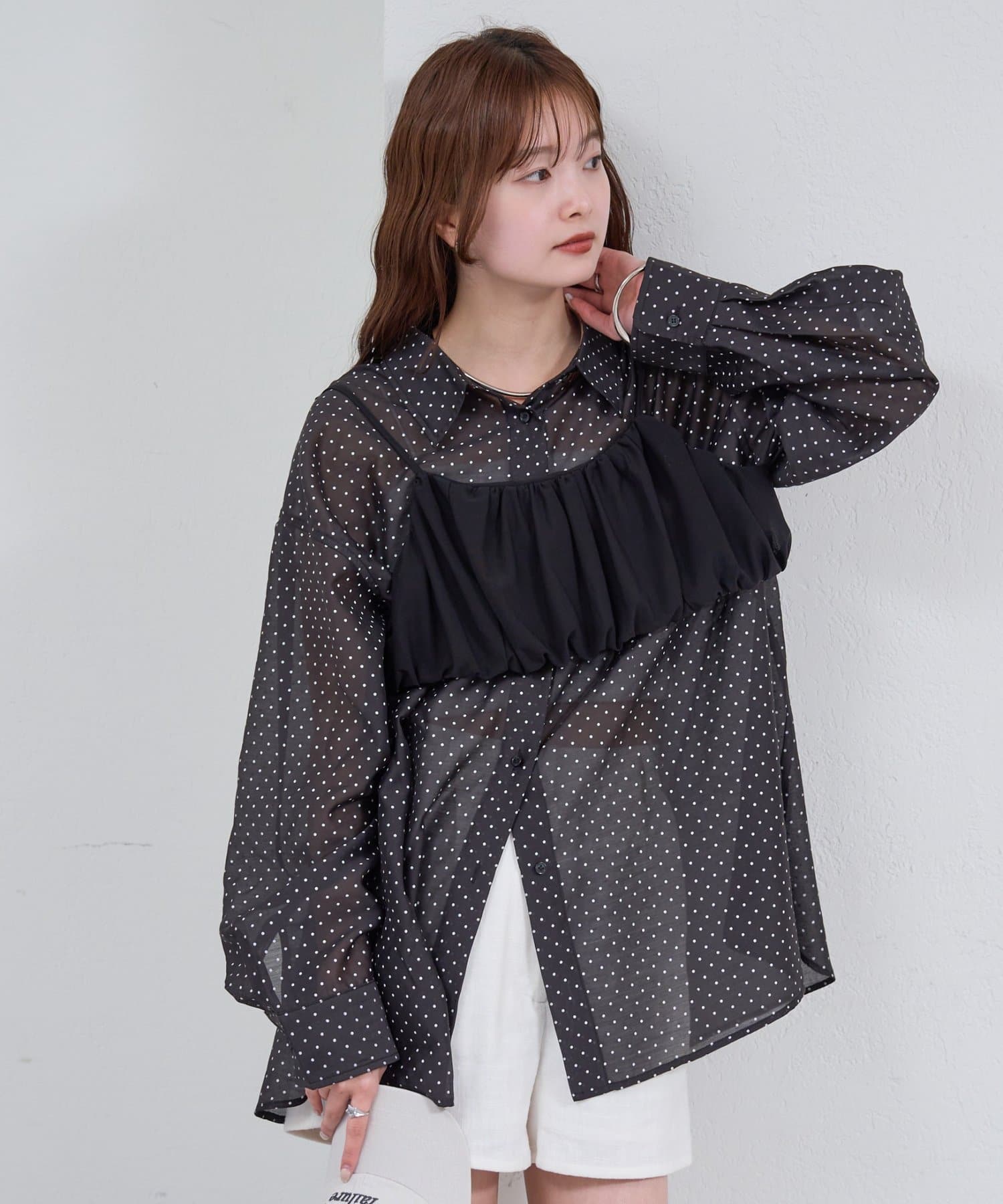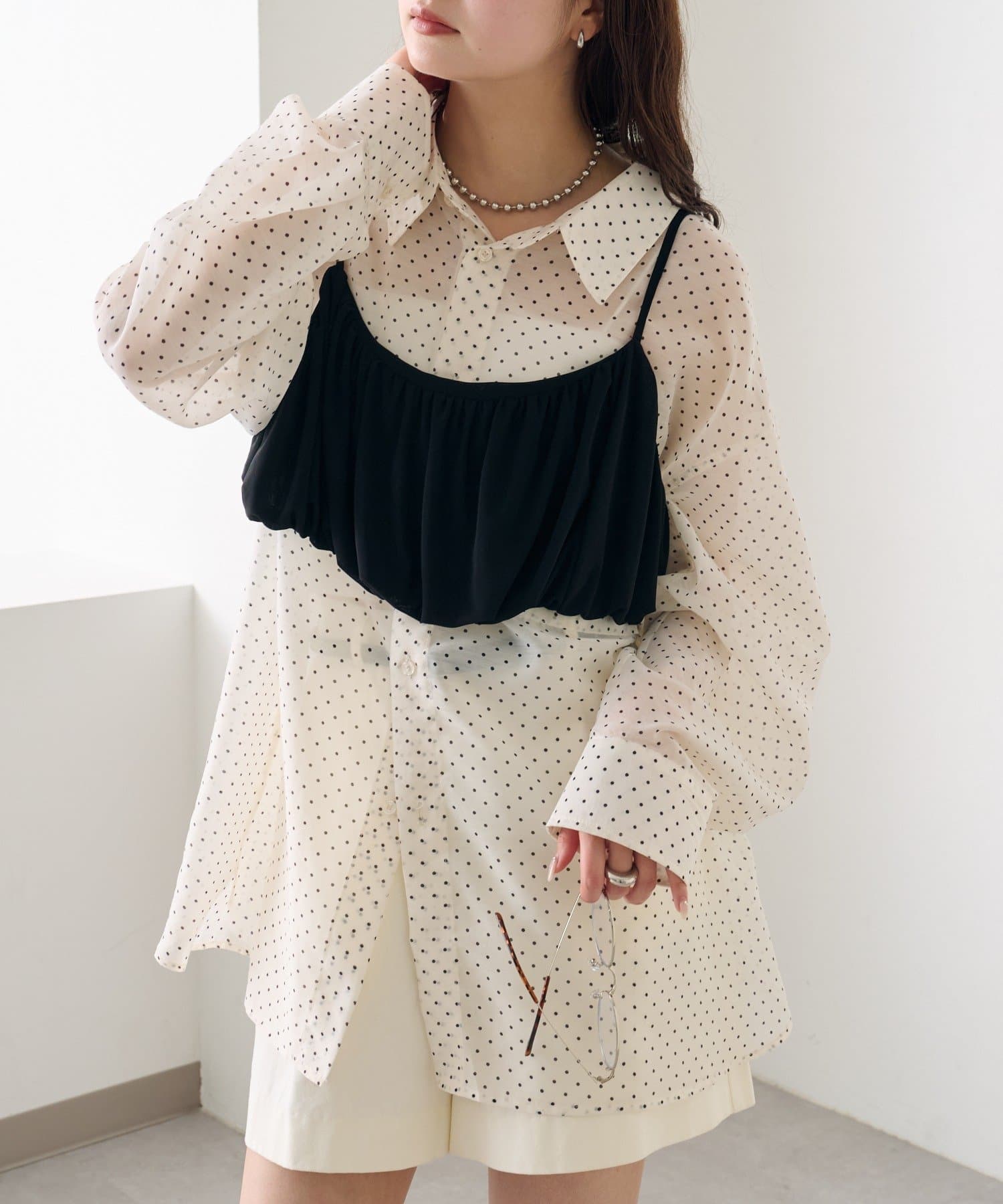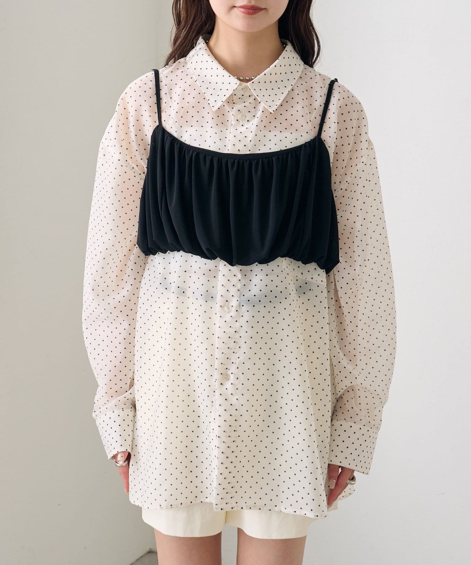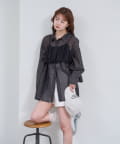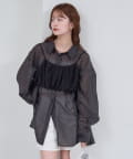 ・透け感のあるシアーシャツとビスチェがセットになった、着るだけでスタイリングが完成するアイテム。