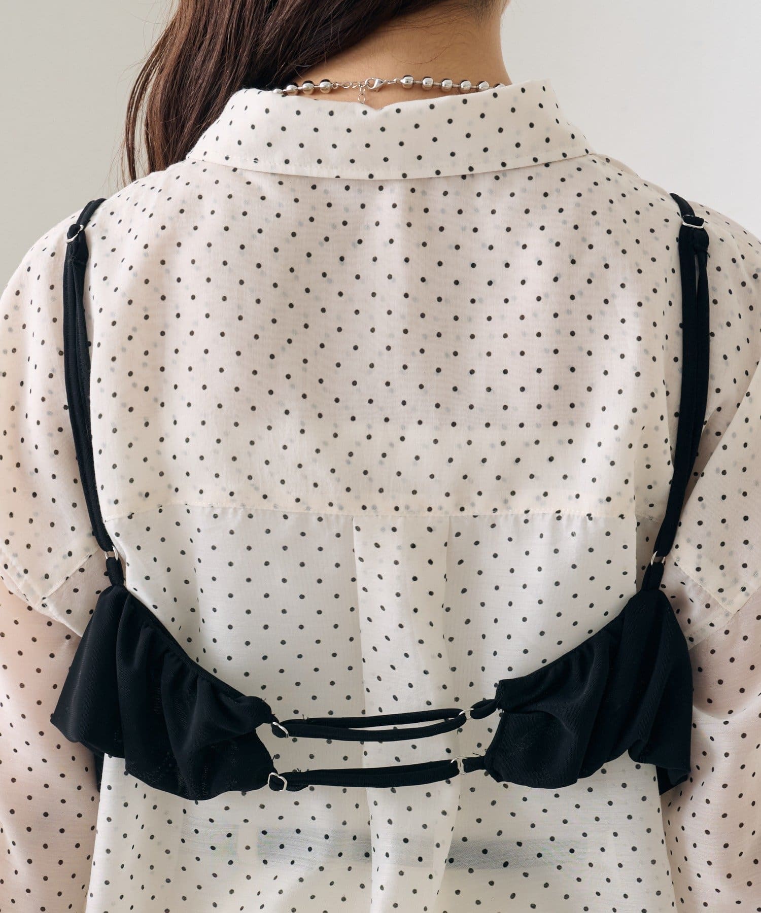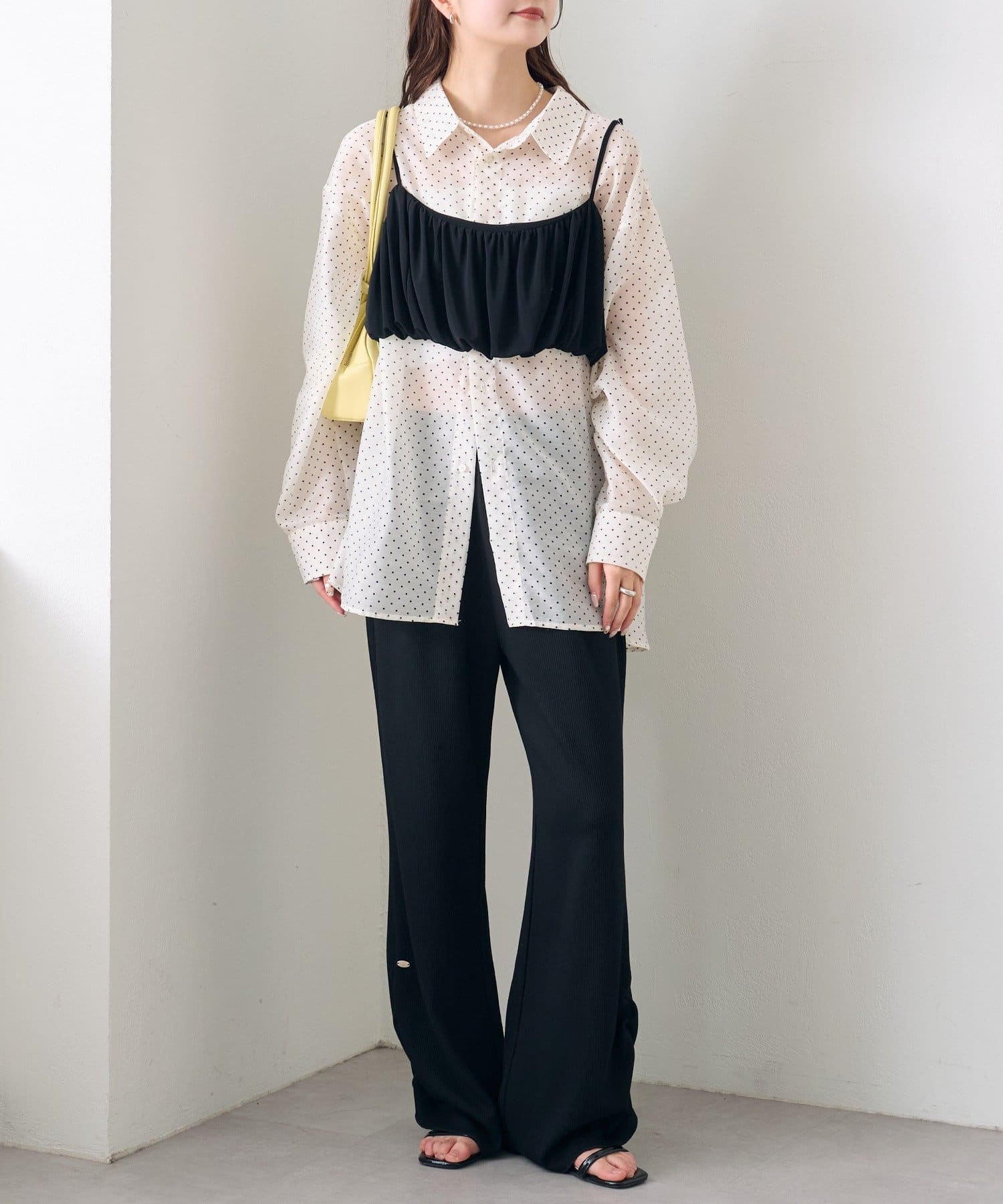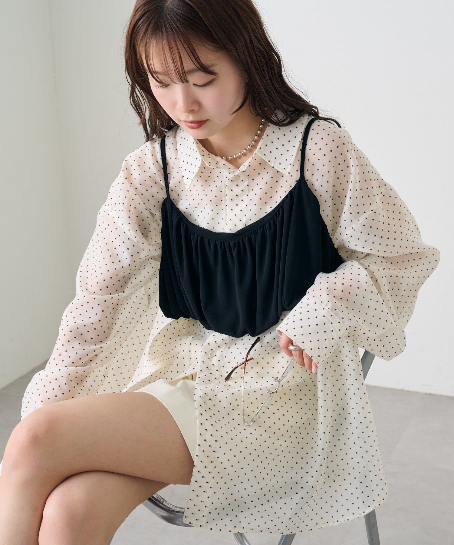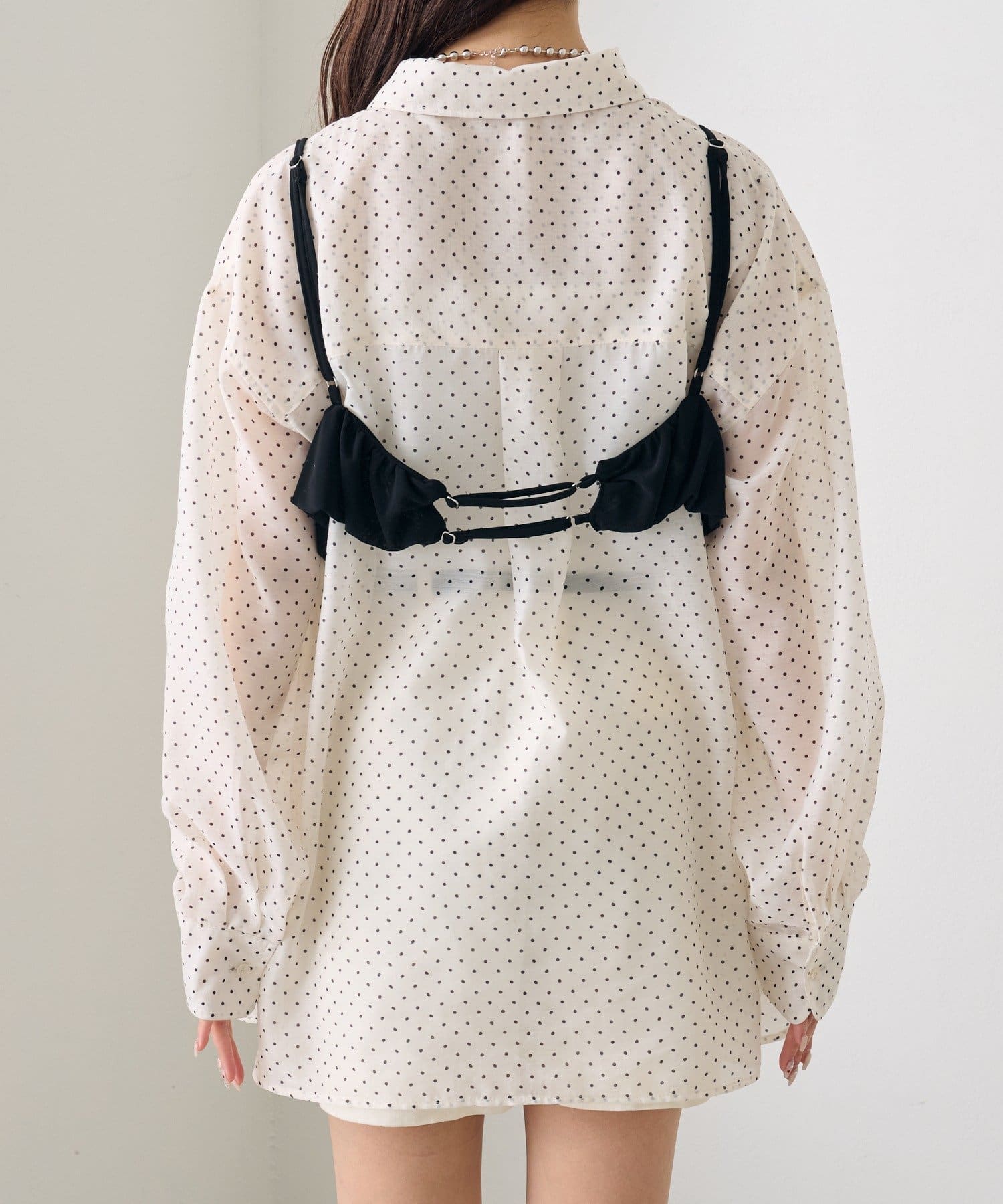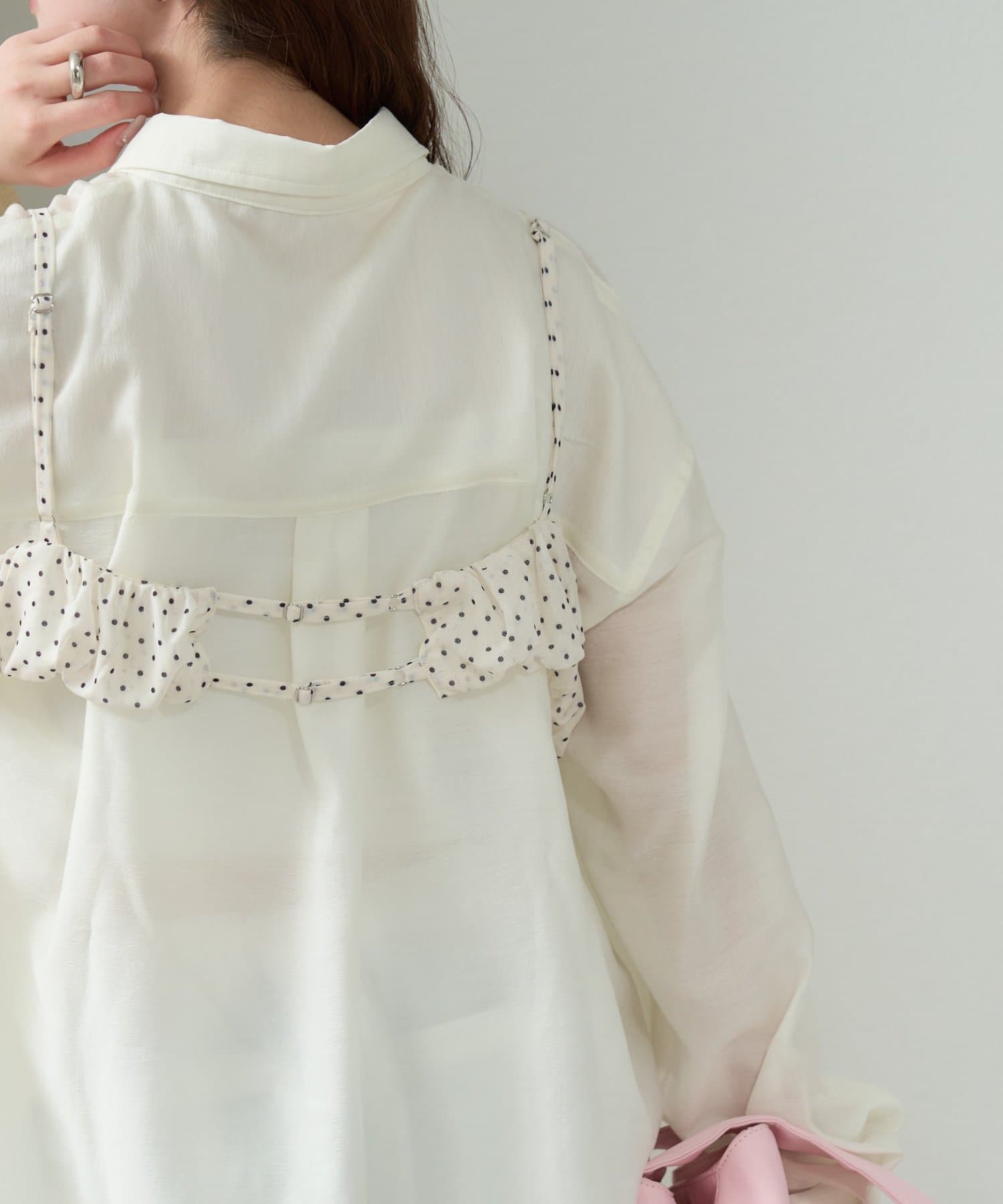 ・透け感のあるシアーシャツとビスチェがセットになった、着るだけでスタイリングが完成するアイテム。