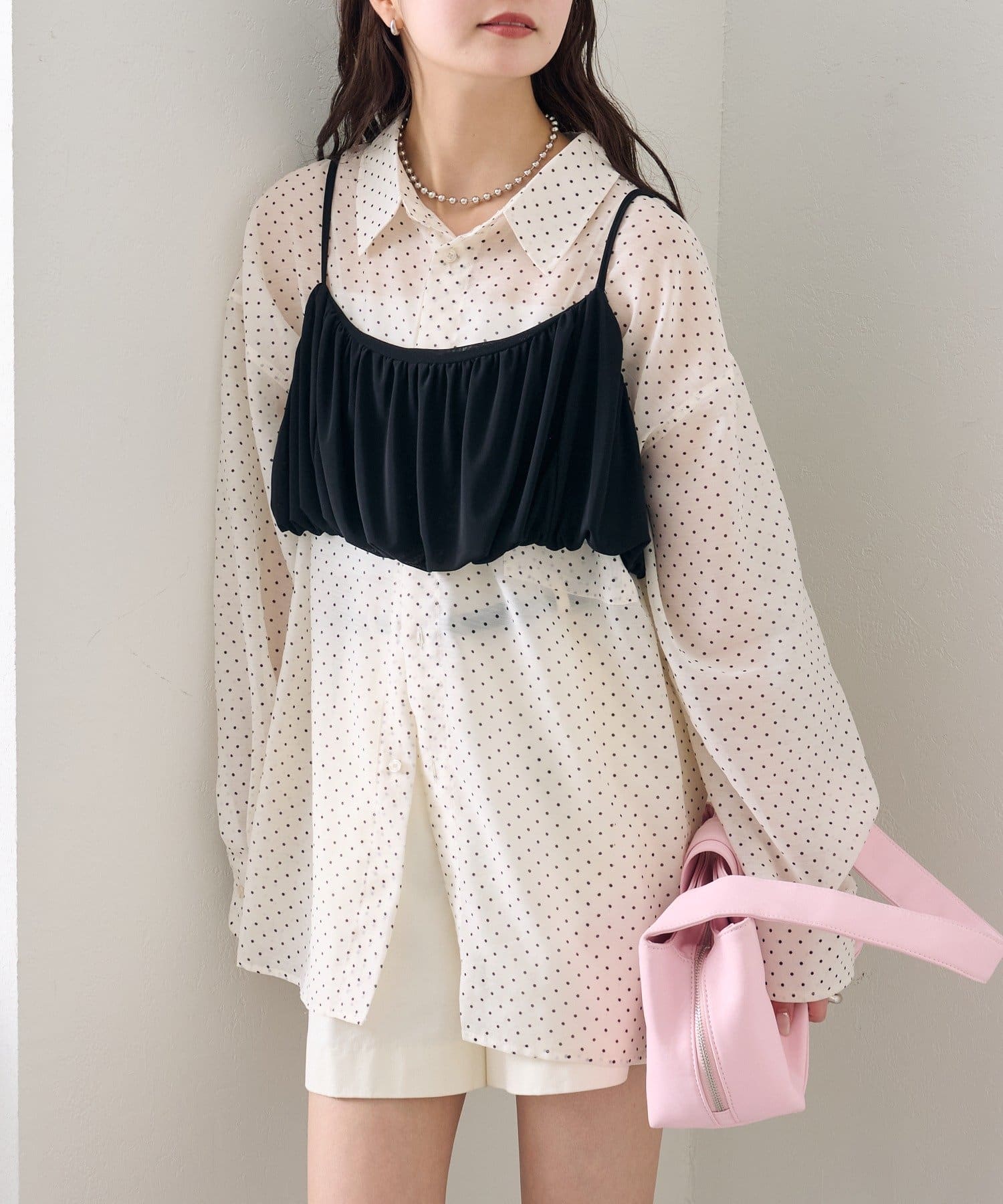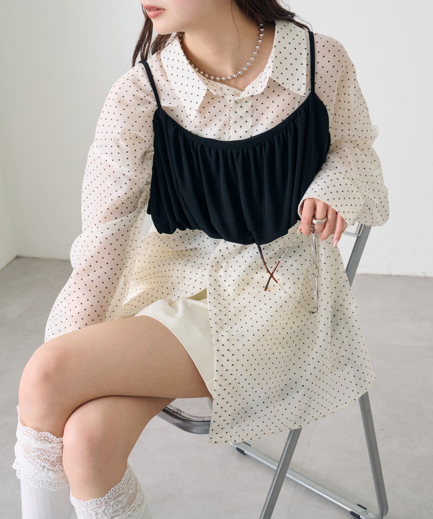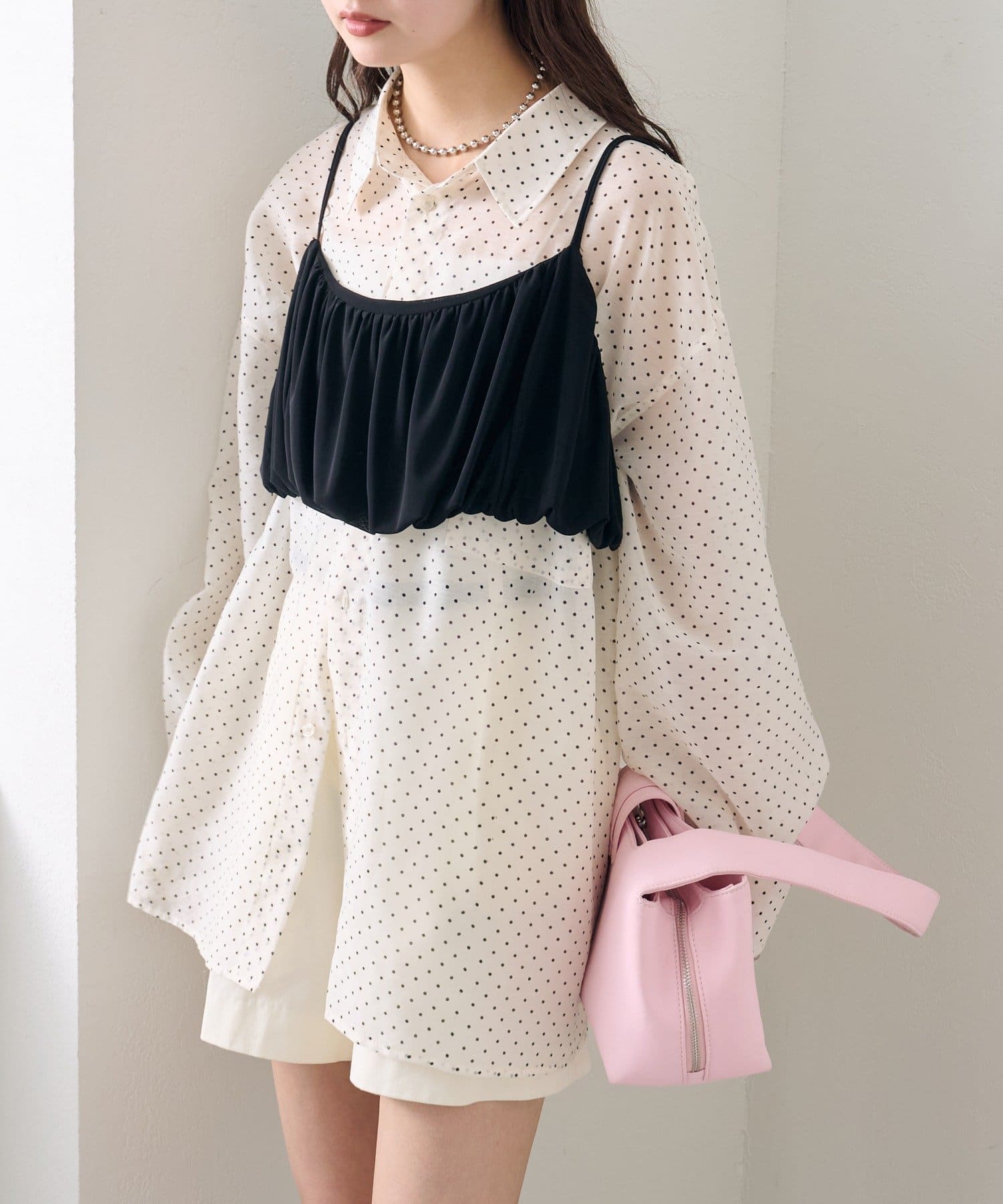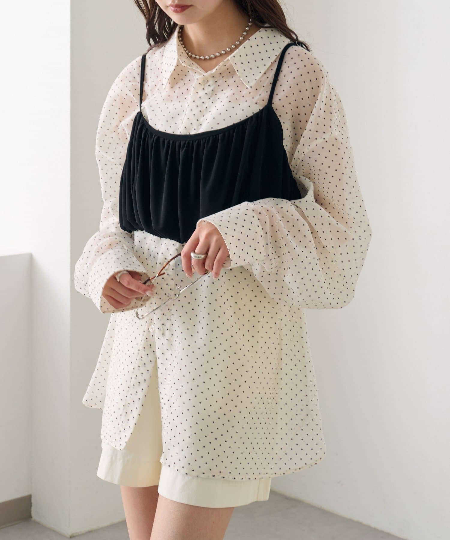 ・透け感のあるシアーシャツとビスチェがセットになった、着るだけでスタイリングが完成するアイテム。