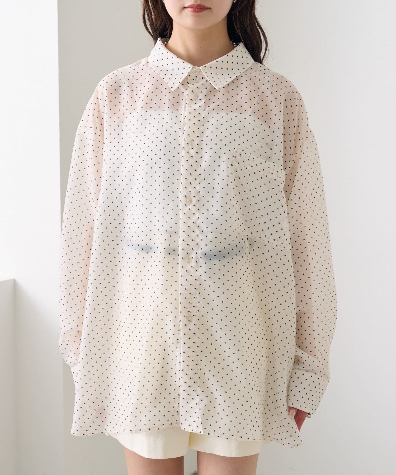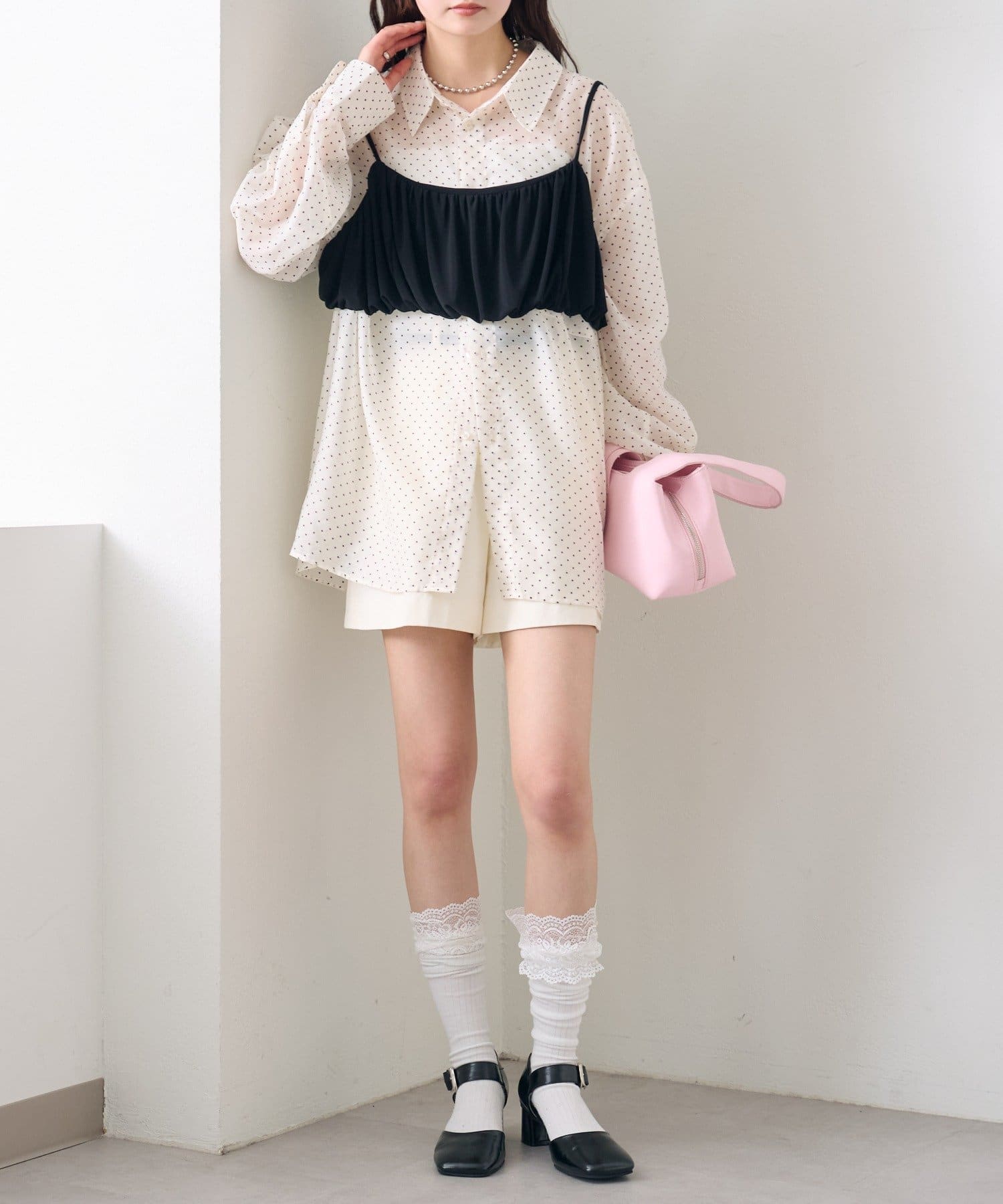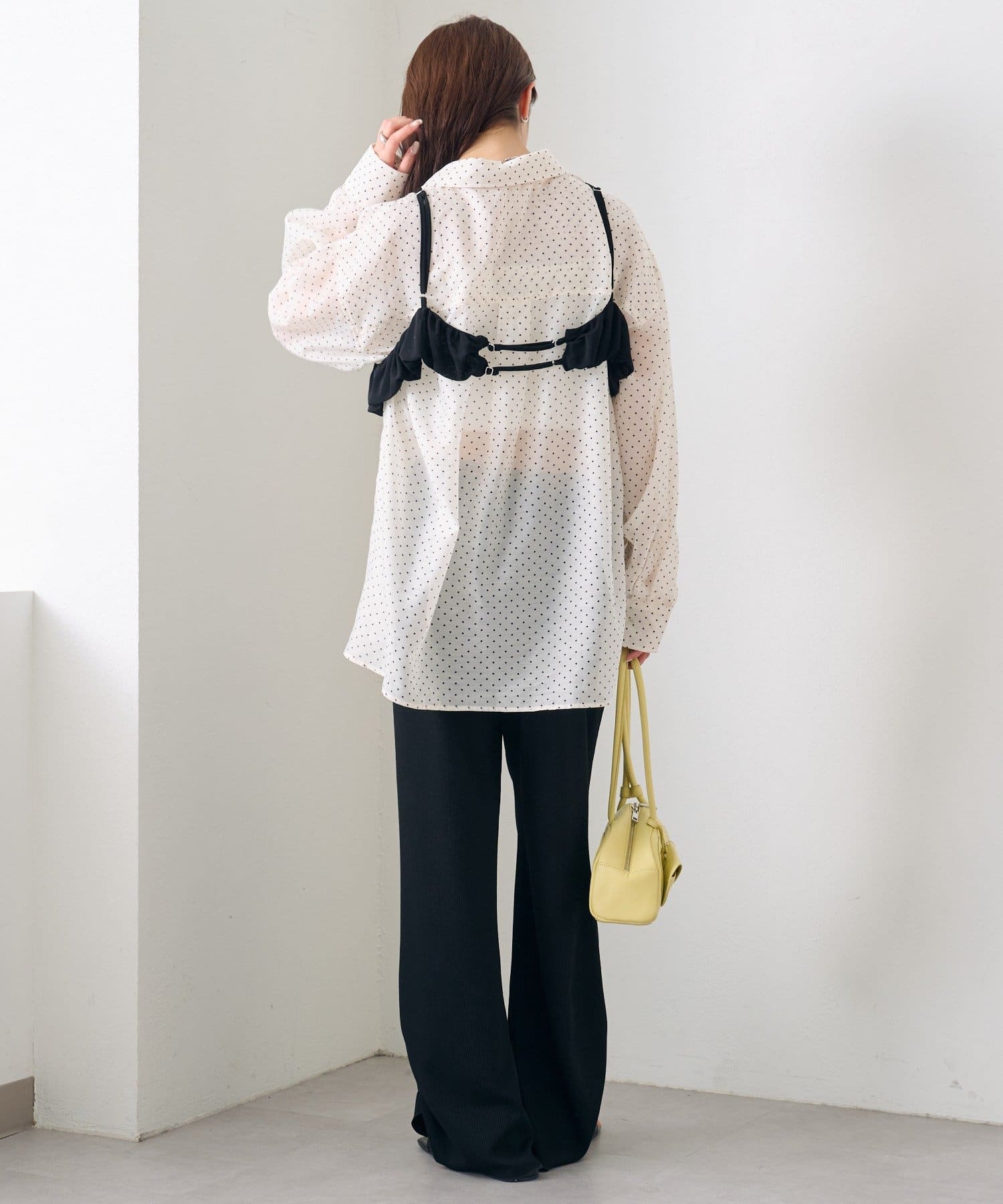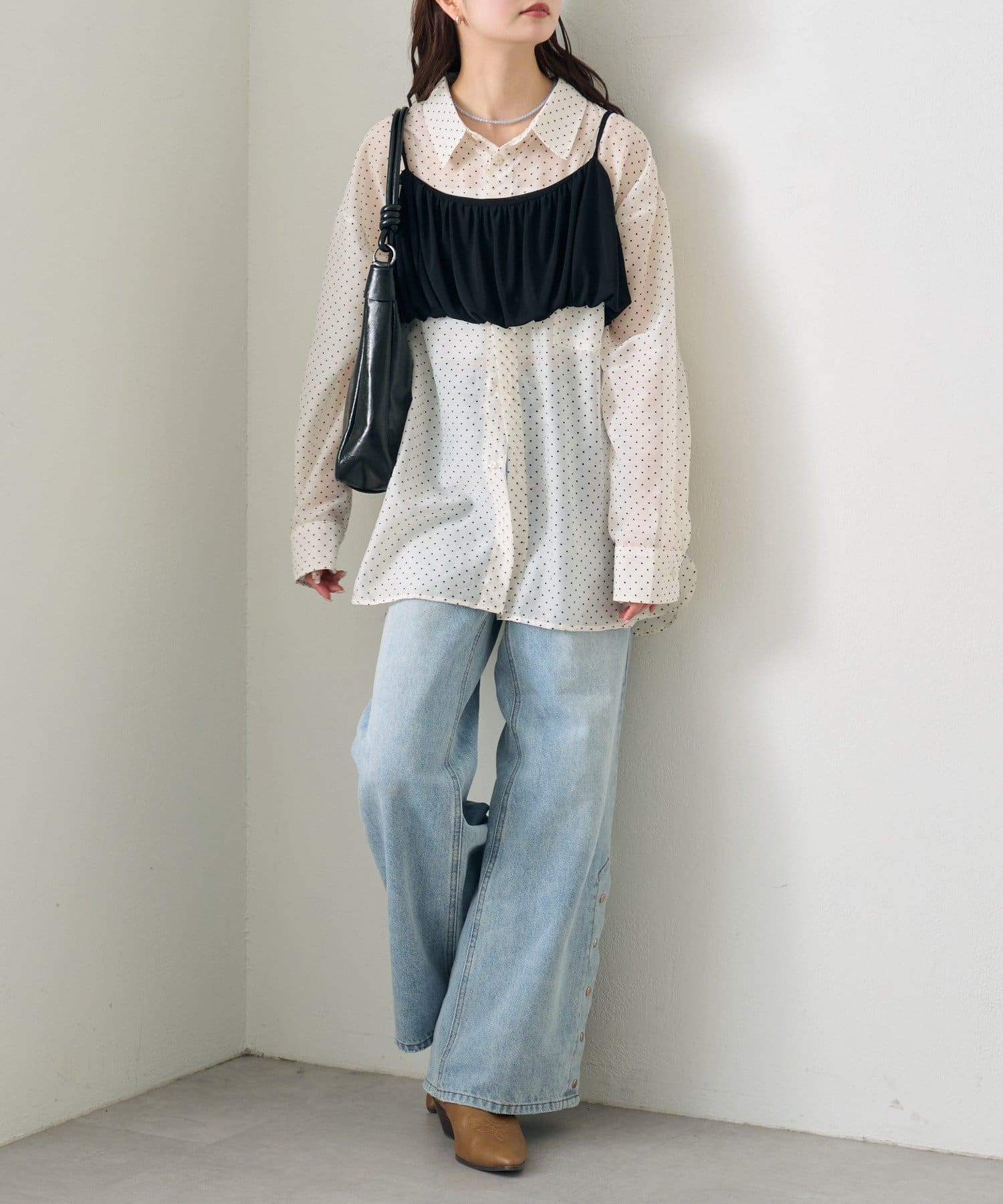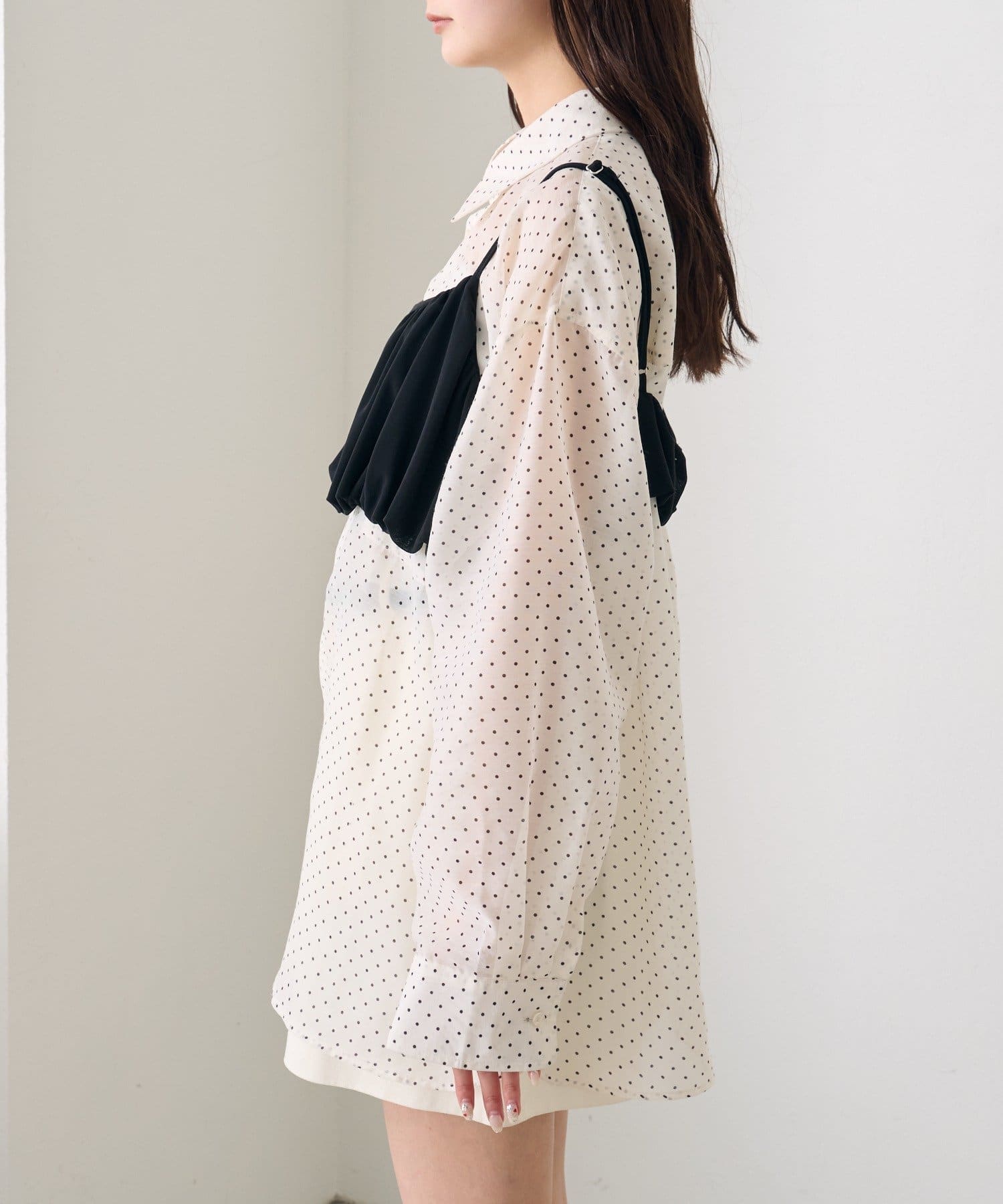 ・透け感のあるシアーシャツとビスチェがセットになった、着るだけでスタイリングが完成するアイテム。
