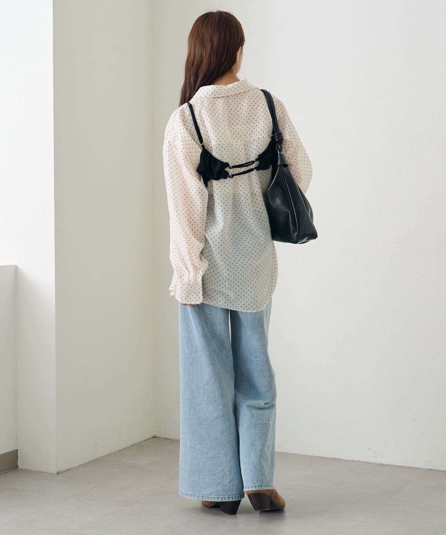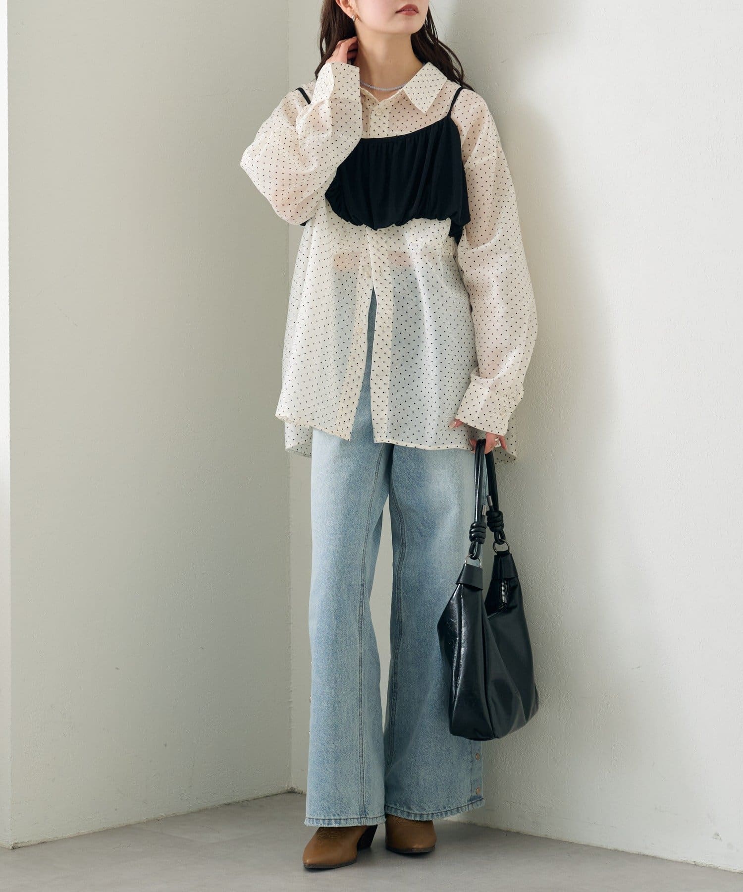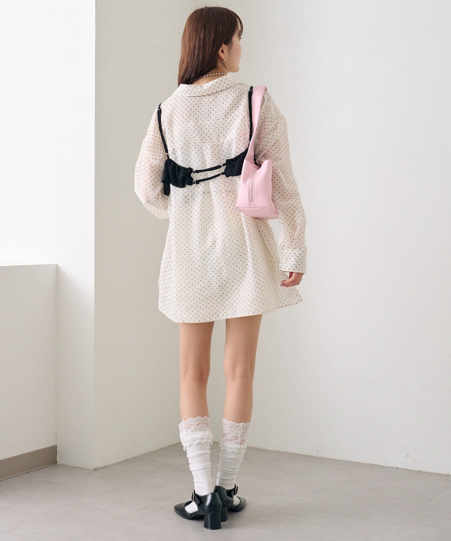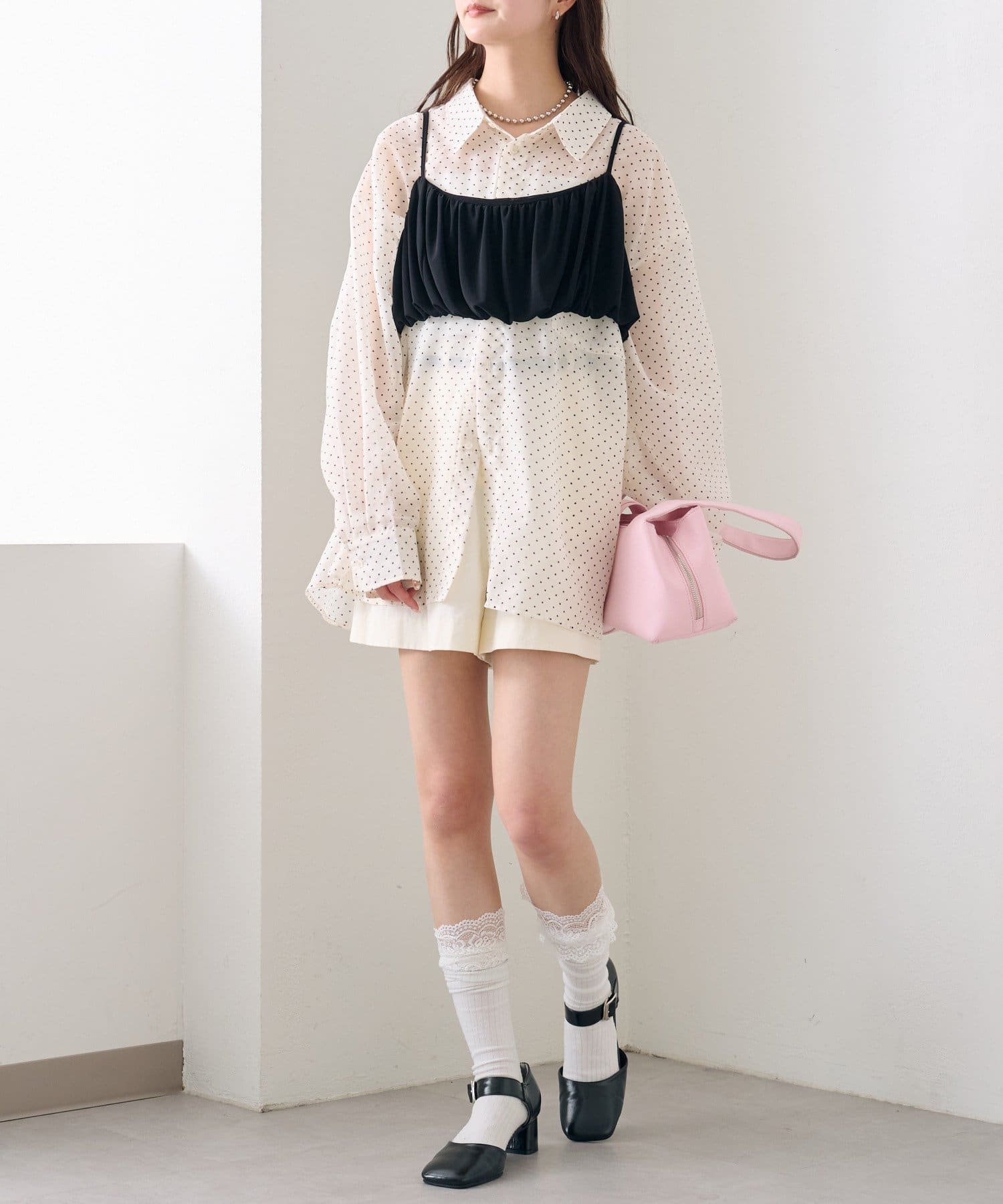 ・透け感のあるシアーシャツとビスチェがセットになった、着るだけでスタイリングが完成するアイテム。