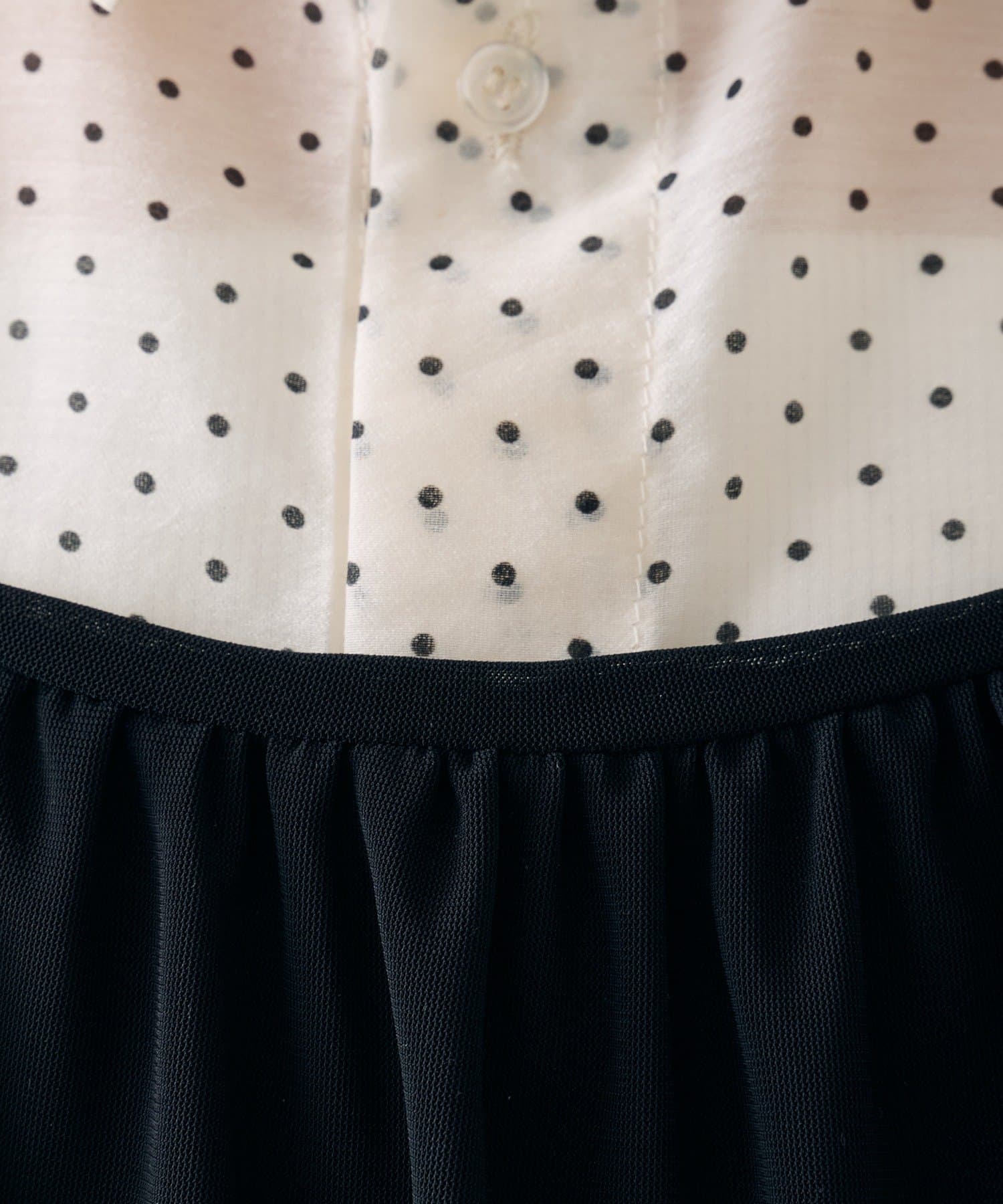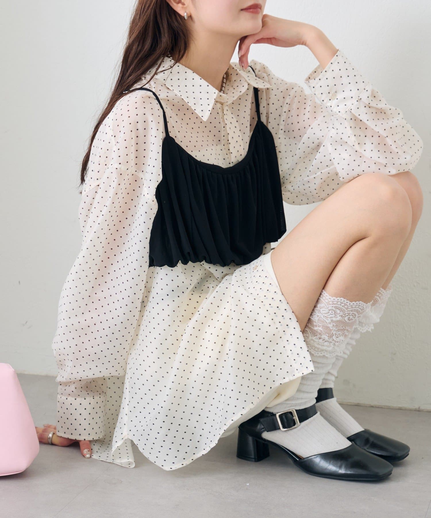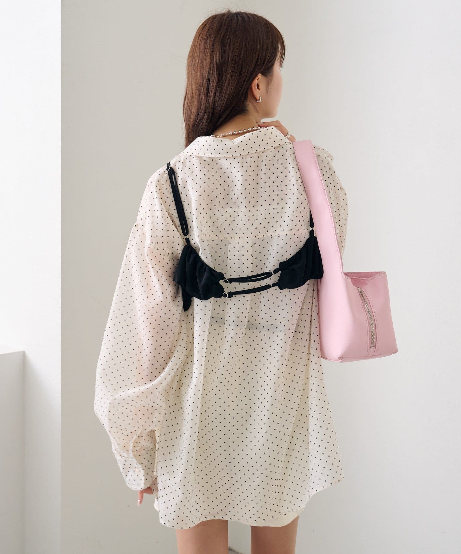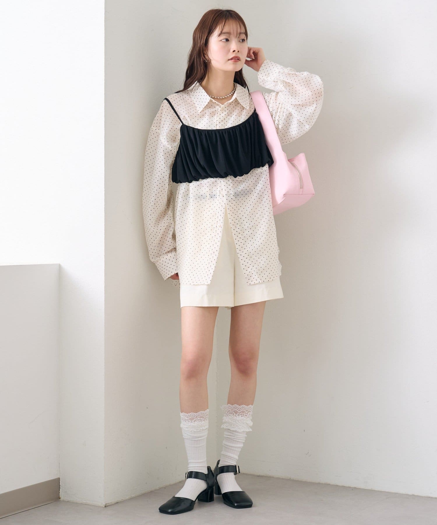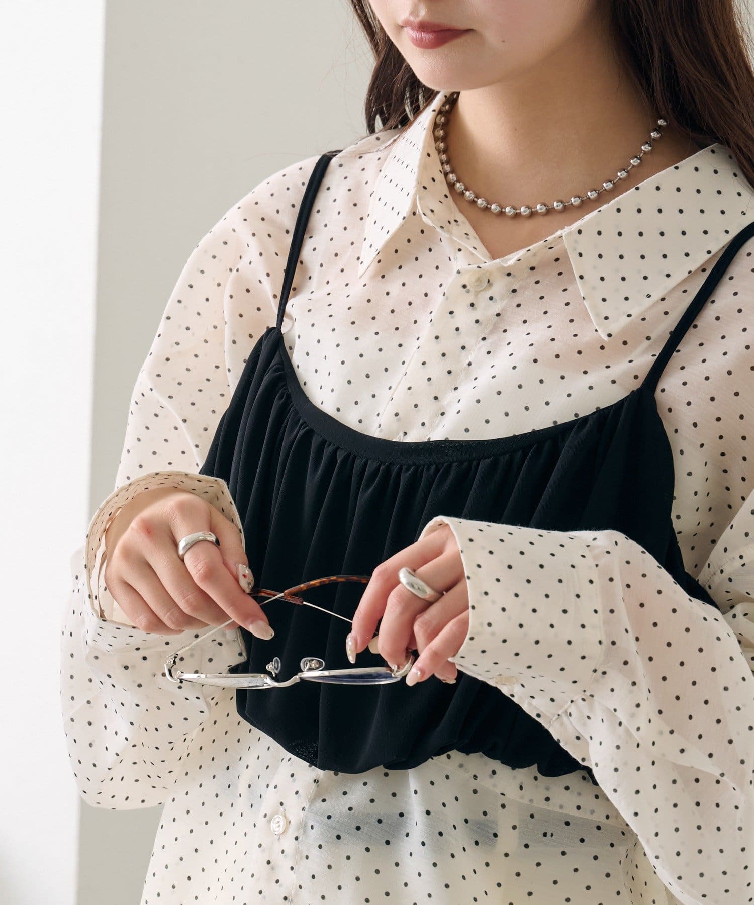 ・透け感のあるシアーシャツとビスチェがセットになった、着るだけでスタイリングが完成するアイテム。