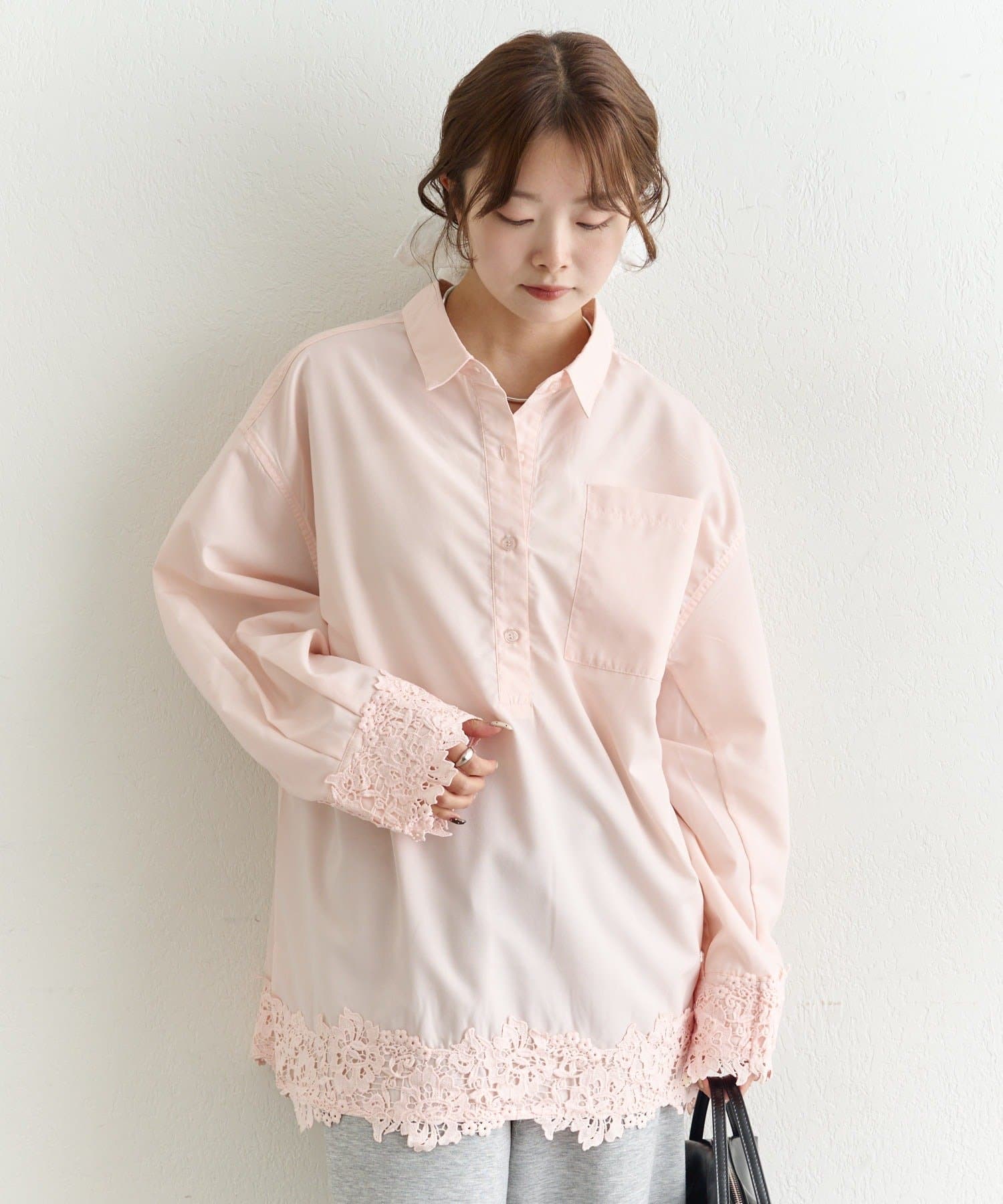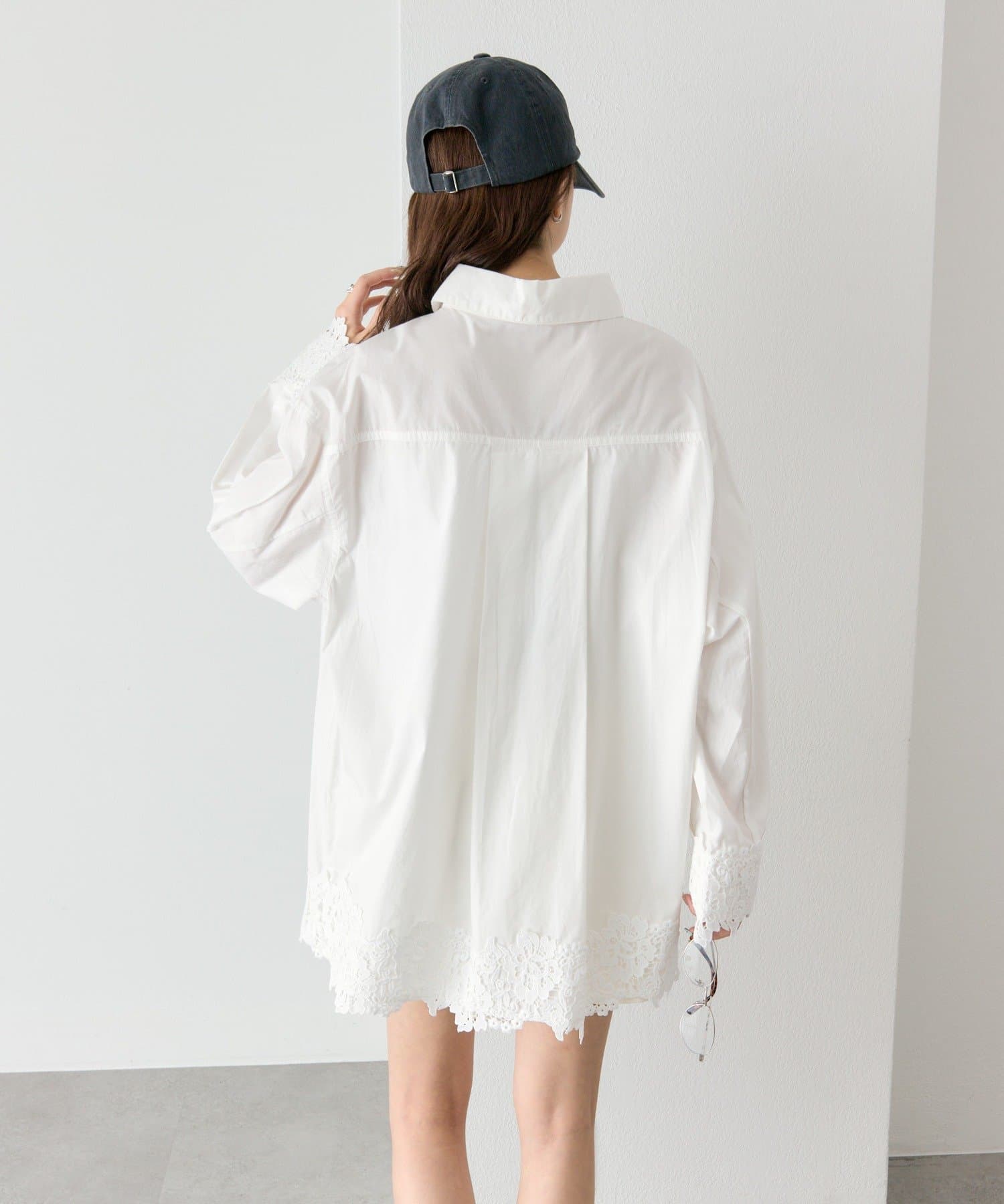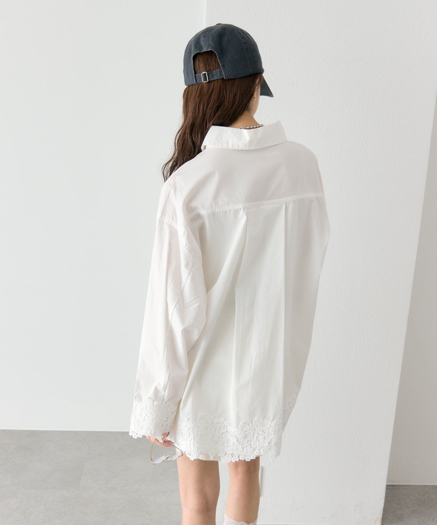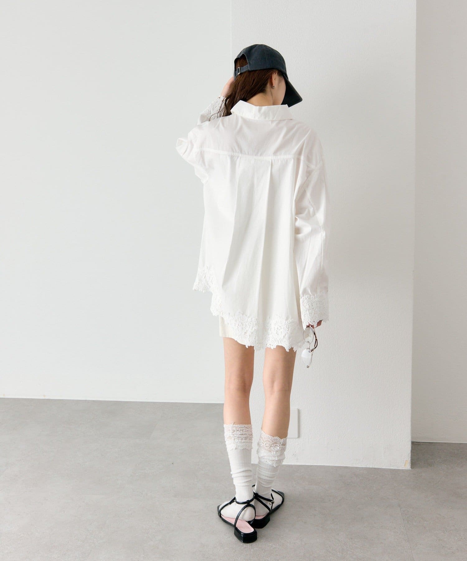 抜け感と女性らしさを両立した、裾レーススキッパーシャツ