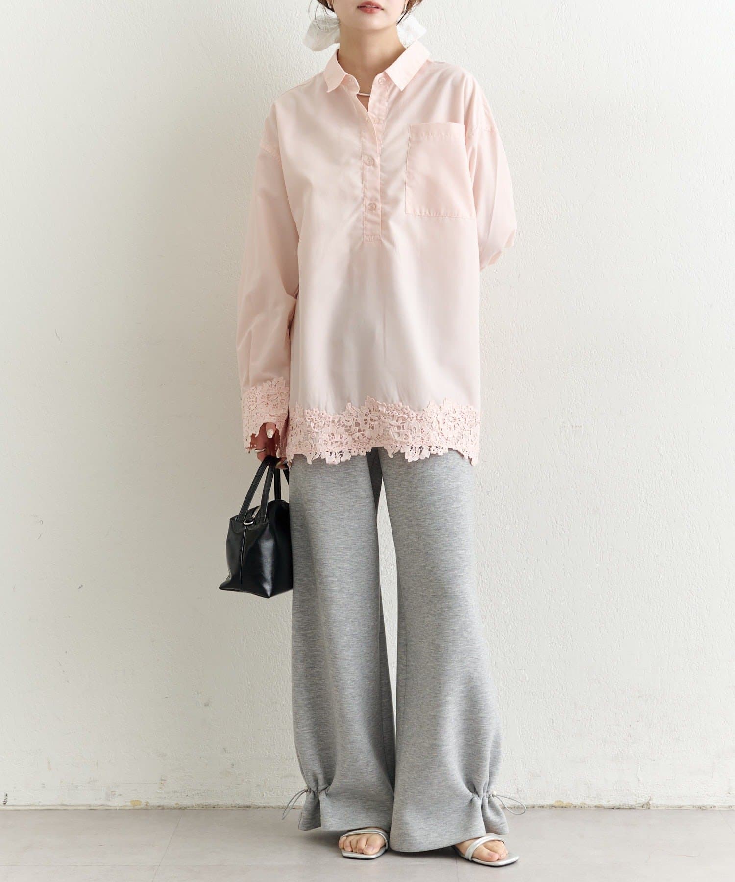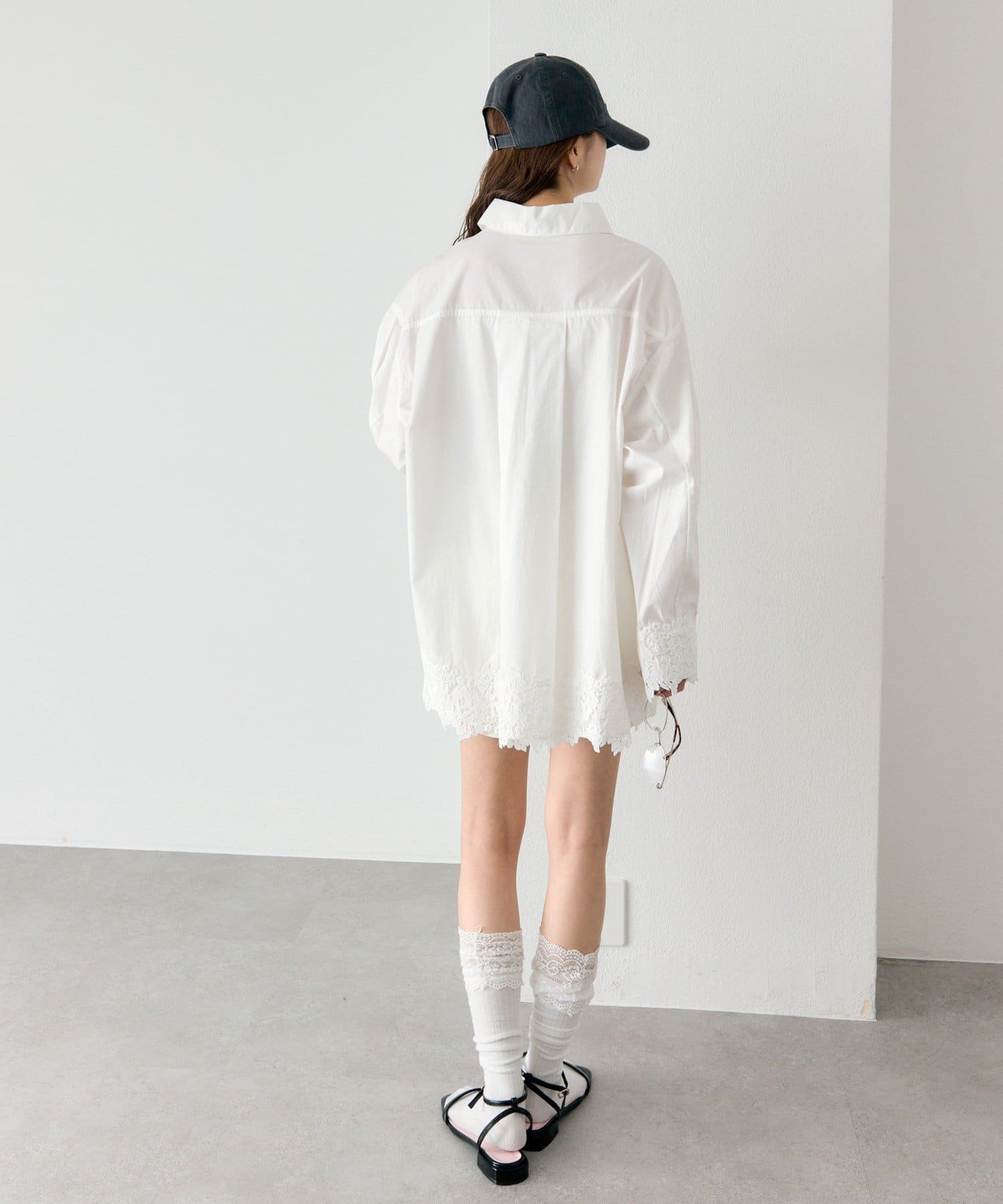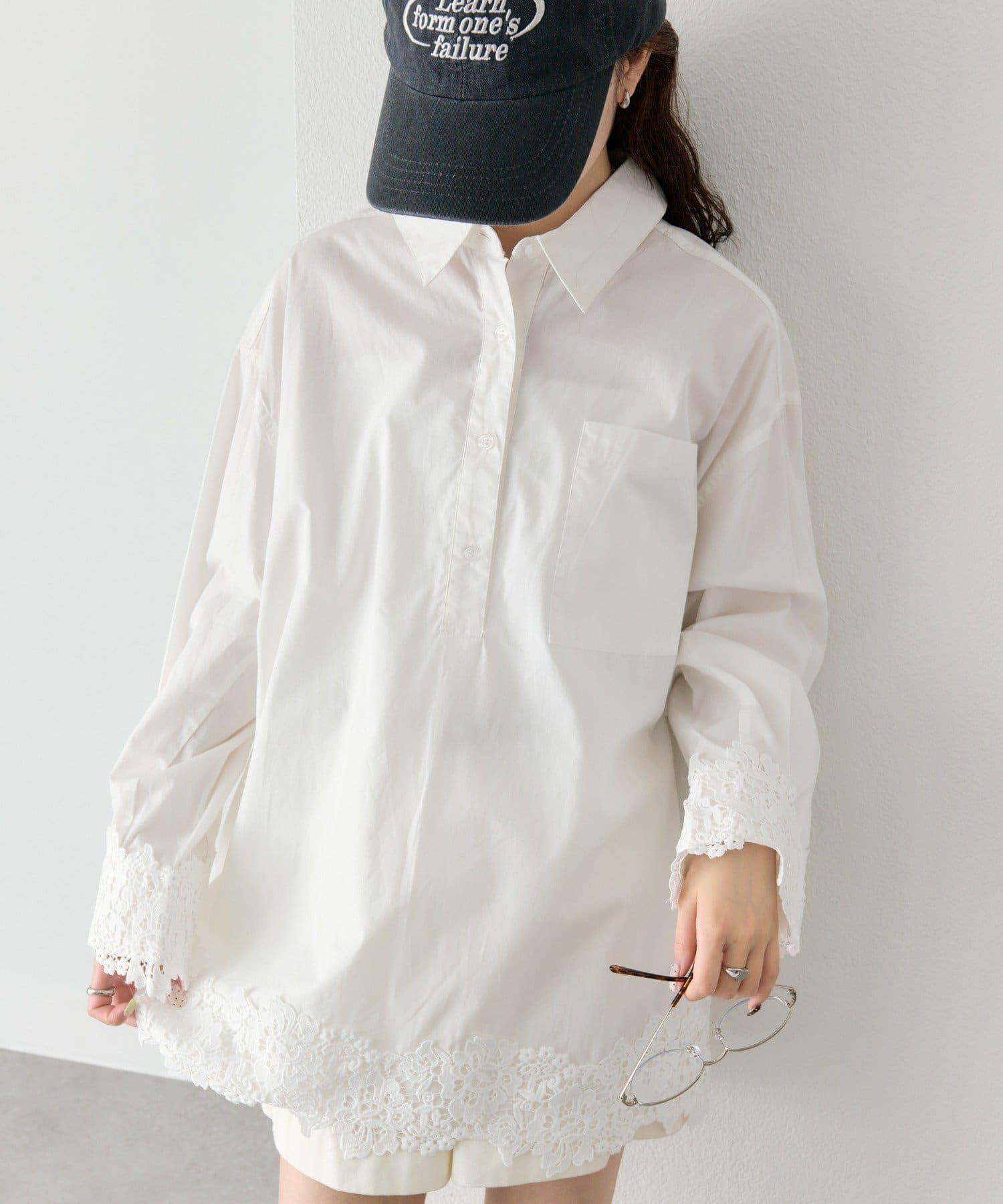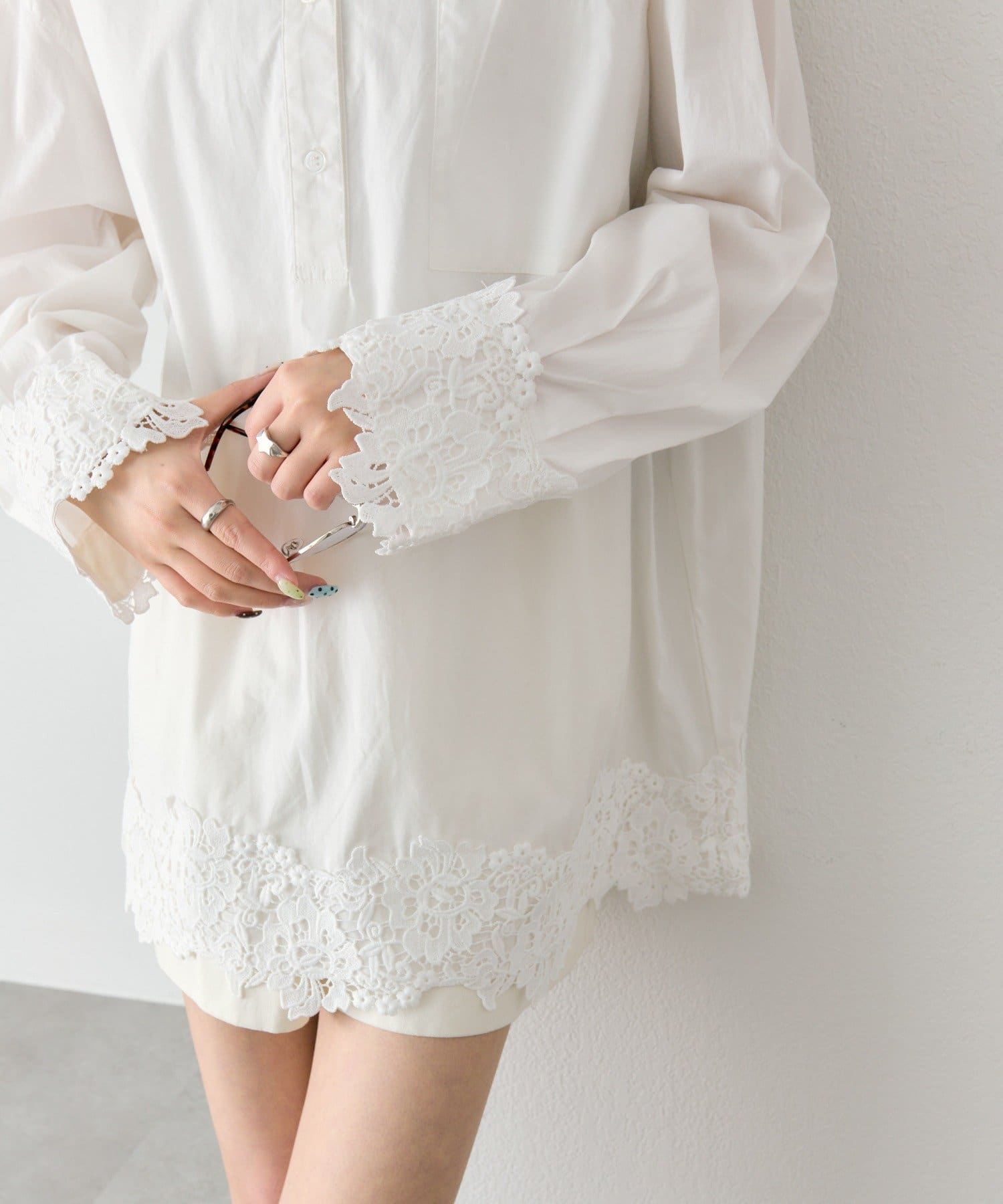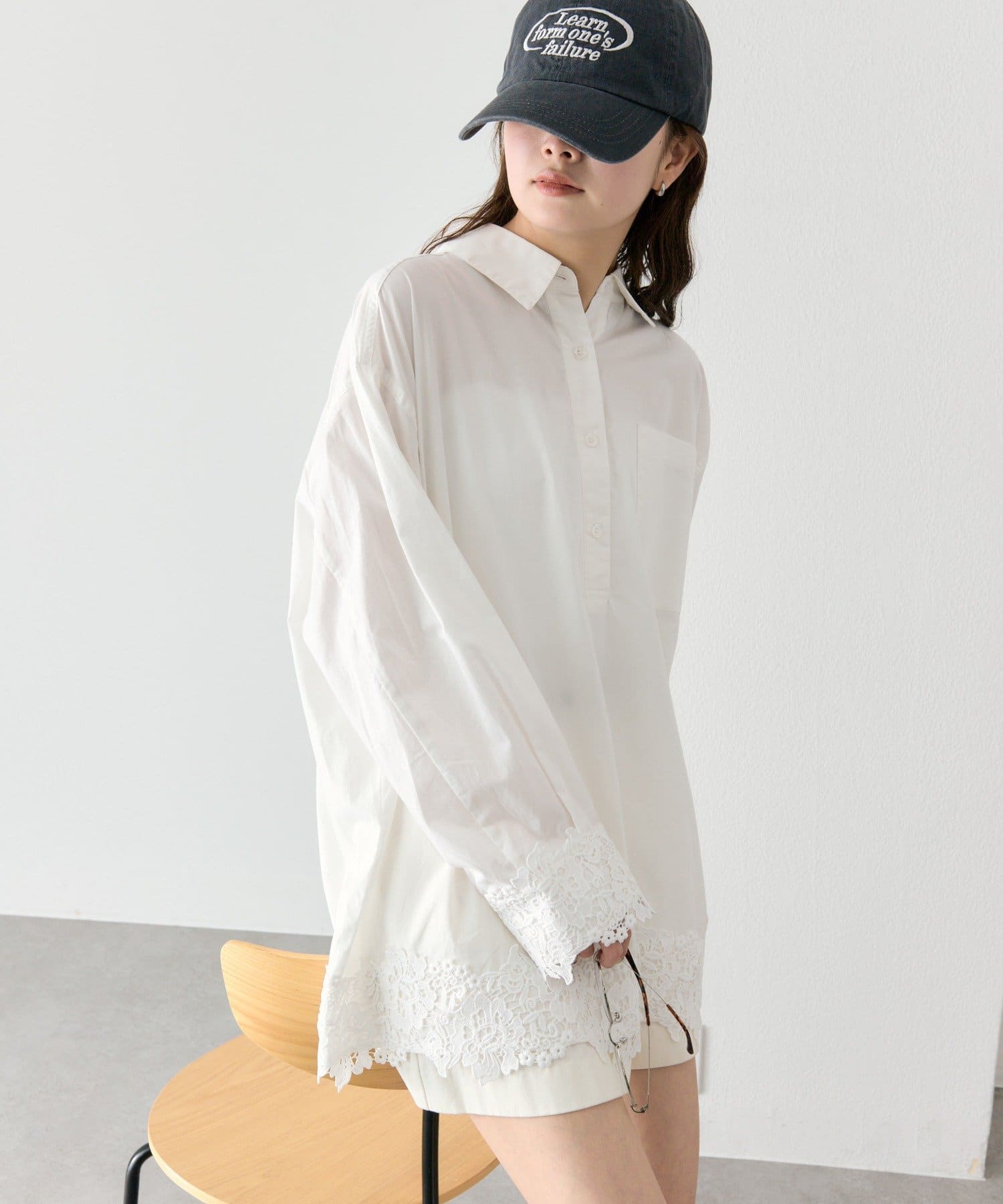 抜け感と女性らしさを両立した、裾レーススキッパーシャツ