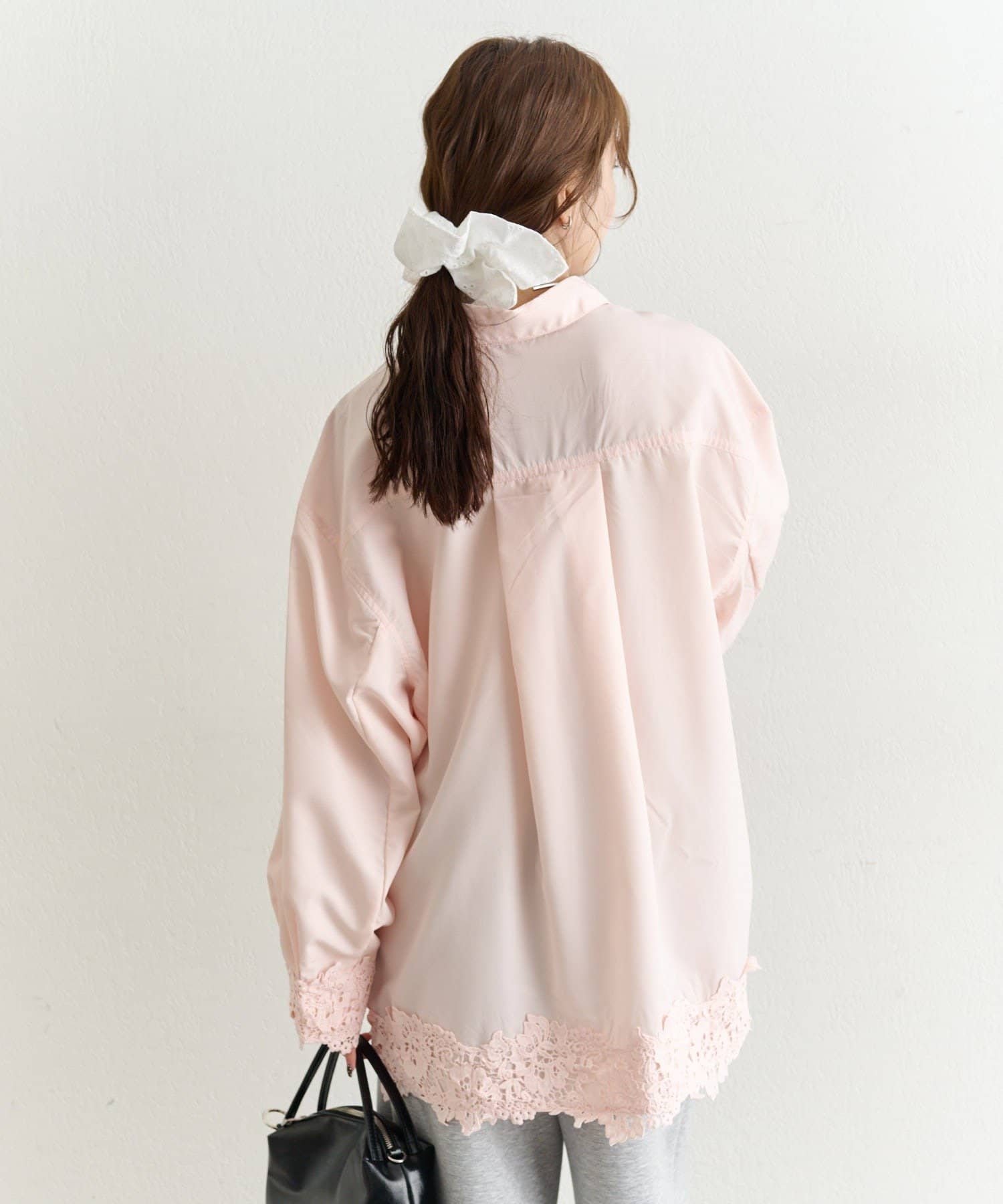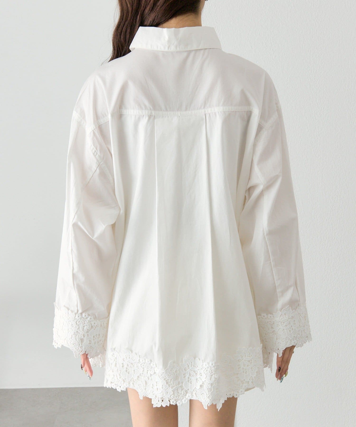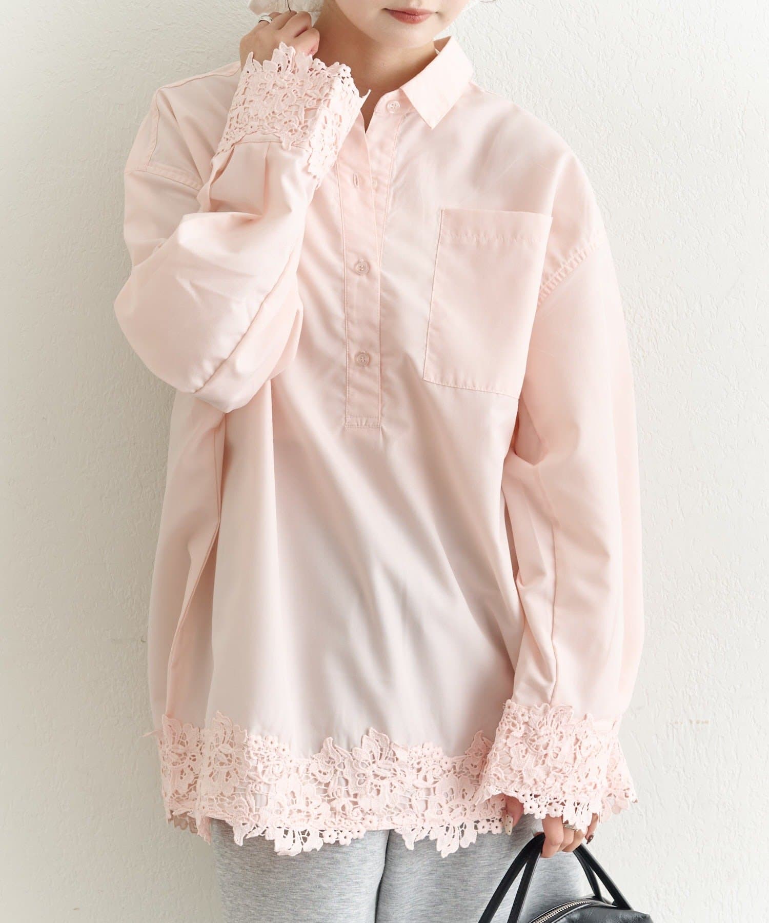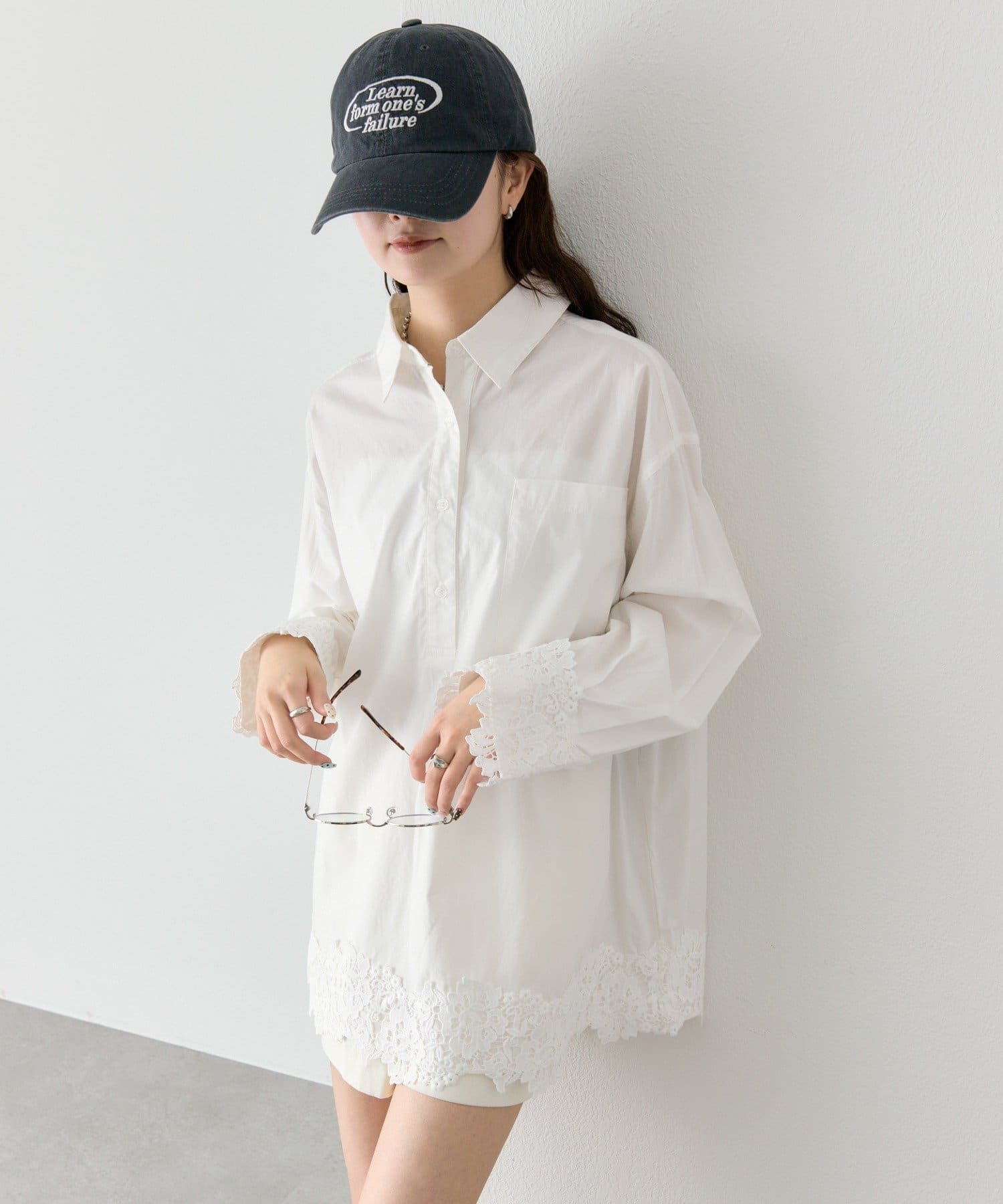 抜け感と女性らしさを両立した、裾レーススキッパーシャツ