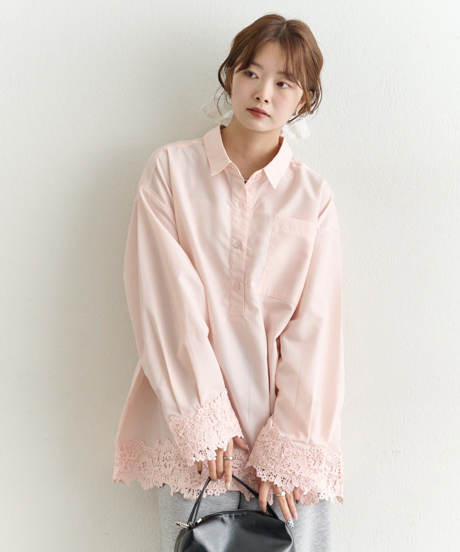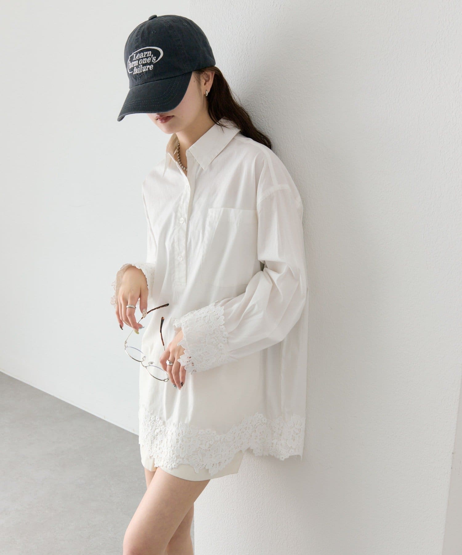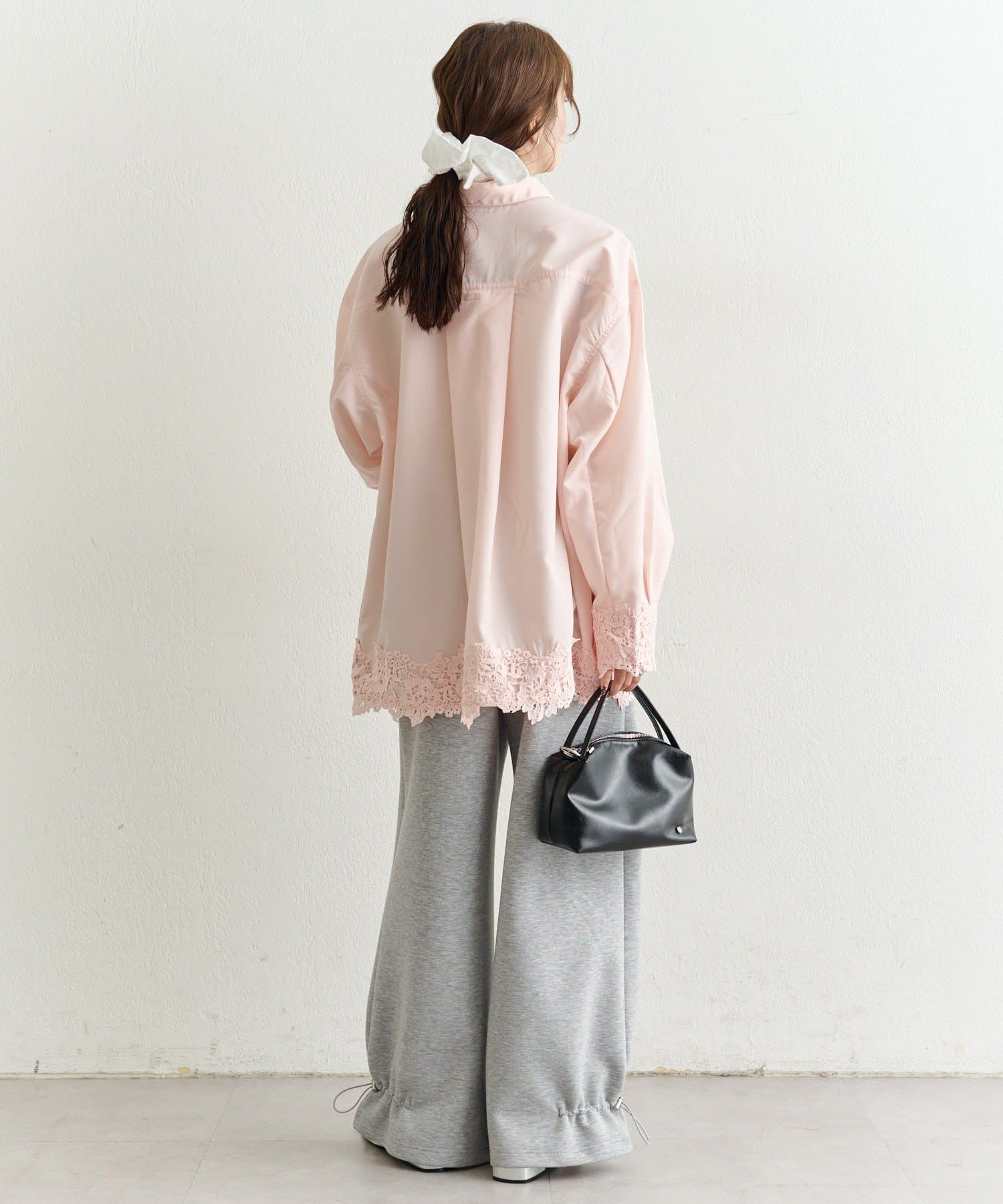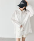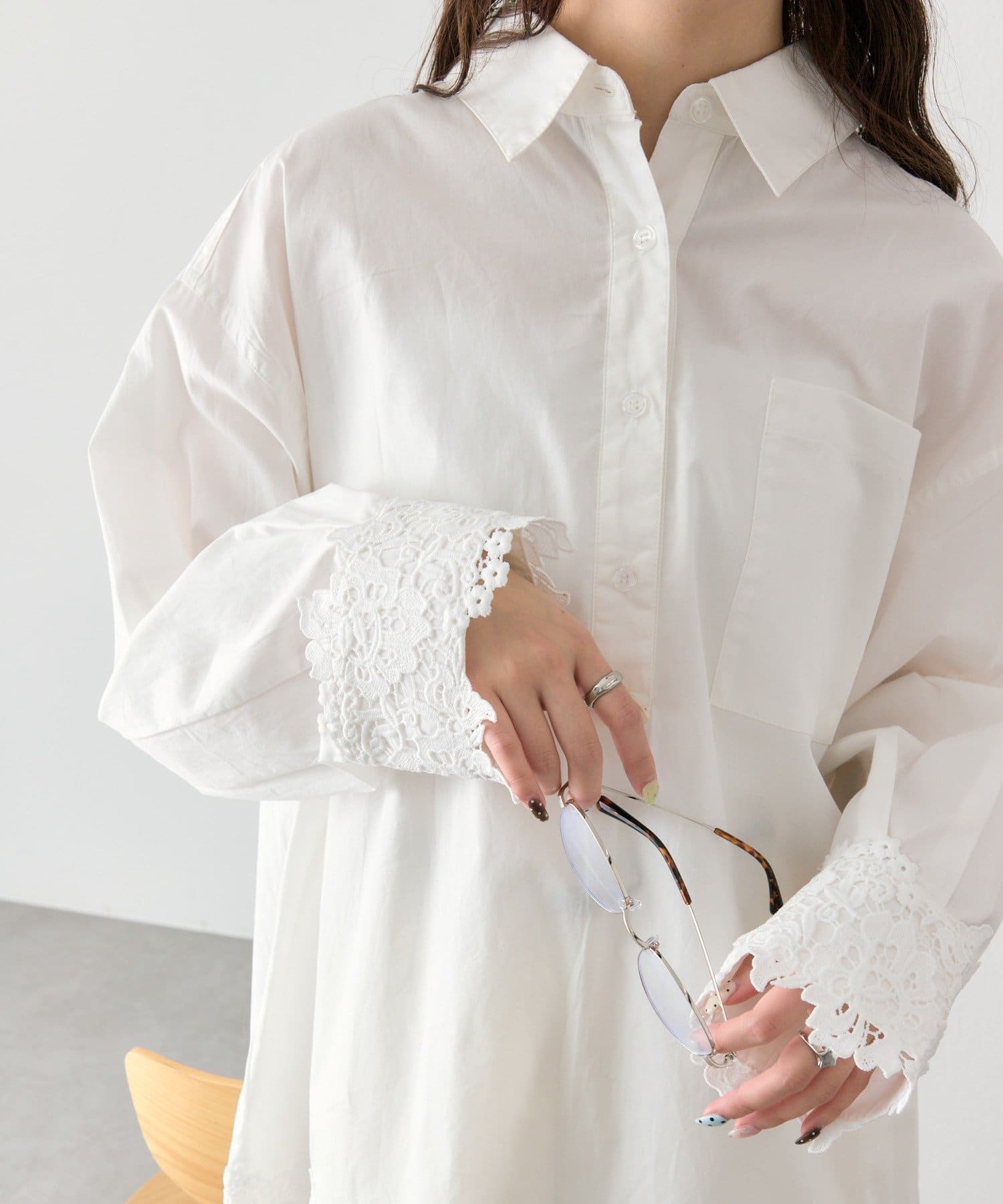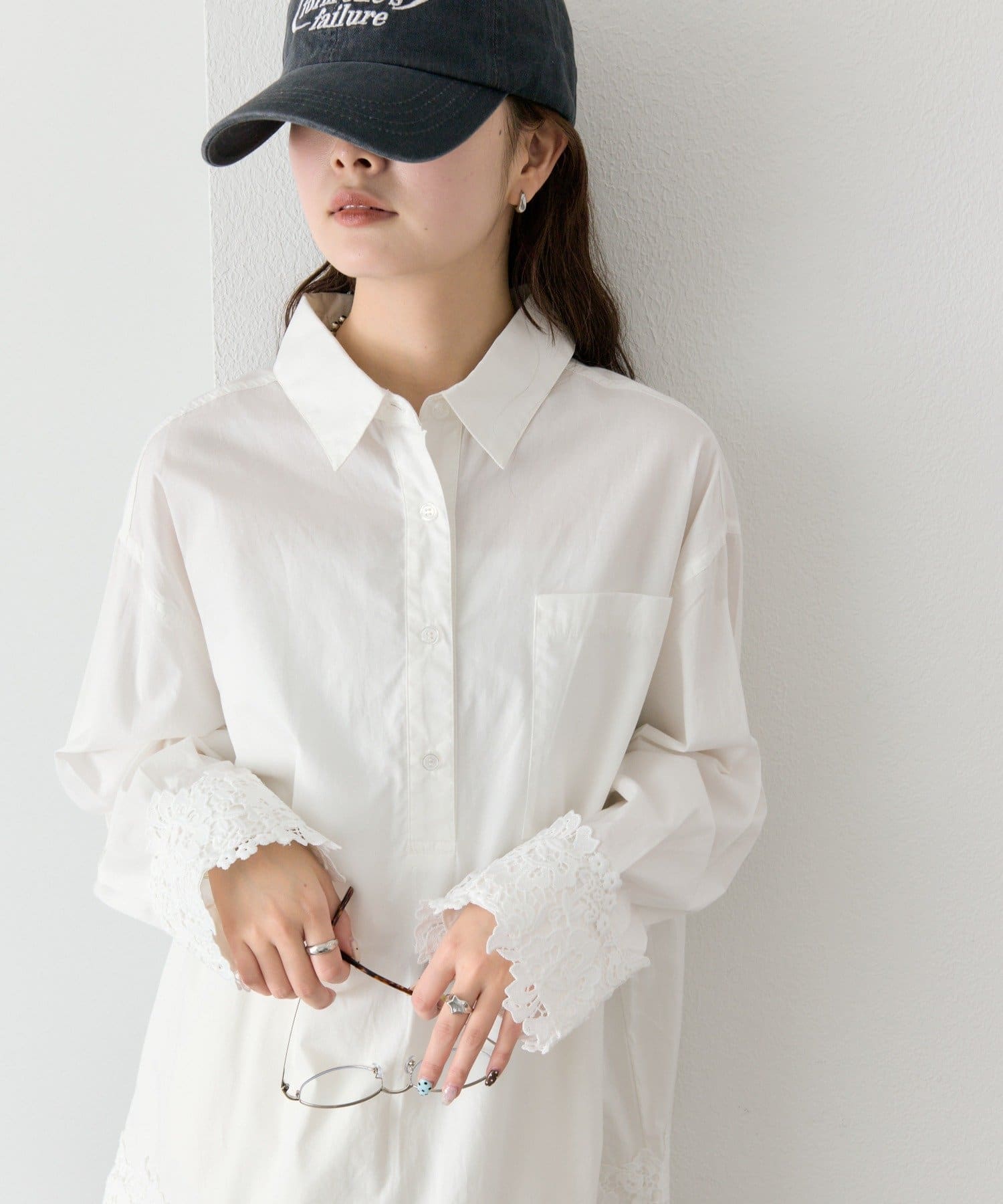 抜け感と女性らしさを両立した、裾レーススキッパーシャツ
