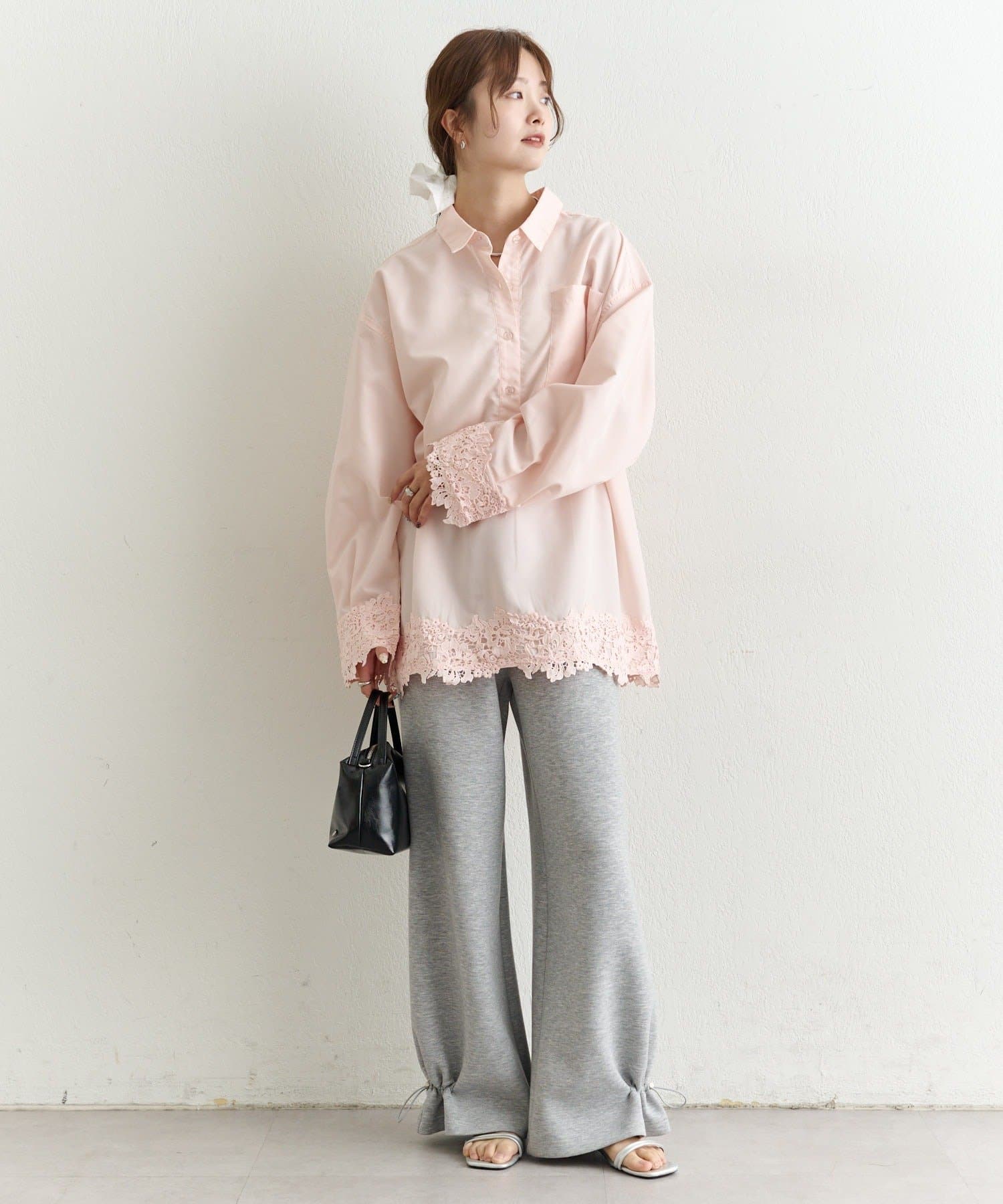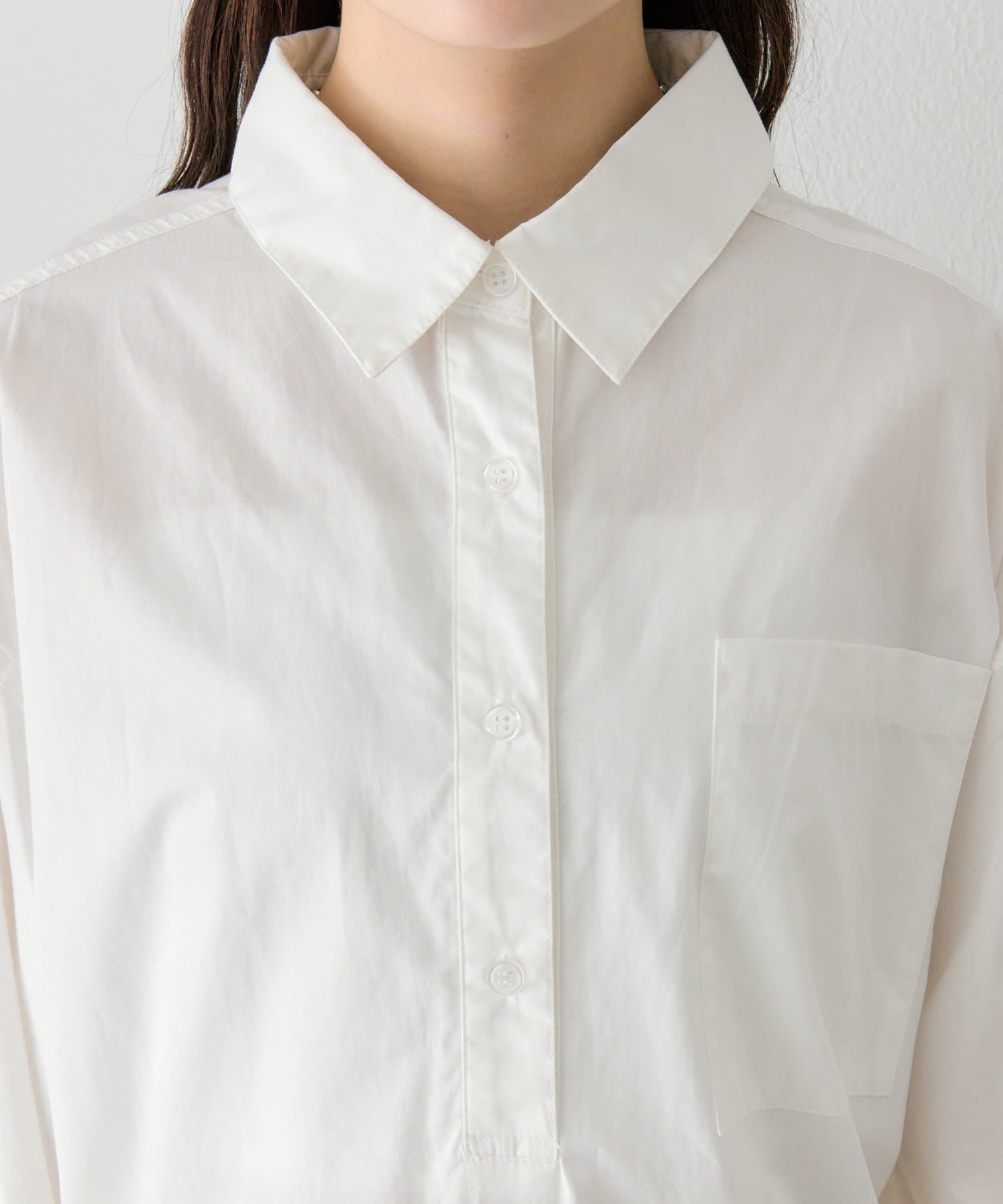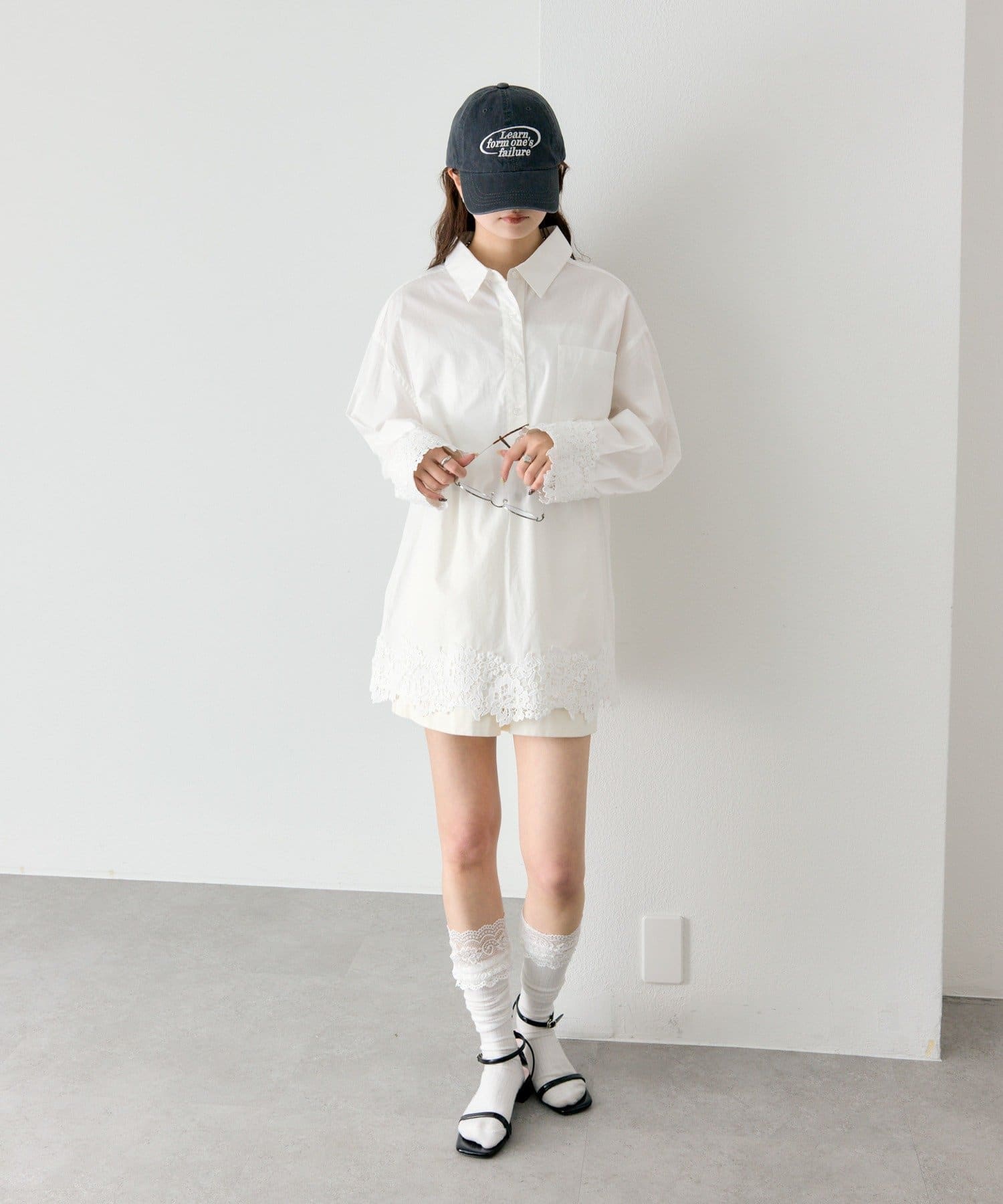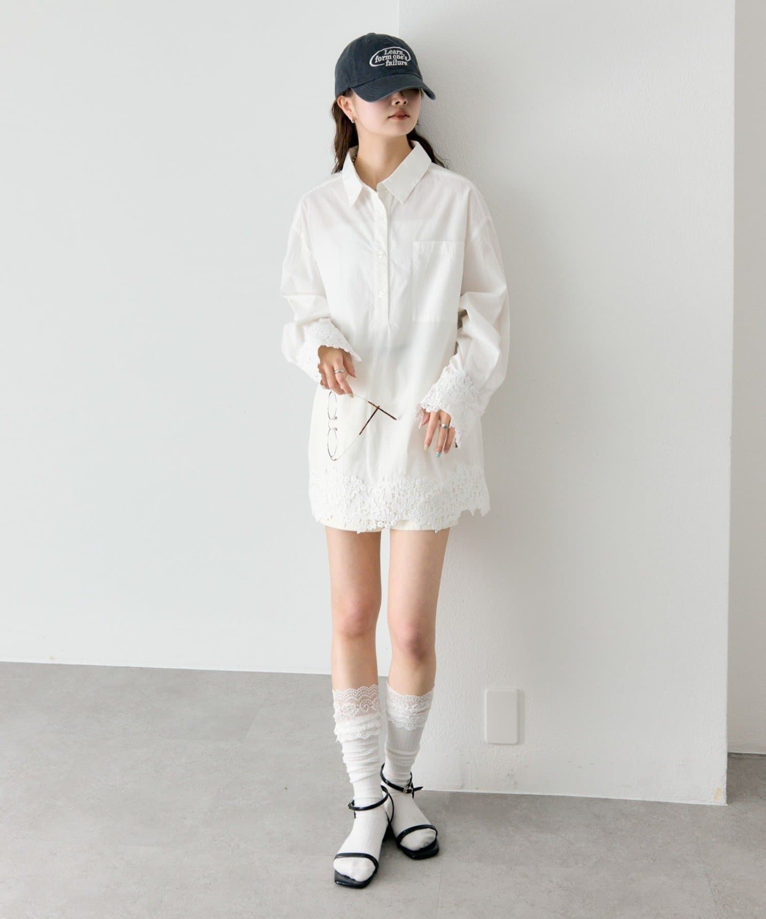 抜け感と女性らしさを両立した、裾レーススキッパーシャツ