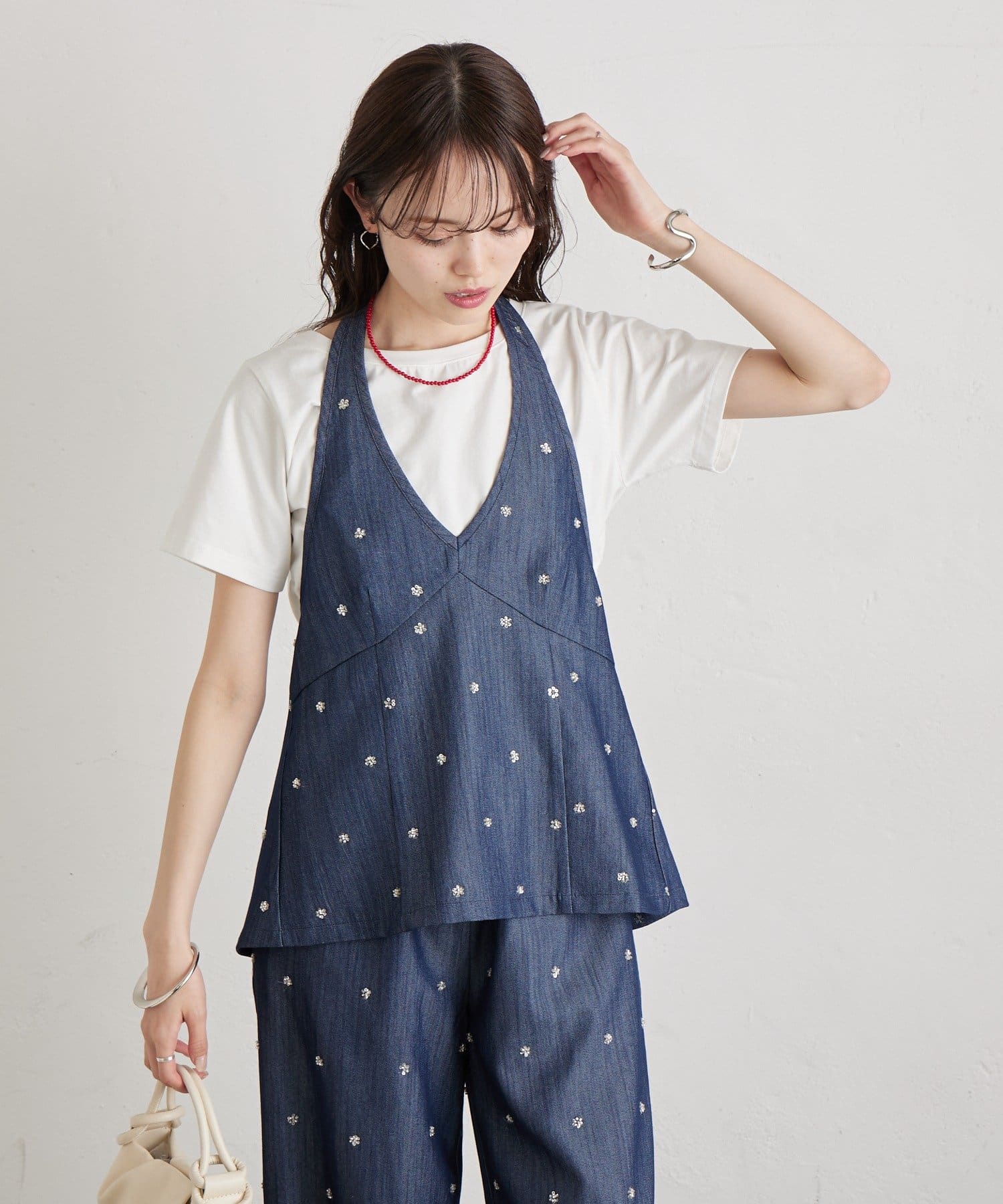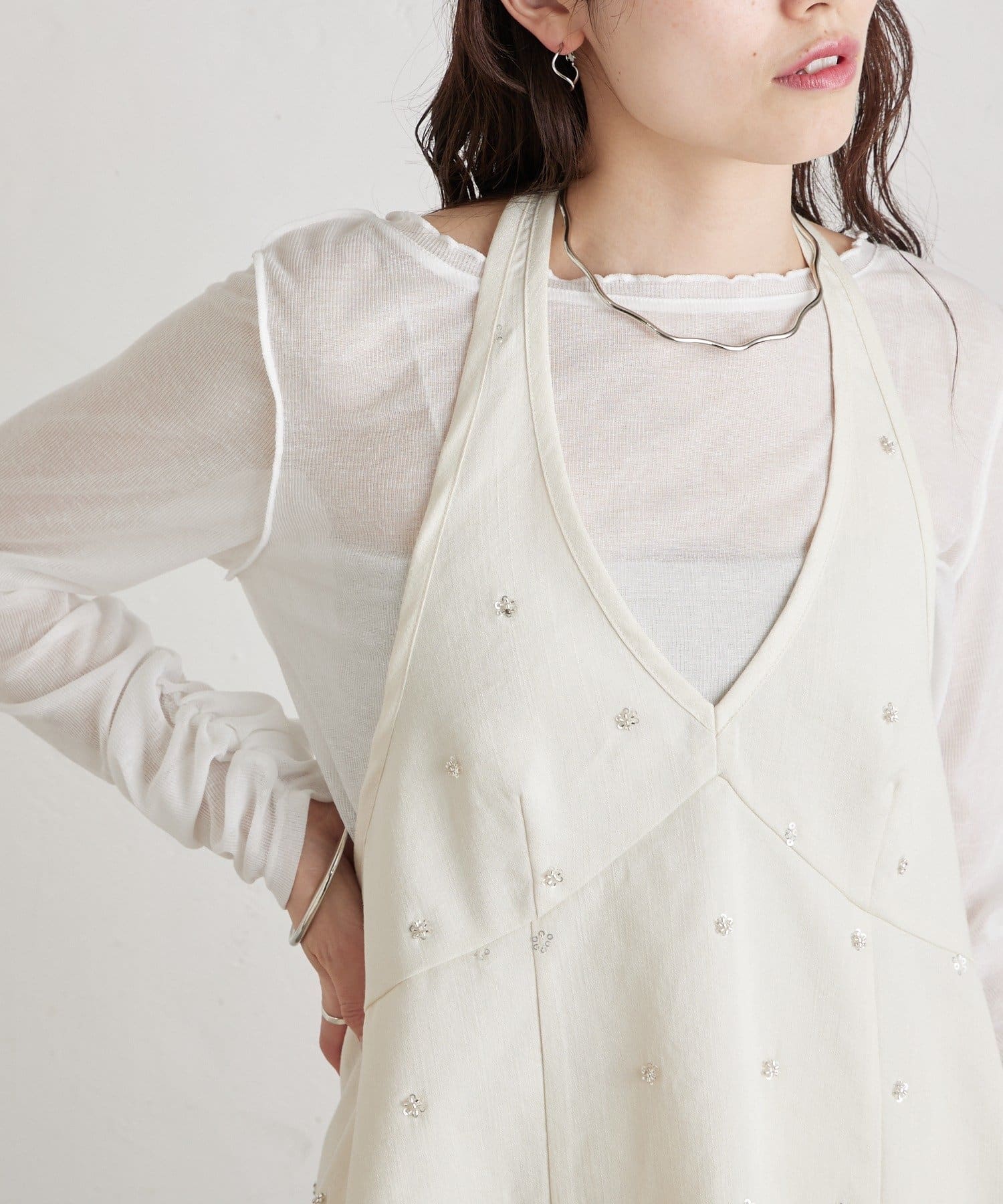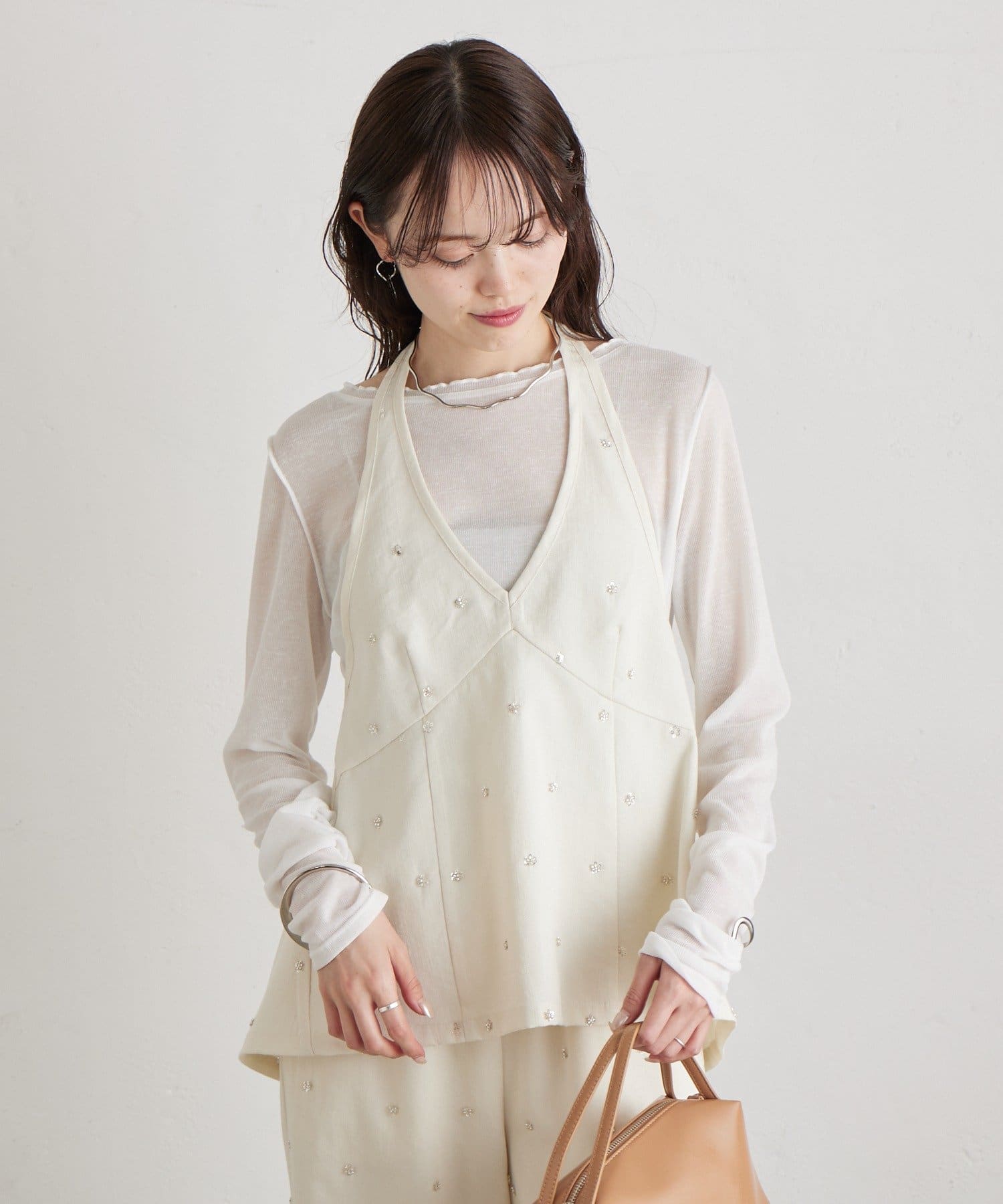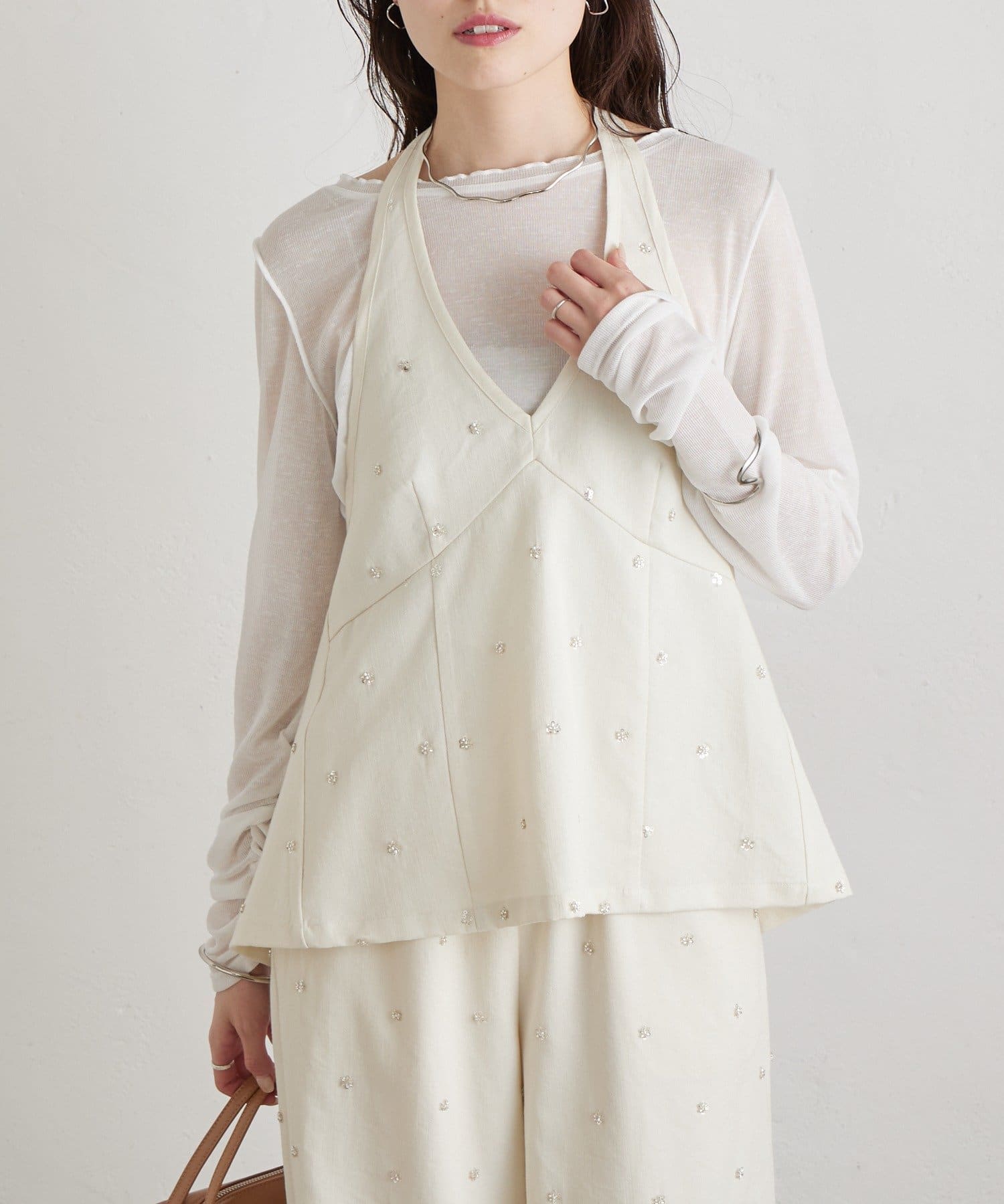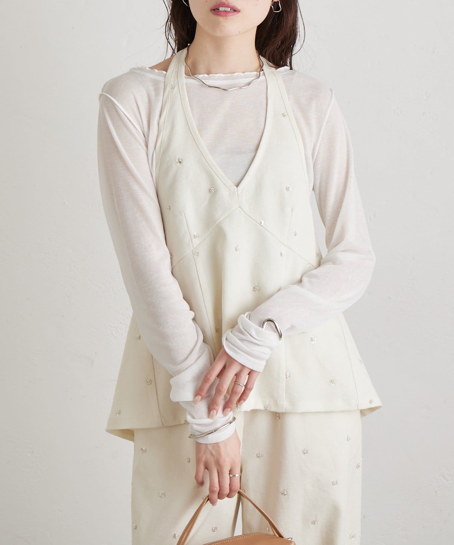 フラワービジューがアクセントに◎華やかなレイヤードスタイルが完成するホルタービスチェ