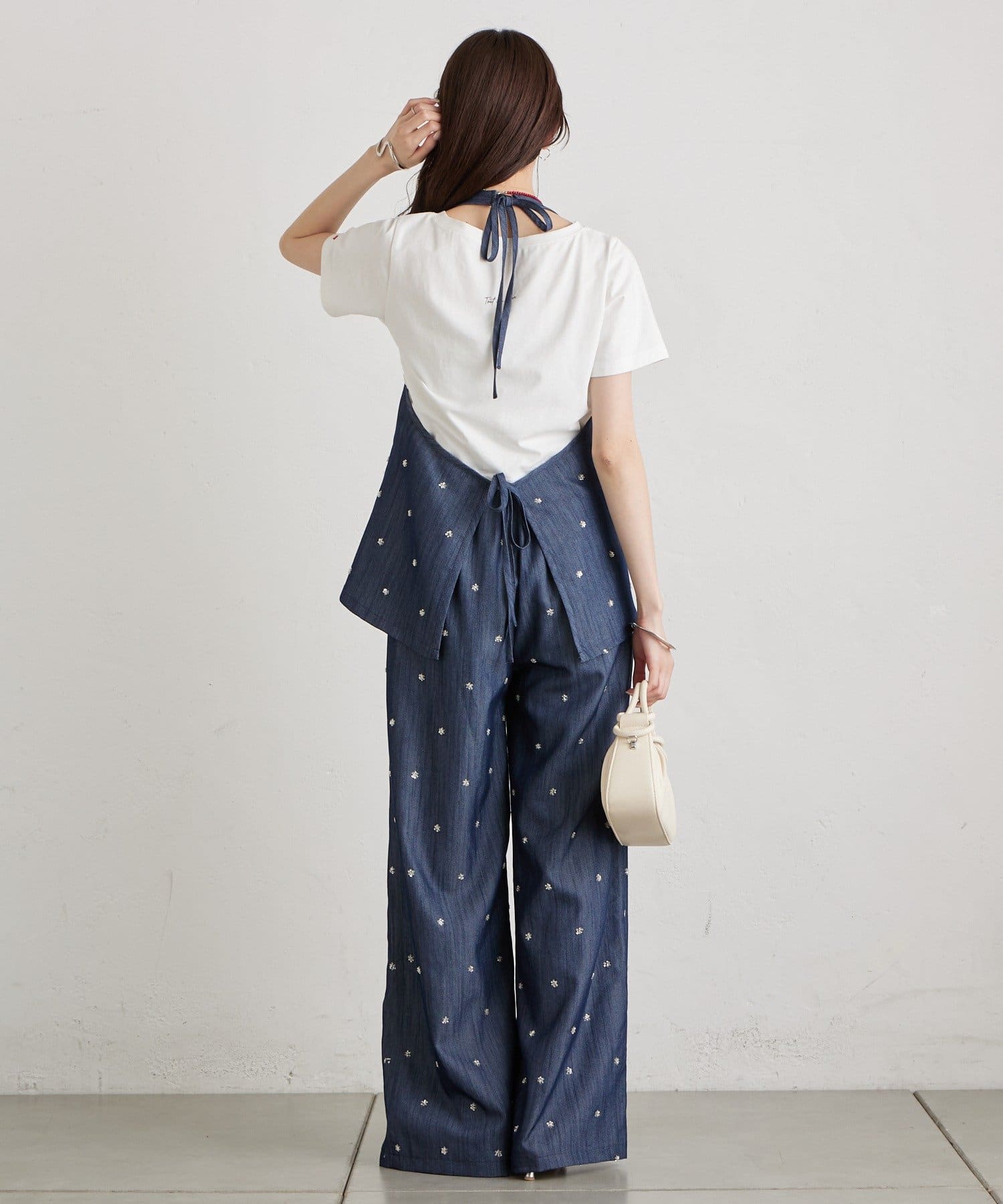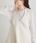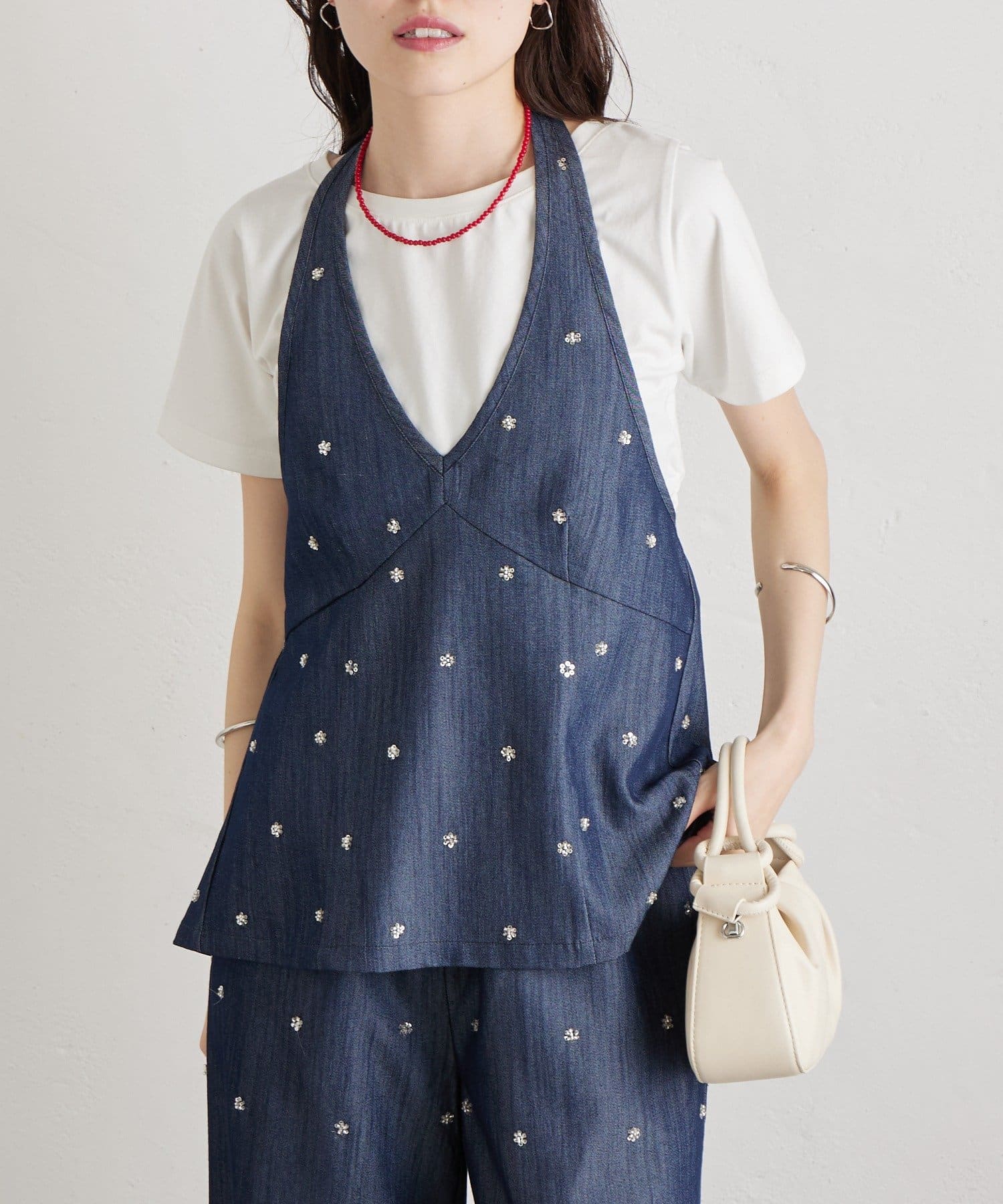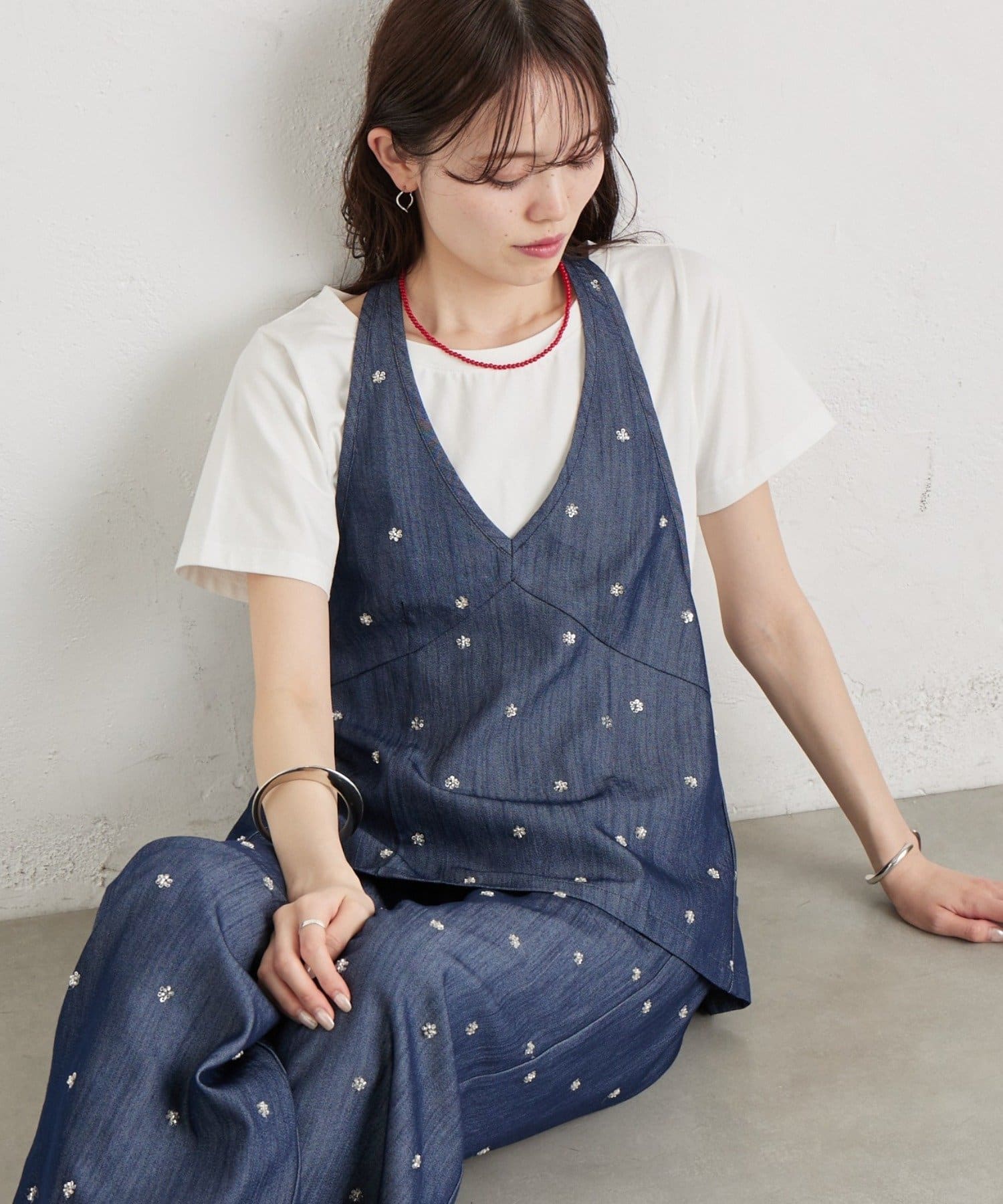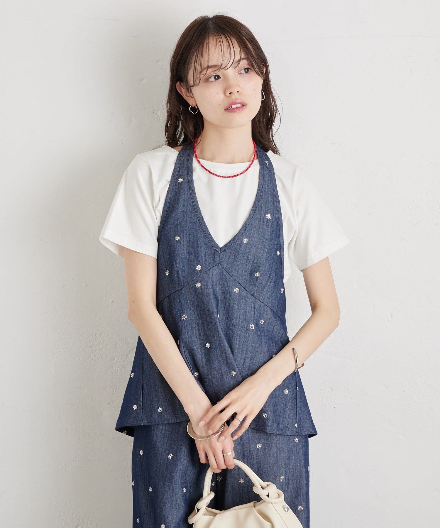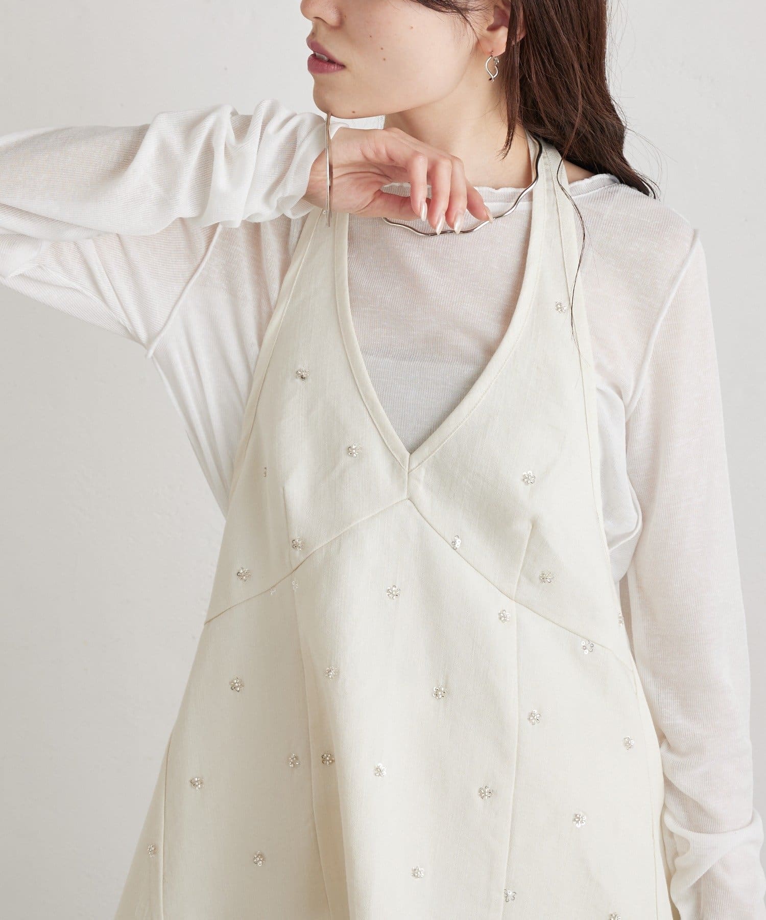 フラワービジューがアクセントに◎華やかなレイヤードスタイルが完成するホルタービスチェ