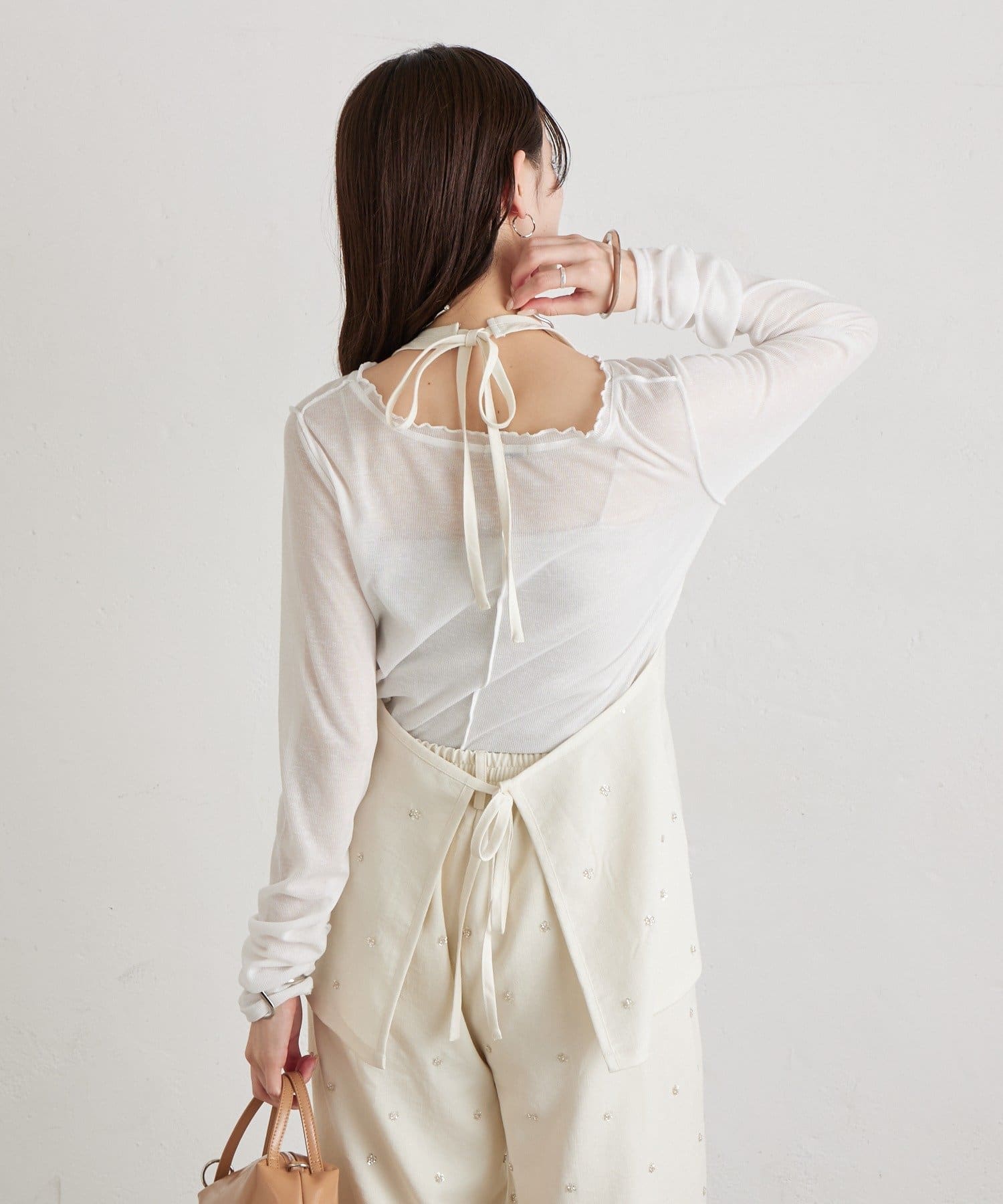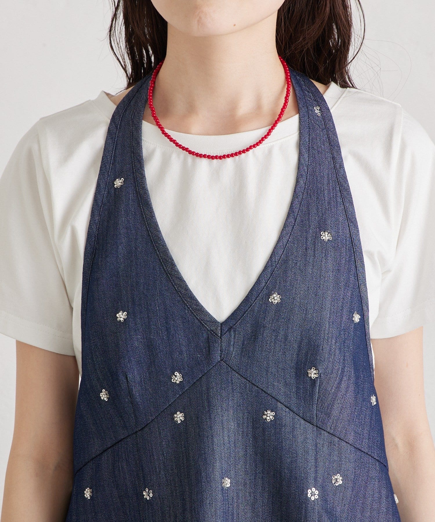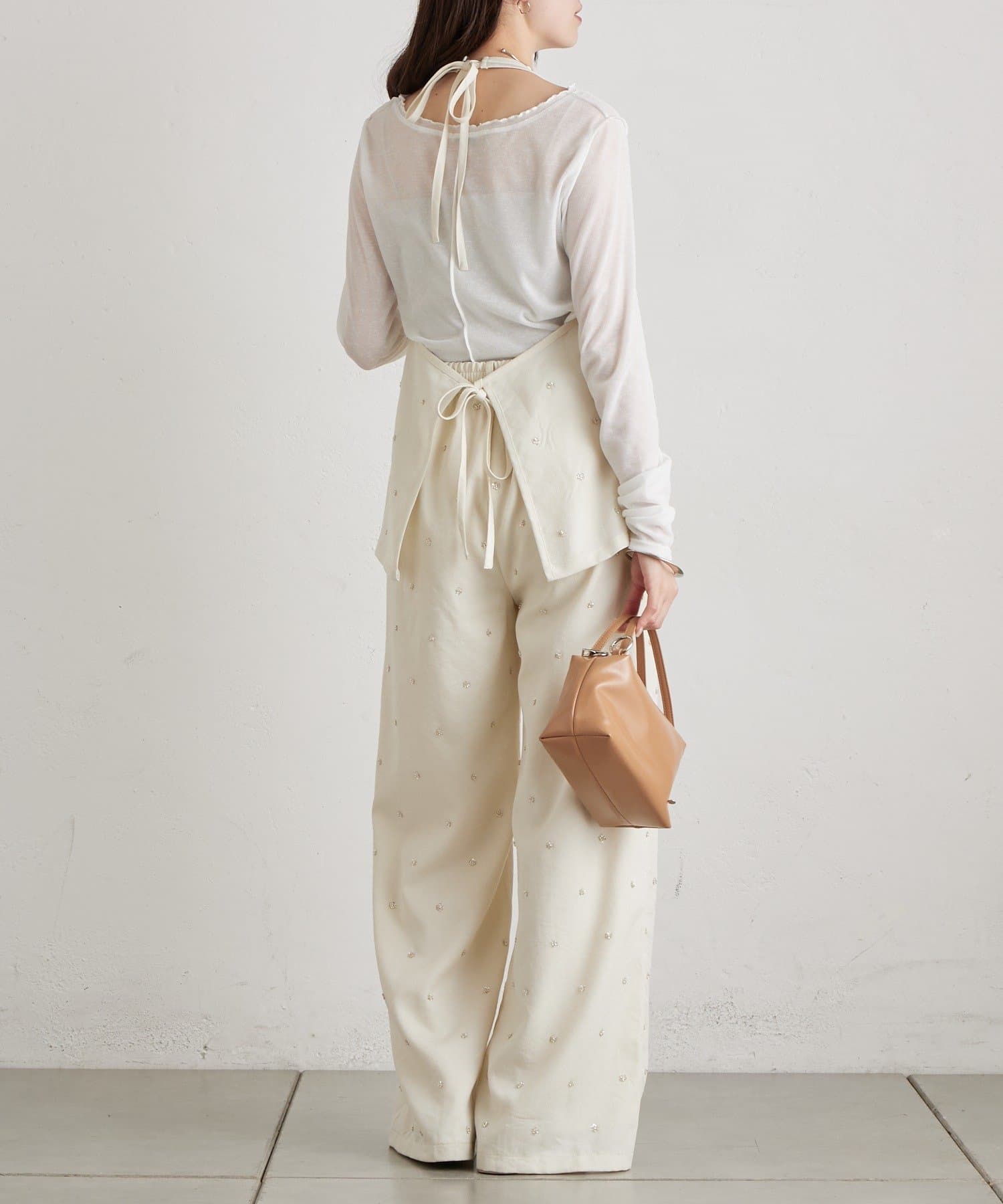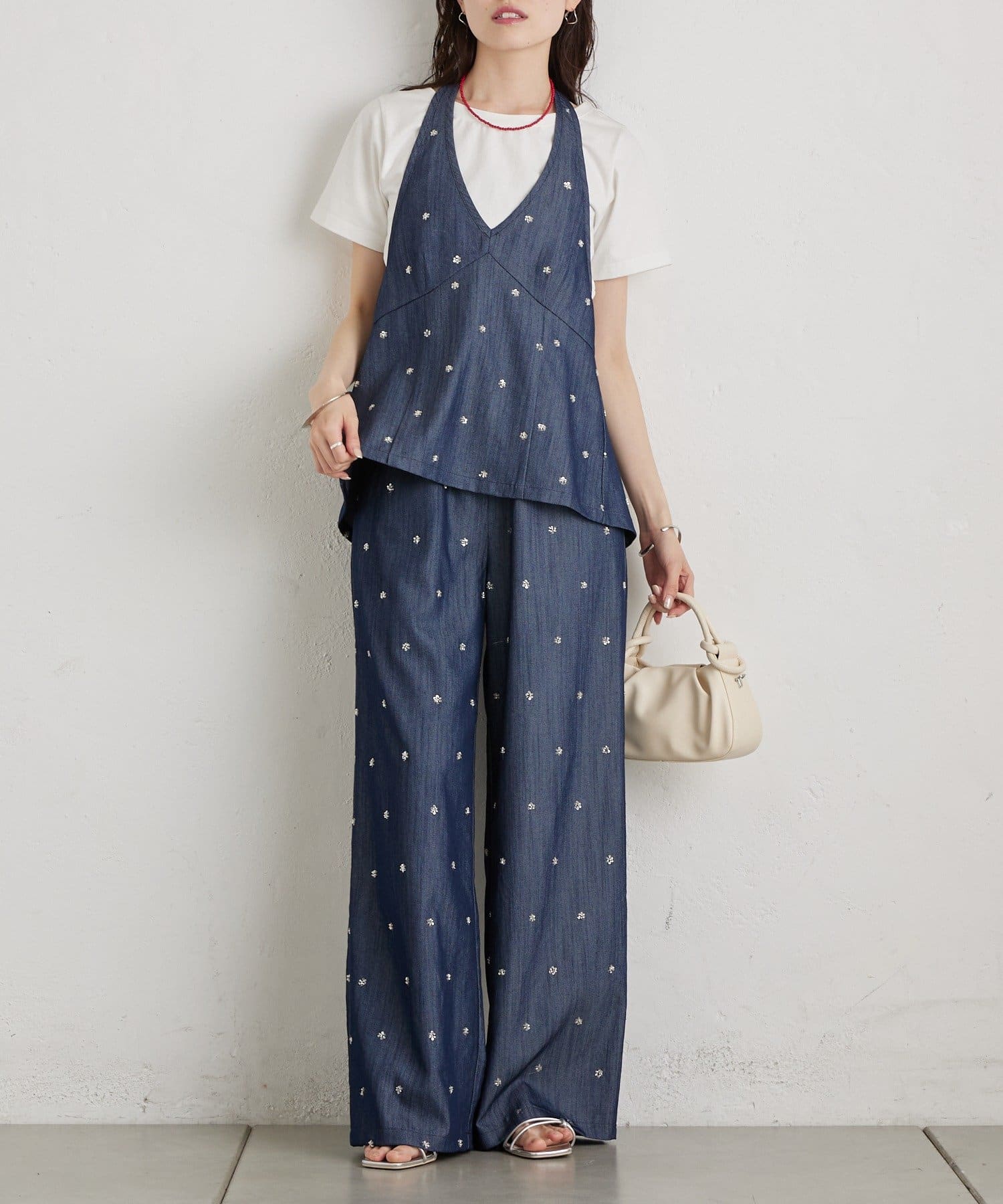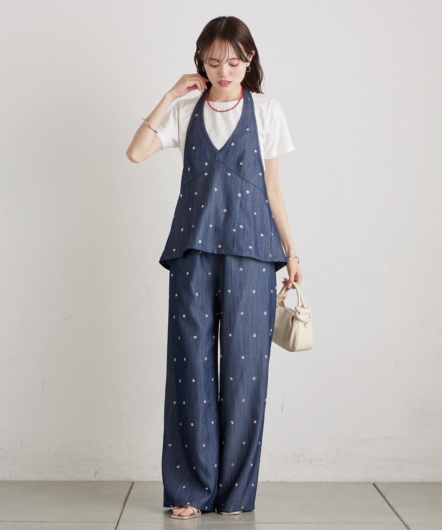 フラワービジューがアクセントに◎華やかなレイヤードスタイルが完成するホルタービスチェ