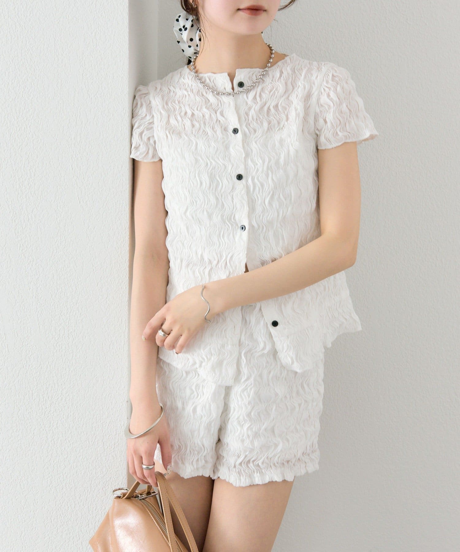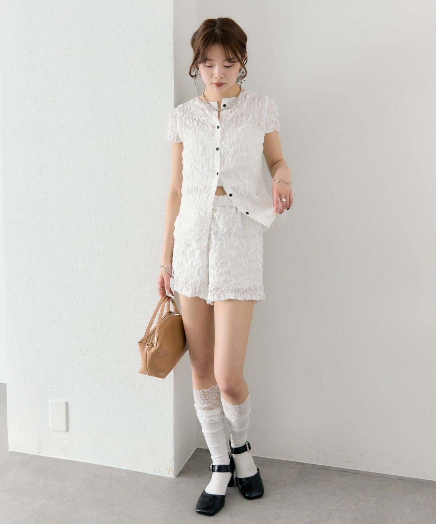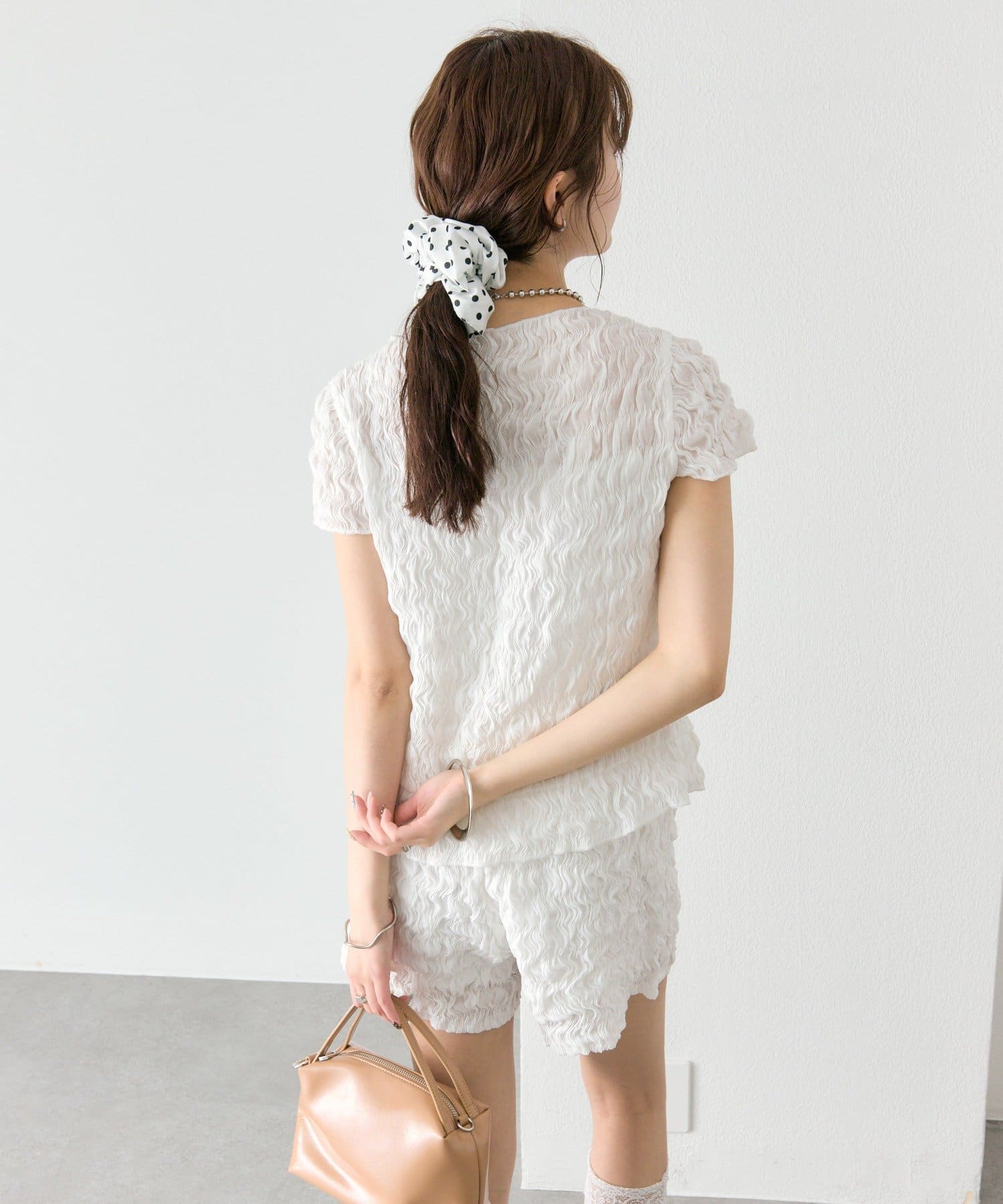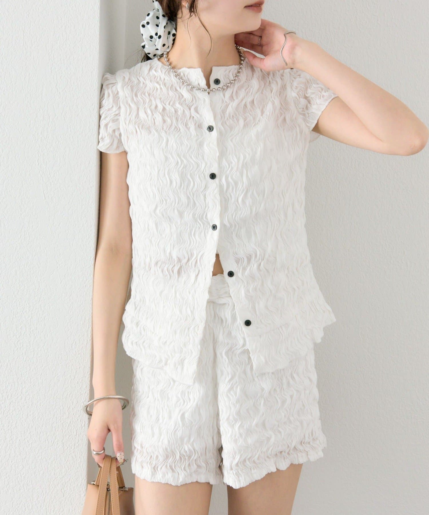 ・同素材のエアリーシャーリングショートパンツとセットアップスタイルもおすすめです。