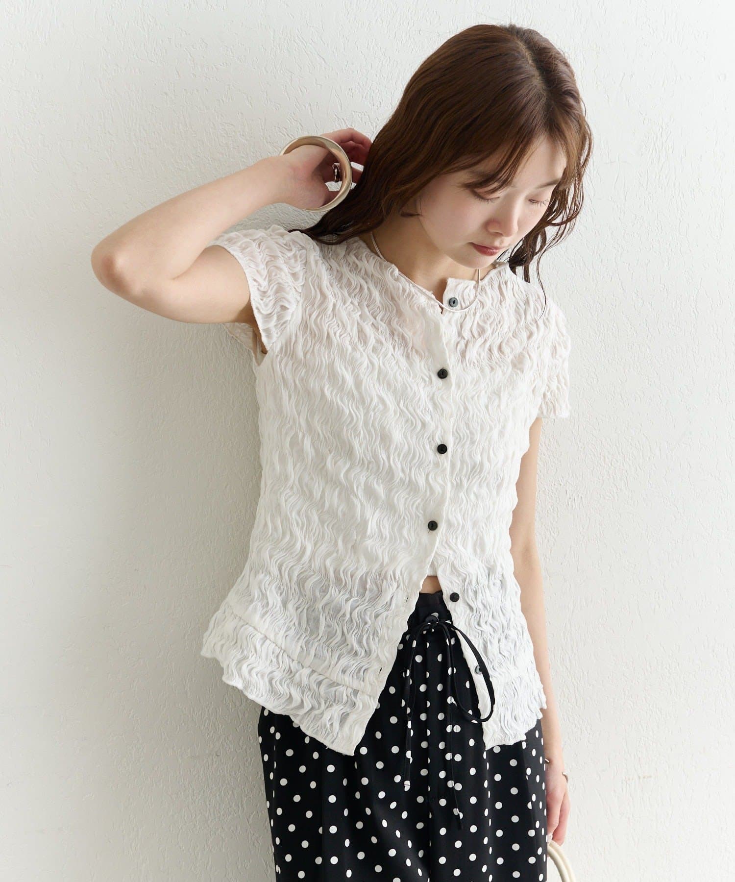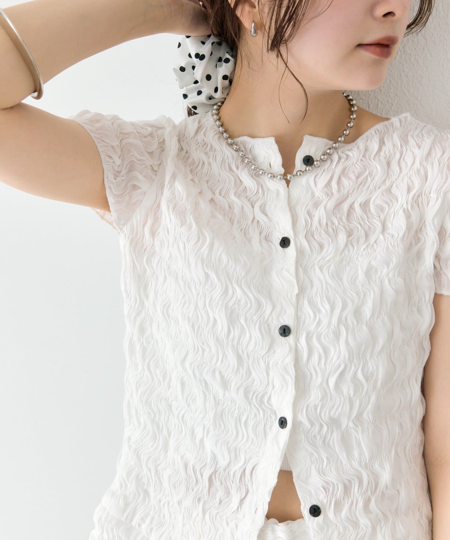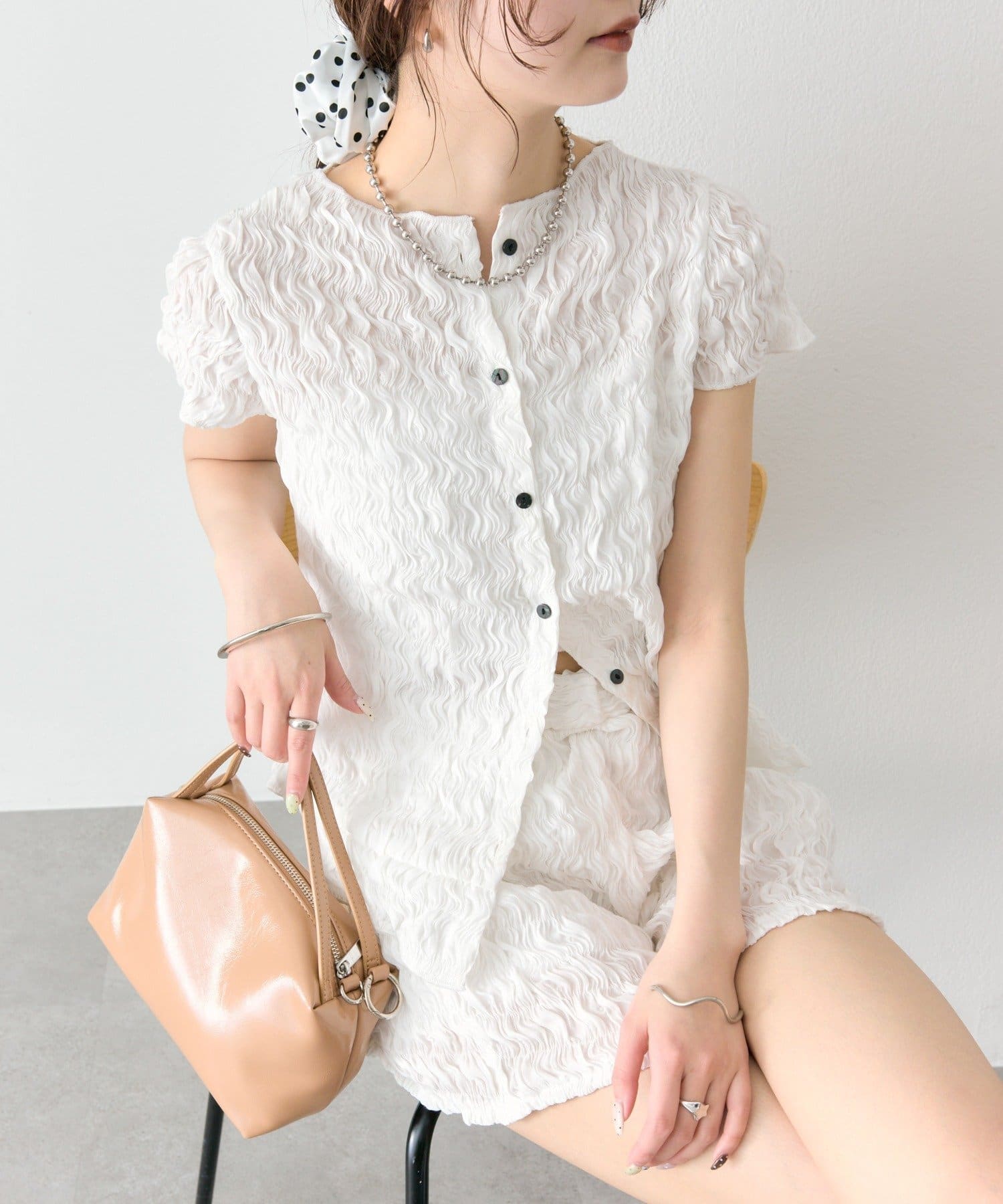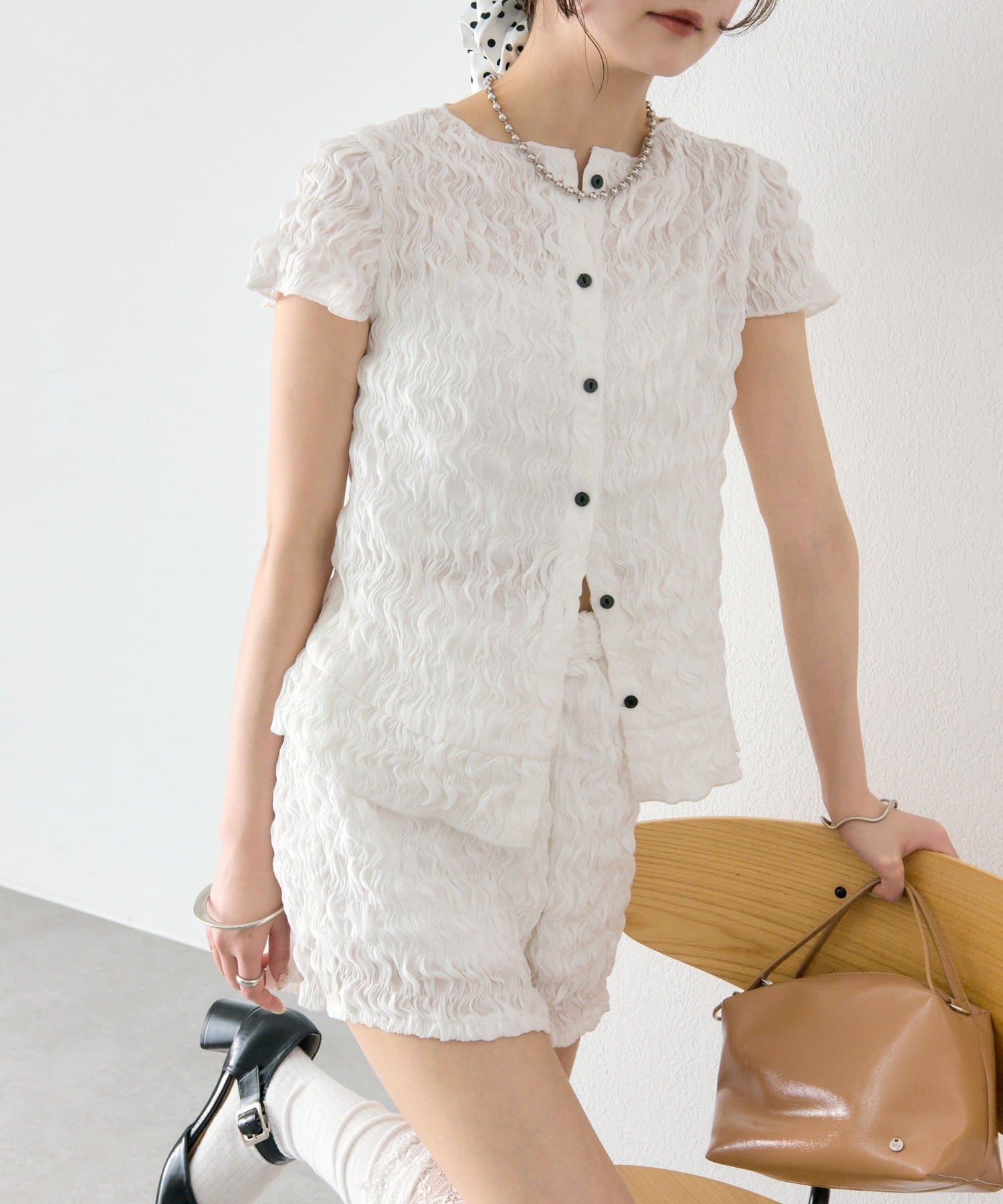 ・軽やかなエアリー素材感が、女性らしい柔らかさを引き立てます。
