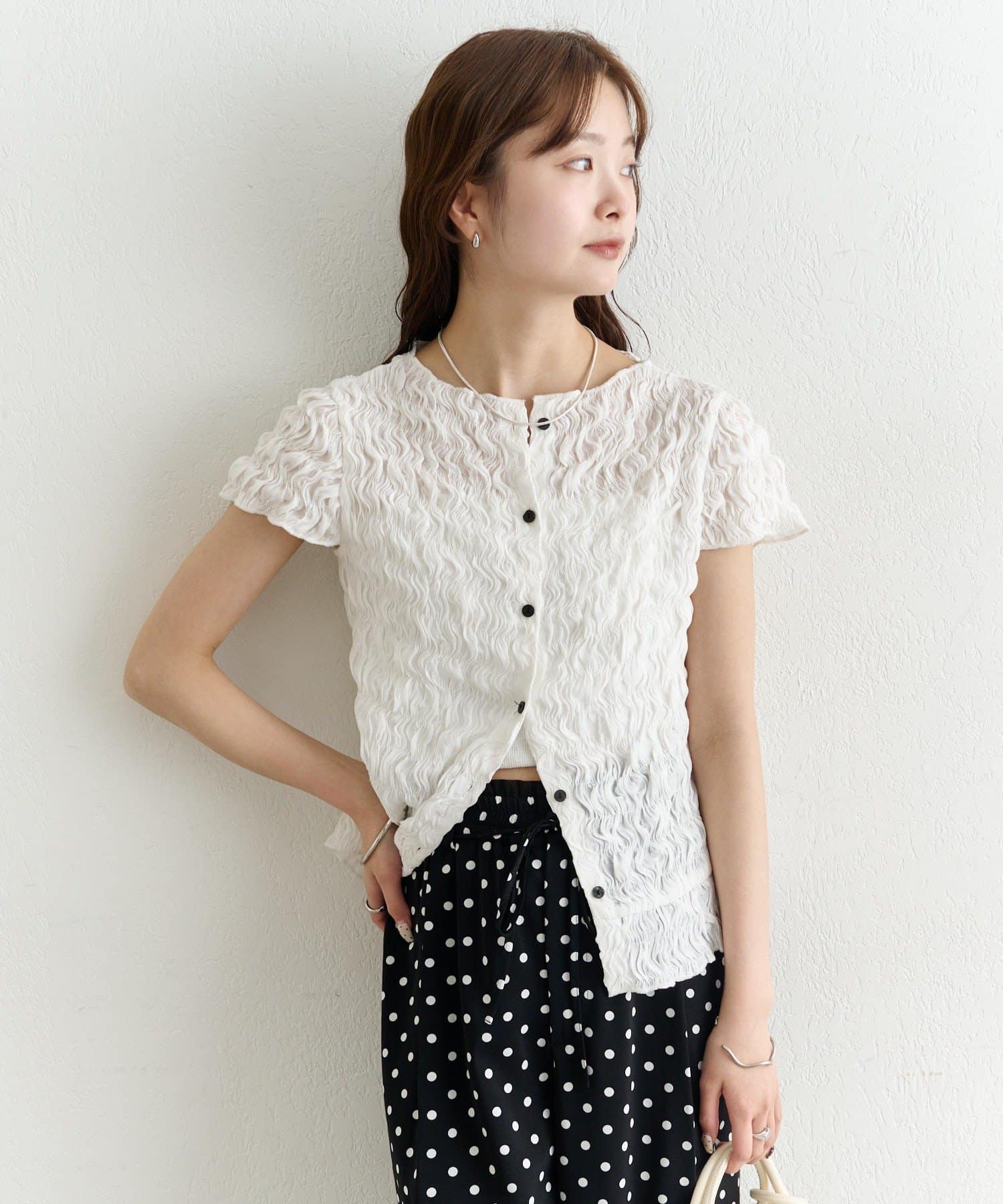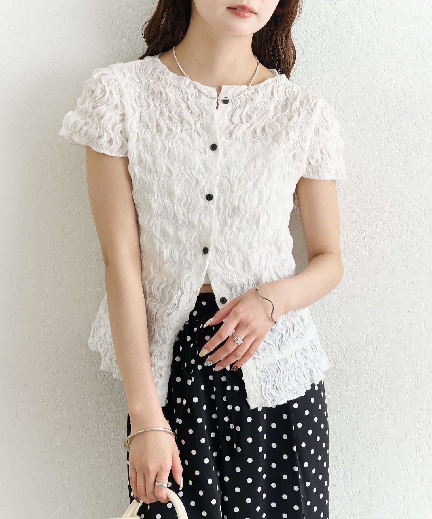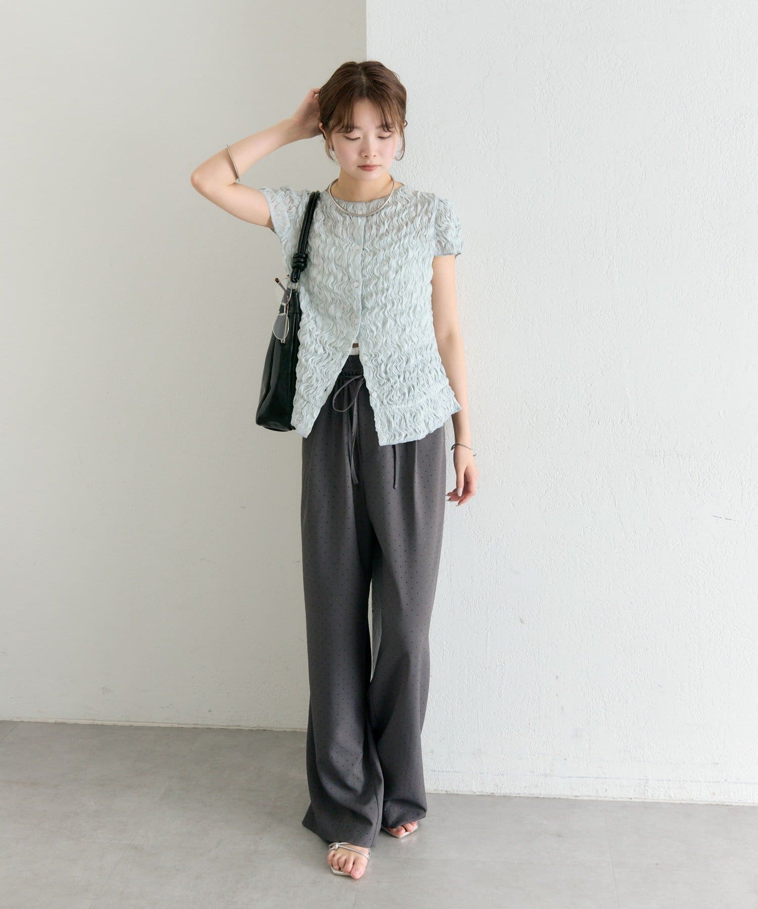 ・軽やかなエアリー素材感が、女性らしい柔らかさを引き立てます。