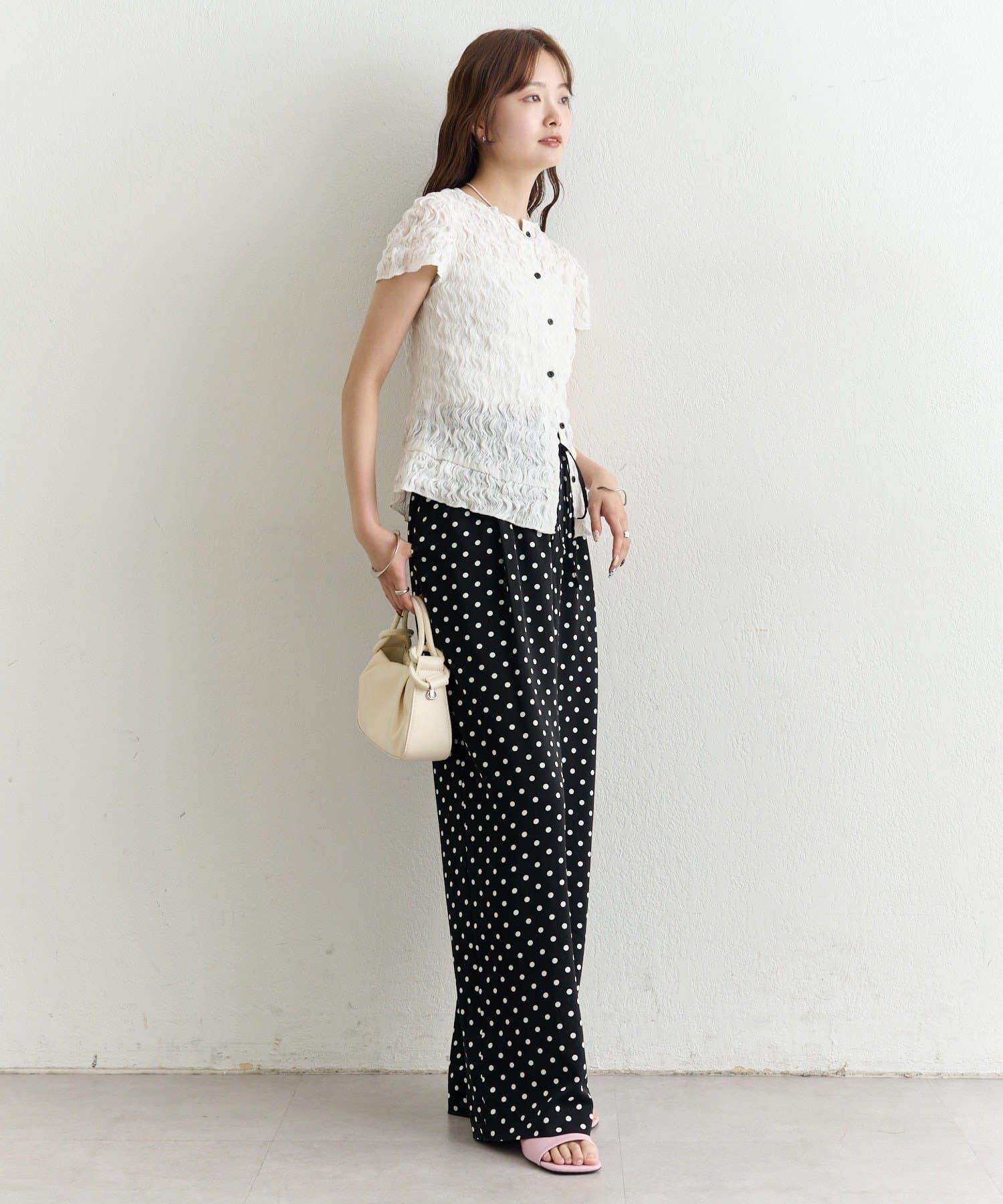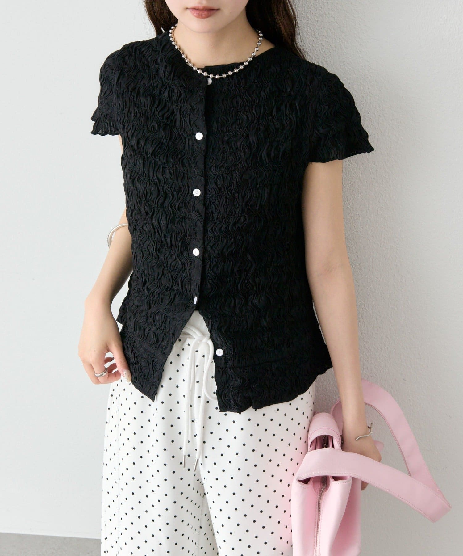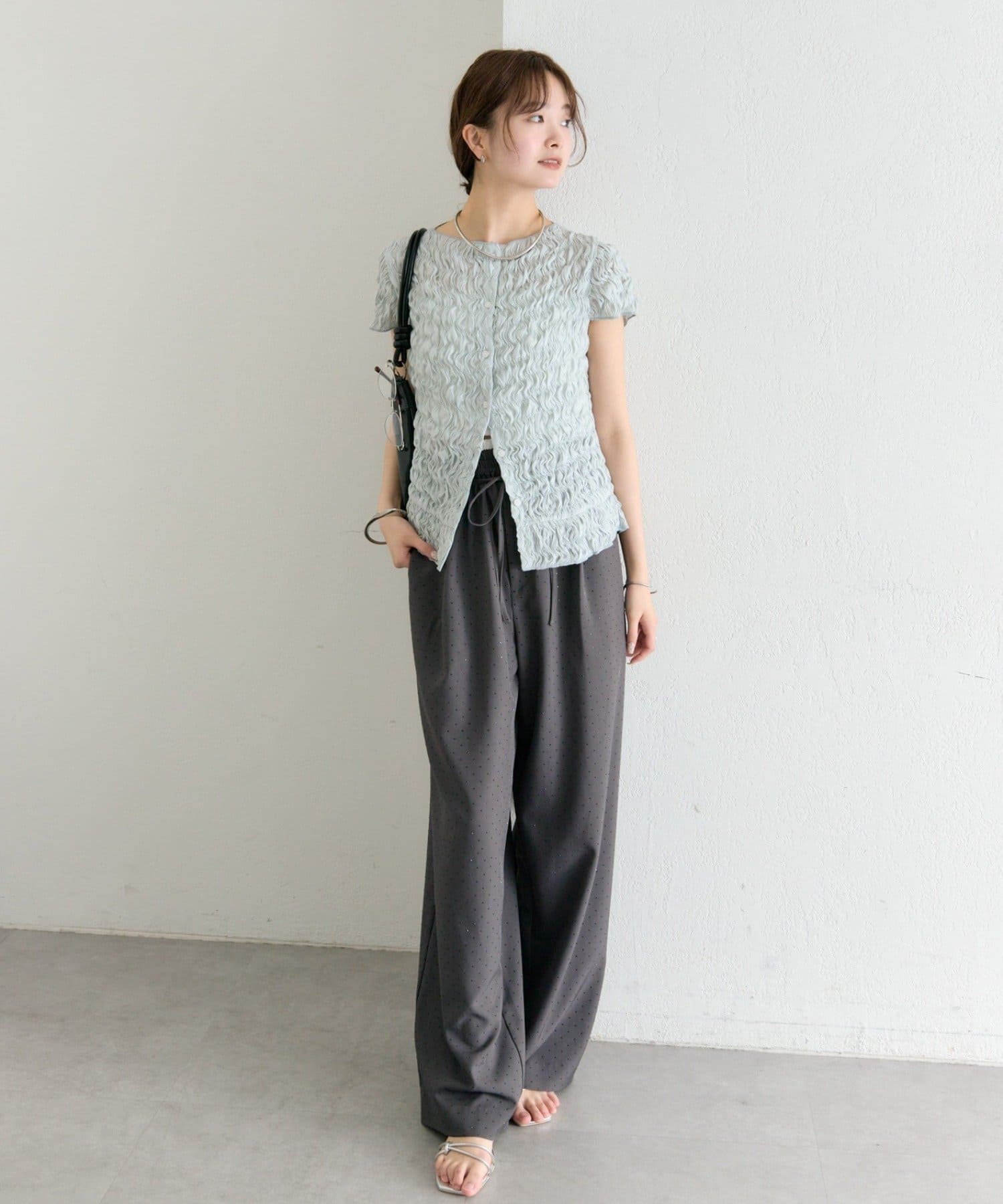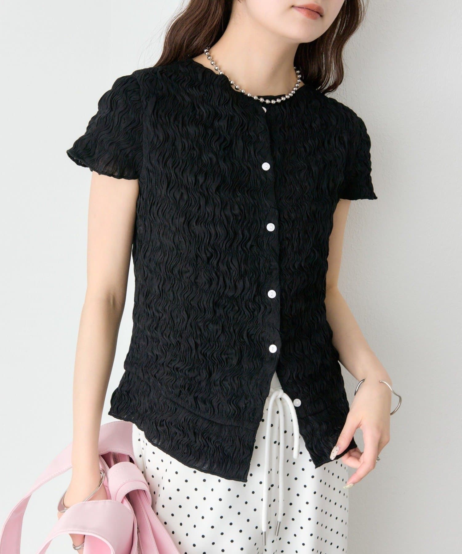 ・軽やかなエアリー素材感が、女性らしい柔らかさを引き立てます。