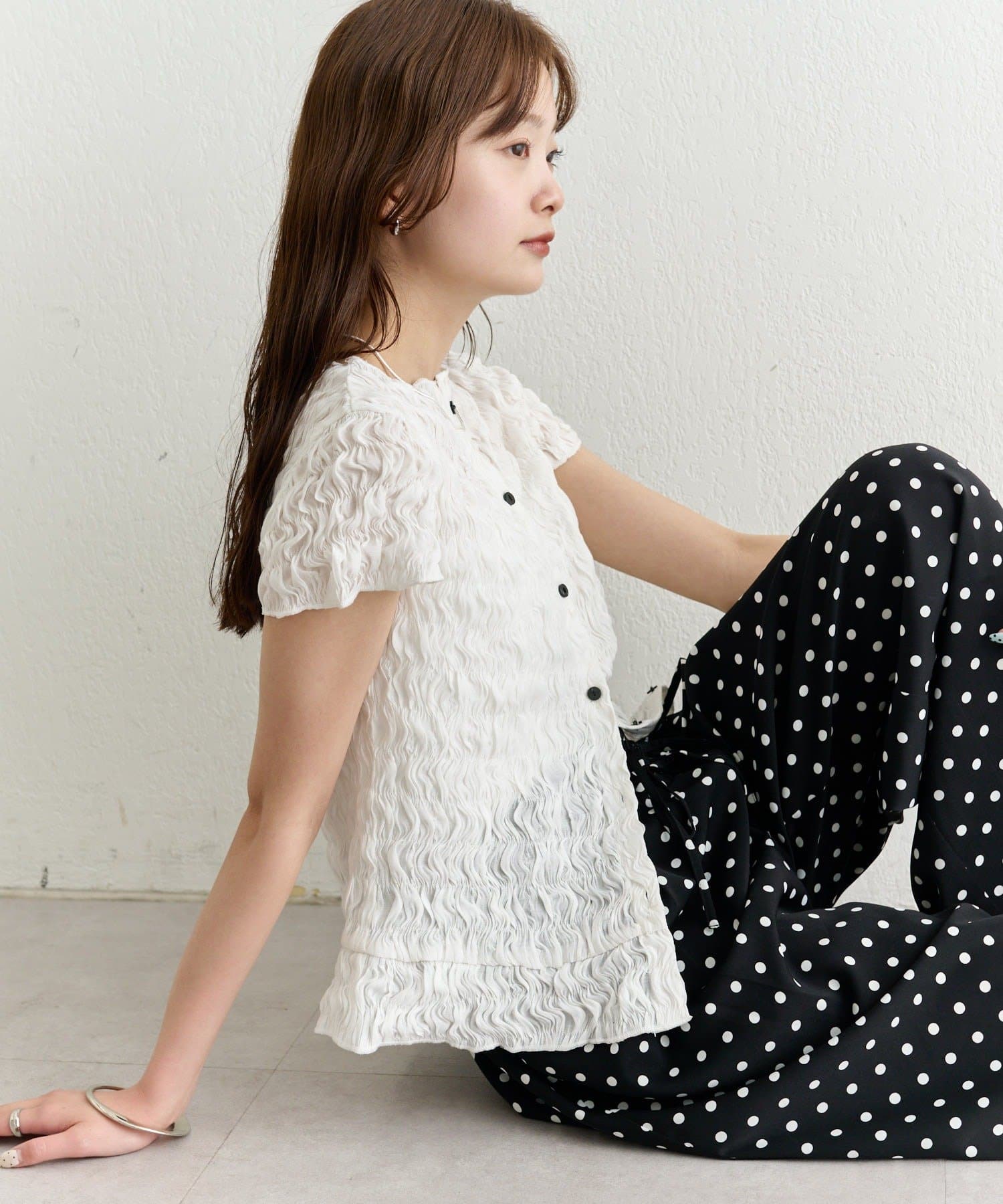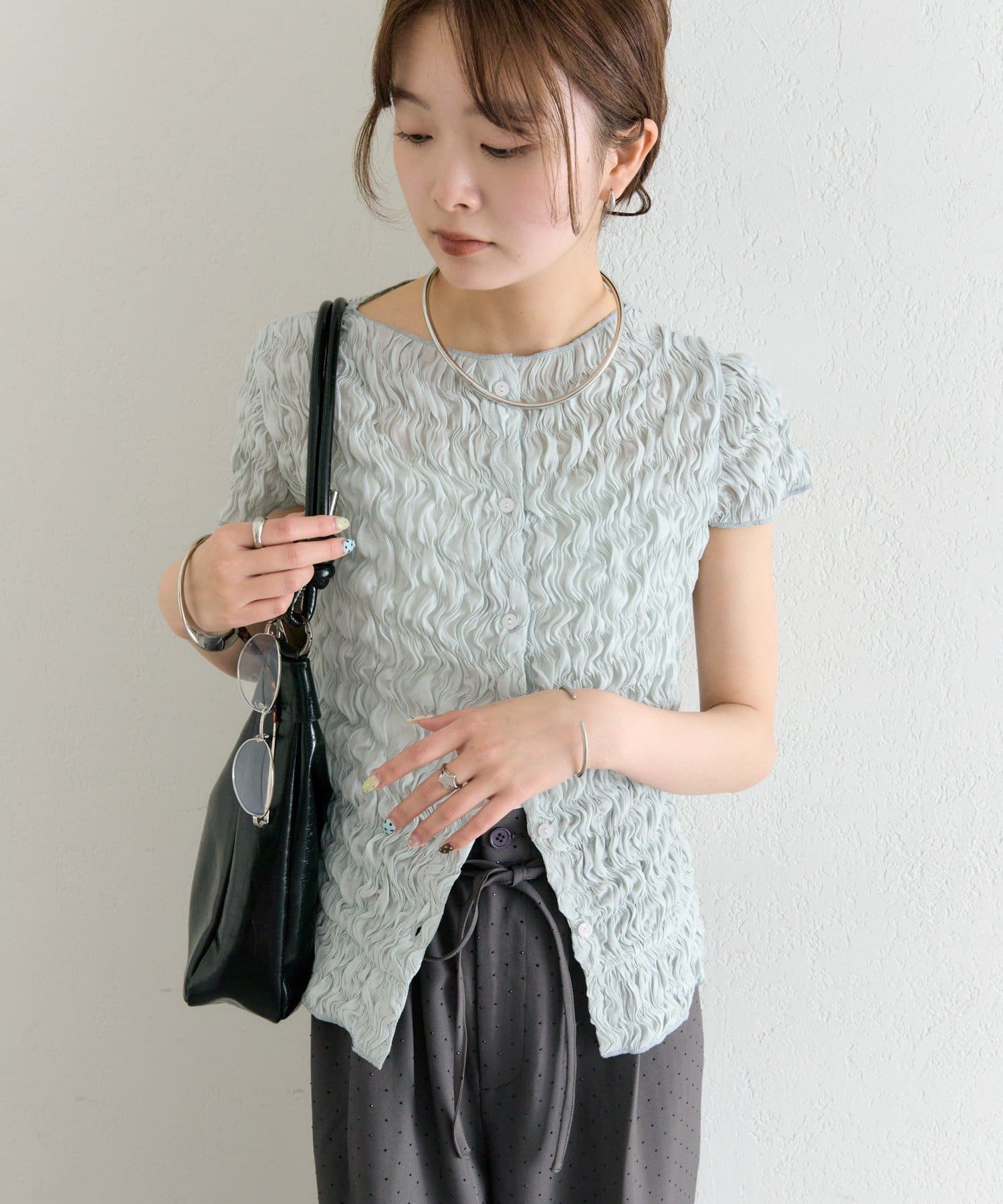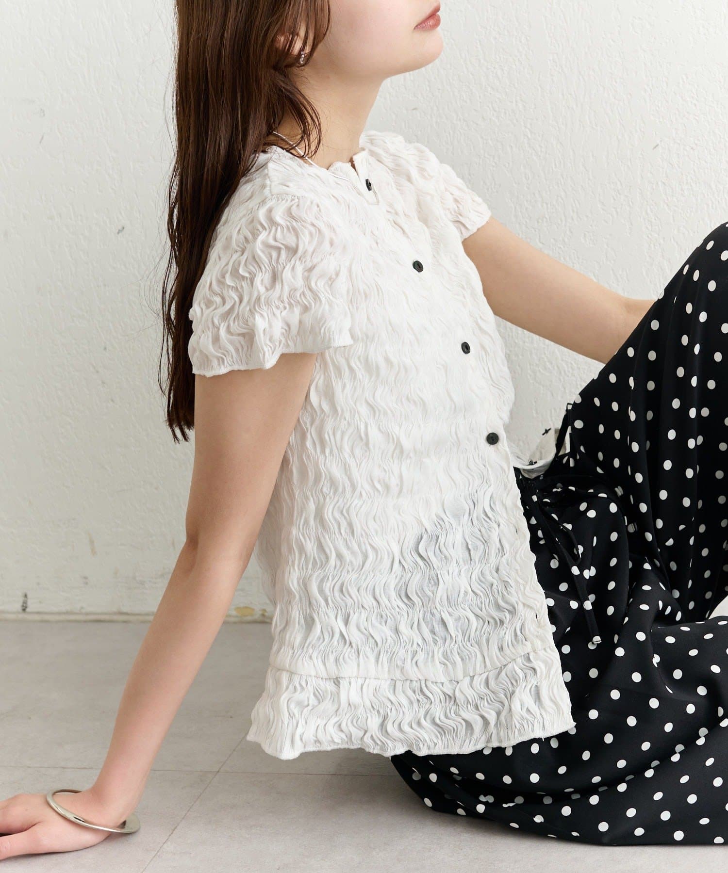 表情のある素材感が魅力のシャーリングブラウス