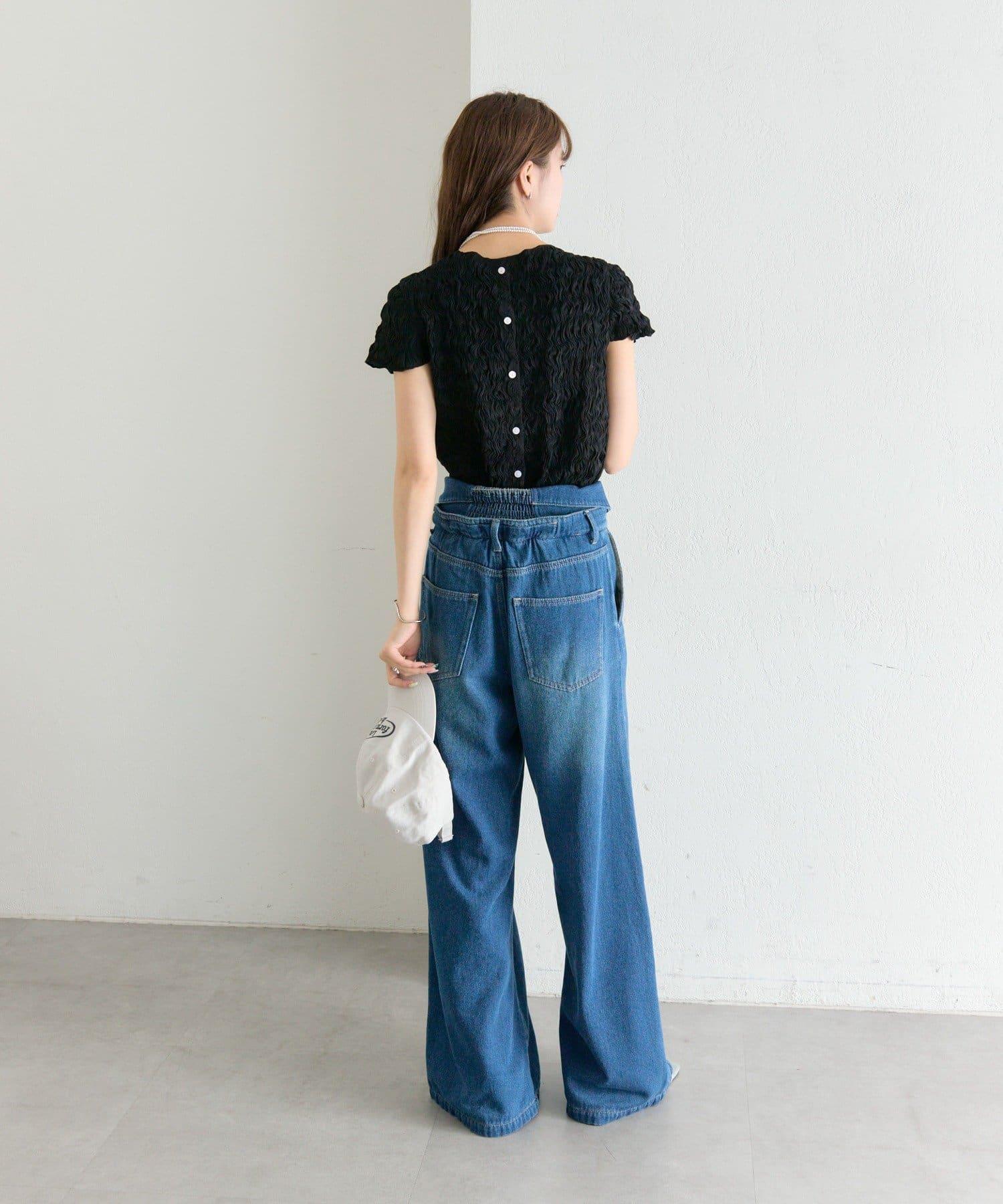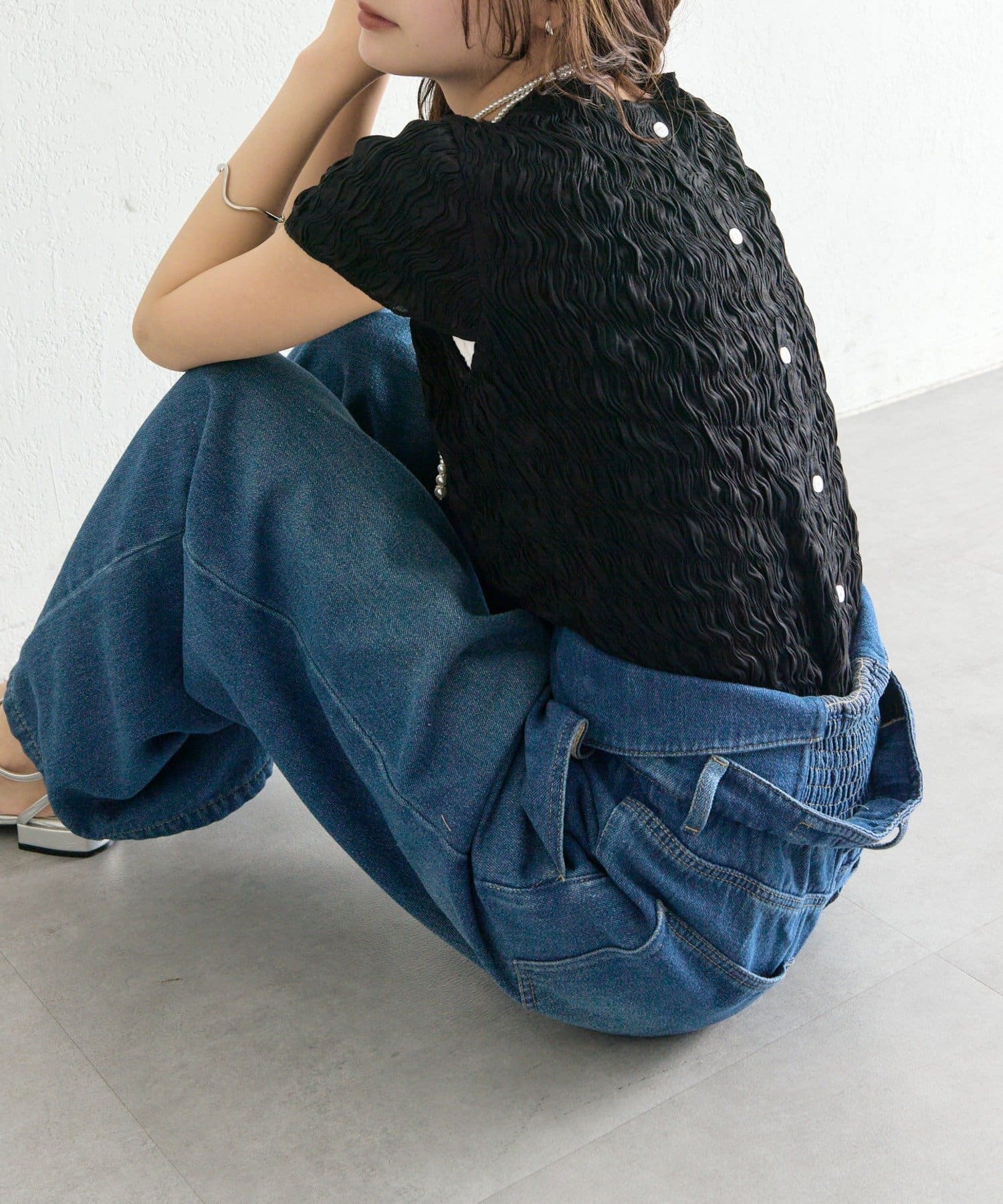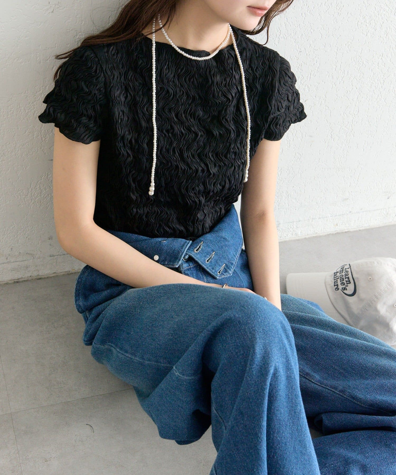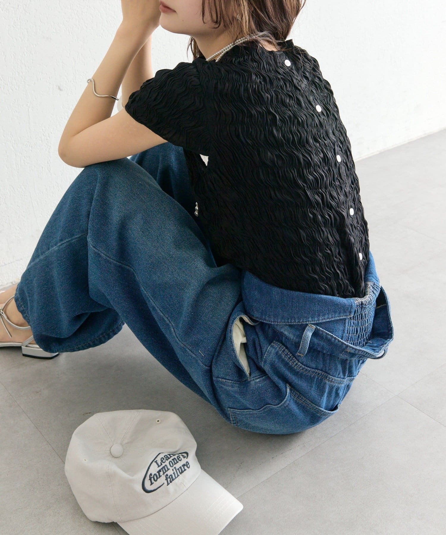 ・デニムを合わせて、甘さを程よくカジュアルダウンした着こなしに。