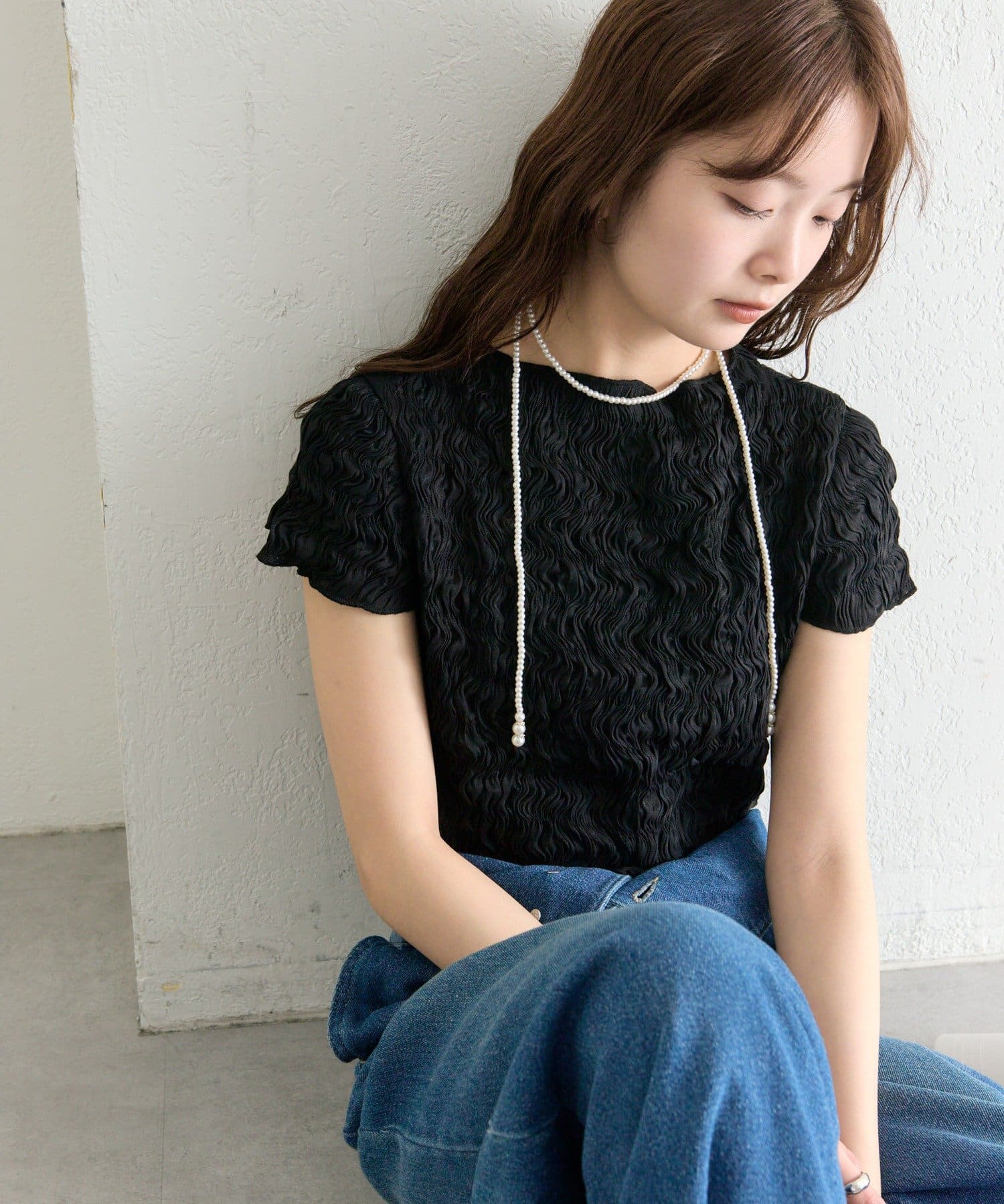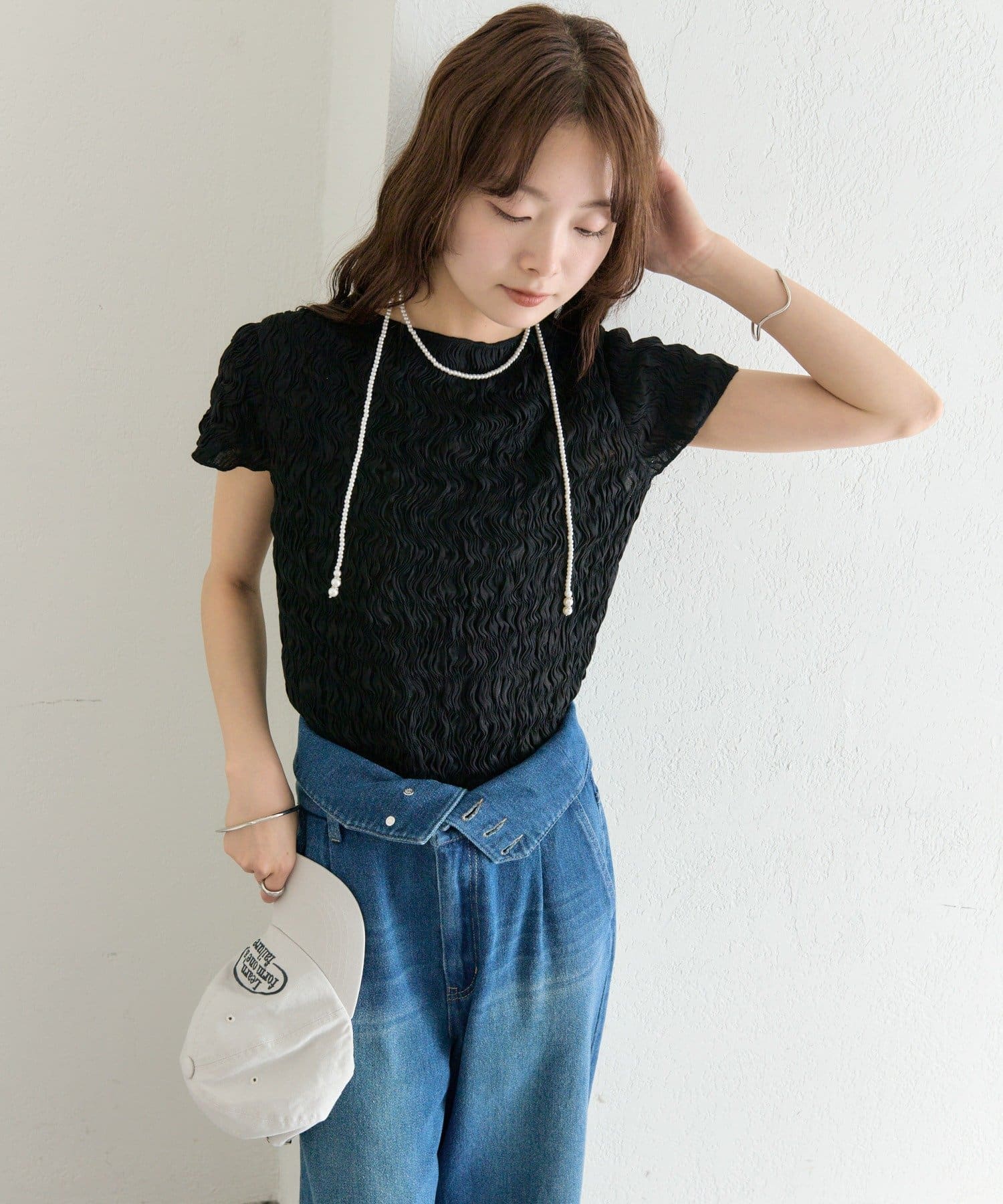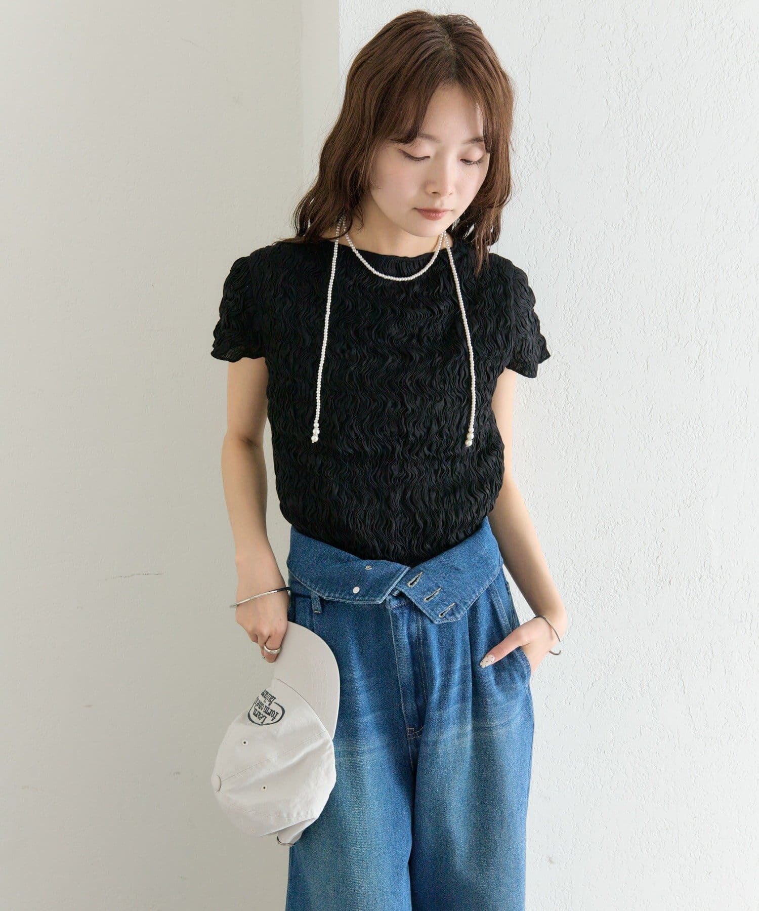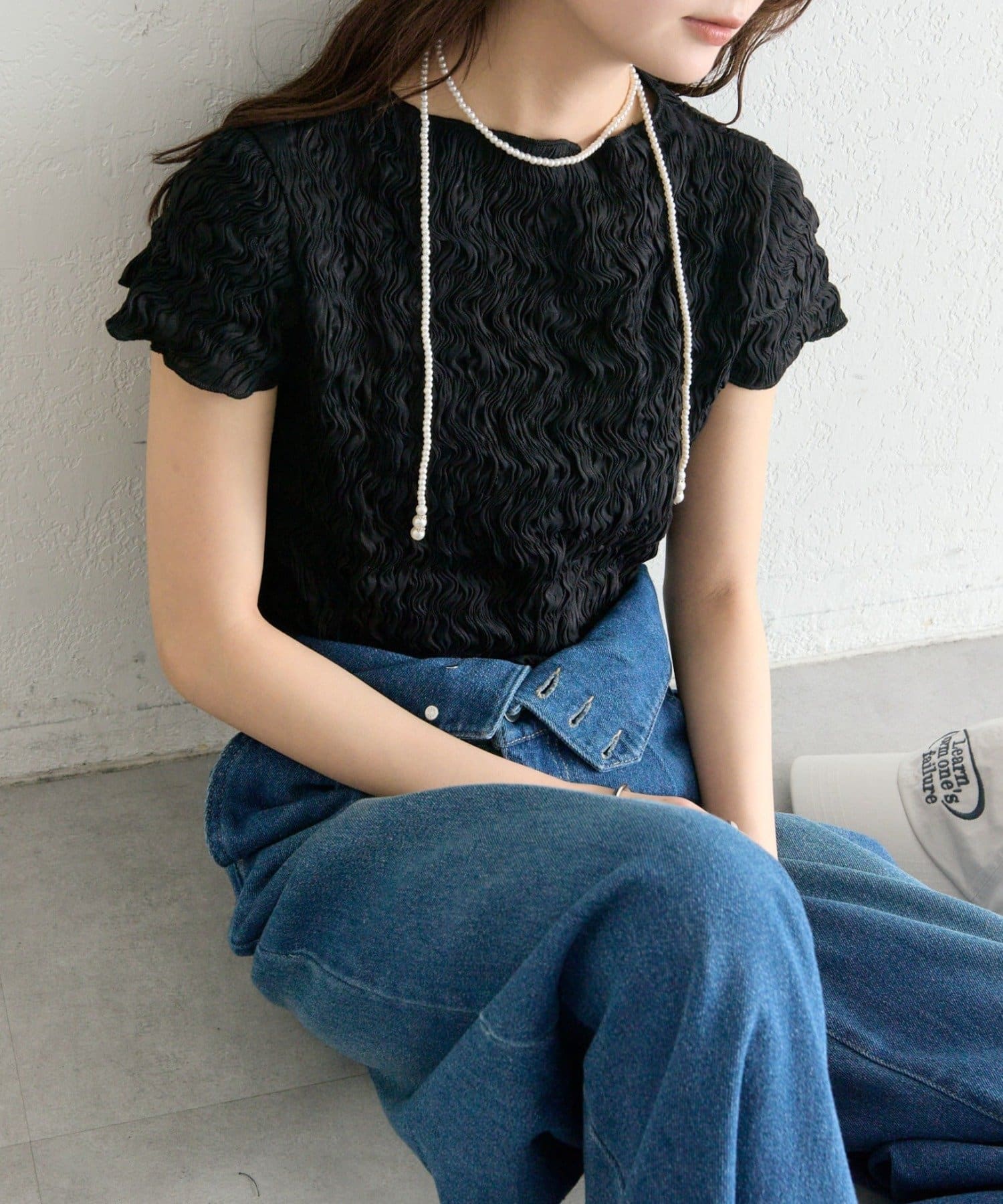 ・デニムを合わせて、甘さを程よくカジュアルダウンした着こなしに。