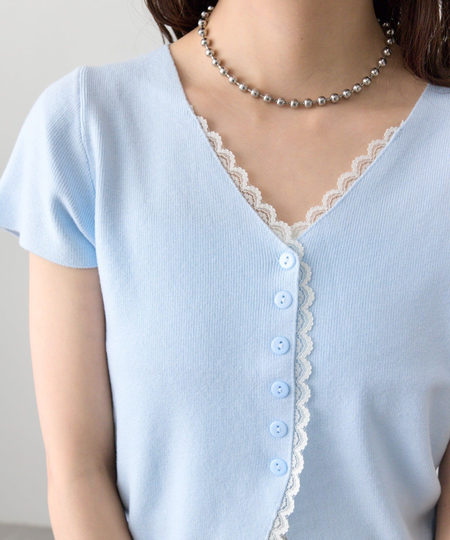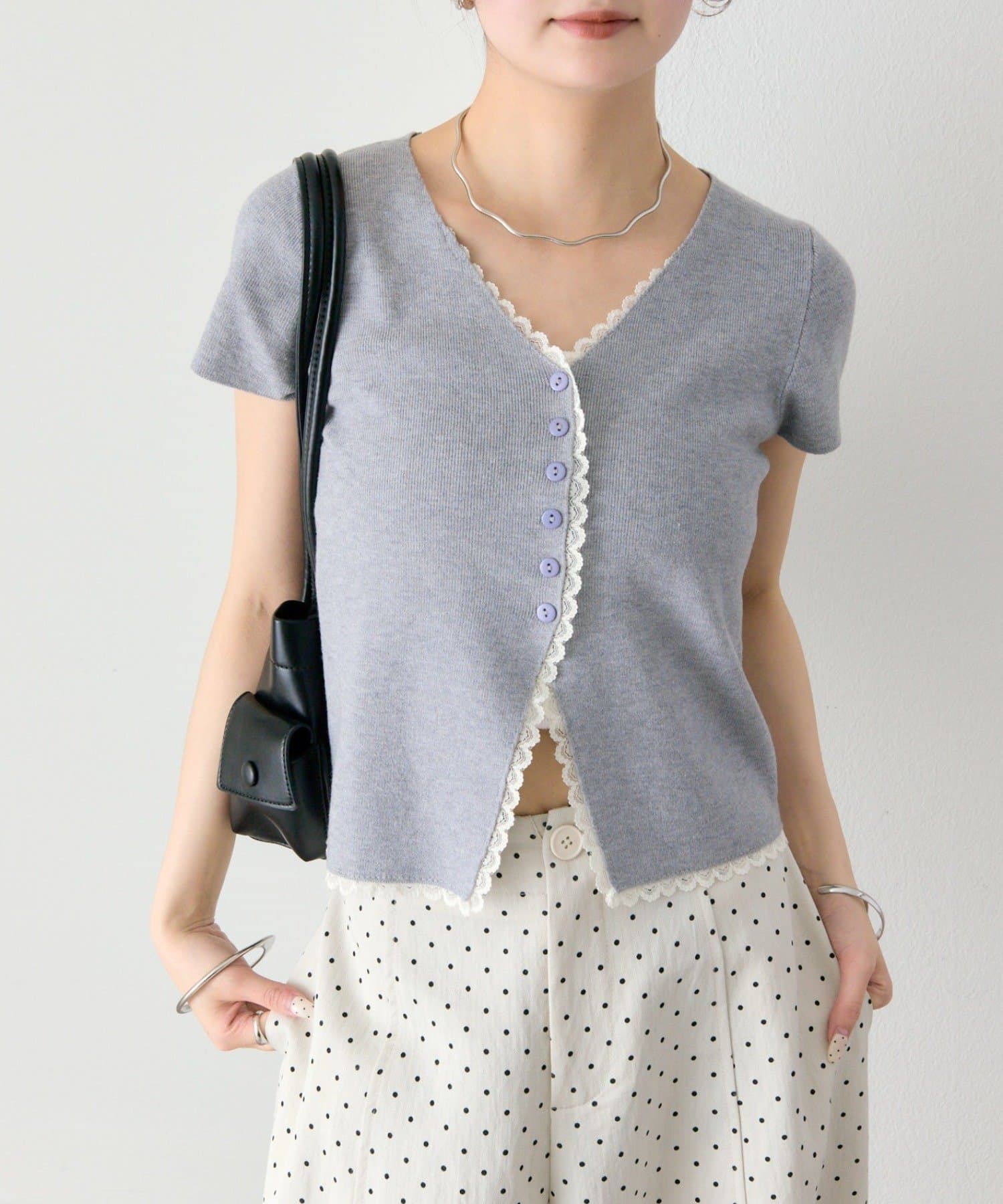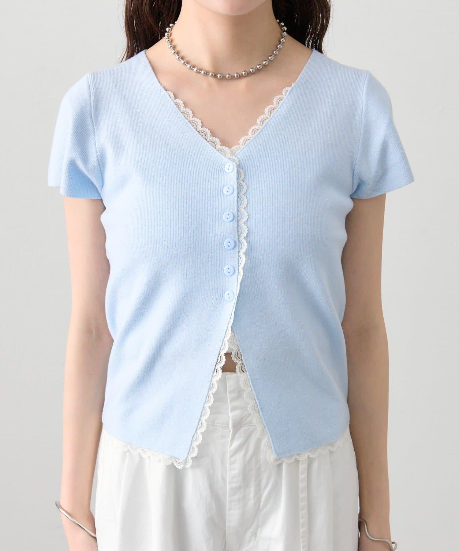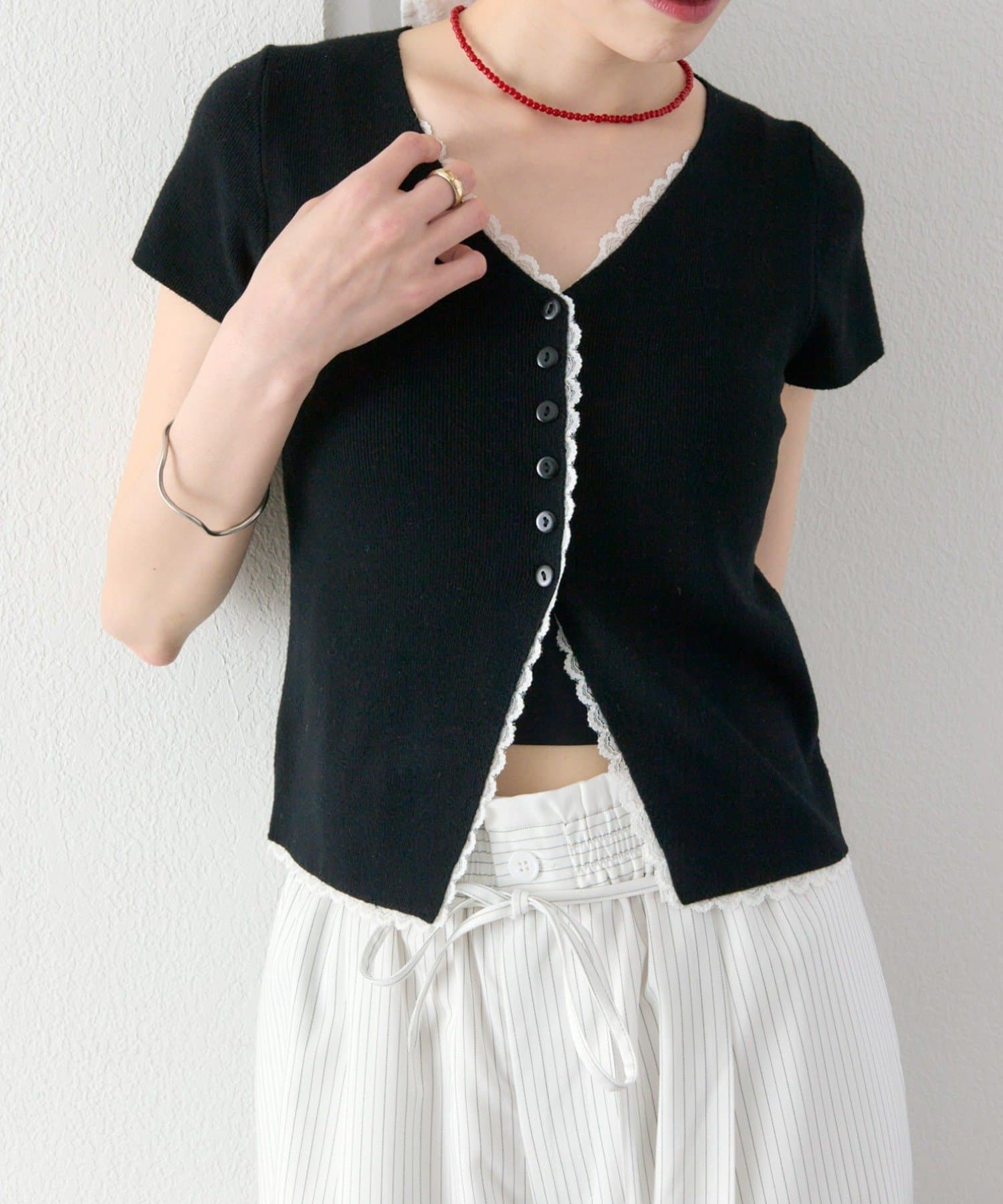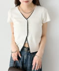 ・Vネックラインからフロントにかけて施された配色レースが目を引く半袖ニットカーディガン。