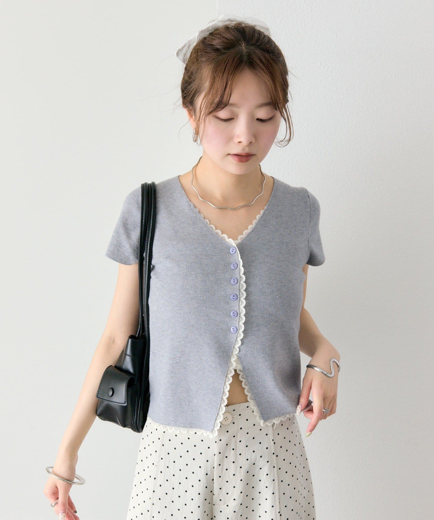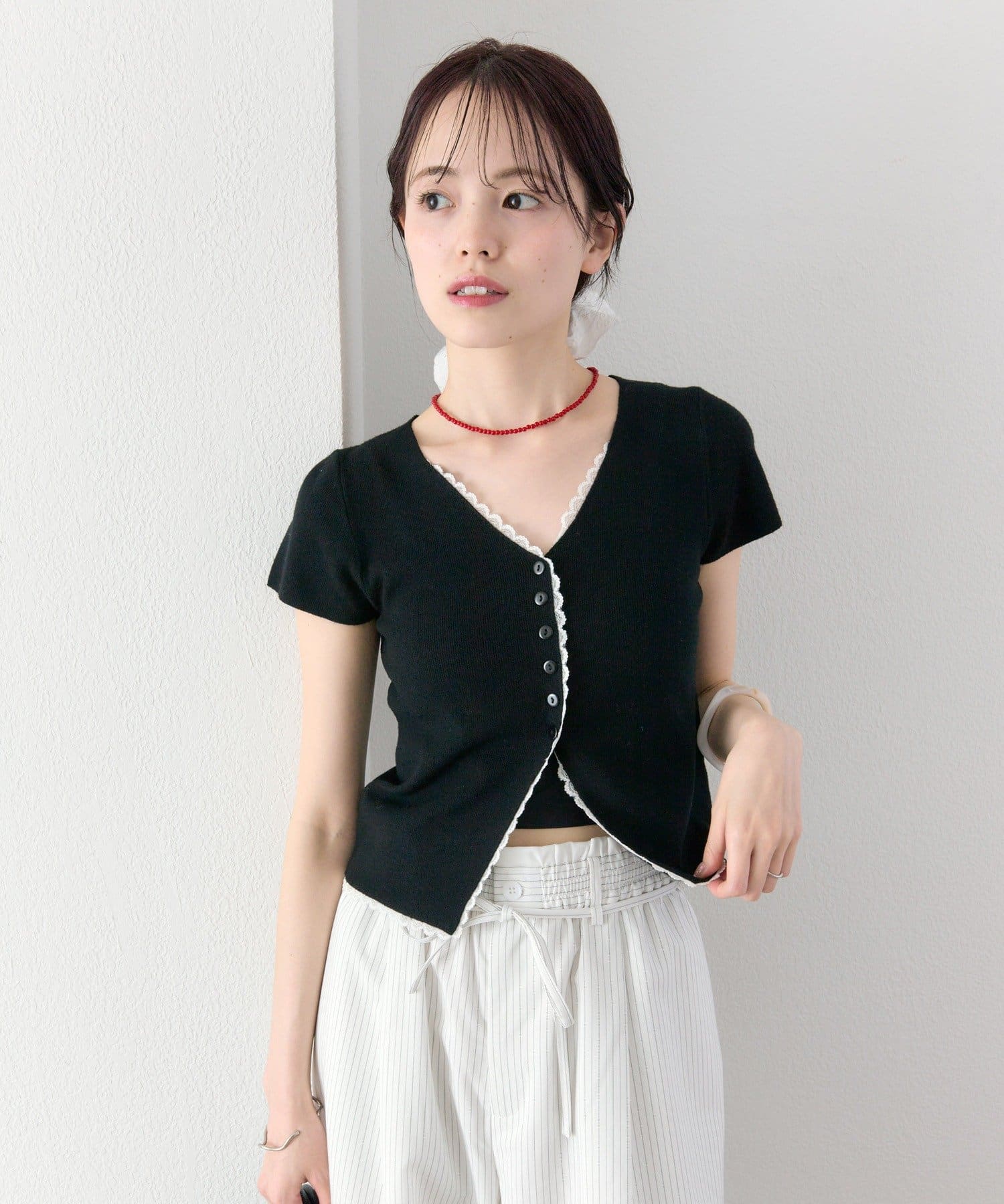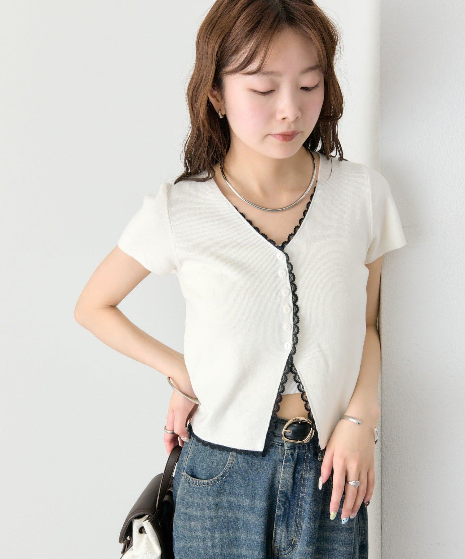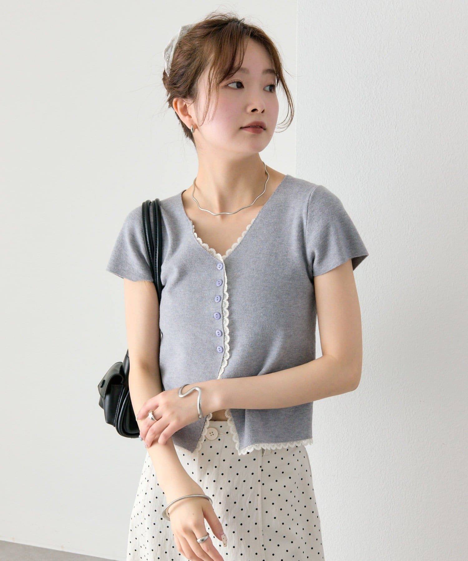 ・Vネックラインからフロントにかけて施された配色レースが目を引く半袖ニットカーディガン。