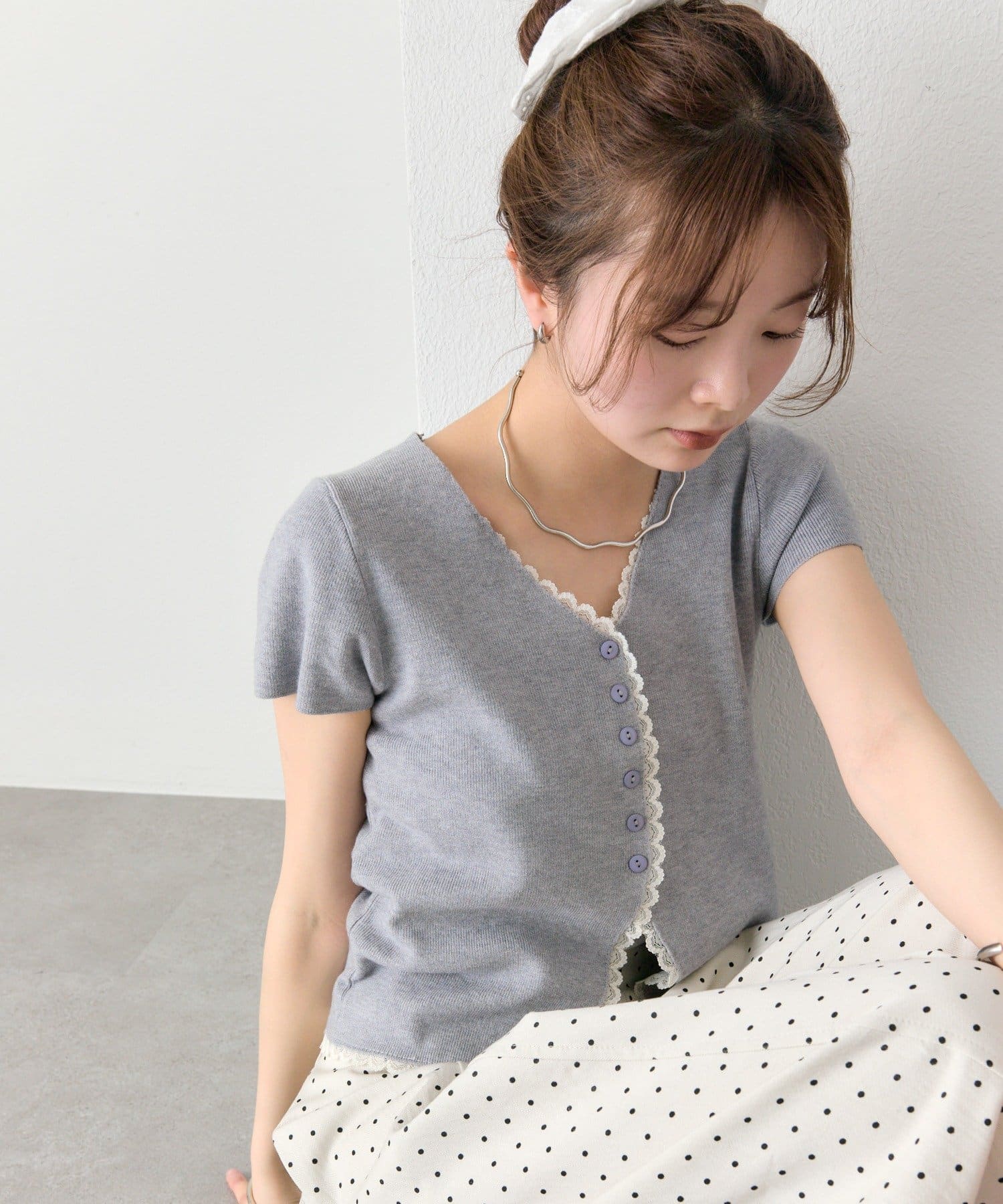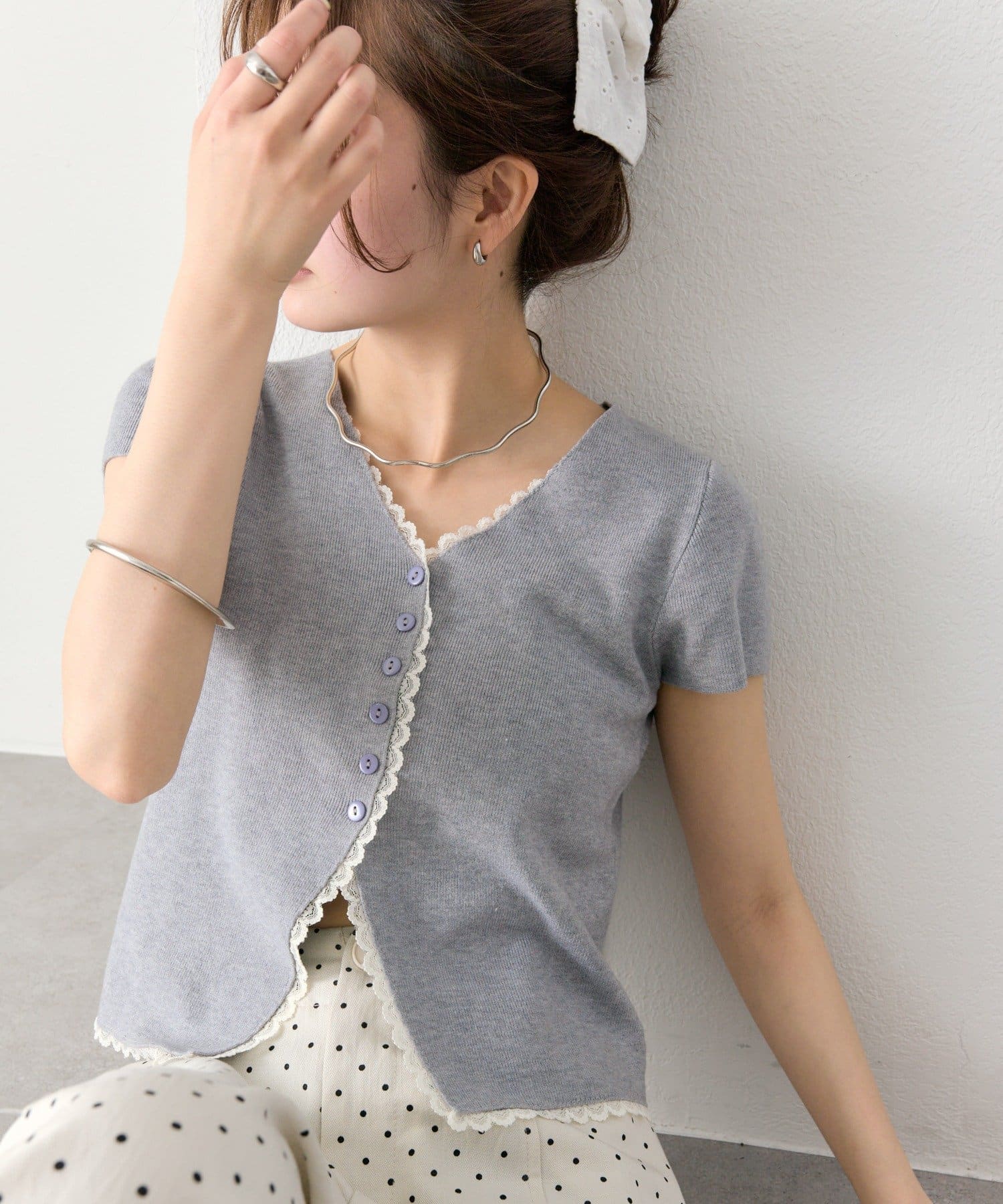 レースライン半袖ニットカーディガン