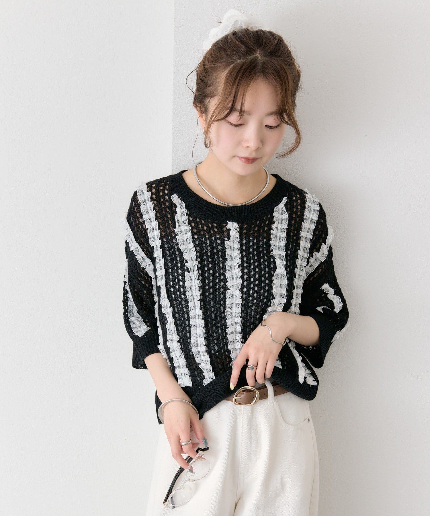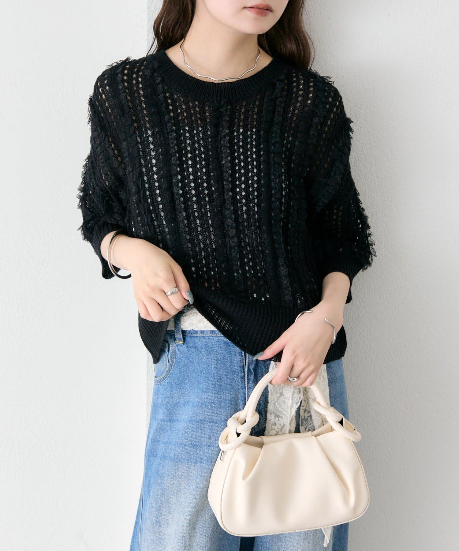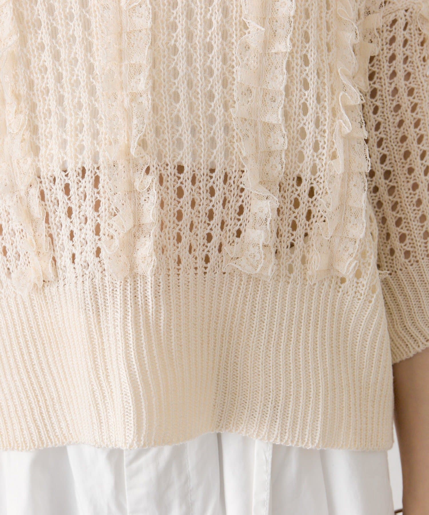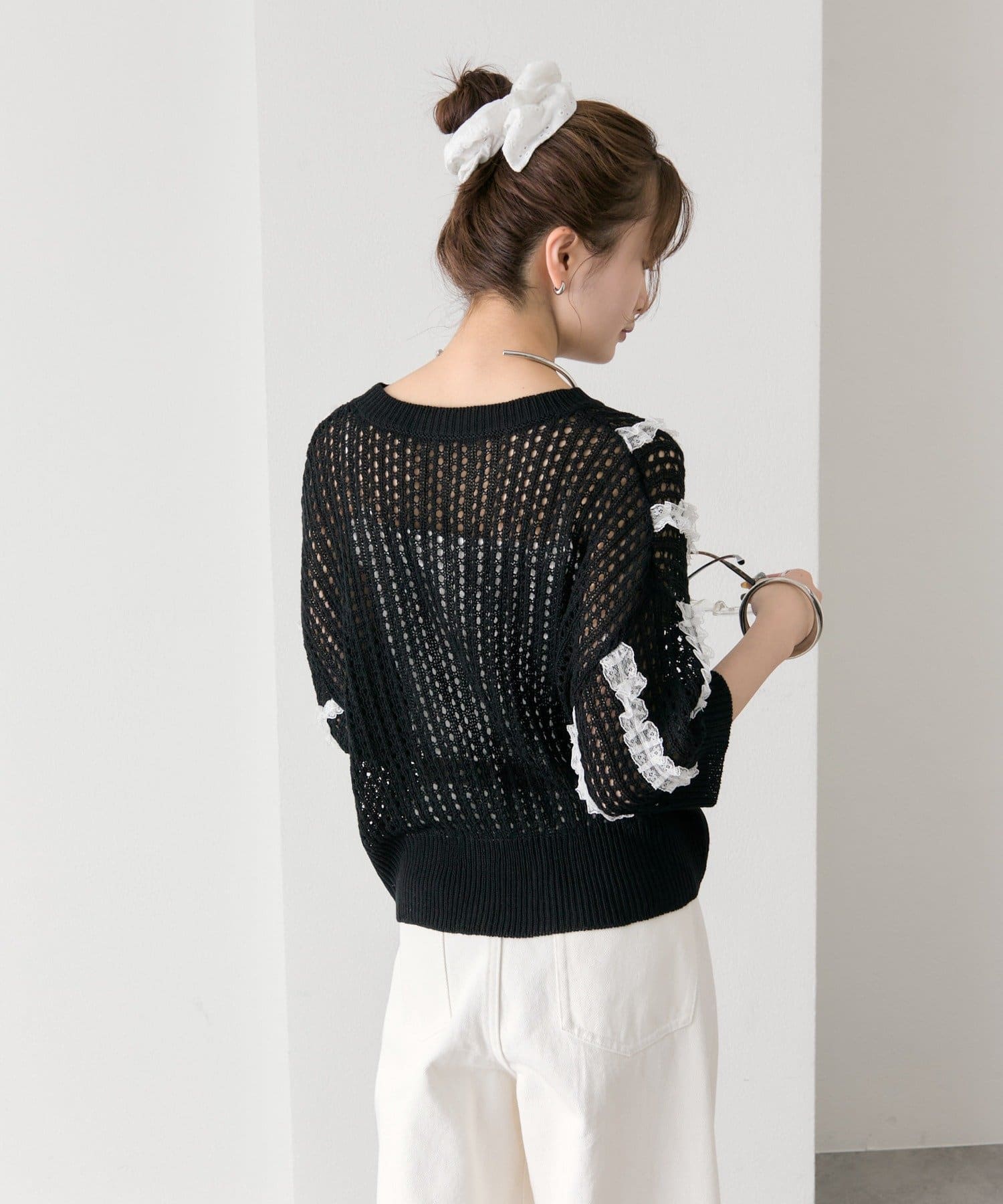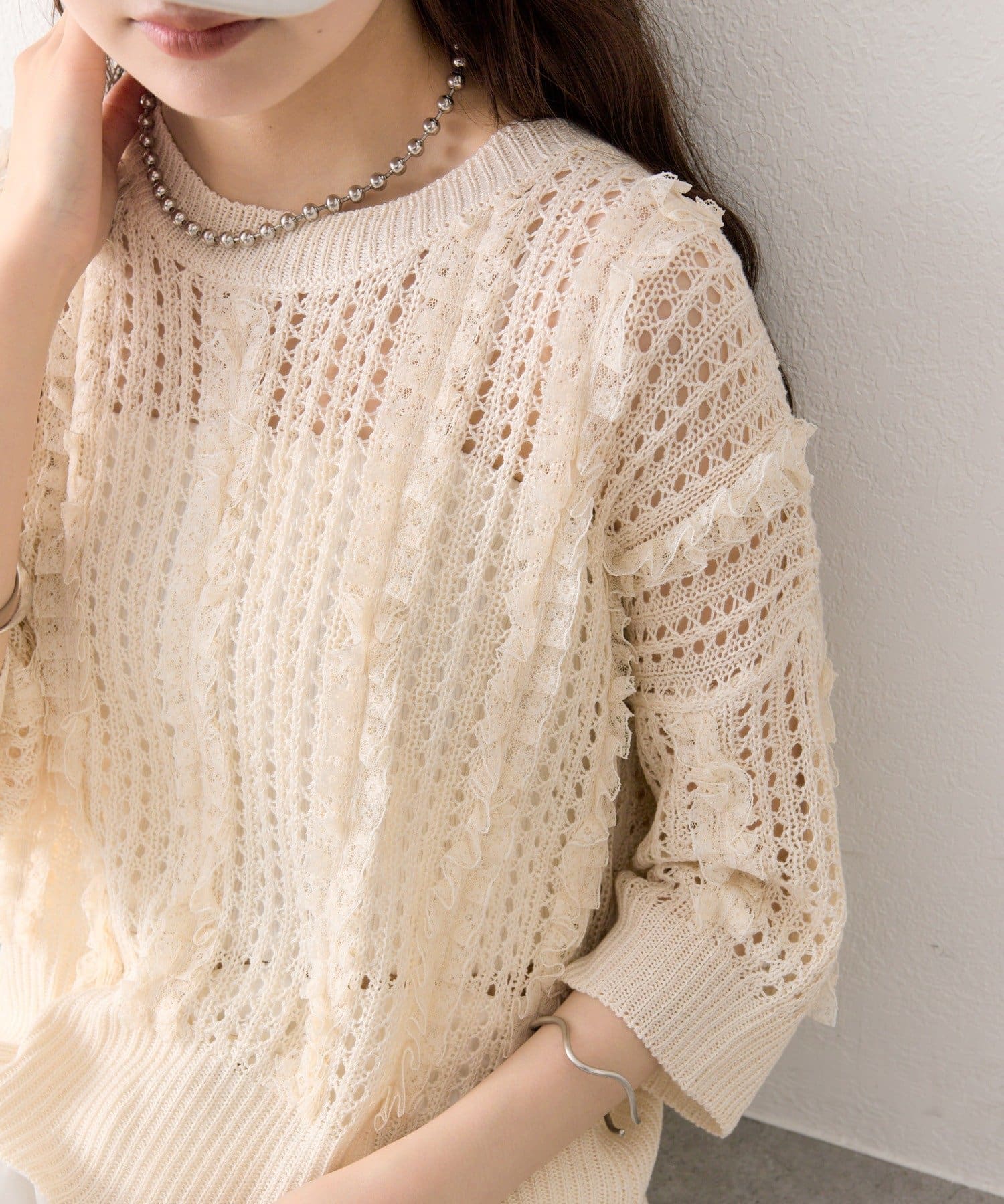 ・透かし編みのニットに、立体的なフリルラインを施した存在感のある一枚。