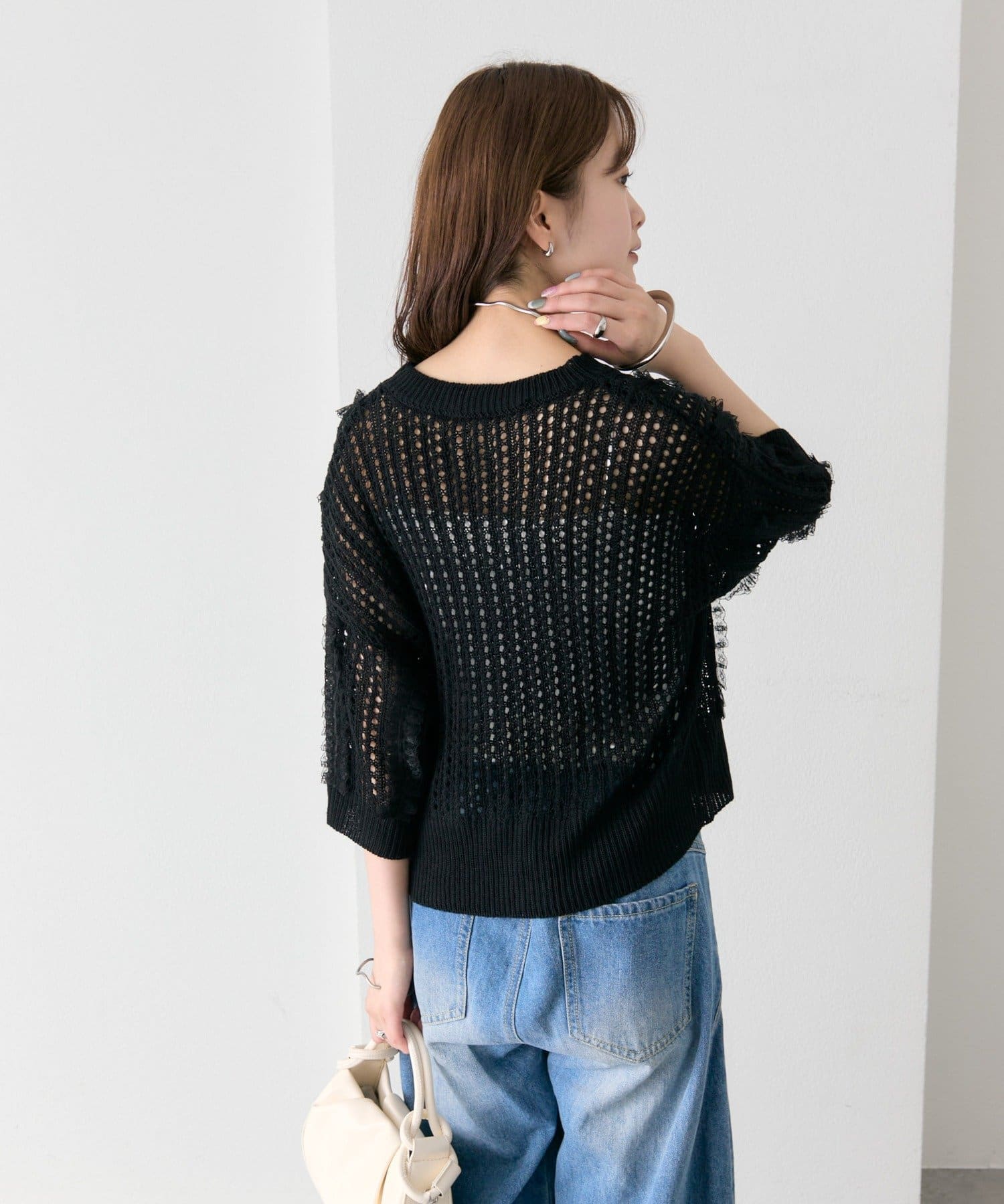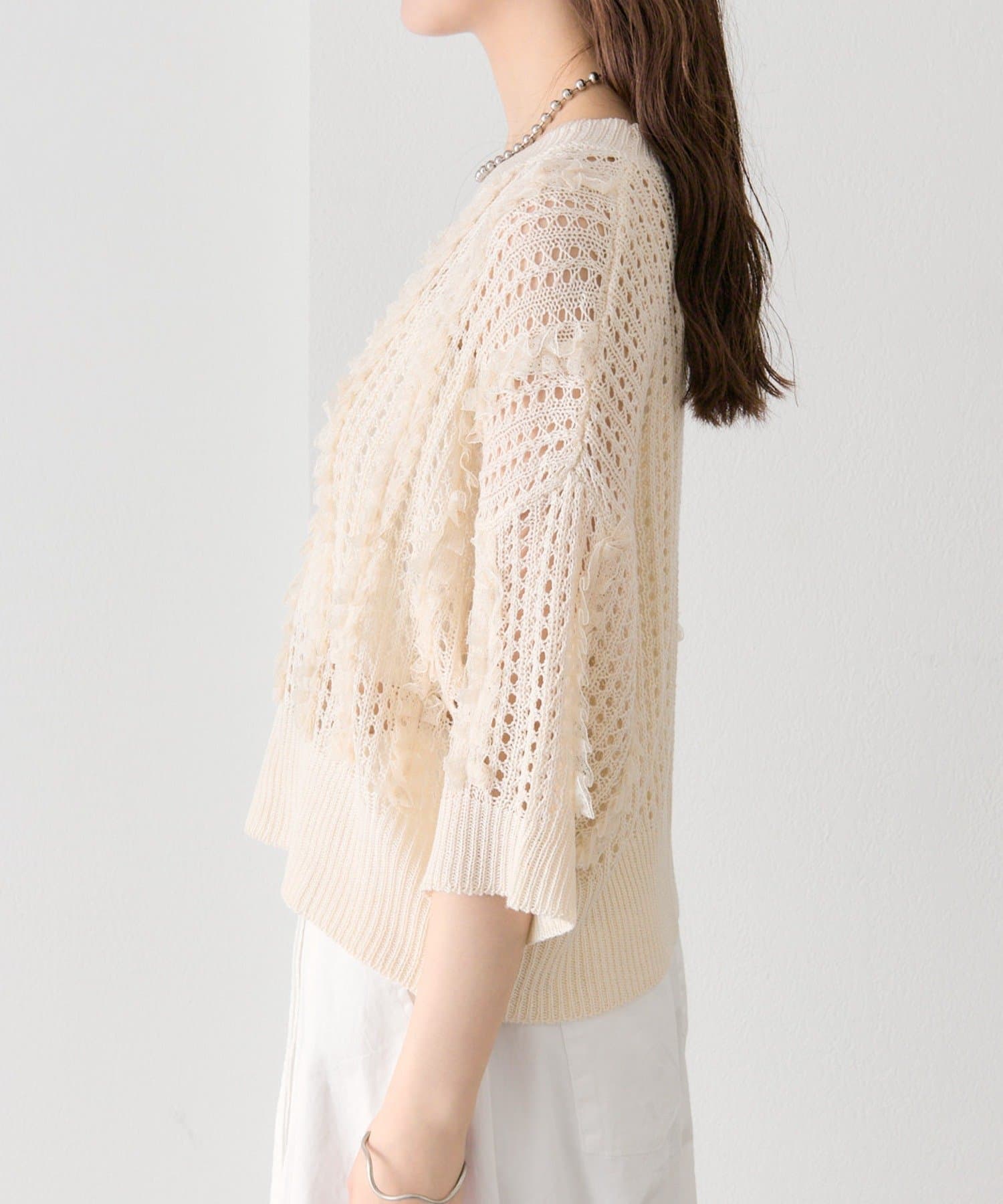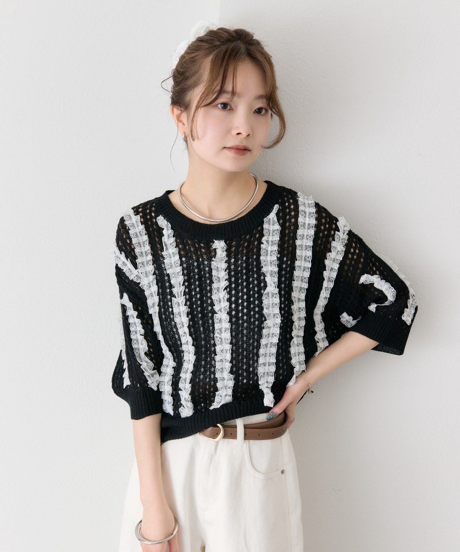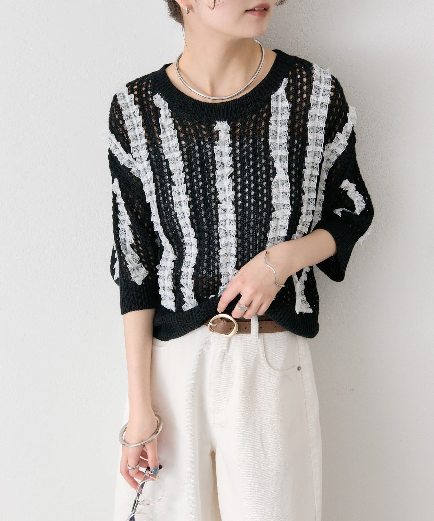 ・透かし編みのニットに、立体的なフリルラインを施した存在感のある一枚。