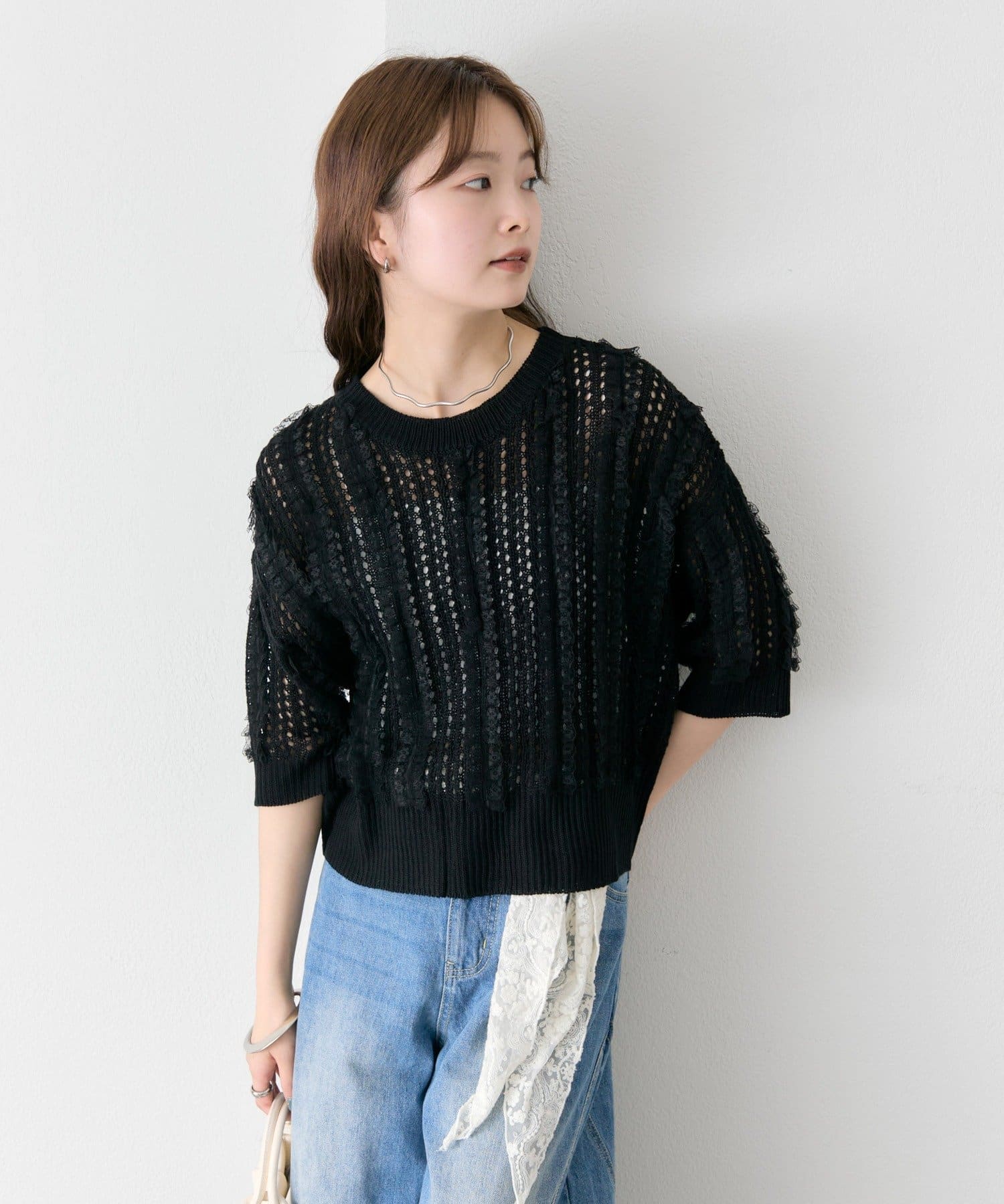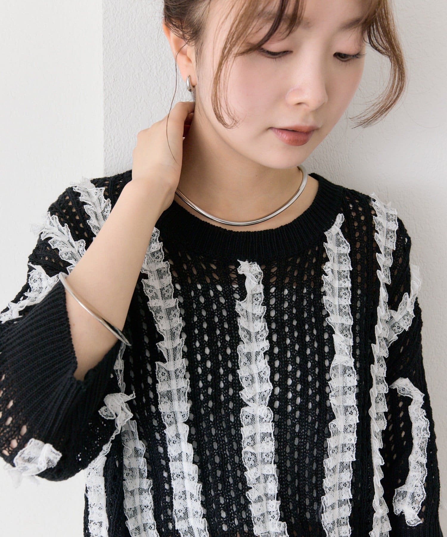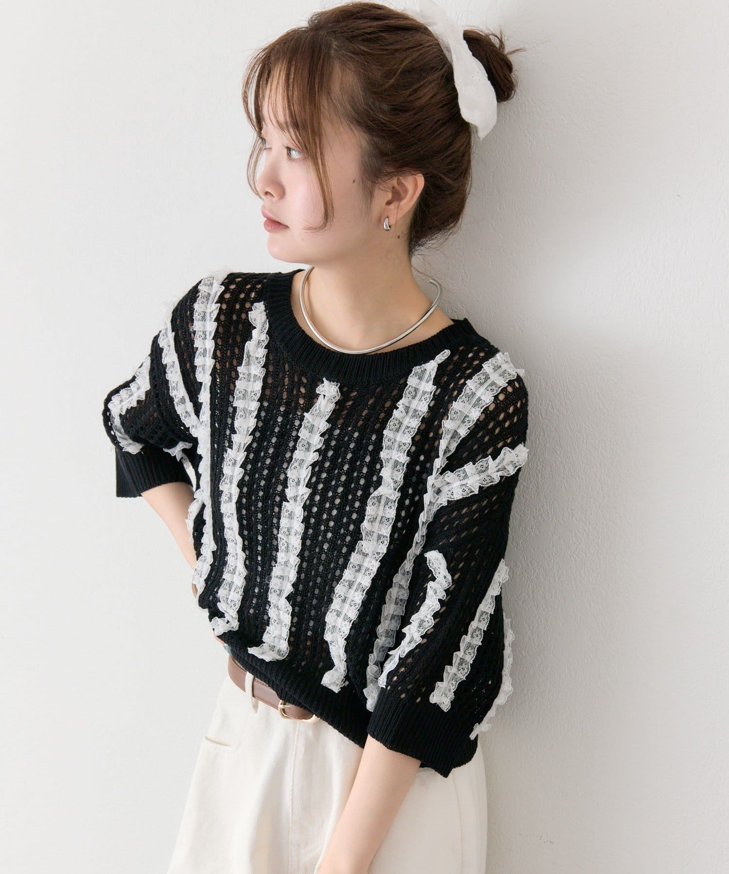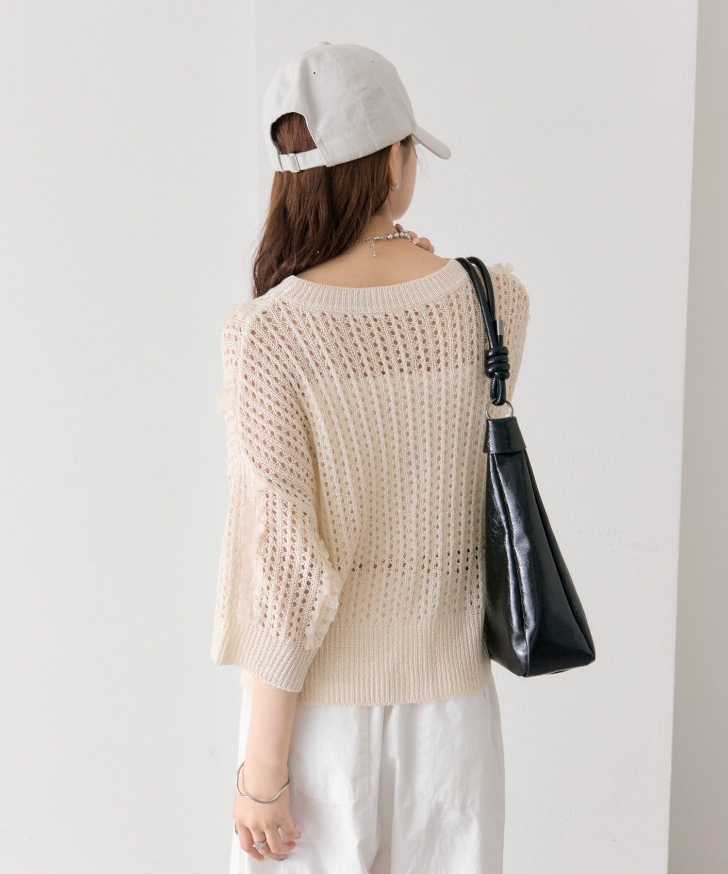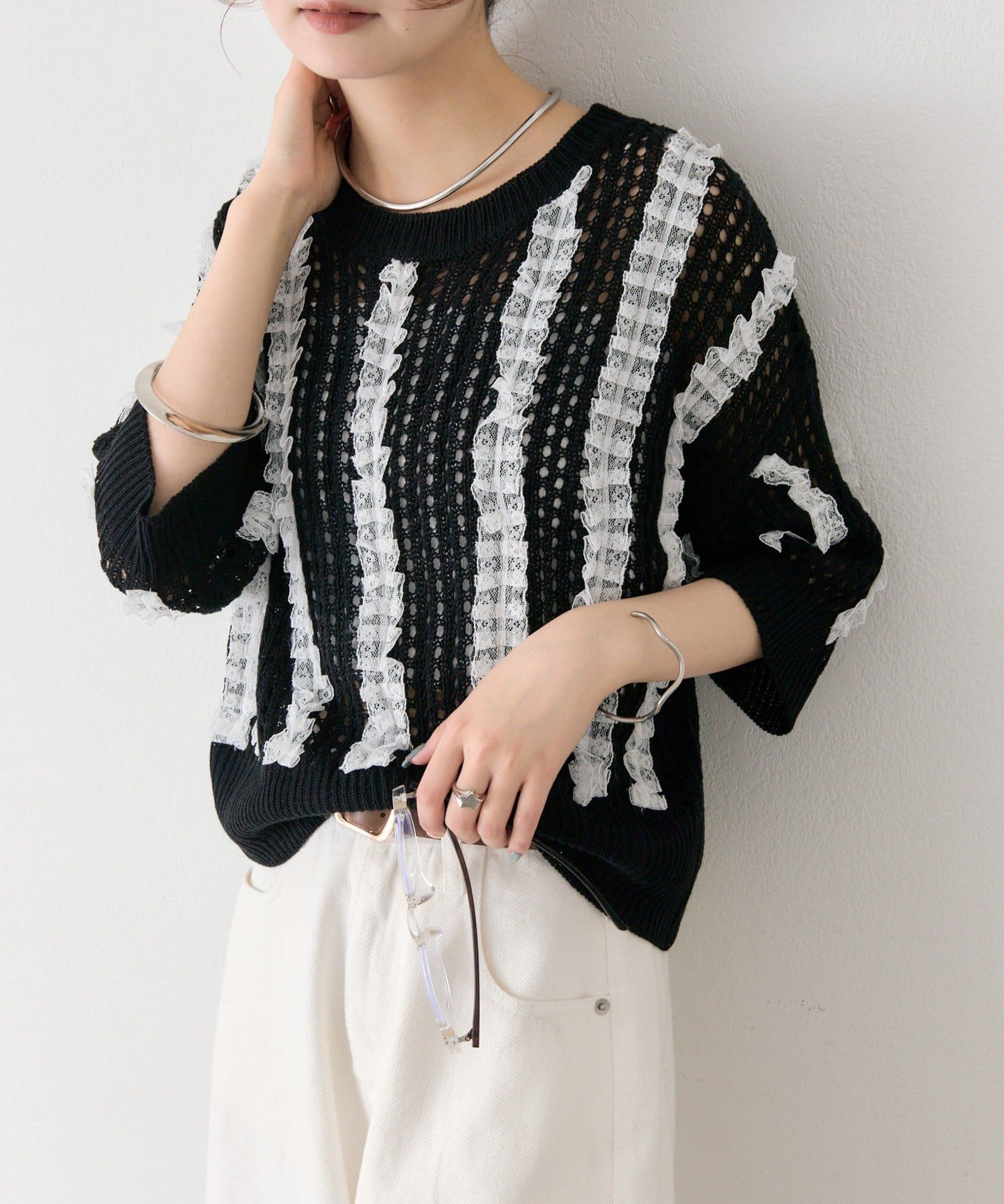 ・透かし編みのニットに、立体的なフリルラインを施した存在感のある一枚。