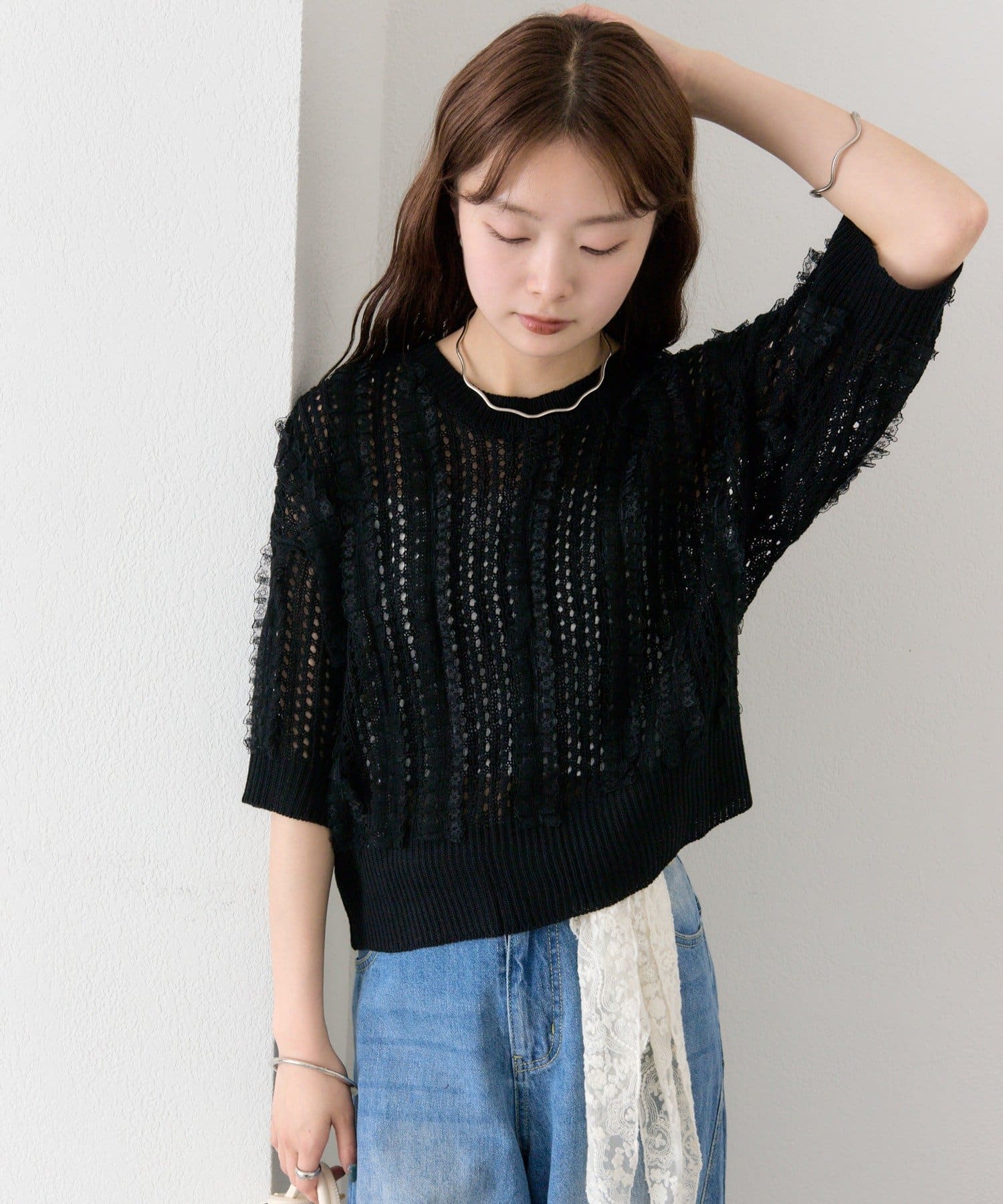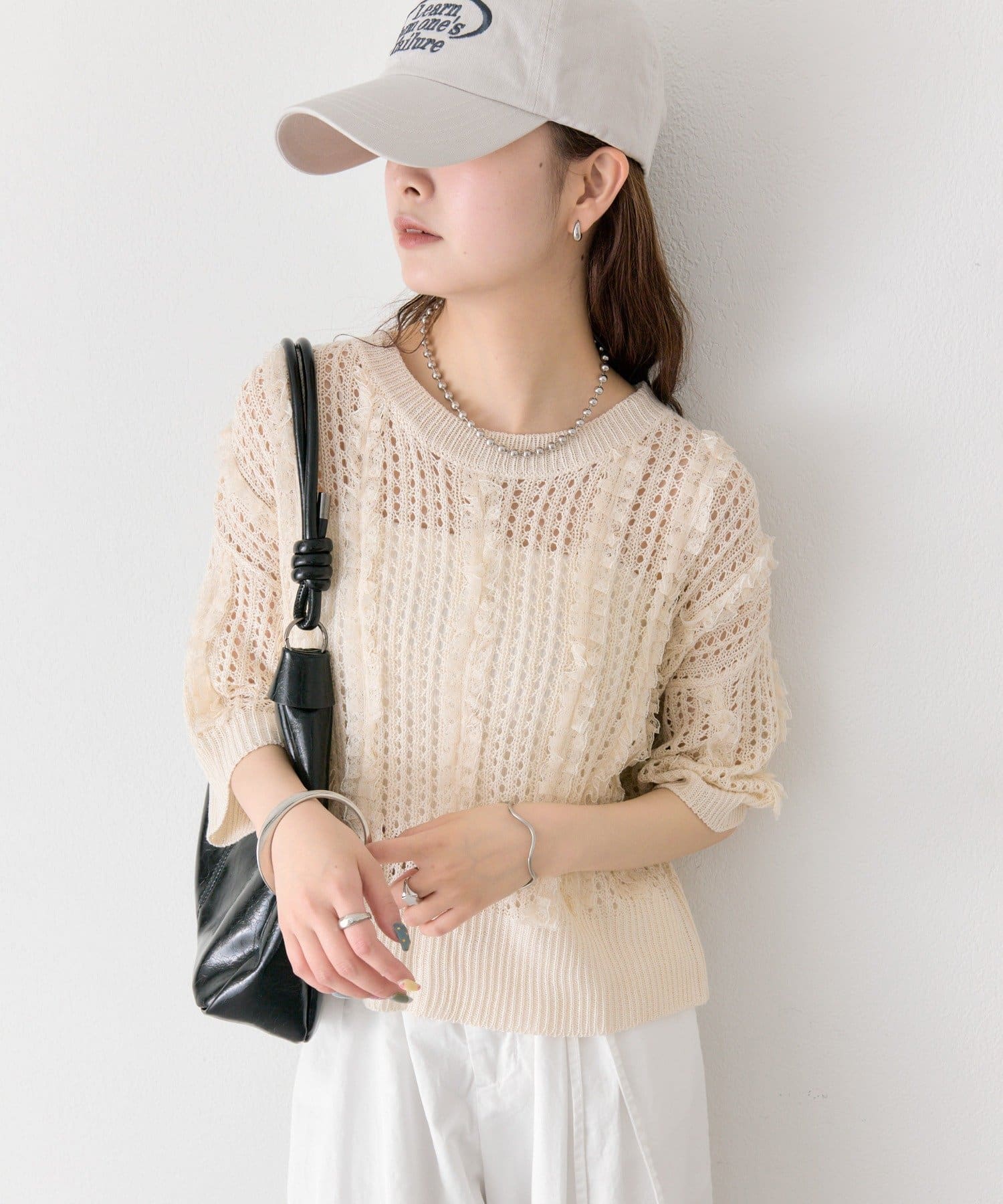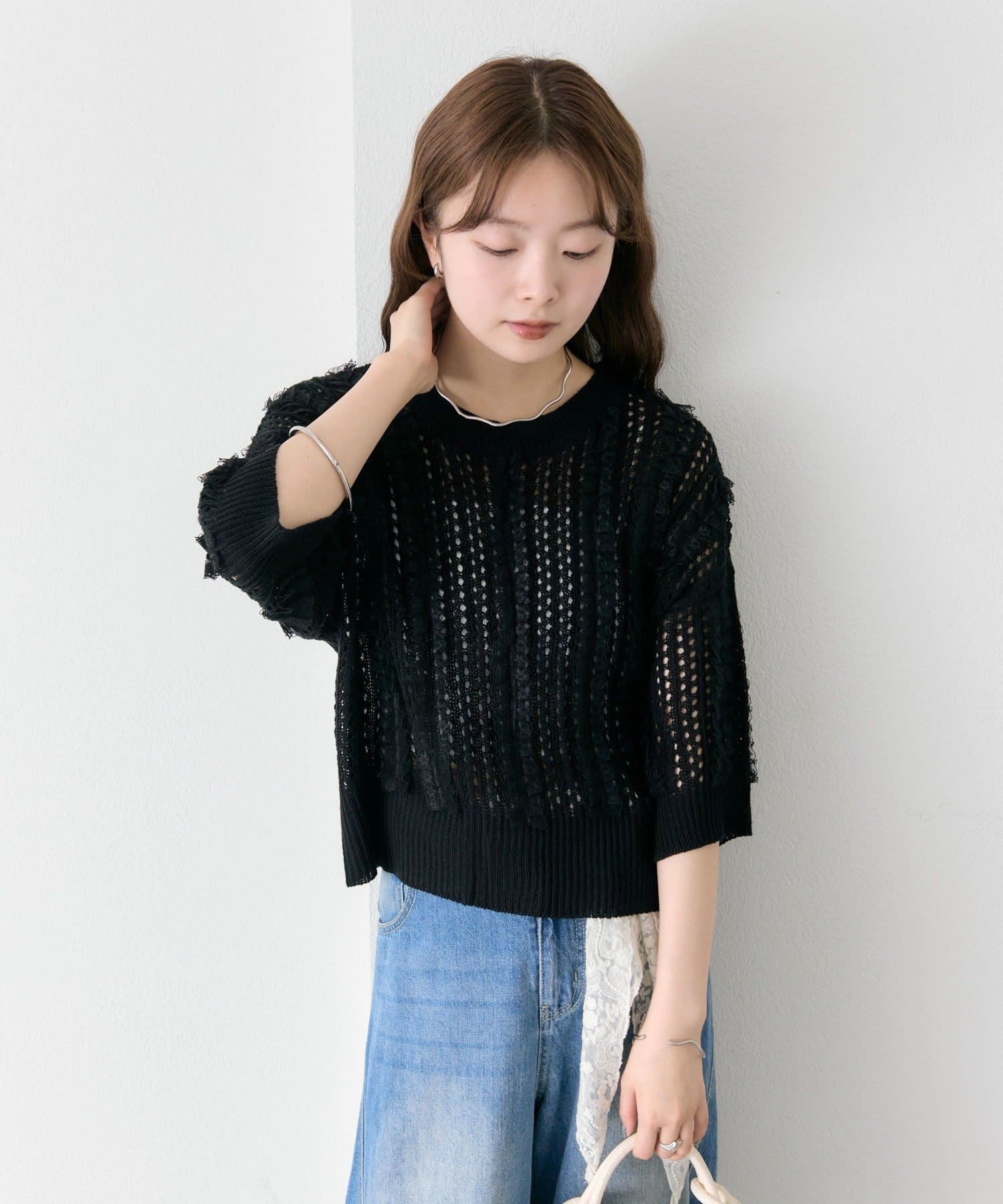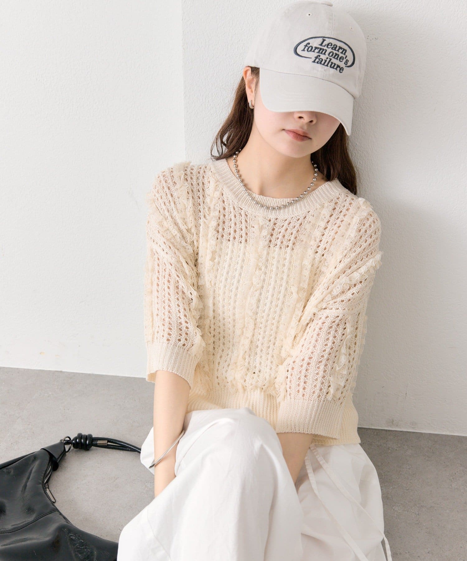 ・透かし編みのニットに、立体的なフリルラインを施した存在感のある一枚。