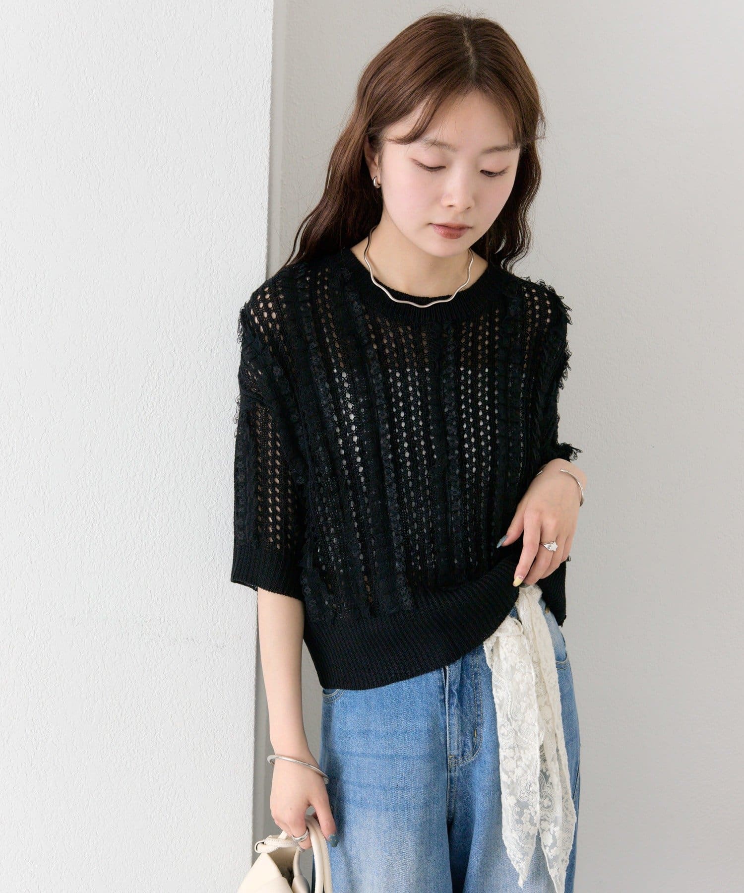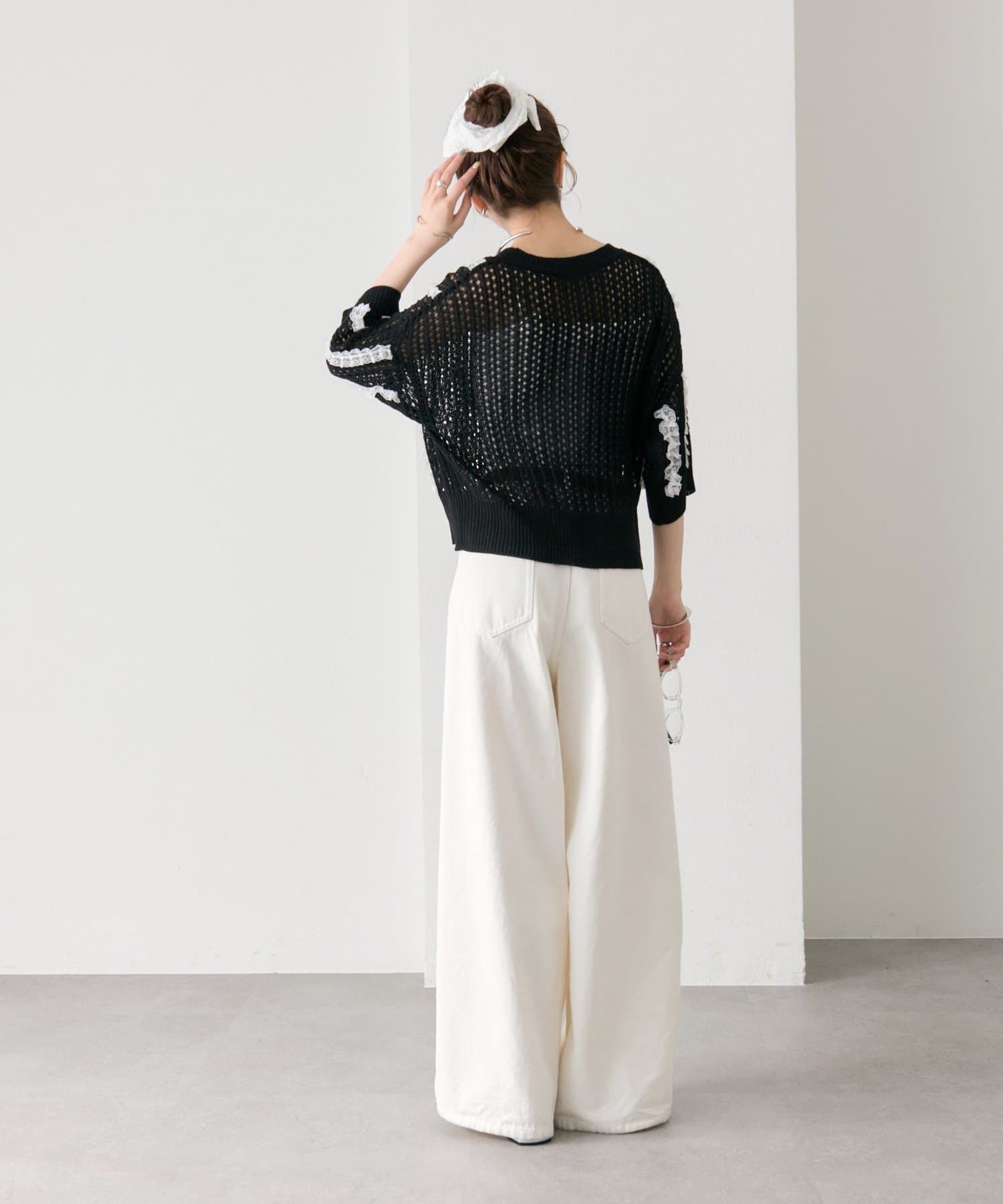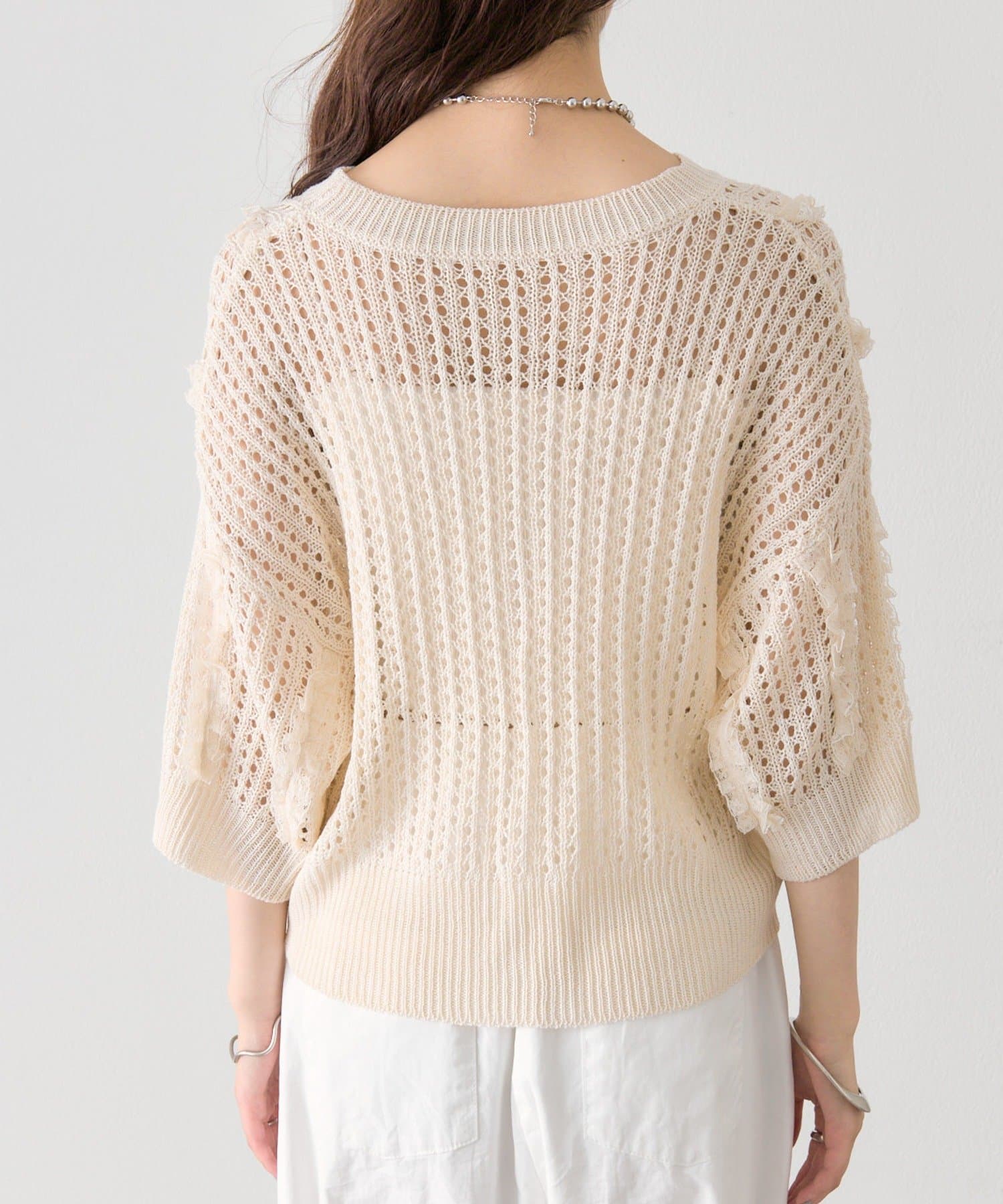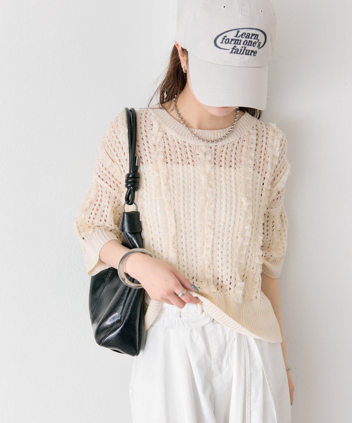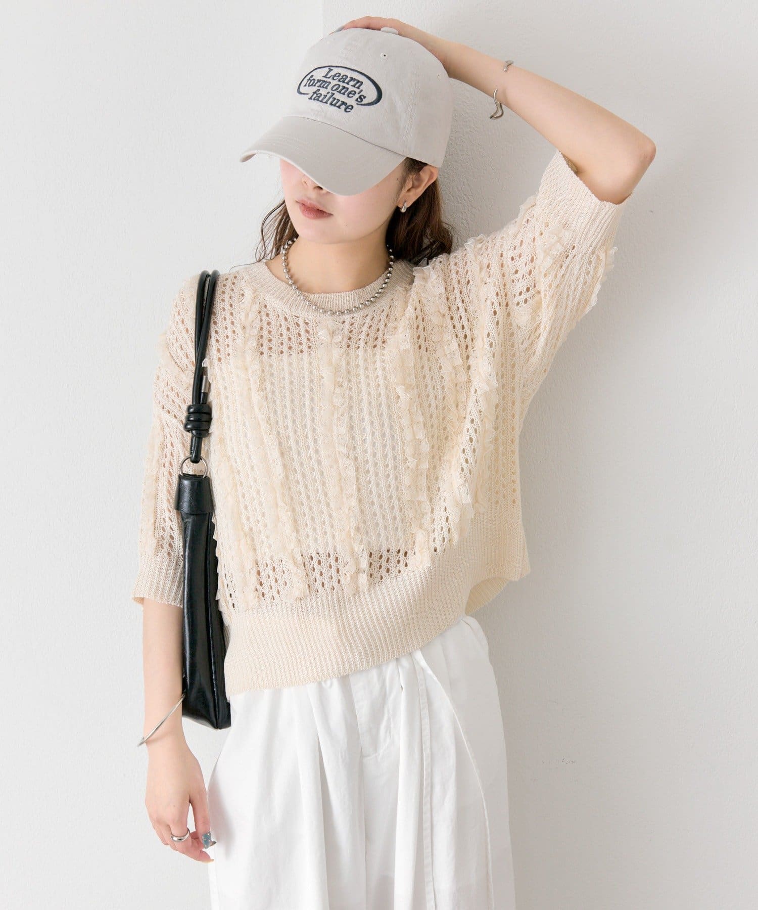 ・透かし編みのニットに、立体的なフリルラインを施した存在感のある一枚。