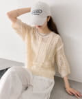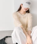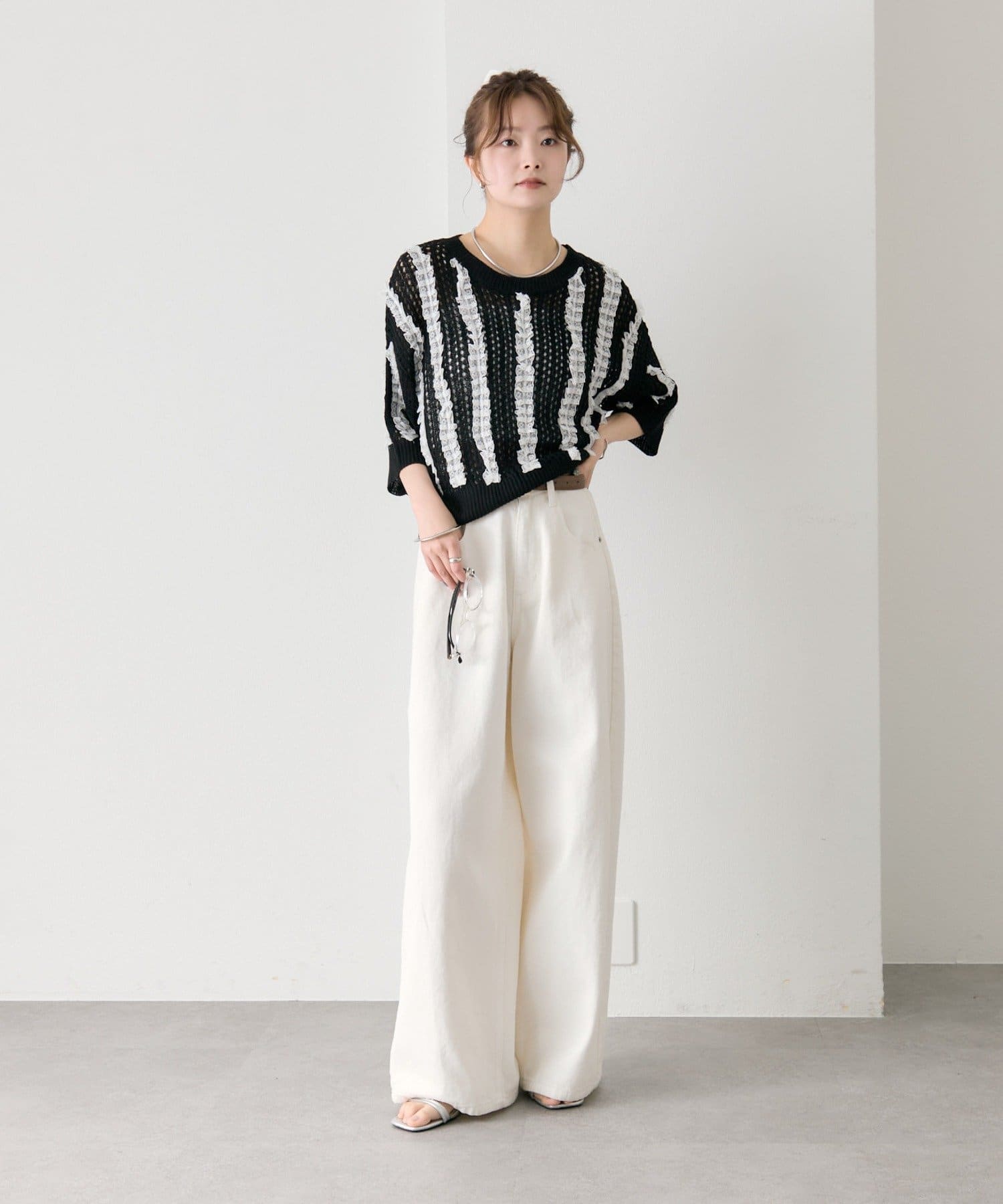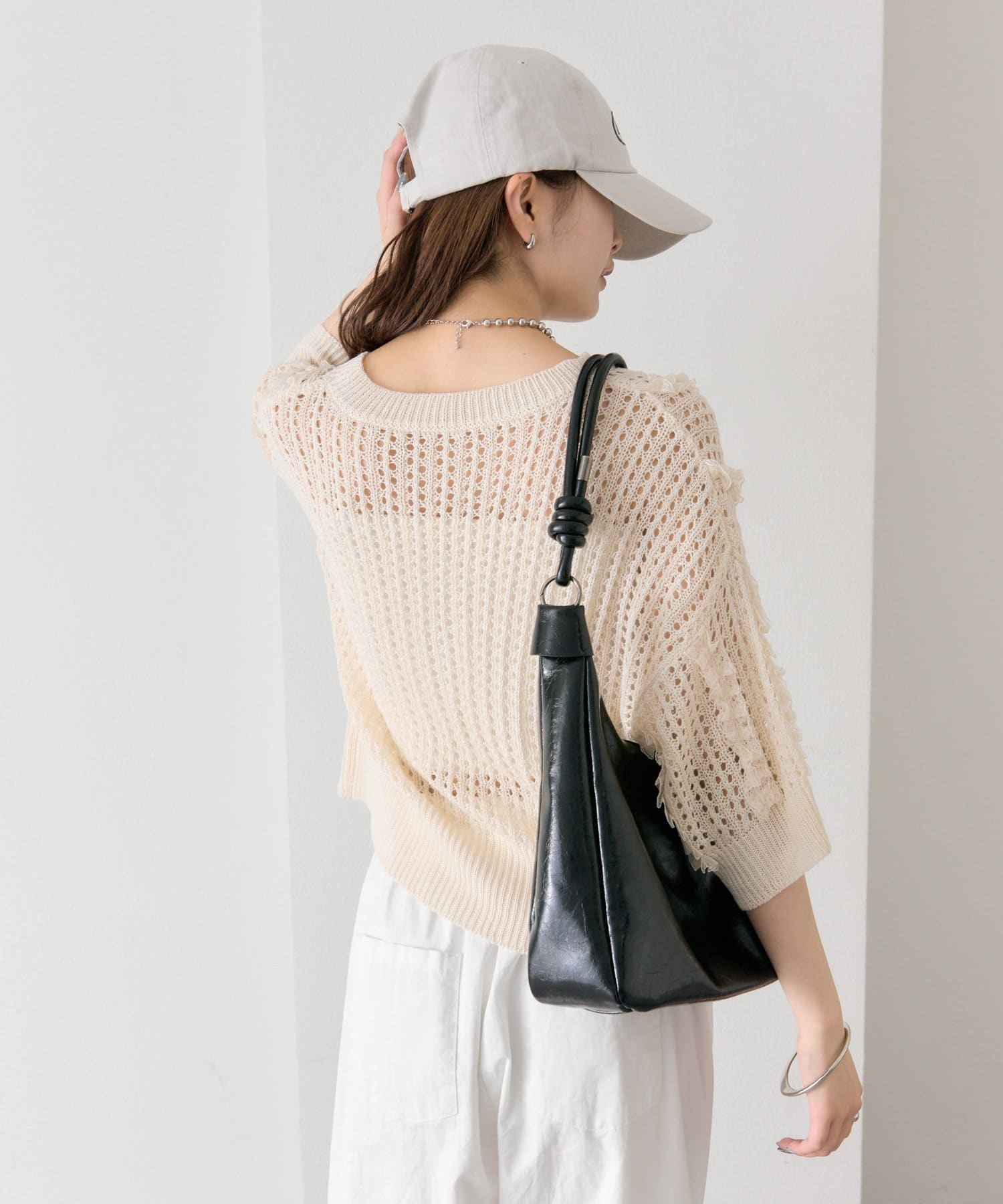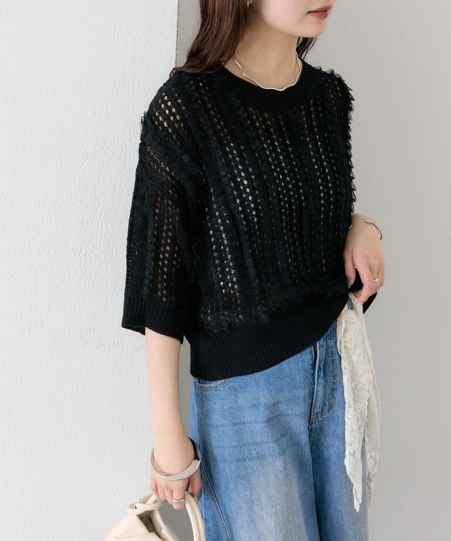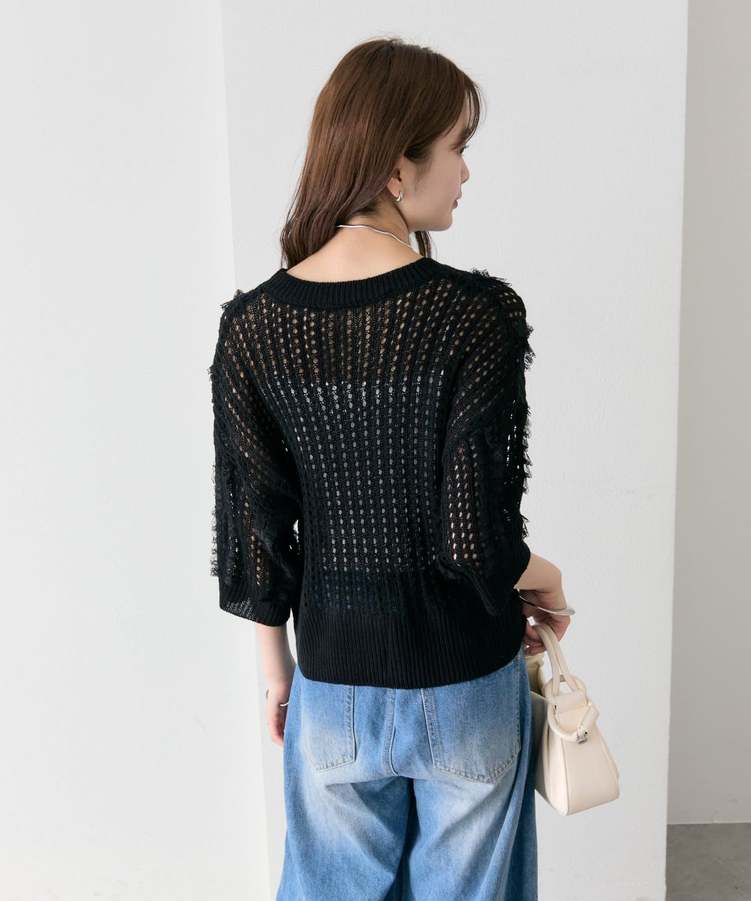 ・透かし編みのニットに、立体的なフリルラインを施した存在感のある一枚。
