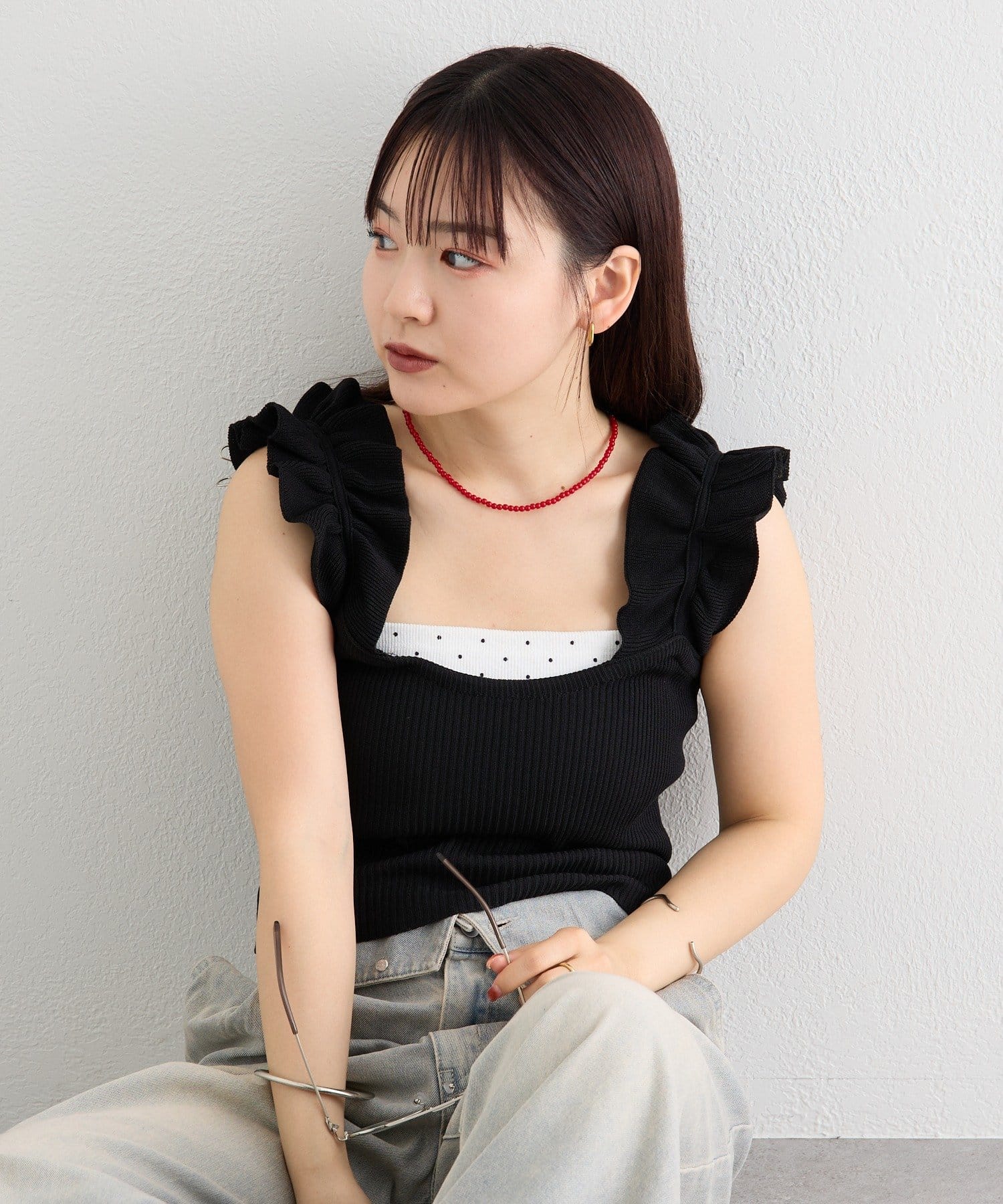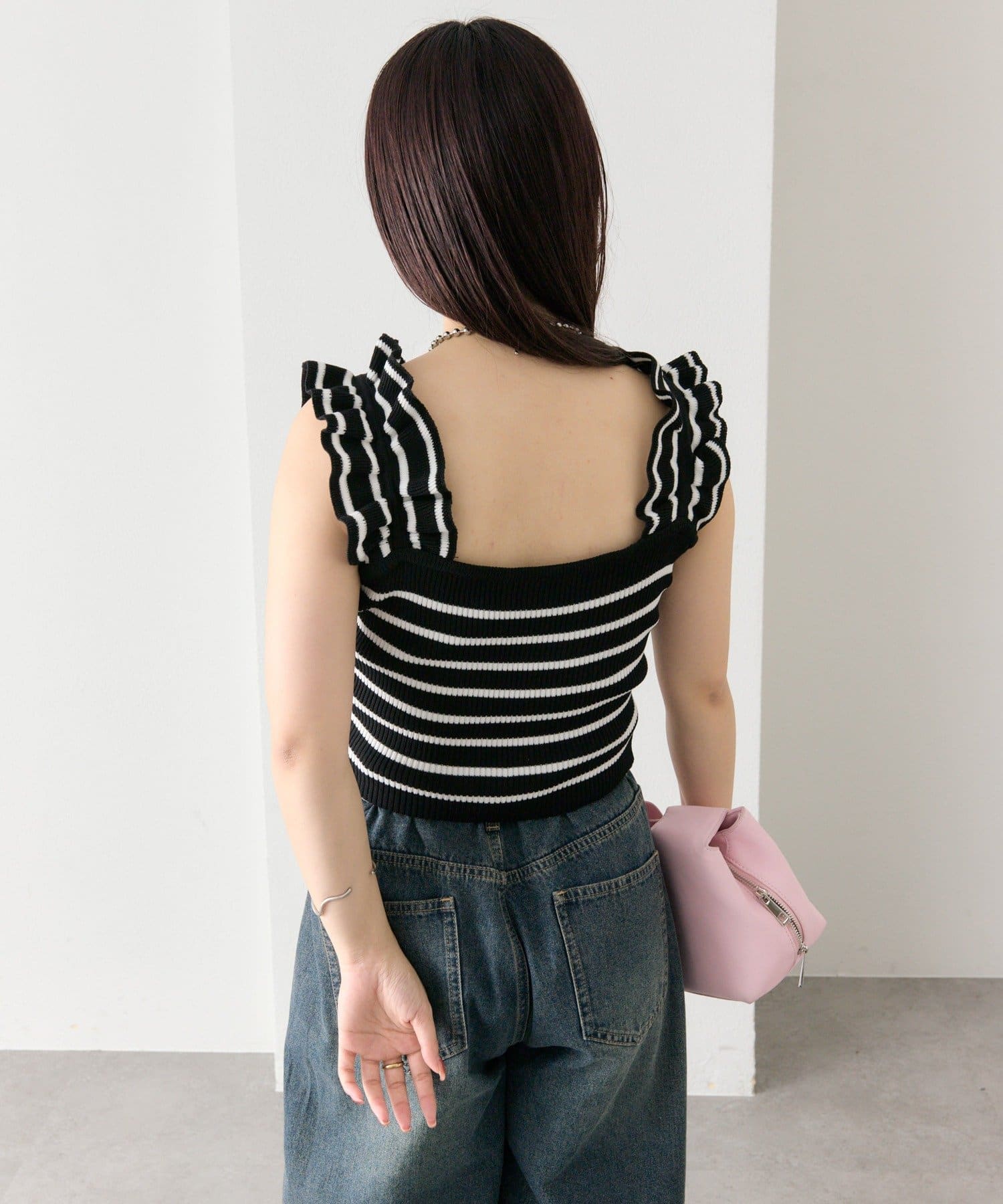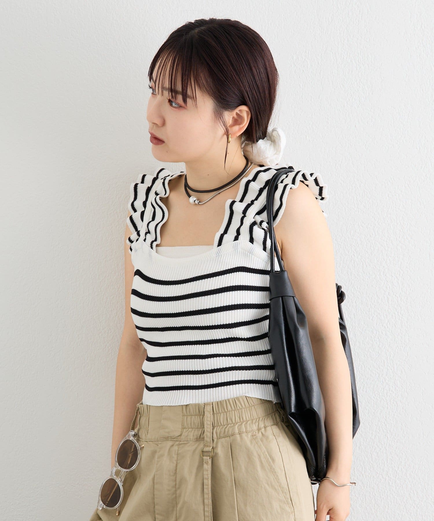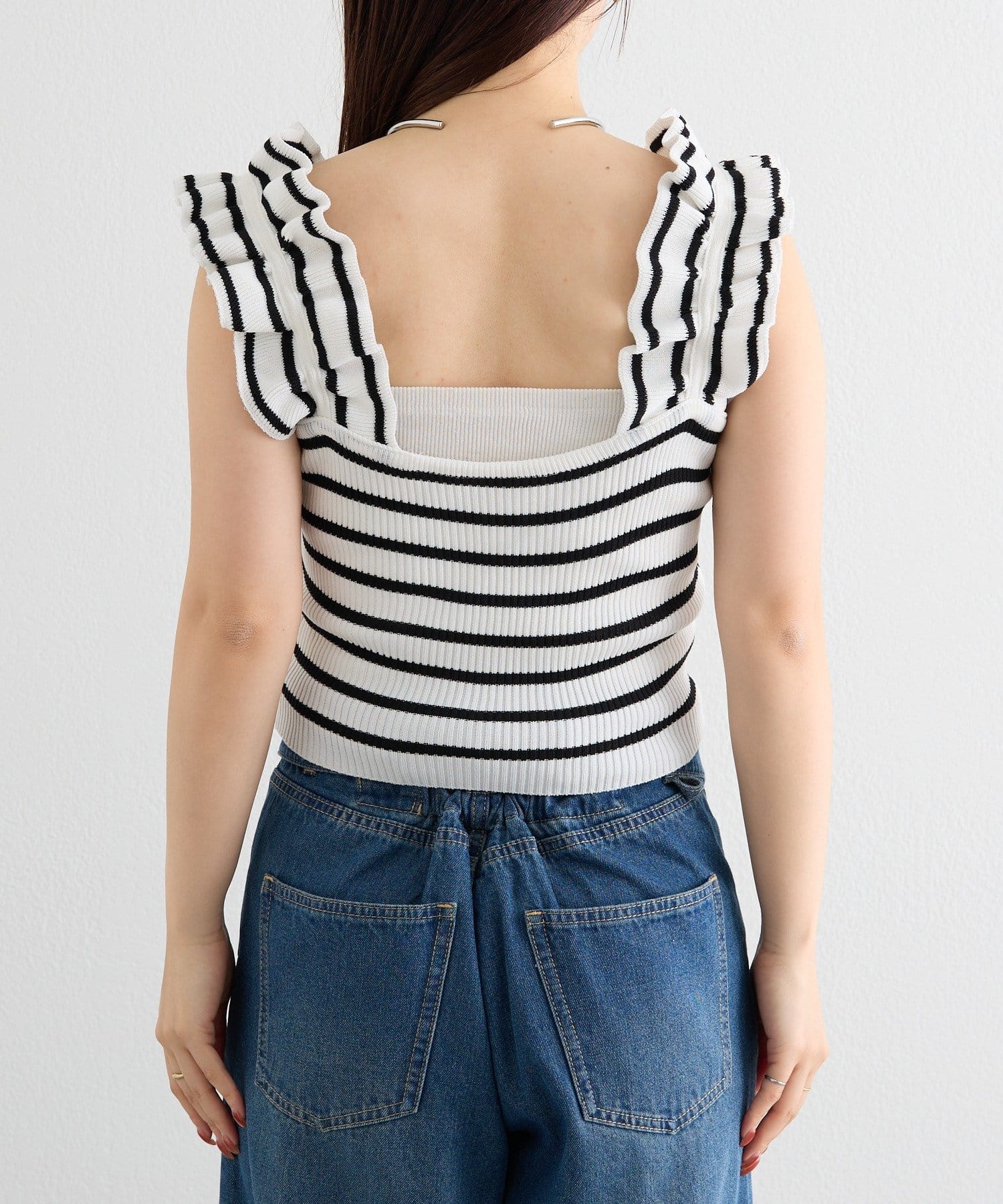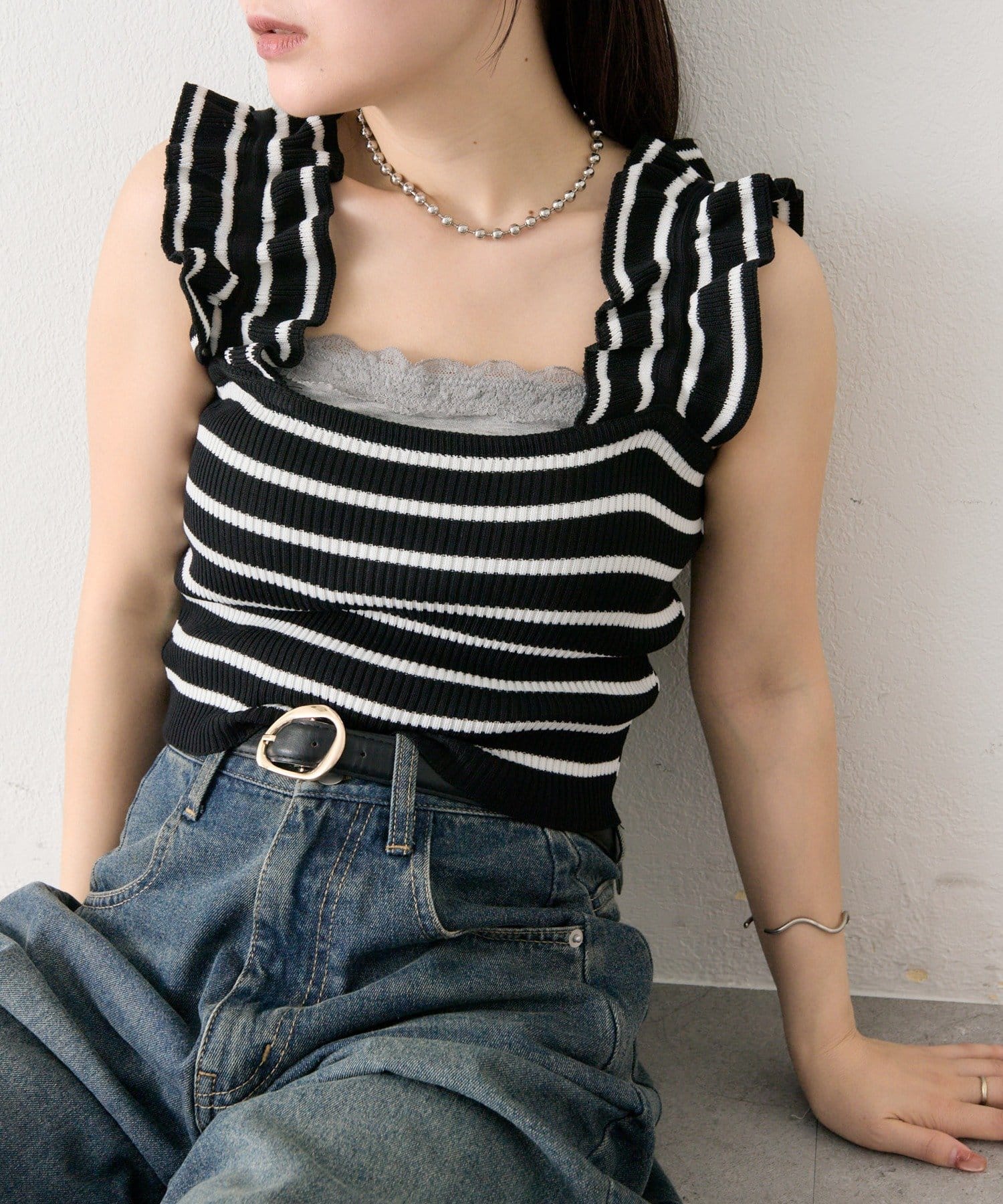 肩にあしらわれたフリルが可愛いニットタンク