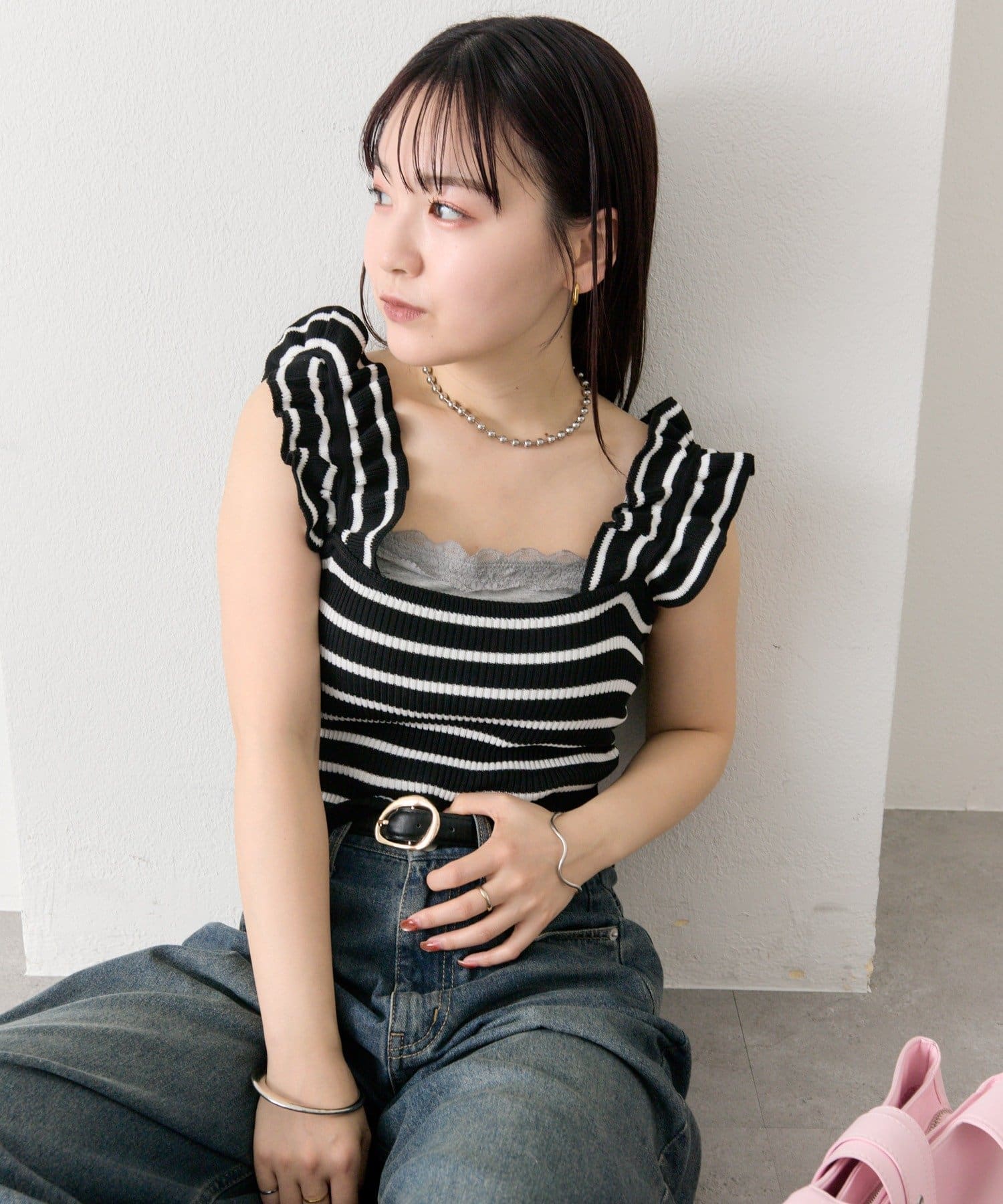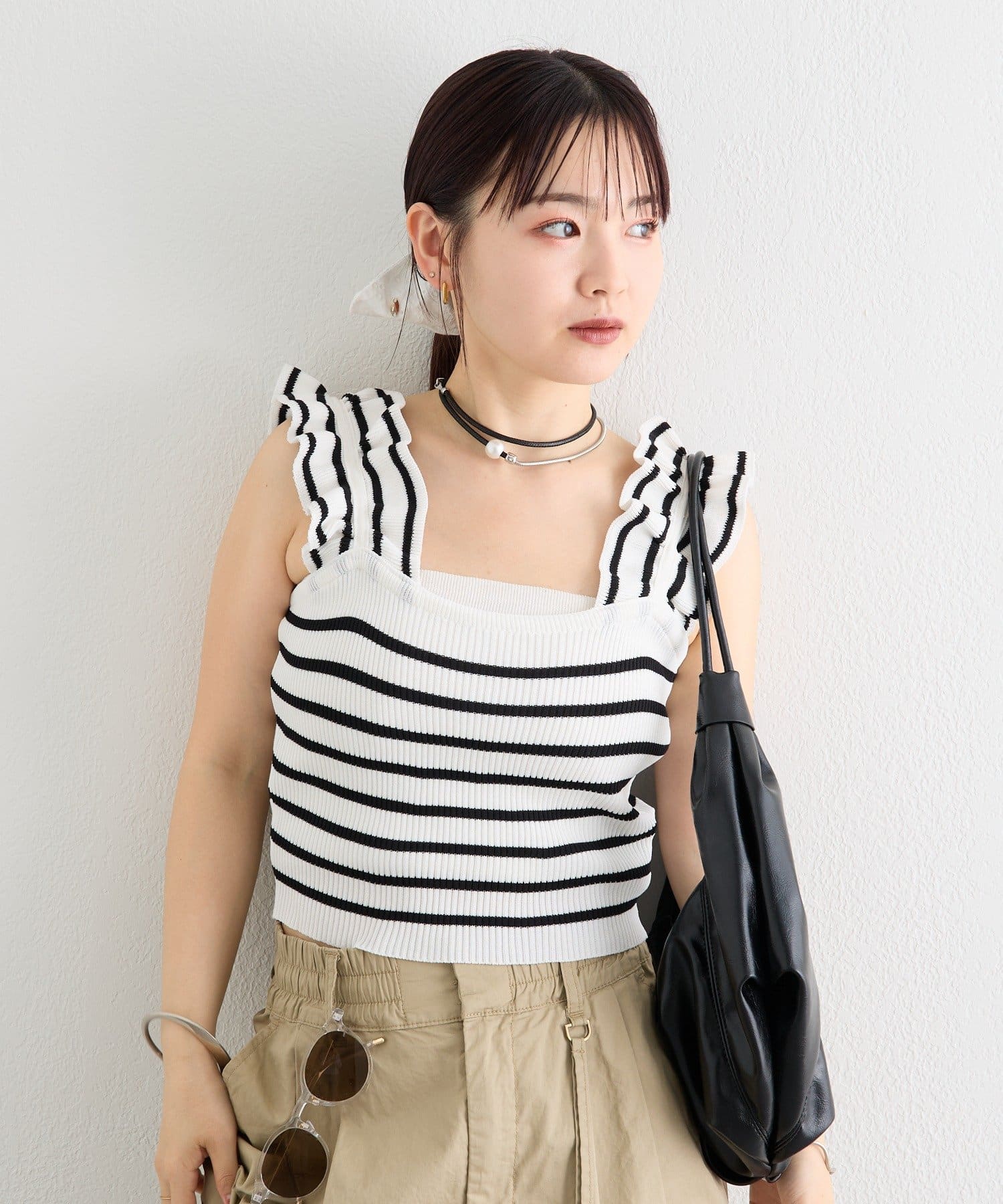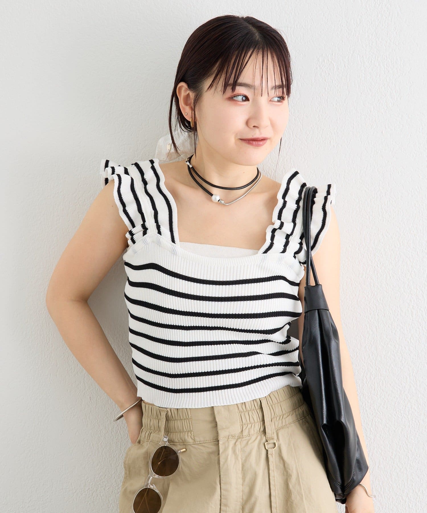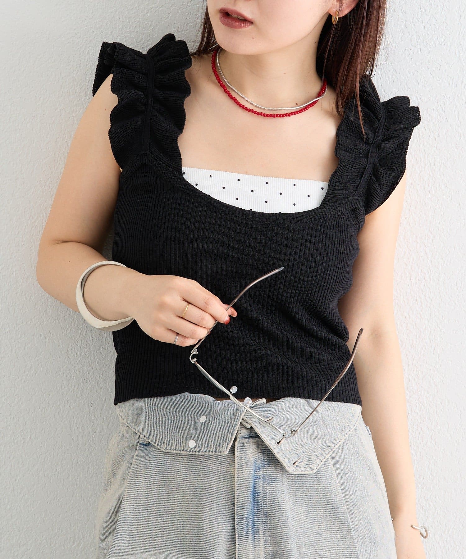肩にあしらわれたフリルが可愛いニットタンク