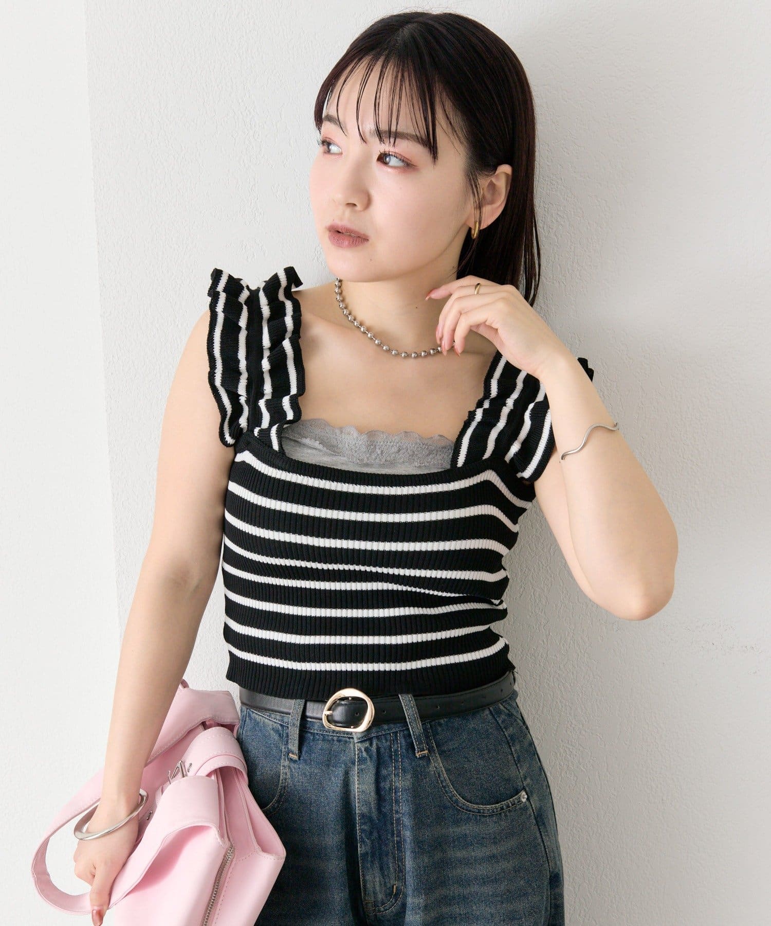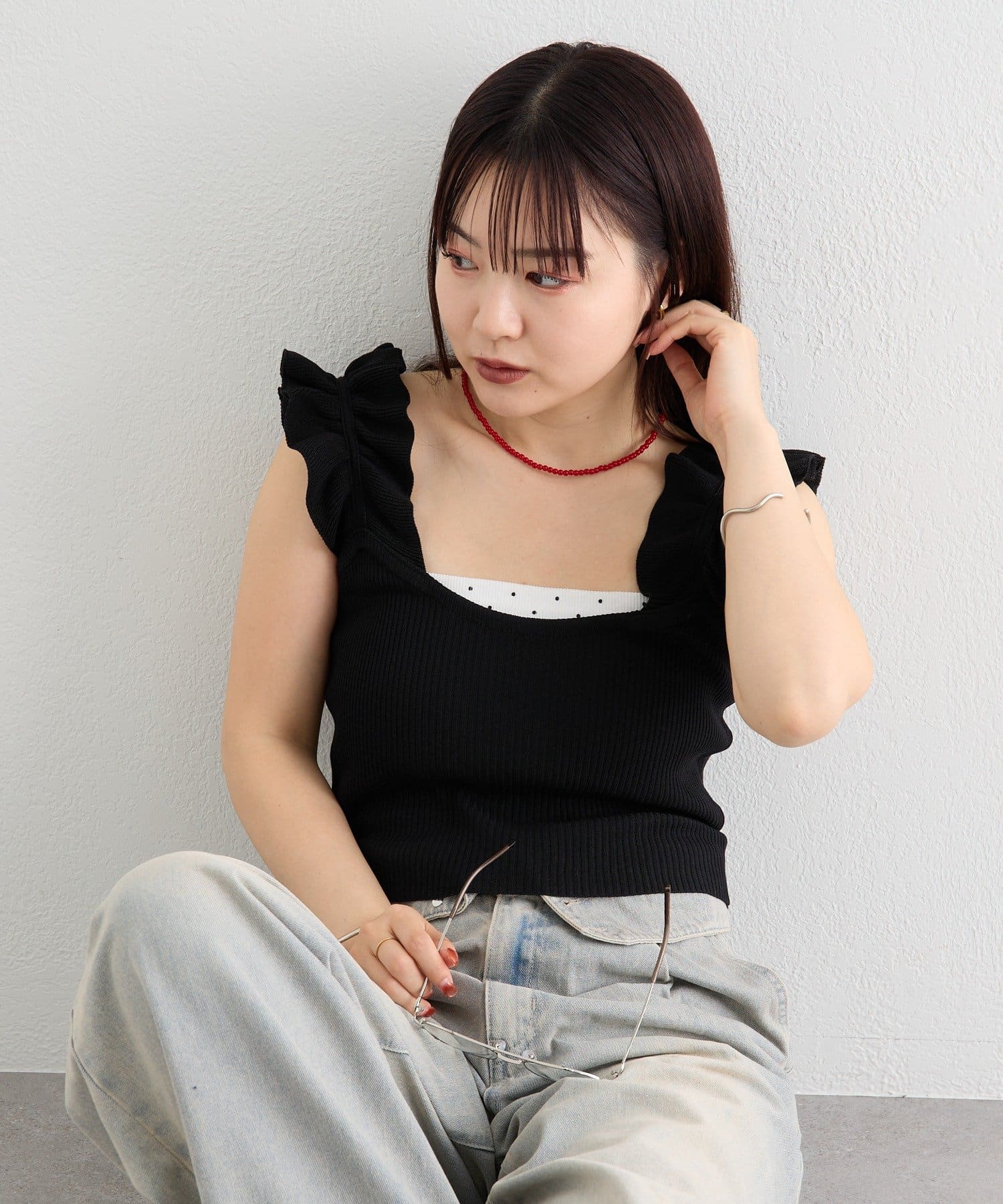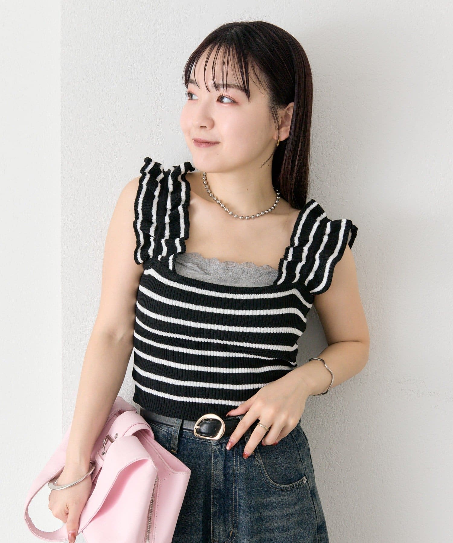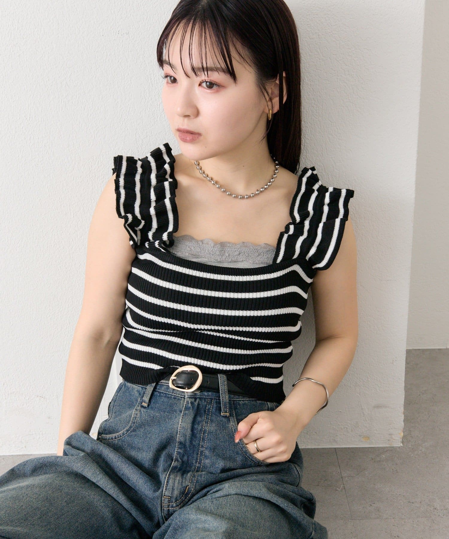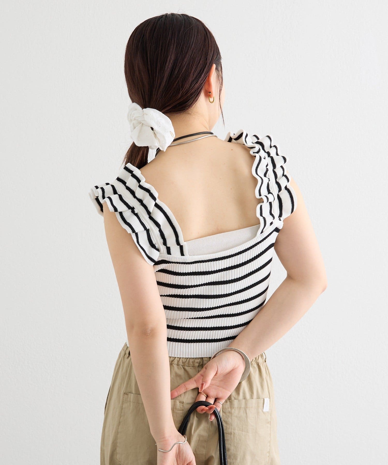 肩にあしらわれたフリルが可愛いニットタンク