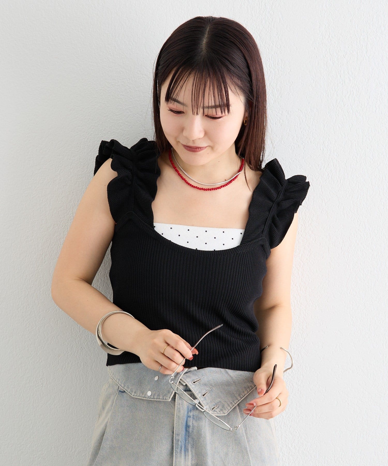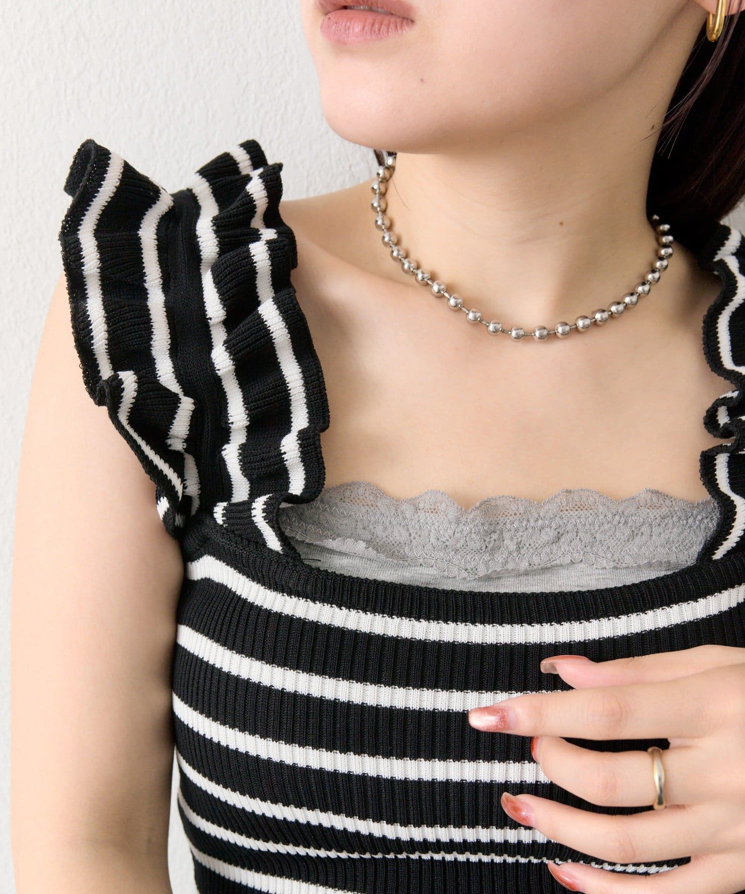 肩のフリルが目を惹くデザインで、1枚でもインナーとして活躍する1枚。