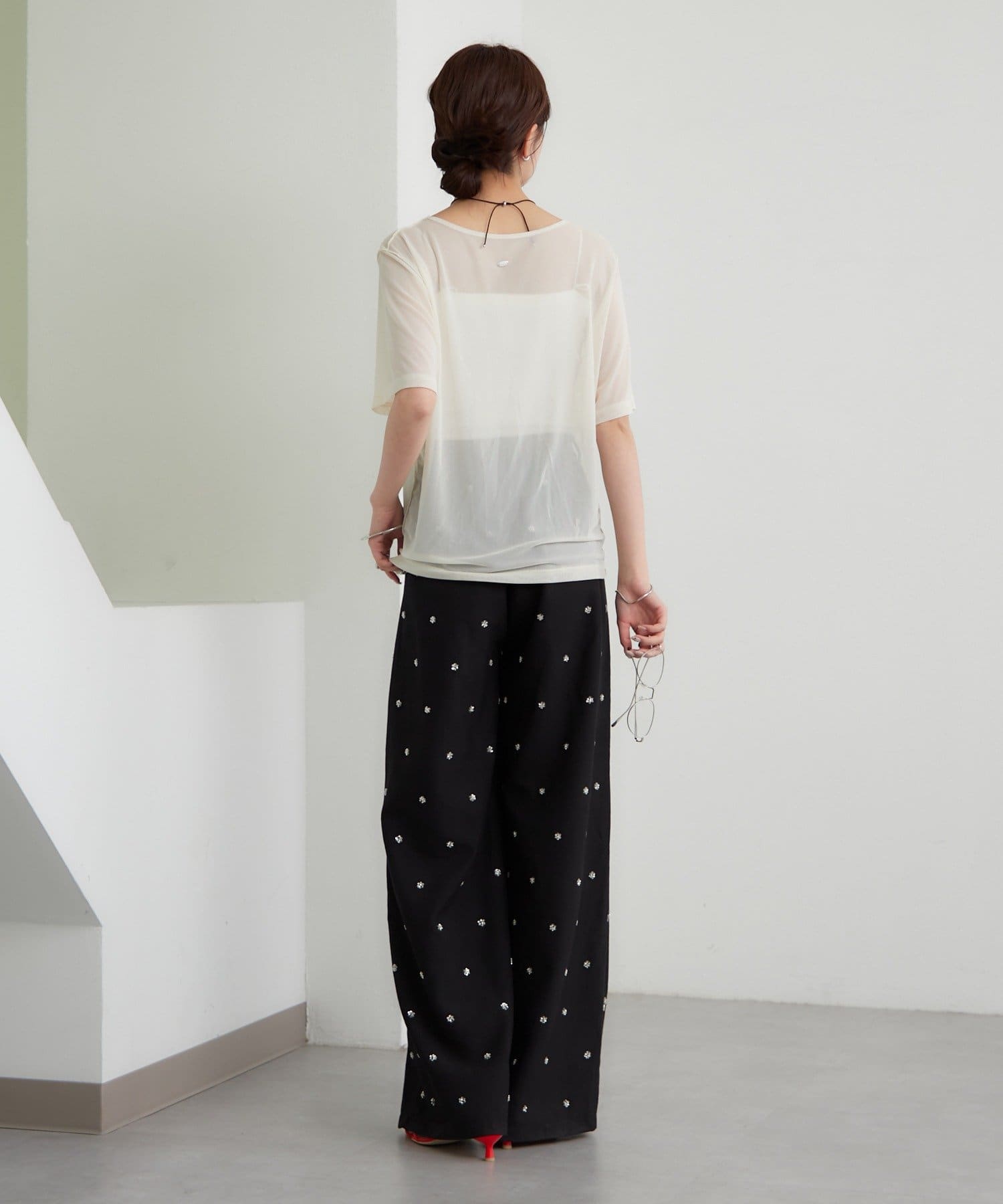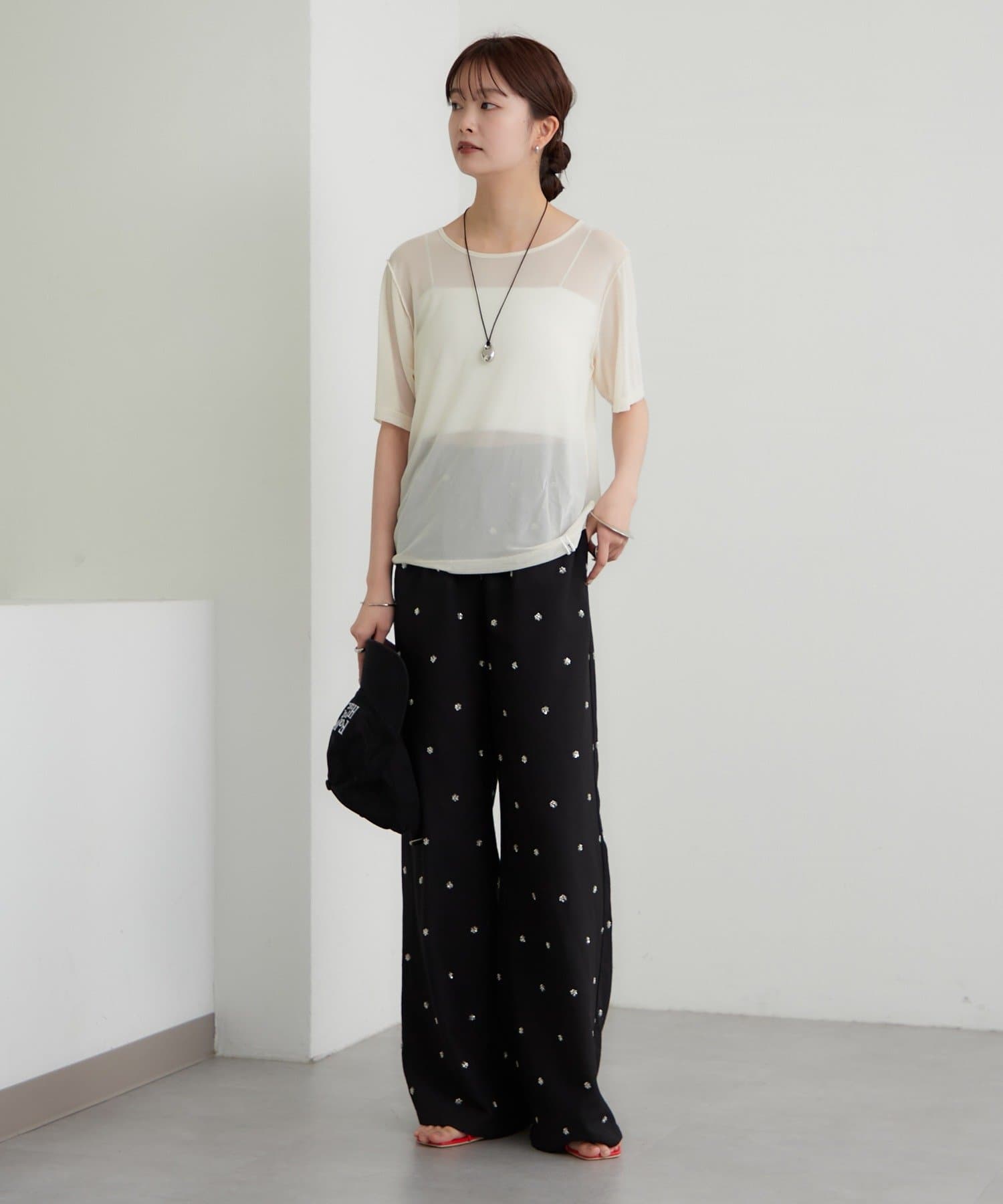 ・シンプルなので、パンツやスカートとのスタイリングには小物をプラスするのがおすめです。
