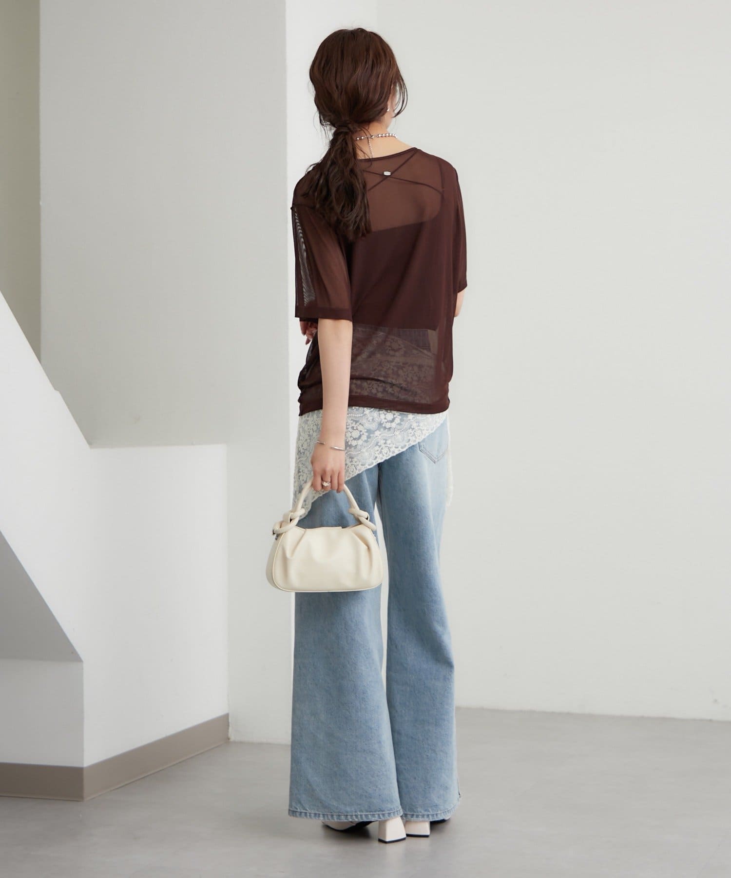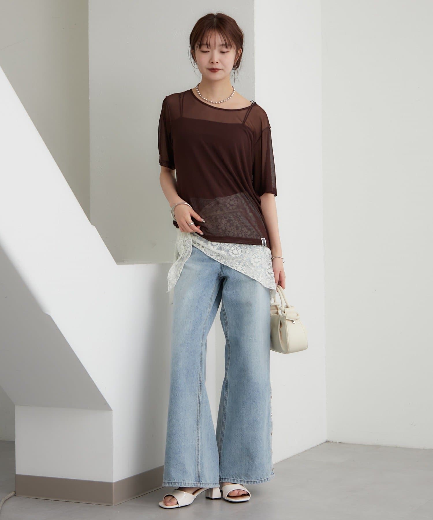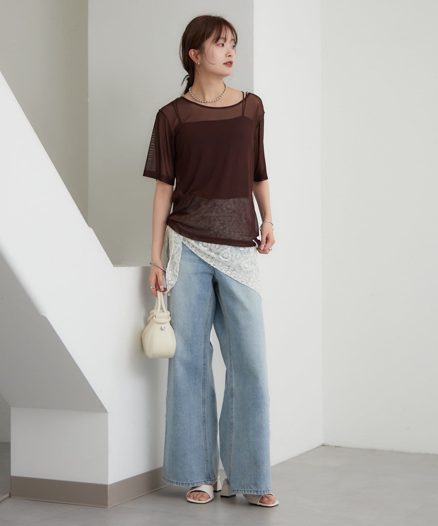 ・腰が隠れる丈感と、やや長めの袖で肌見せが苦手な方も挑戦しやすいシアーTです。
