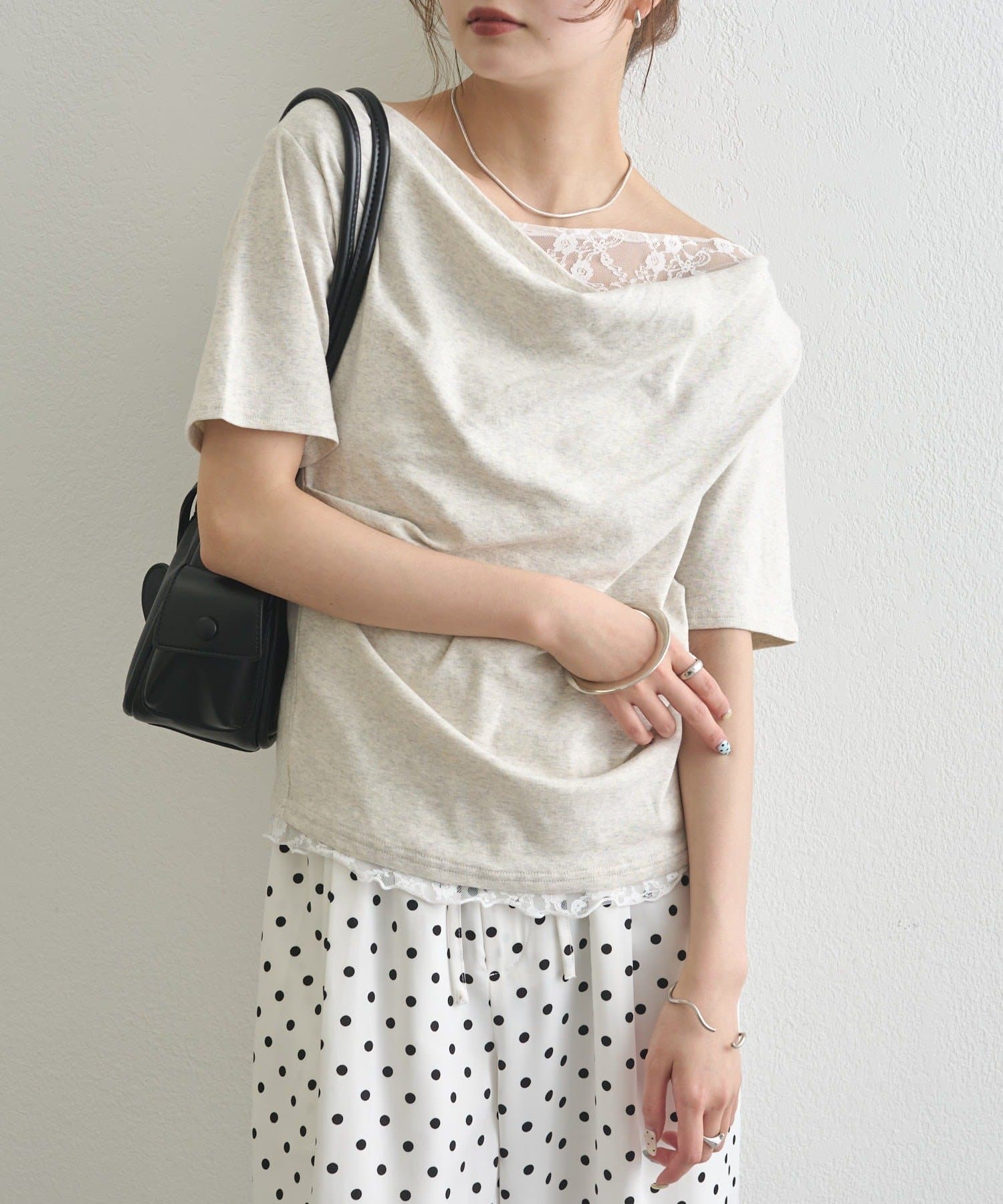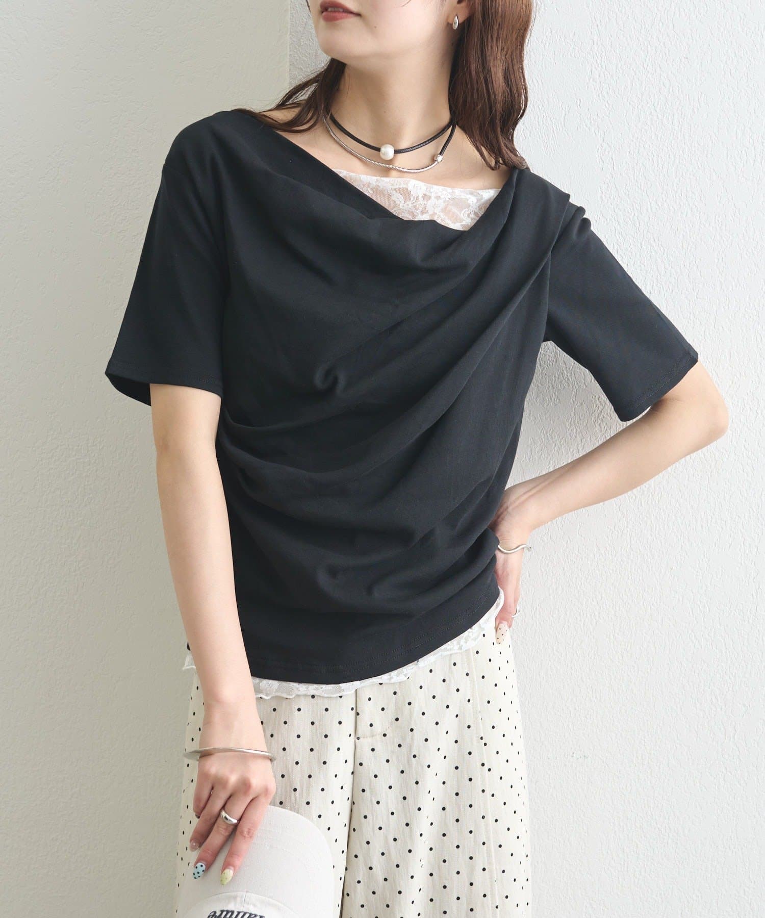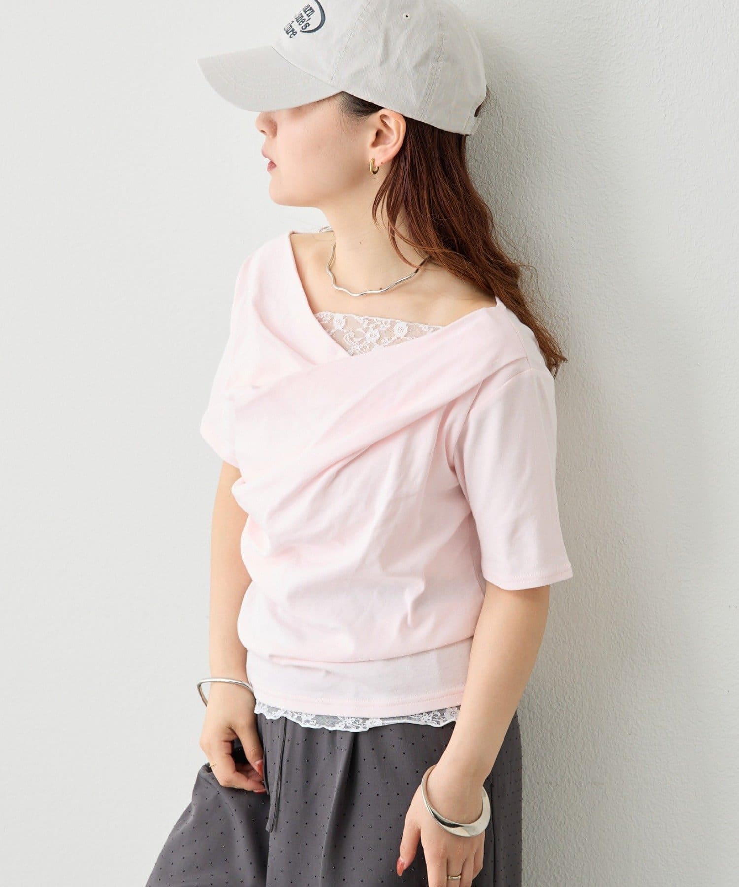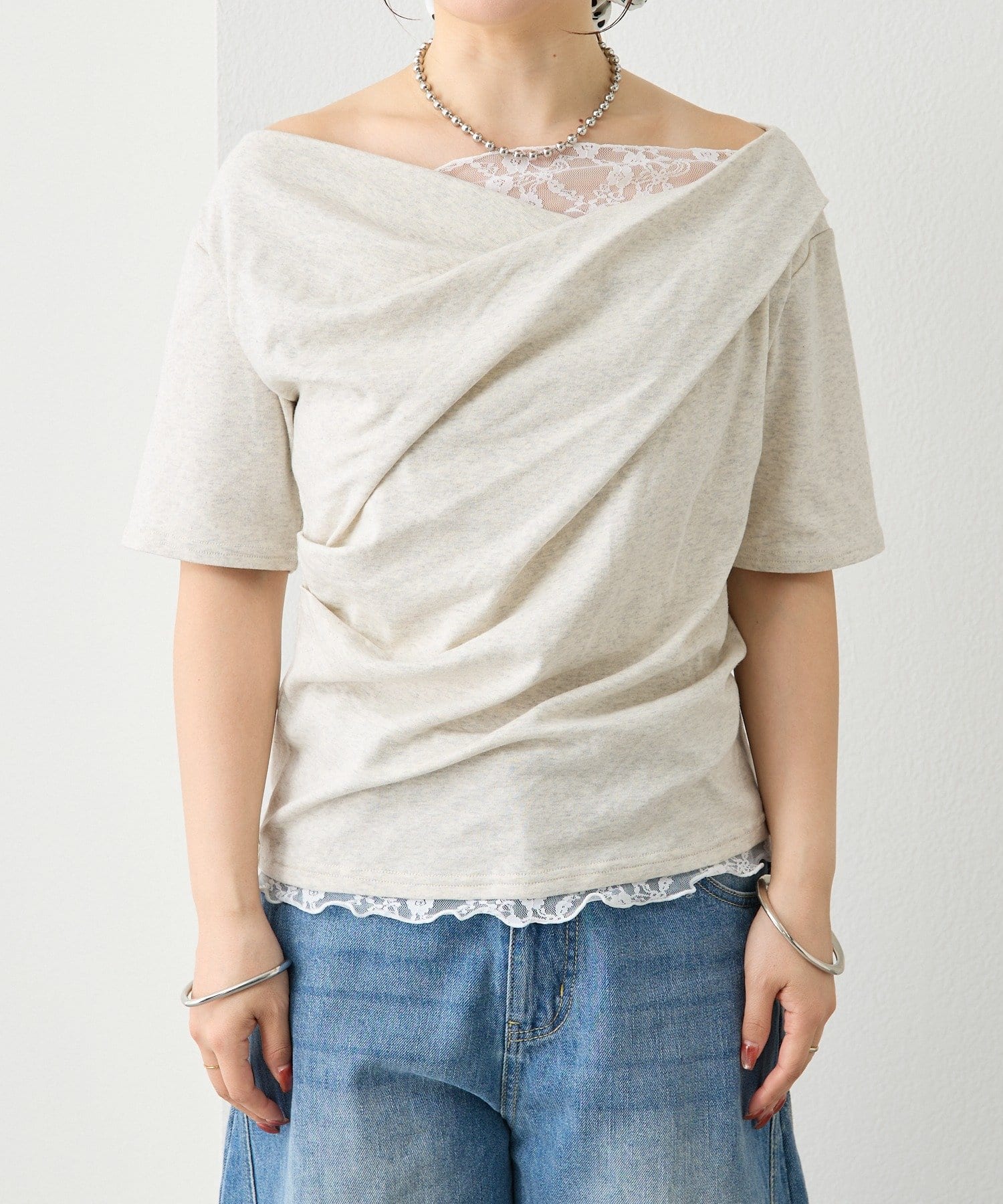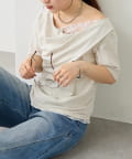 レースドッキングオフショル半袖Tシャツ