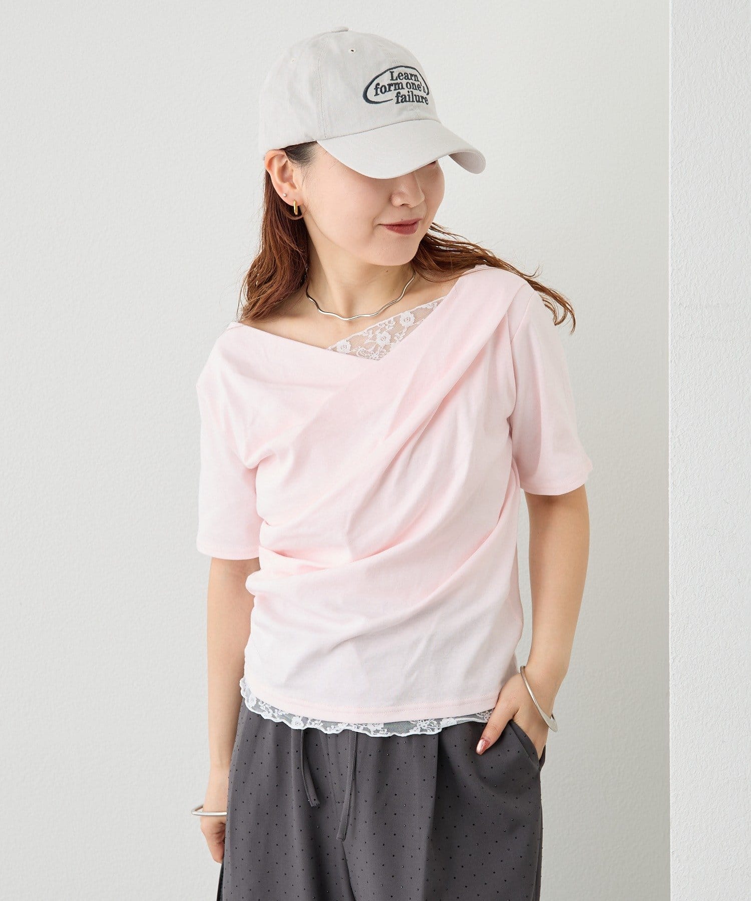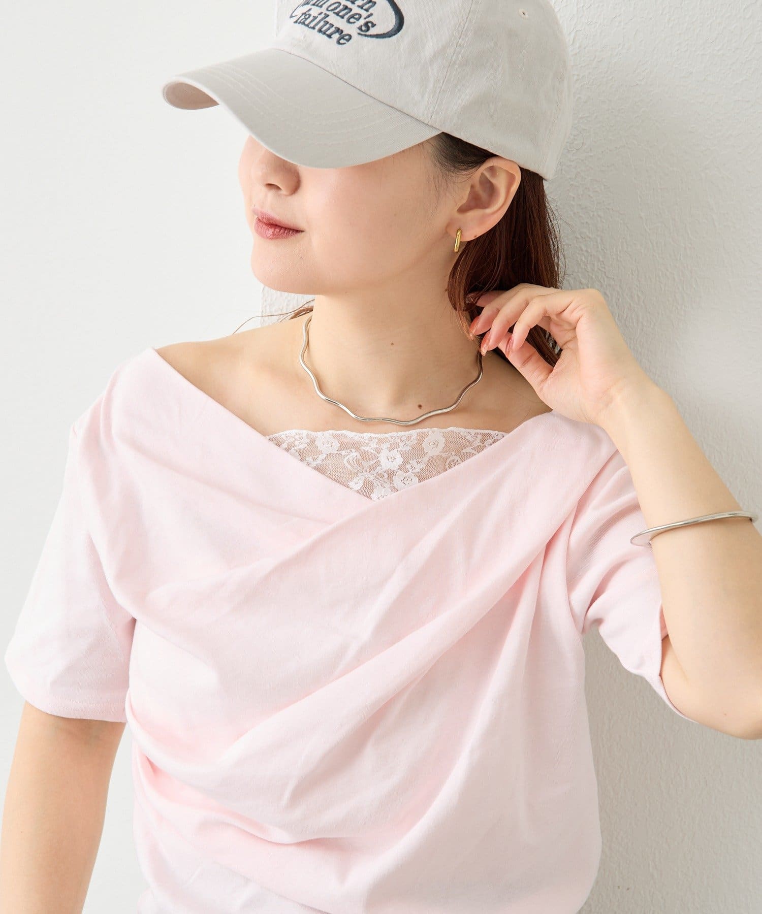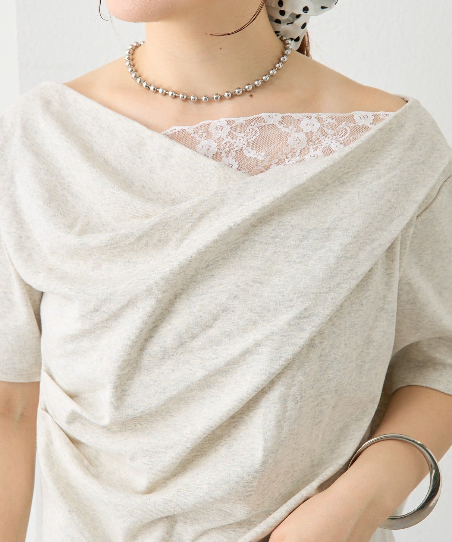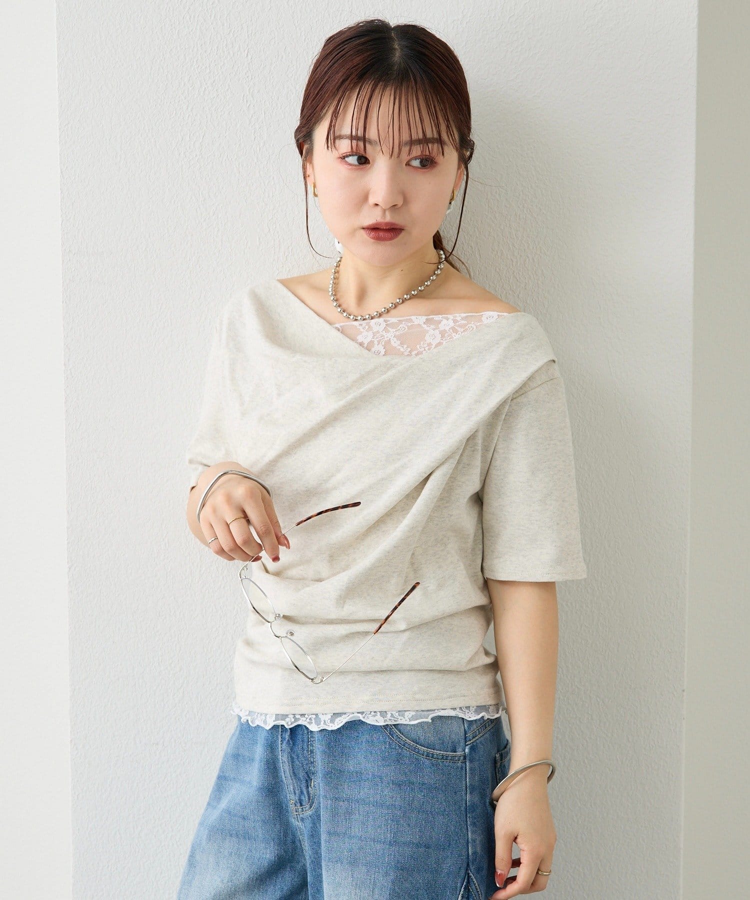 レースドッキングオフショル半袖Tシャツ