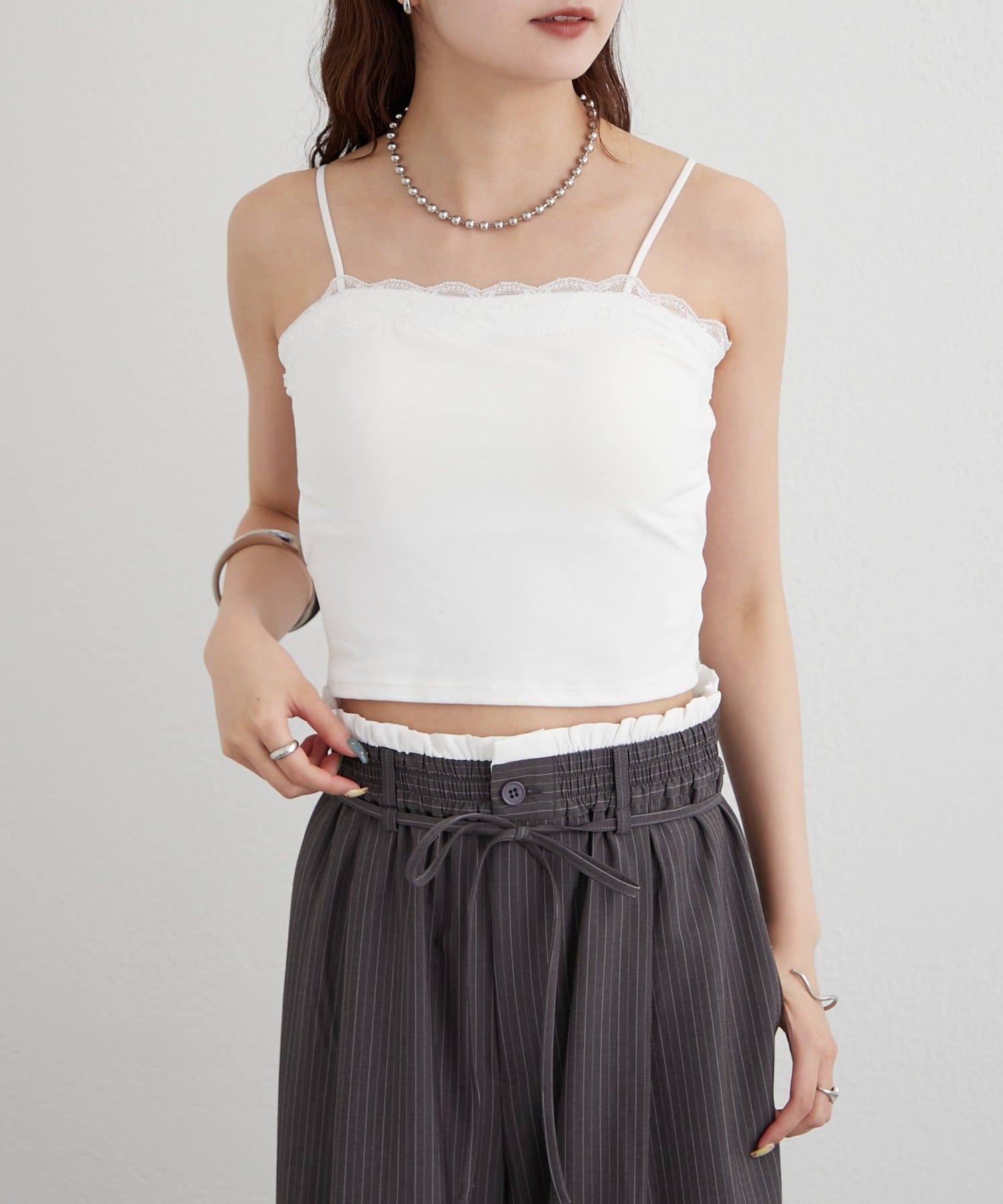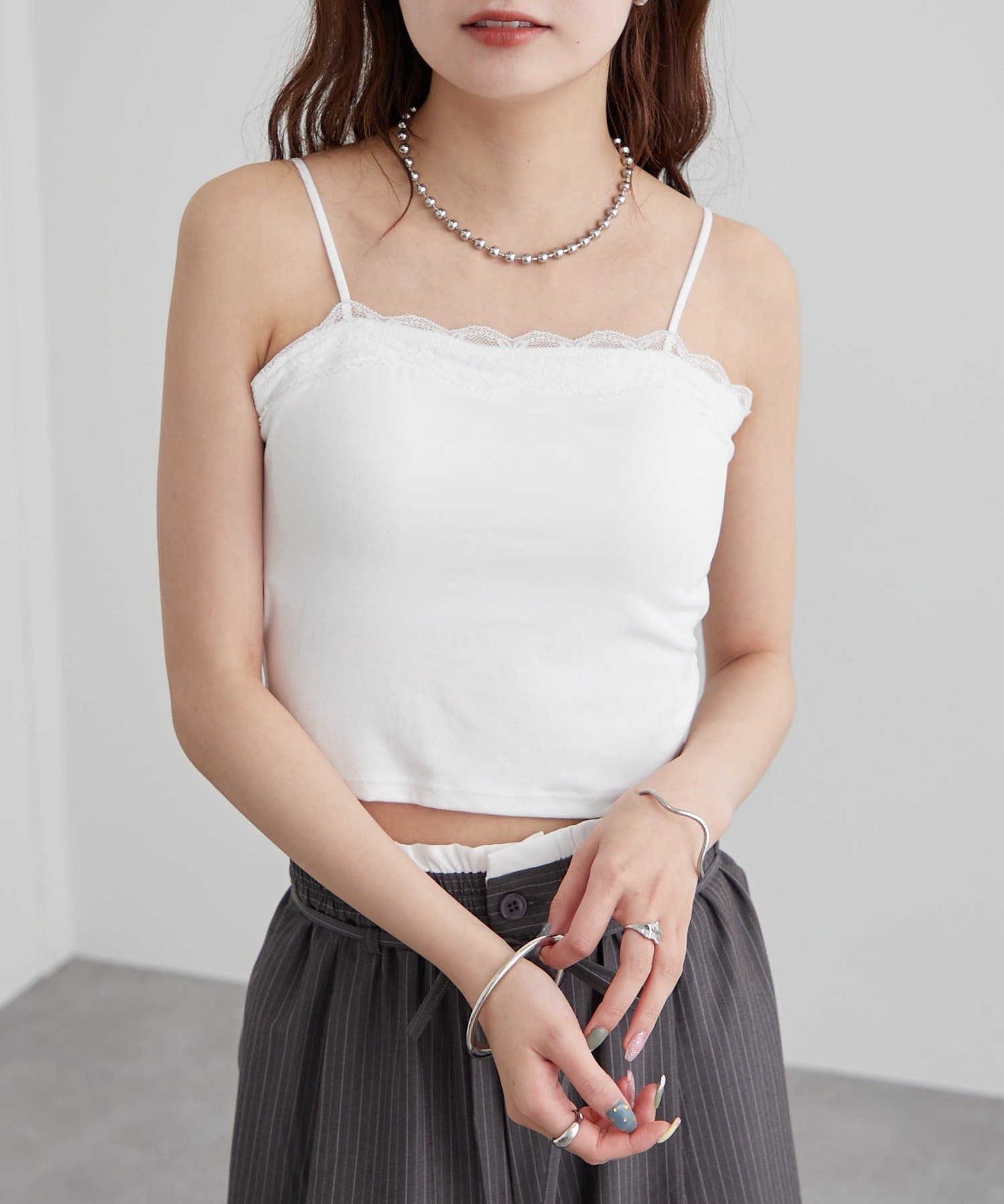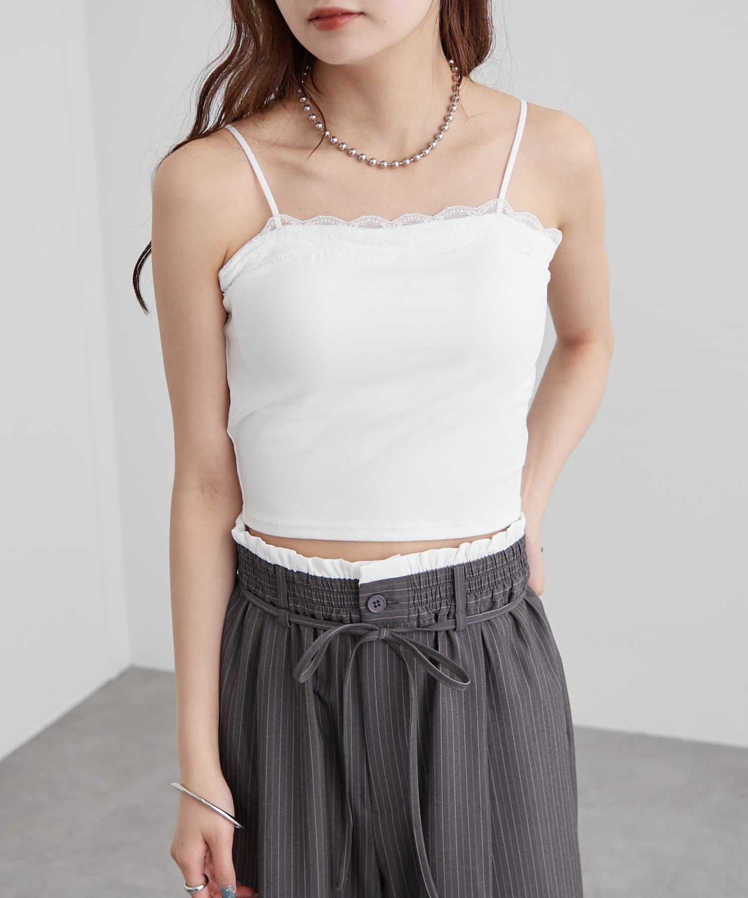 ・胸元にレースをあしらった、シンプルンがらも甘さのあるキャミソール。