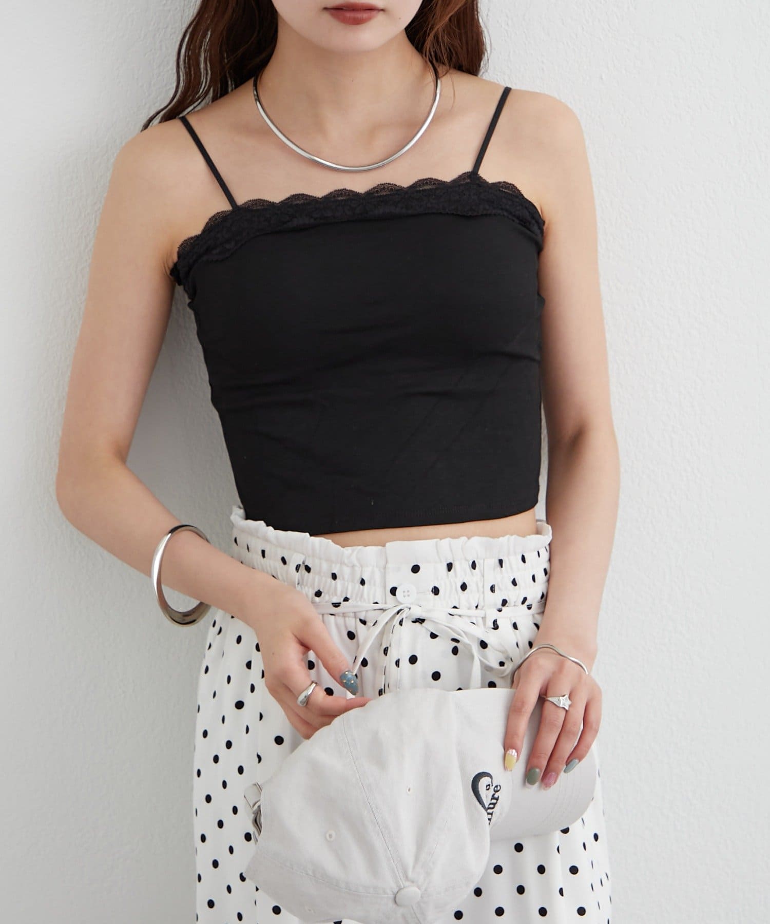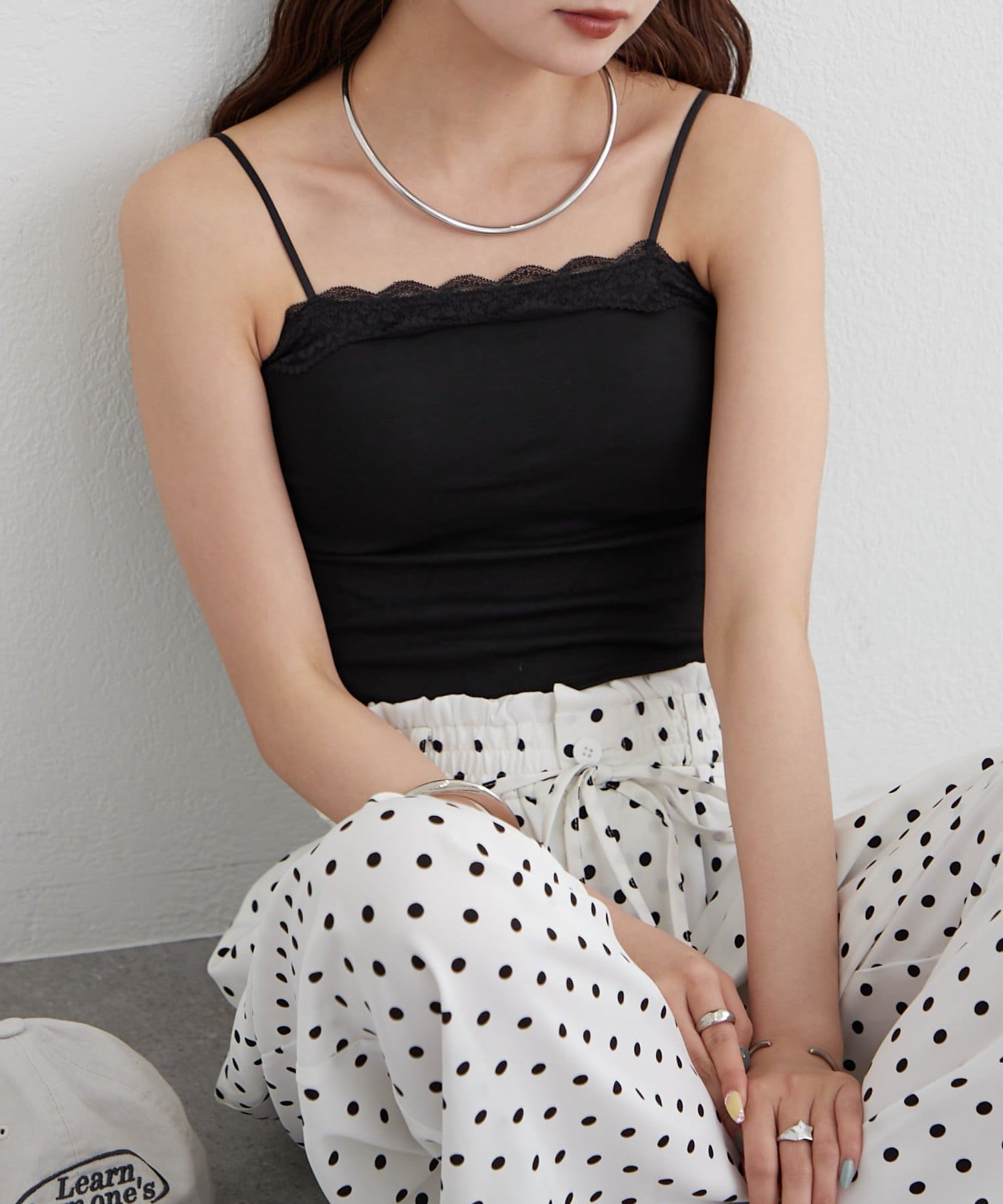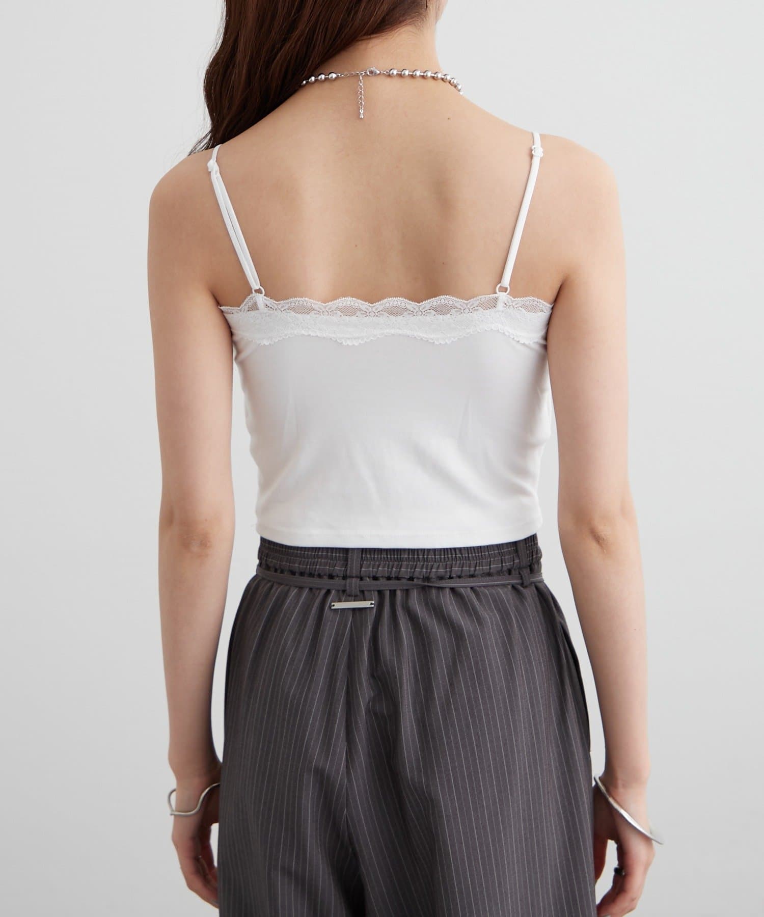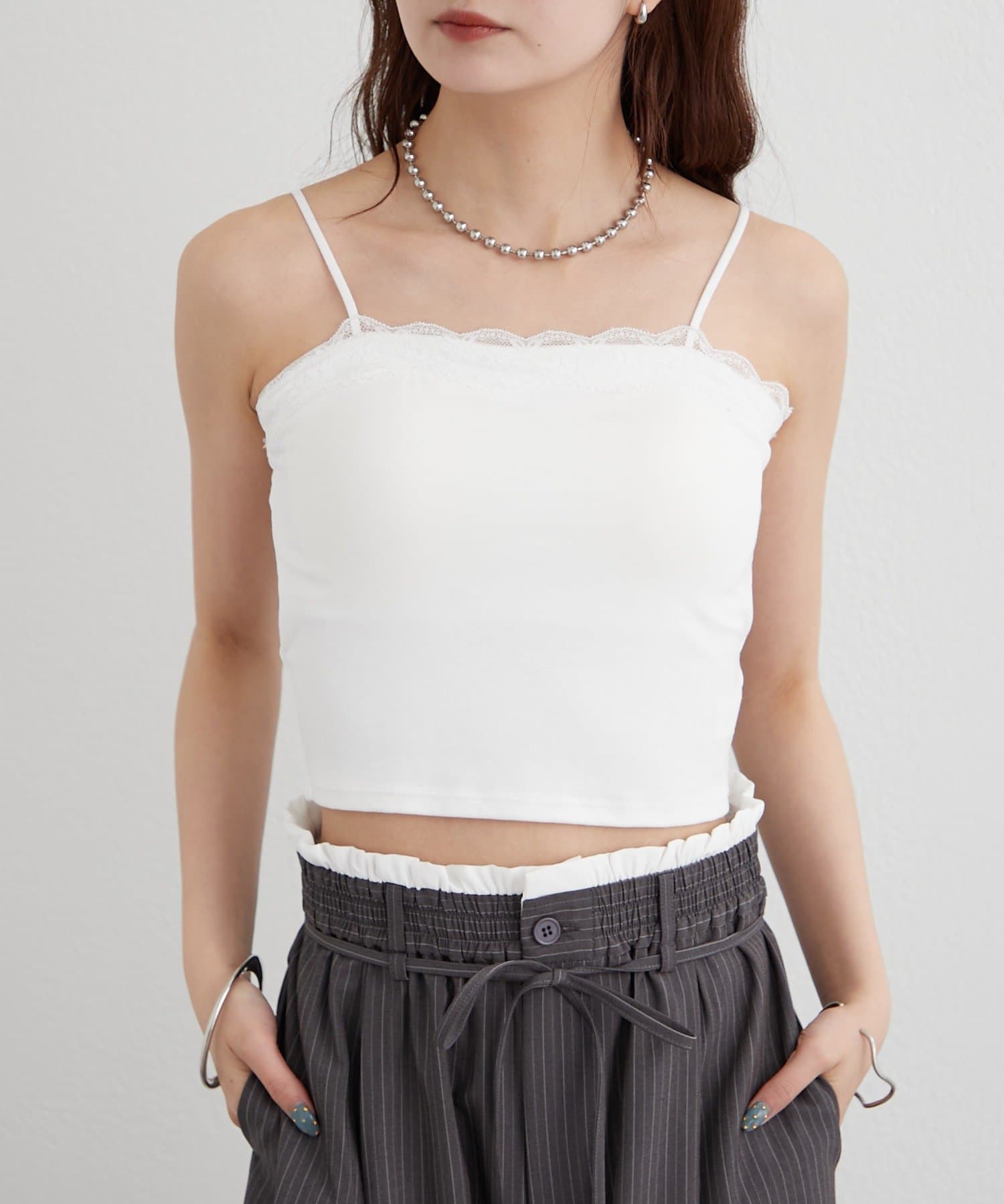 ・胸元にレースをあしらった、シンプルンがらも甘さのあるキャミソール。